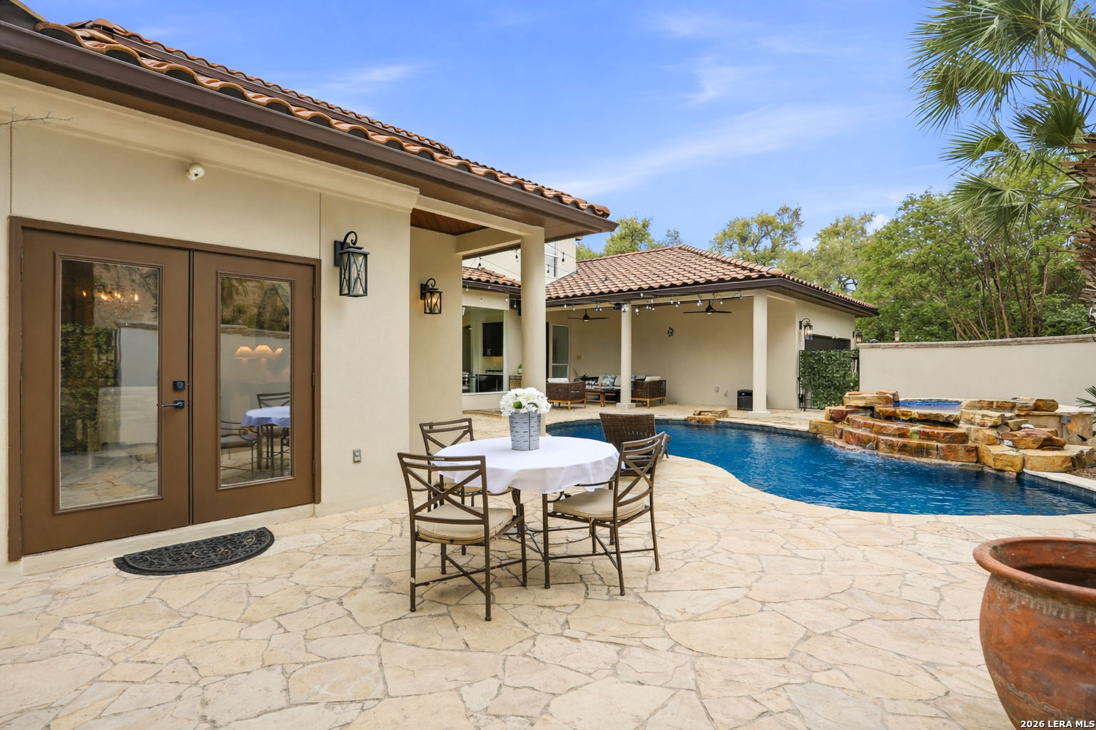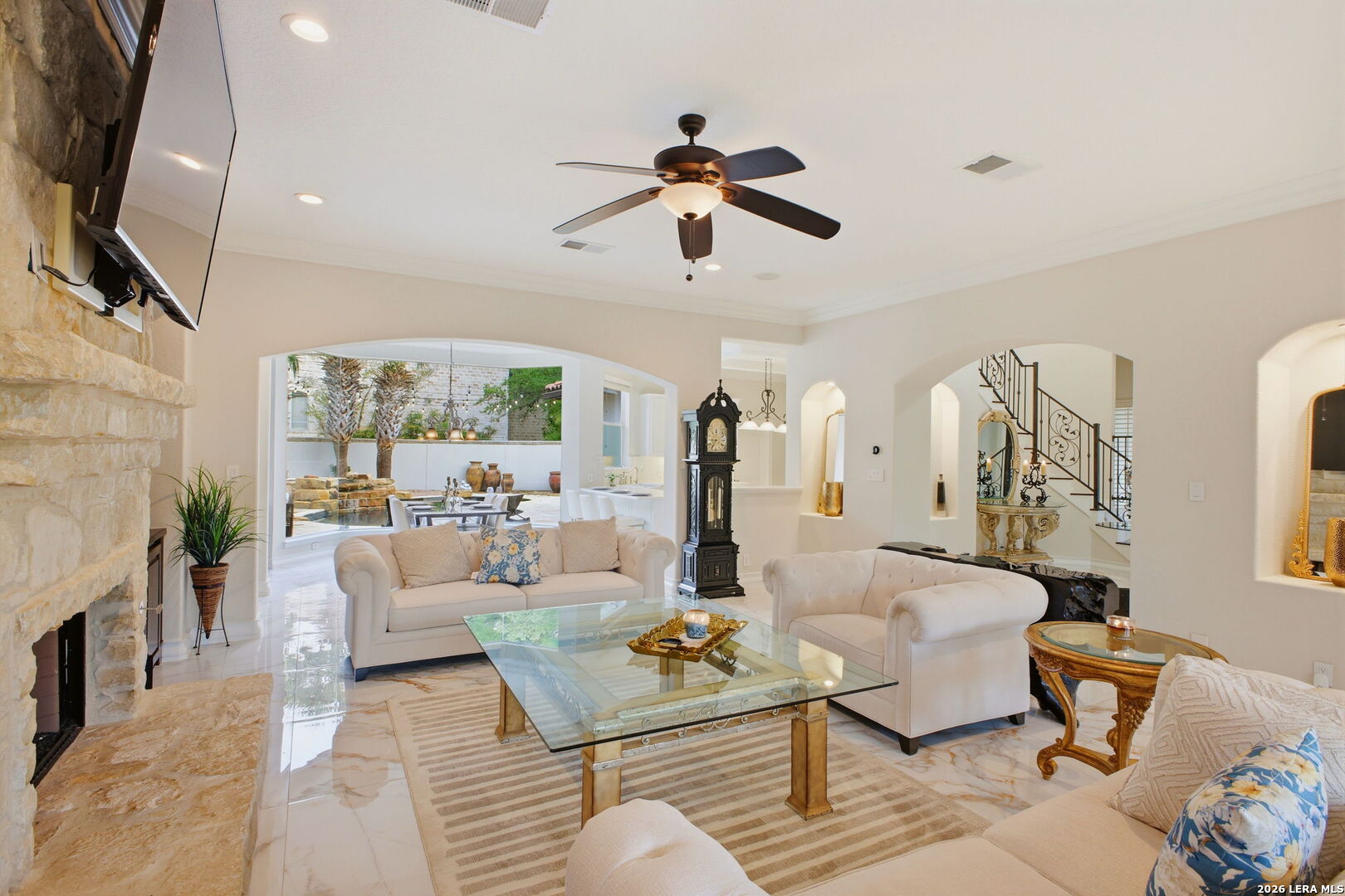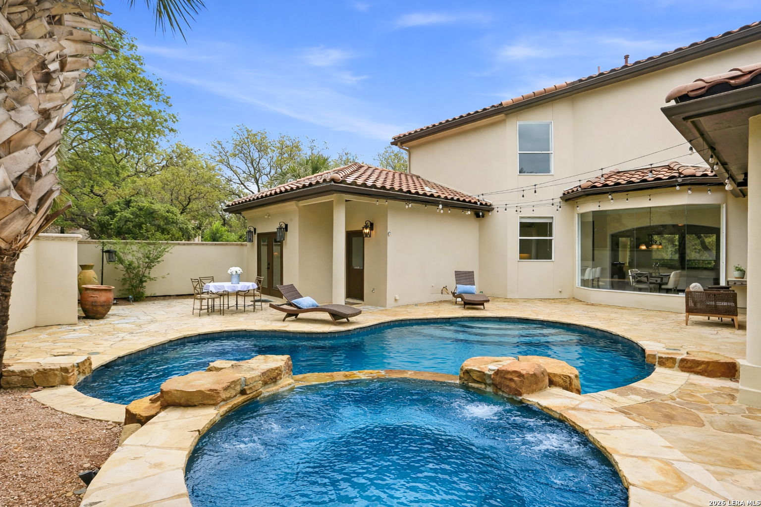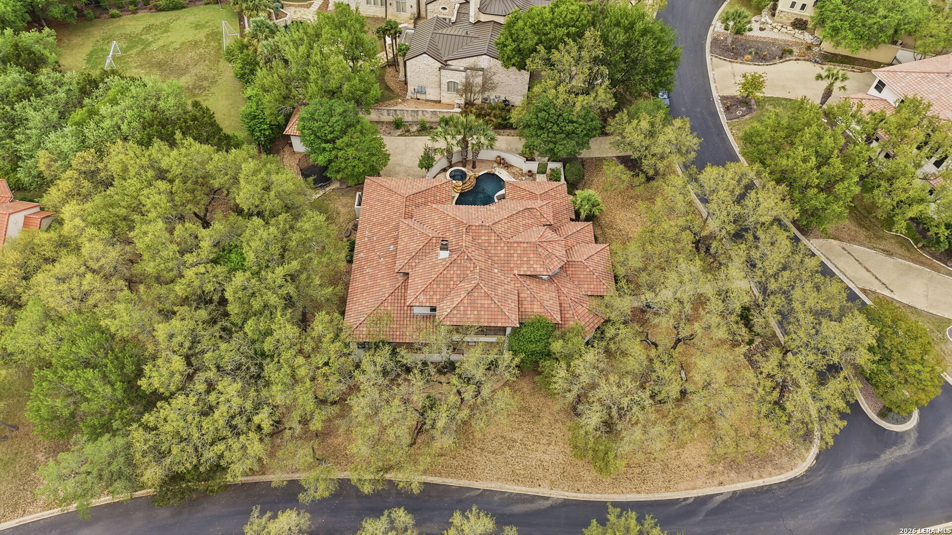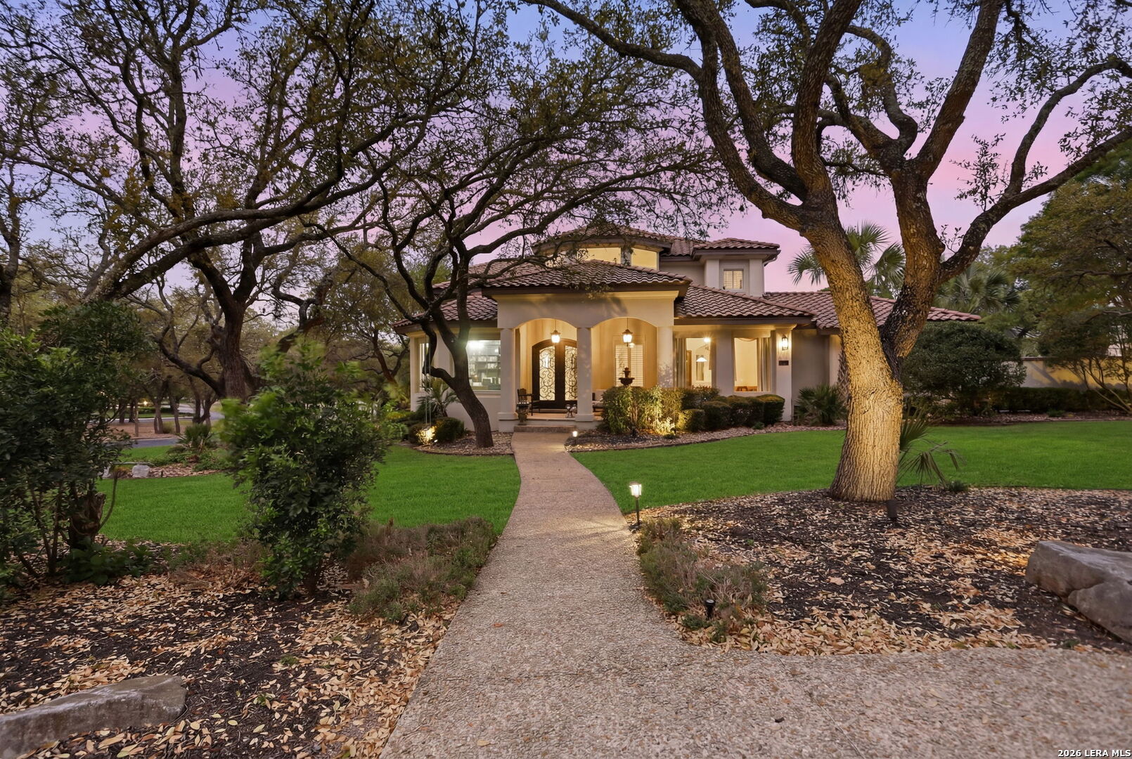 Welcome home to 1 Belcourt Place inside the Dominion! Enjoy over half an acre of mature trees and lush green space inside the highly sought after neighborhood. Host your friends at your pool equipped with the Outdoor projector and sound system entertainment package everyone will be talking about. Send your kiddos off to school with the bus route stopping right at your house. Walk out your front door and enjoy the holiday festivities on the greenbelt directly in front of your home. You even have your very own Golf Cart Garage! Seller has invested significantly in high-quality renovations throughout, including a fully updated chef's kitchen with quartz countertops, backsplash, farmhouse sink, premium faucet, new appliances, and induction cooktop with Sub-Zero refrigerator. Flooring and finishes have been upgraded across the home, creating a modern, move-in-ready luxury feel Home offers 4 bedrooms, 5 baths, Office, Three spacious living areas on the main level plus an additional upstairs living area, and a large formal dining room with direct access to the pool-perfect for large gatherings. The backyard is a private retreat with a stunning heated pool, spa, covered patio, and three palm trees-perfect for entertaining, Two balconies overlook a park, with walking access to scenic Dominion lakes and trails. Located in a highly desirable school zone. The spacious ground floor primary suite features a glamorous bathroom with dual vanities, dual closets, and a walk-through shower and soaking tub. Gorgeous hard wood flooring throughout the Master bedroom. The primary suite features a stunning wall of windows overlooking the serene park and mature trees, filling the space with natural light. Enjoy direct access to a spacious private balcony-perfect for morning coffee or unwinding in the evening surrounded by sunshine and the peaceful sounds of nature. The windows are enhanced with upgraded motorized shades, easily controlled at the touch of a button for added comfort and convenience. The breakfast area is highlighted by a dramatic wall of windows overlooking the private pool and palm trees, bringing in abundant natural light and a true indoor-outdoor living experience. This home is a rare find, ideally located directly across from a serene park, offering exceptional privacy with no homes immediately in front. The spacious main level features multiple living areas, creating an open and comfortable layout that feels both expansive and highly functional. A full bathroom with direct access from the pool area adds everyday convenience. The spacious main level features multiple living areas, creating an open and comfortable layout that feels both expansive and highly functional. This home is truly one of a kind!