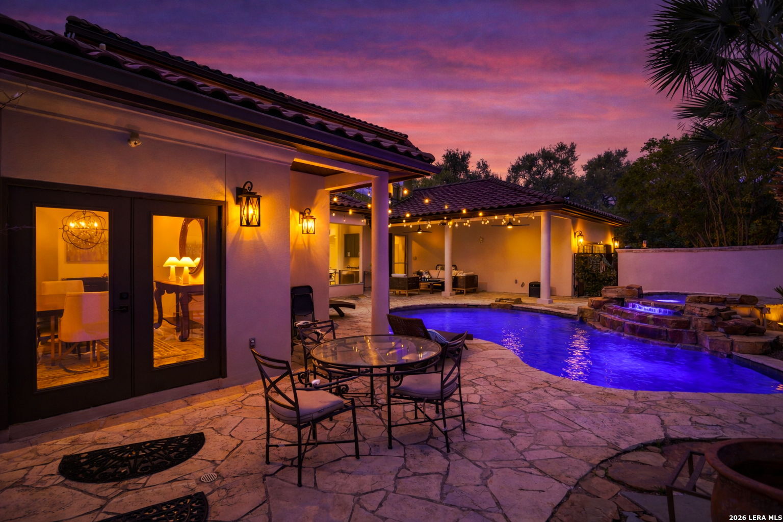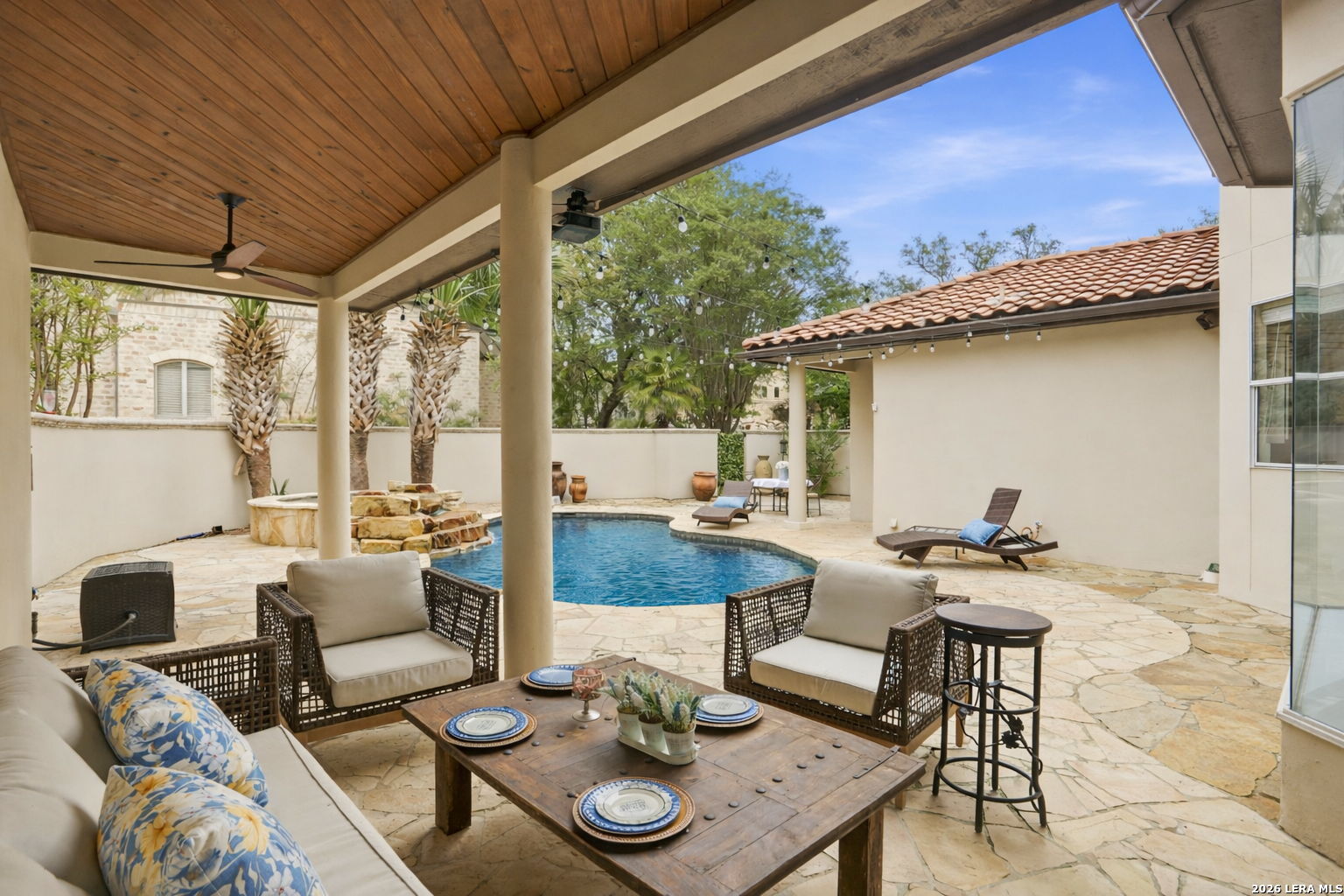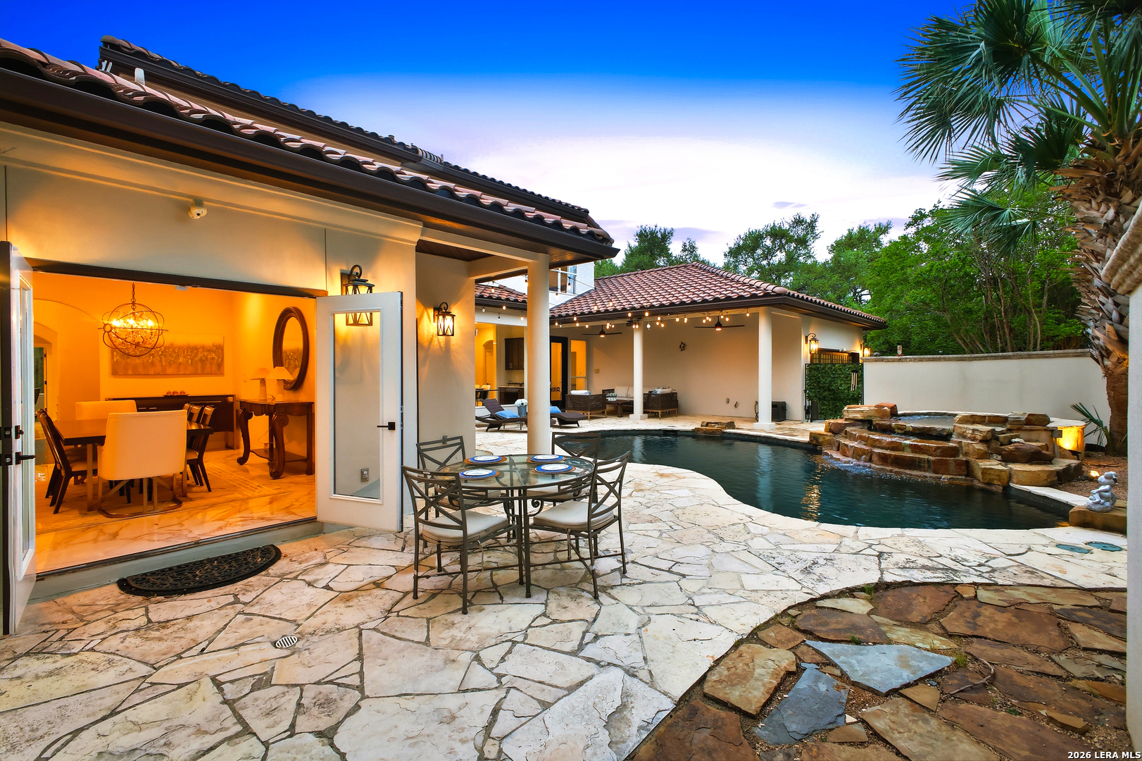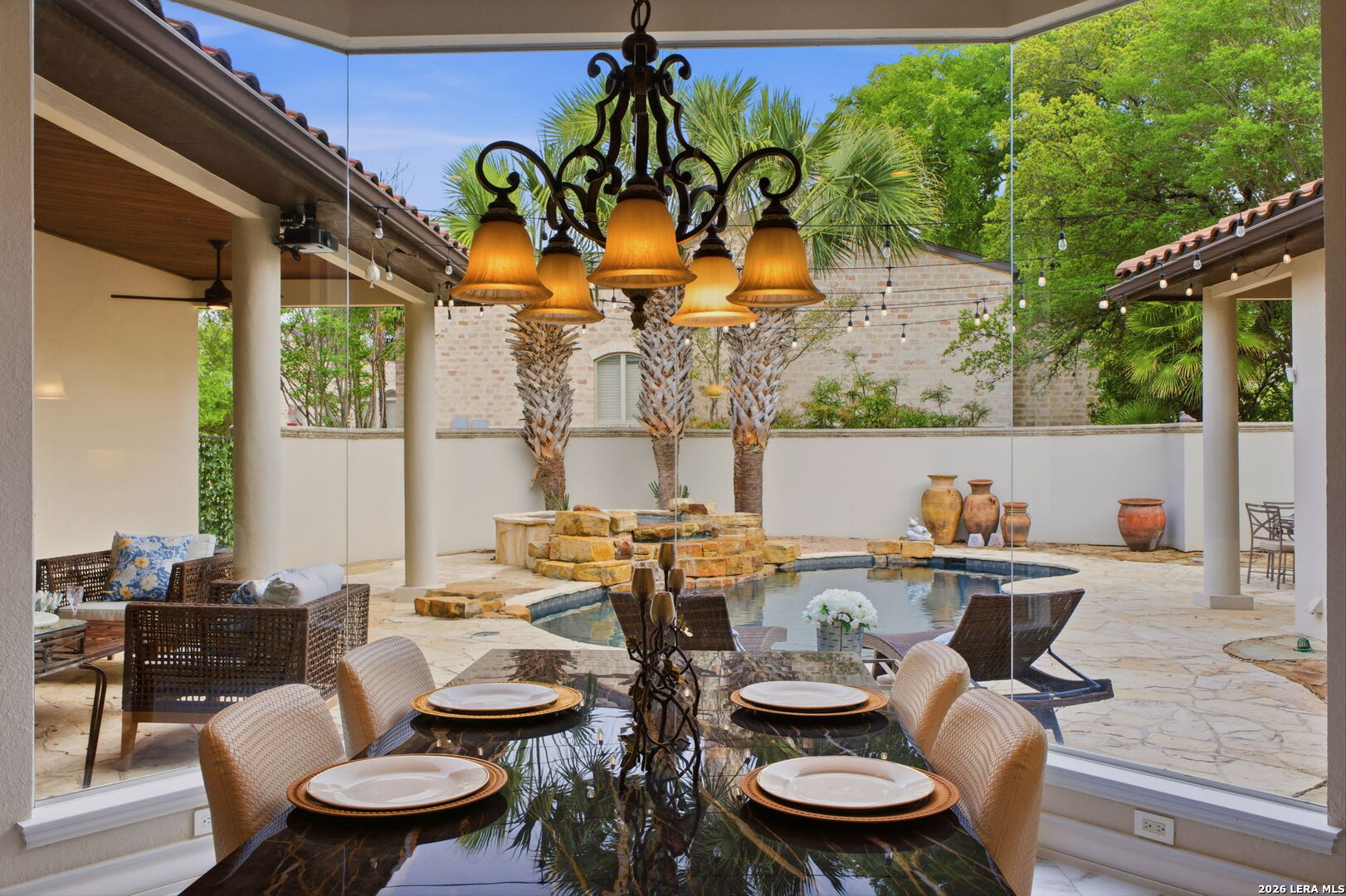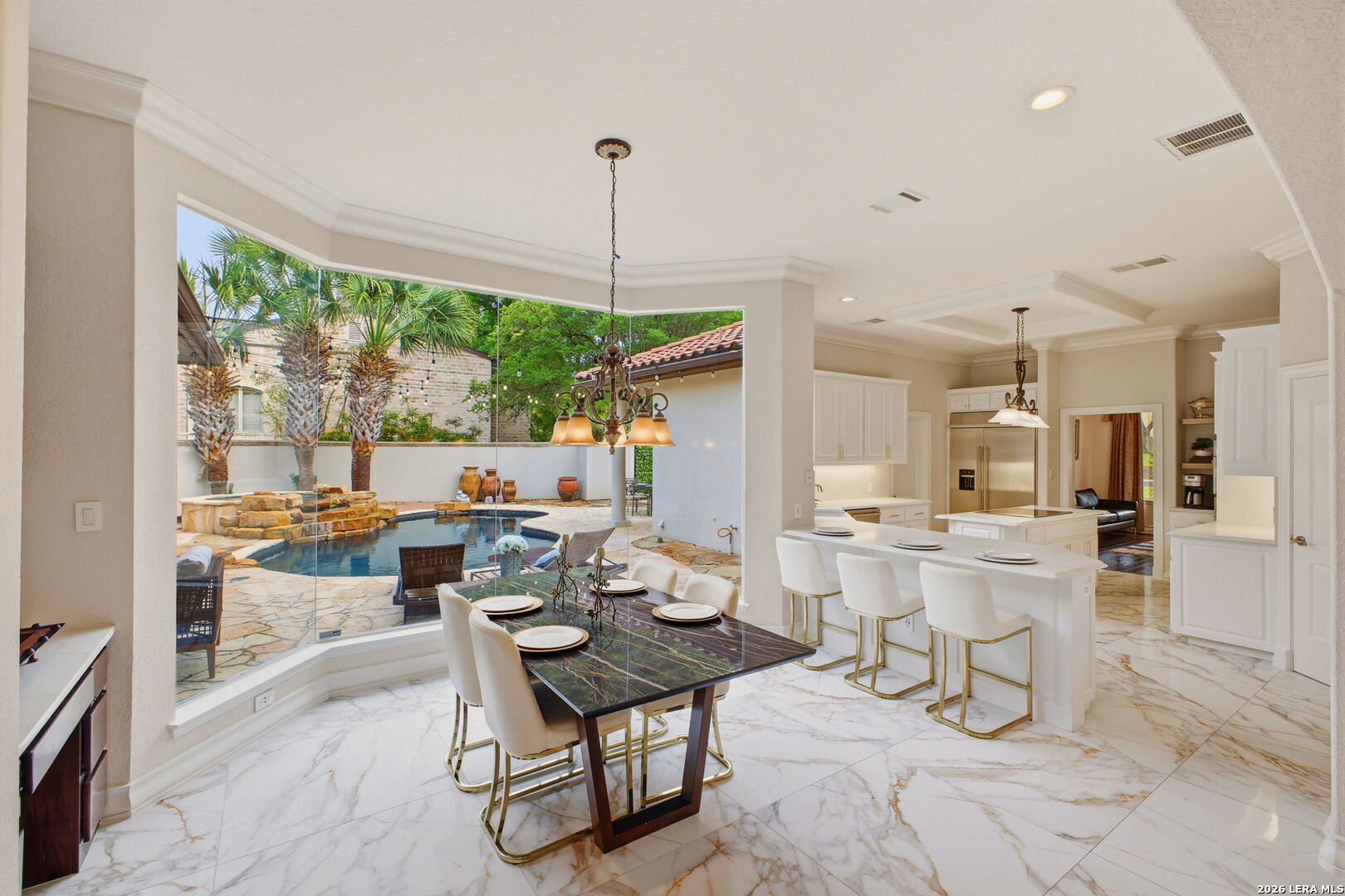 Welcome home to 1 Belcourt Place inside the Dominion! Enjoy over half an acre of mature trees and lush green space inside the highly sought after neighborhood. Host your friends at your pool equipped with the Outdoor projector and sound system entertainment package everyone will be talking about. Send your kiddos off to school with the bus route stopping right at your house. Walk out your front door and enjoy the holiday festivities on the greenbelt directly in front of your home. You even have your very own Golf Cart Garage! Seller has invested significantly in high-quality renovations throughout, including a fully updated chef's kitchen with quartz countertops, backsplash, farmhouse sink, premium faucet, new appliances, and induction cooktop with Sub-Zero refrigerator. Flooring and finishes have been upgraded across the home, creating a modern, move-in-ready luxury feel Home offers 4 bedrooms, 5 baths, Office, Three spacious living areas on the main level plus an additional upstairs living area, and a large formal dining room with direct access to the pool-perfect for large gatherings. The backyard is a private retreat with a stunning heated pool, spa, covered patio, and three palm trees-perfect for entertaining, Two balconies overlook a park, with walking access to scenic Dominion lakes and trails. Located in a highly desirable school zone. The spacious ground floor primary suite features a glamorous bathroom with dual vanities, dual closets, and a walk-through shower and soaking tub. Gorgeous hard wood flooring throughout the Master bedroom. The primary suite features a stunning wall of windows overlooking the serene park and mature trees, filling the space with natural light. Enjoy direct access to a spacious private balcony-perfect for morning coffee or unwinding in the evening surrounded by sunshine and the peaceful sounds of nature. The windows are enhanced with upgraded motorized shades, easily controlled at the touch of a button for added comfort and convenience. The breakfast area is highlighted by a dramatic wall of windows overlooking the private pool and palm trees, bringing in abundant natural light and a true indoor-outdoor living experience. This home is a rare find, ideally located directly across from a serene park, offering exceptional privacy with no homes immediately in front. The spacious main level features multiple living areas, creating an open and comfortable layout that feels both expansive and highly functional. A full bathroom with direct access from the pool area adds everyday convenience. The spacious main level features multiple living areas, creating an open and comfortable layout that feels both expansive and highly functional. This home is truly one of a kind!