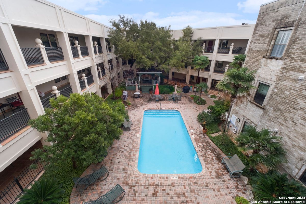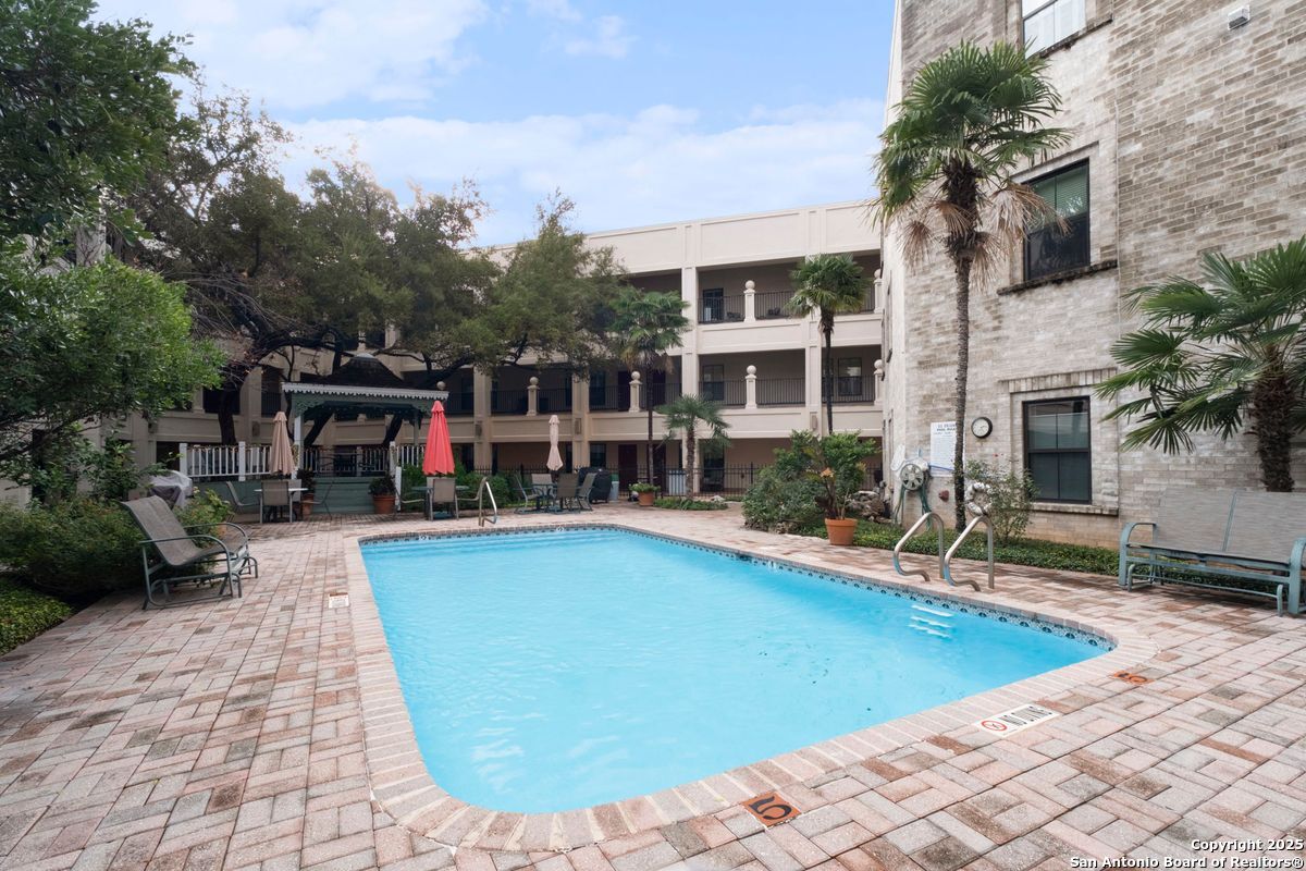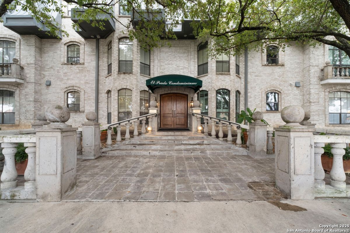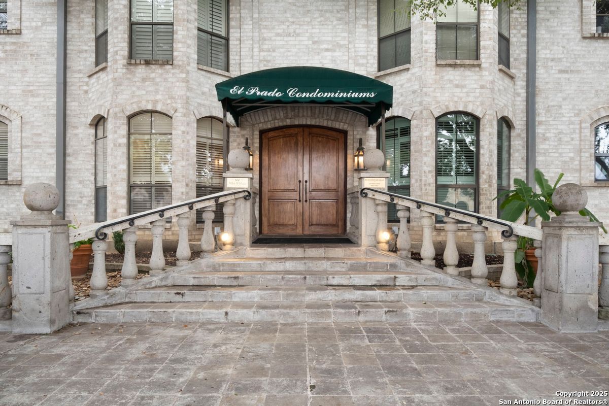 Welcome to 100 W. El Prado, where luxury condominium living meets the prestige of Olmos Park. This rare top-floor residence is one of only six 3-bedroom units in this boutique 3-story development, offering an exclusive opportunity to live in this highly sought-after community. Recently transformed by a meticulous $200,000 renovation, the open-concept interior is a showcase of modern sophistication. Highlights include a newly designed kitchen with quartzite countertops, a matching backsplash, custom cabinetry, and high-end appliances, along with fully updated baths, new windows, lighting, flooring, and interior doors, all within a freshly painted interior. The home features a wood-burning fireplace, a wet bar, and a utility room with a full-size washer and dryer. Each spacious bedroom includes its own en-suite bath, while the luxurious primary suite is designed for ultimate comfort with two walk-in closets and a spa-inspired bathroom featuring marble double vanities, a garden tub, and a walk-in shower. This exclusive, controlled-access community offers the convenience of elevator access and a secure gated parking garage, with two dedicated parking spaces near the elevator and ample guest parking. At the heart of the property lies a beautifully landscaped courtyard with a sparkling pool, a tranquil fishpond, and a charming gazebo. Residents also enjoy access to a club room for social gatherings and a guest suite for accommodating visitors, all with low HOA dues that include water. Perfectly positioned for a lock-and-leave lifestyle, this residence is within walking distance of upscale dining and shopping and just minutes from Trinity University, the University of the Incarnate Word, Hwy 281, The Pearl, downtown San Antonio, and the airport. Offering a seamless blend of luxury, convenience, and tranquility, this is an exceptional opportunity to live in one of the city's most desirable neighborhoods.