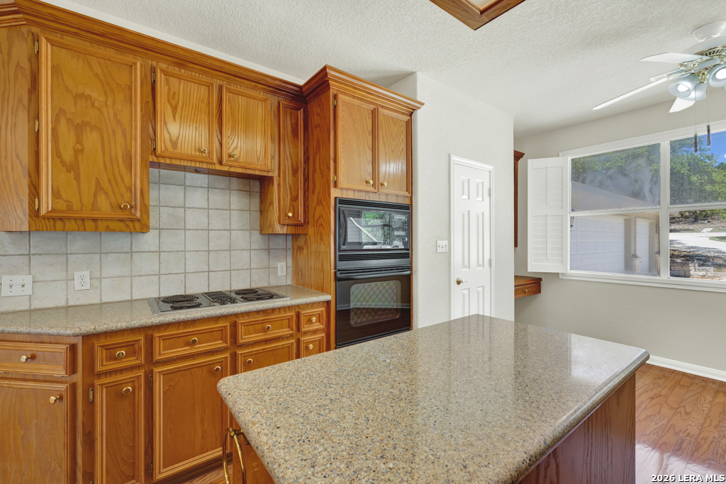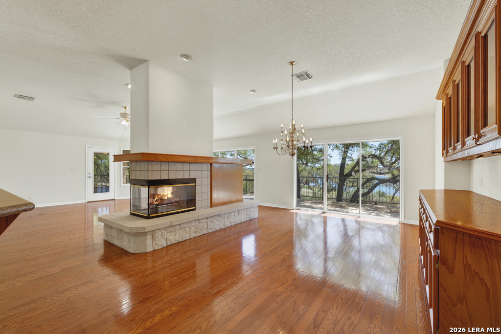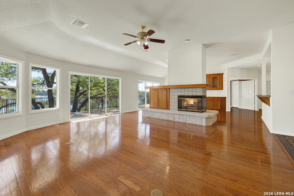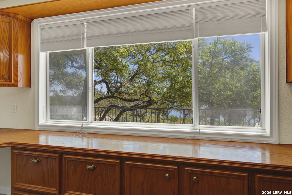 Tucked away on 4.16 acres with an impressive 335 feet of accessible waterfront, this exceptional Canyon Lake property is a rare and remarkable find. Surrounded by mature oak trees and natural landscaping, the setting offers unmatched privacy and tranquility, where wildlife such as deer, foxes, roadrunners, and native birds are part of your everyday view. From the back porch, take in breathtaking sunrises and sunsets over the water, an experience that never gets old. A circle driveway provides effortless access and ample parking, while the home itself has been meticulously maintained. Step inside to a one-of-a-kind foyer featuring painstakingly hand-cut petrified wood from the homeowners collection, setting the tone for the unique character found within. The main living areas showcase rich oak hardwood floors and a three-sided stone fireplace that anchors the space with warmth and charm. Expansive windows and glass doors flood the home with natural light and frame picturesque lake views. The open-concept kitchen flows seamlessly into the dining and living areas, making it perfect for both everyday living and entertaining. A dedicated office features built-in cabinetry and shelving, along with direct access to a sunroom, ideal for work or relaxation. The spacious primary suite offers new carpet, a walk-in closet, and a bathroom complete with a jetted tub and walk-in shower. Additional features include plantation shutters, a central vacuum system, an oversized mudroom with durable concrete flooring, a true "Butler's Pantry" and a three-car garage. This property is serviced by a private well and is plumbed for a water softener. Major updates include a new roof in 2022 and exterior paint completed just two years ago. Whether you're seeking a serene waterfront retreat or a one-of-a-kind primary residence, this Canyon Lake gem delivers space, beauty, and timeless appeal with room to add on.