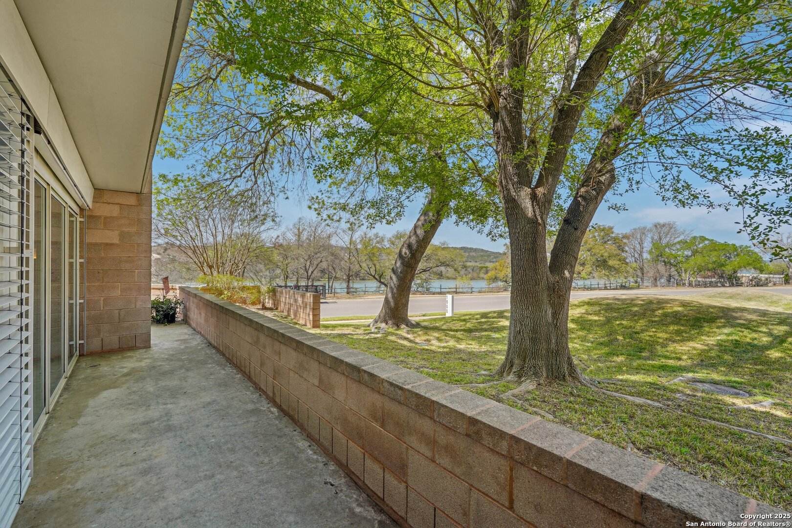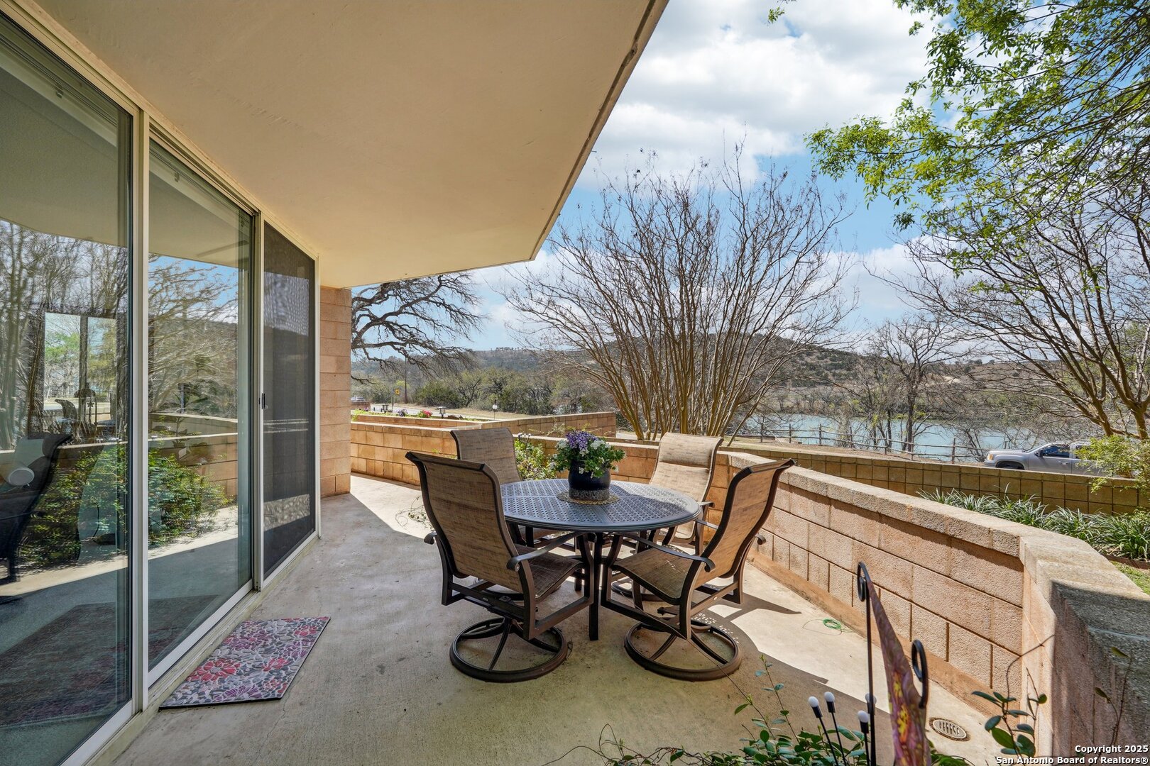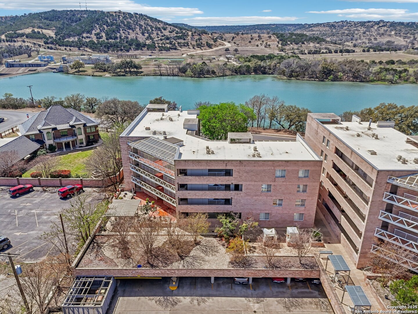 Discover this exceptional ground-level corner unit in the first tower, offering breathtaking views from nearly every room. This rare gem features floor-to-ceiling commercial glass windows on 2 sides, including 6 sliding patio doors. Step onto the expansive wraparound patio, which overlooks Nimitz Lake/Guadalupe River & includes a 30'+/- raised planter, adding charm to the outdoor space. Beyond the water, enjoy serene Hill Country vistas, creating a truly picturesque retreat. Spanning 1,777 sq ft, this thoughtfully designed residence offers 2 beds, 2 baths, & a spacious office with stunning views. The primary suite boasts a luxurious en-suite bath & direct patio access to soak in the scenery. The 2nd bath features a walk-in tub, enhancing ADA accessibility. Designed for effortless living, this lock & leave property includes an elevator, an energy-efficient geothermal heat pump HVAC, & 2 reserved parking spaces with a private storage unit. Enjoy premier HOA amenities, including a resort-style pool, landscaped courtyard, & other common areas. Ideally situated within walking distance of the Guadalupe Park & River Trail, this location offers endless opportunities for outdoor recreation.