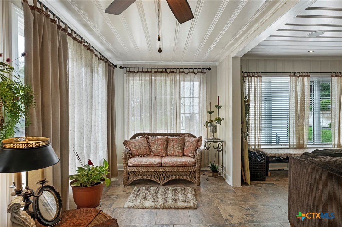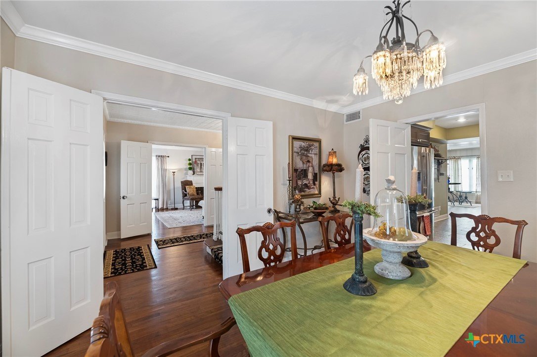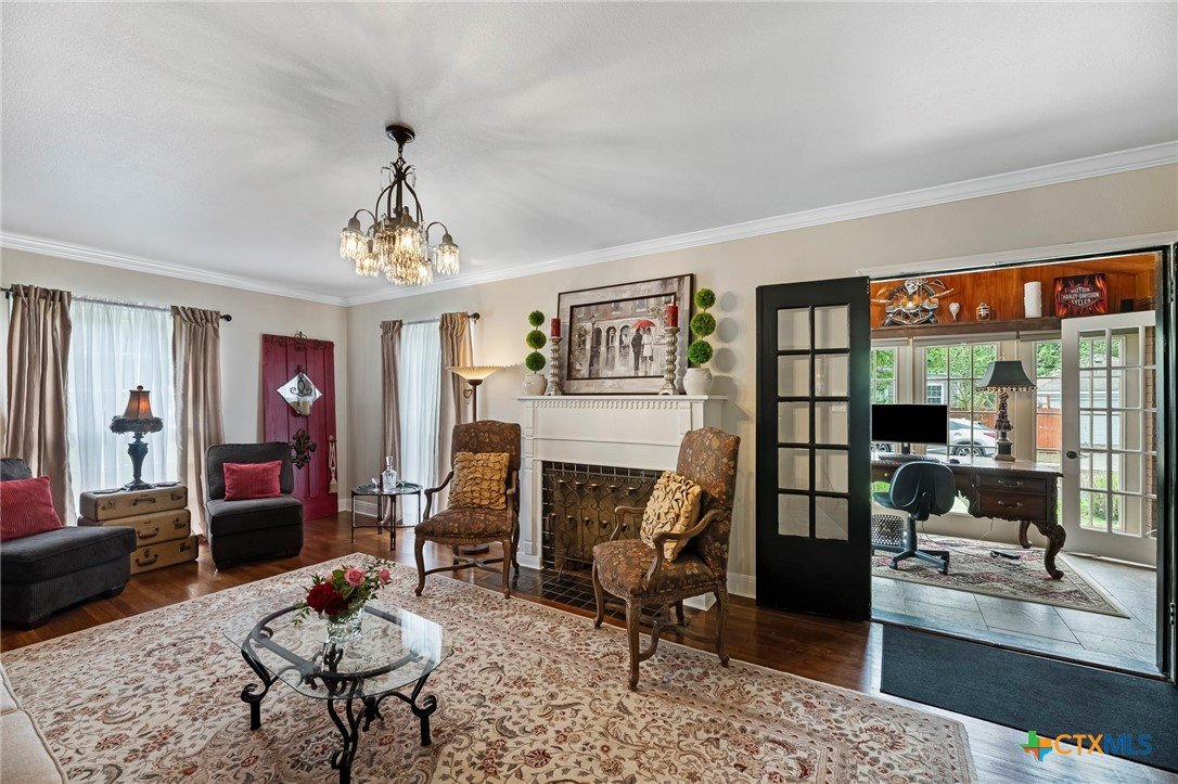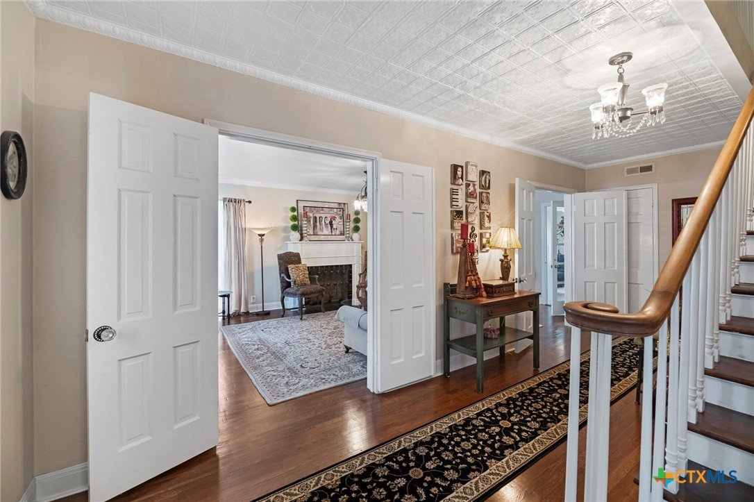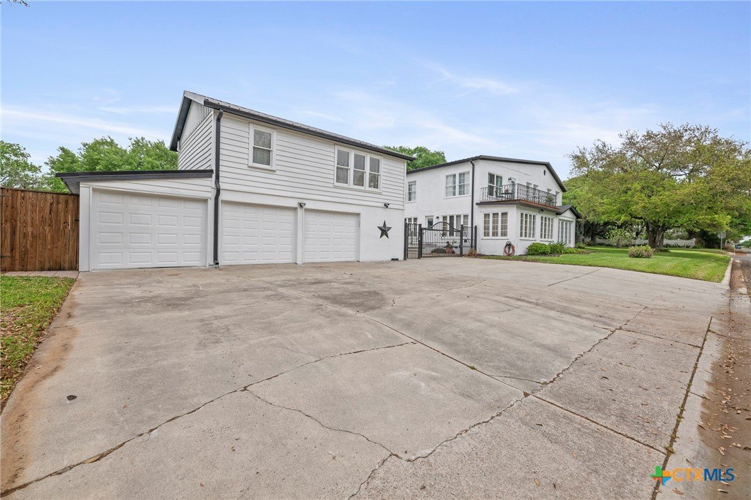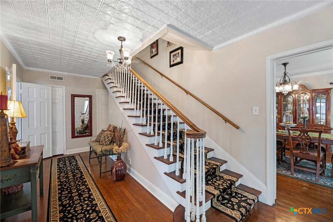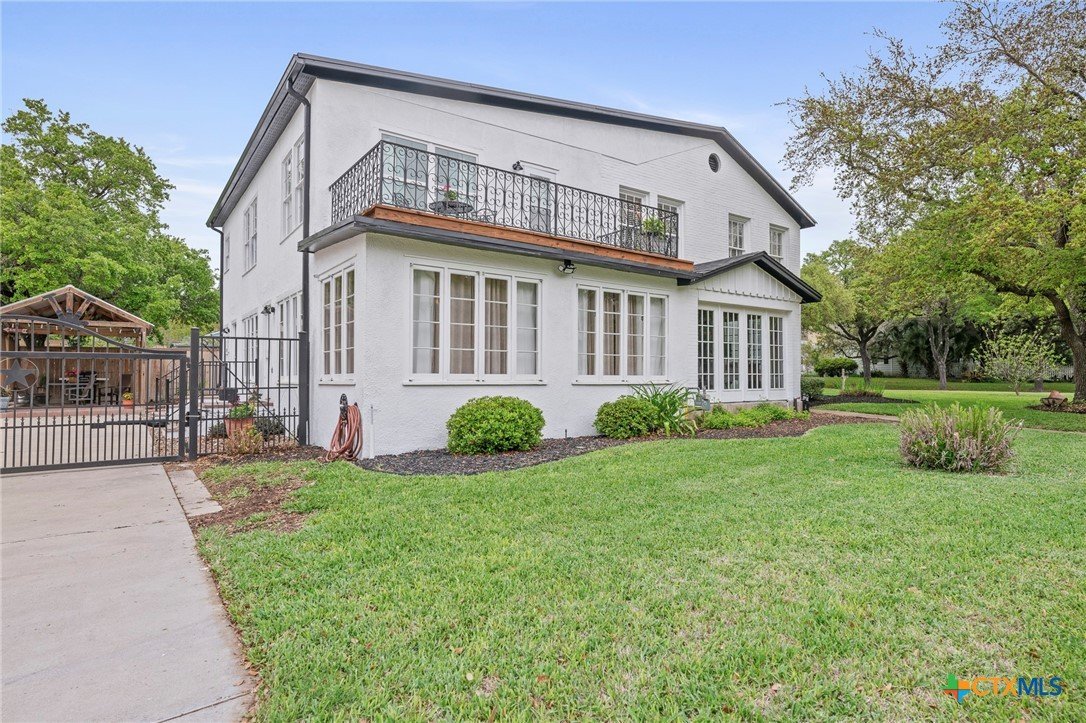 Step in to this stunning vintage home in the most picturesque area in Beeville. As you enter the home you are greeted by the intricately detailed metal ceiling, which creates a striking visual statement, and the majestic stairway leading to the upper level. Crystal chandeliers adorn the foyer, dining room, and formal living space, enhancing the grandeur. Flanking the entryway are two generously-sized rooms, each accessed through stunning double doors. Both the living room on the left and the dining room on the right boast impressive architectural details including high ceilings, wide base boards, lovely crown molding, and a decorative fireplace in the living room. Discover the elegant, renovated kitchen and a second living area, accompanied by a convenient laundry room and a half bath, located in the rear of the home. You’ll love the amazing kitchen designed with entertainment in mind! It is the complete package with beautiful, updated cabinetry with granite countertops, gas cooktop, and other stainless appliances that include double ovens, microwave, dishwasher and refrigerator. The luxury primary suite is located on the upper level and features a spacious spa-like bath, a large sitting area, an enormous walk-in closet, and a private balcony that over looks the street below. There are three additional bedrooms and a second full bath upstairs with plentiful windows that allow for natural light. In addition to the gracious charm of the main residence there is a 3-car garage with a 600 sf apt (1 bed/1bath) above that has previously been used for extra income. The well-groomed back yard features a lighted pergola with sun shades to enjoy the outdoor space any time of year, day or night! And to add to joy of owning your dream vintage home, the electrical and plumbing (interior and drain lines) are updated and there is a sprinkler system.