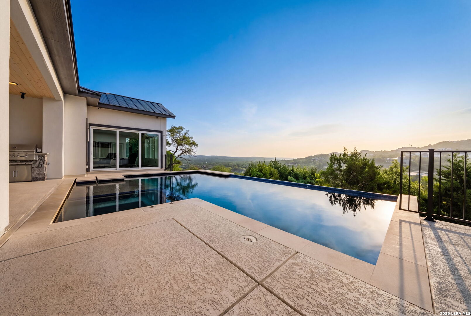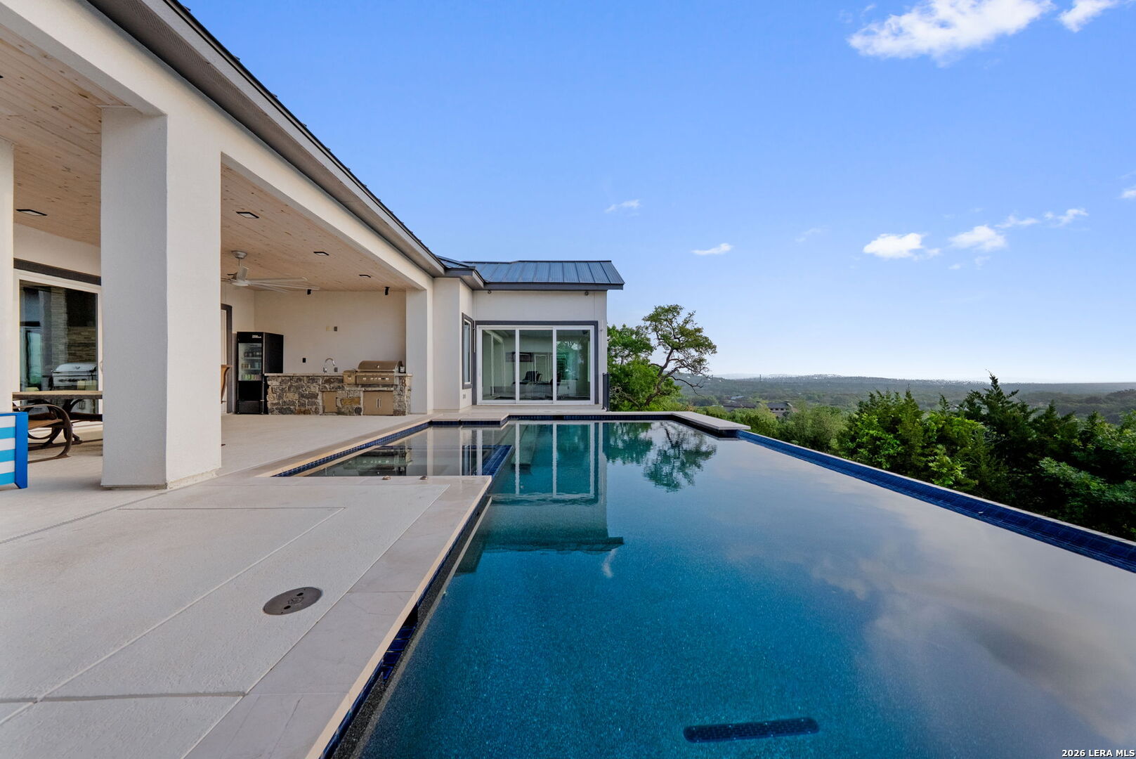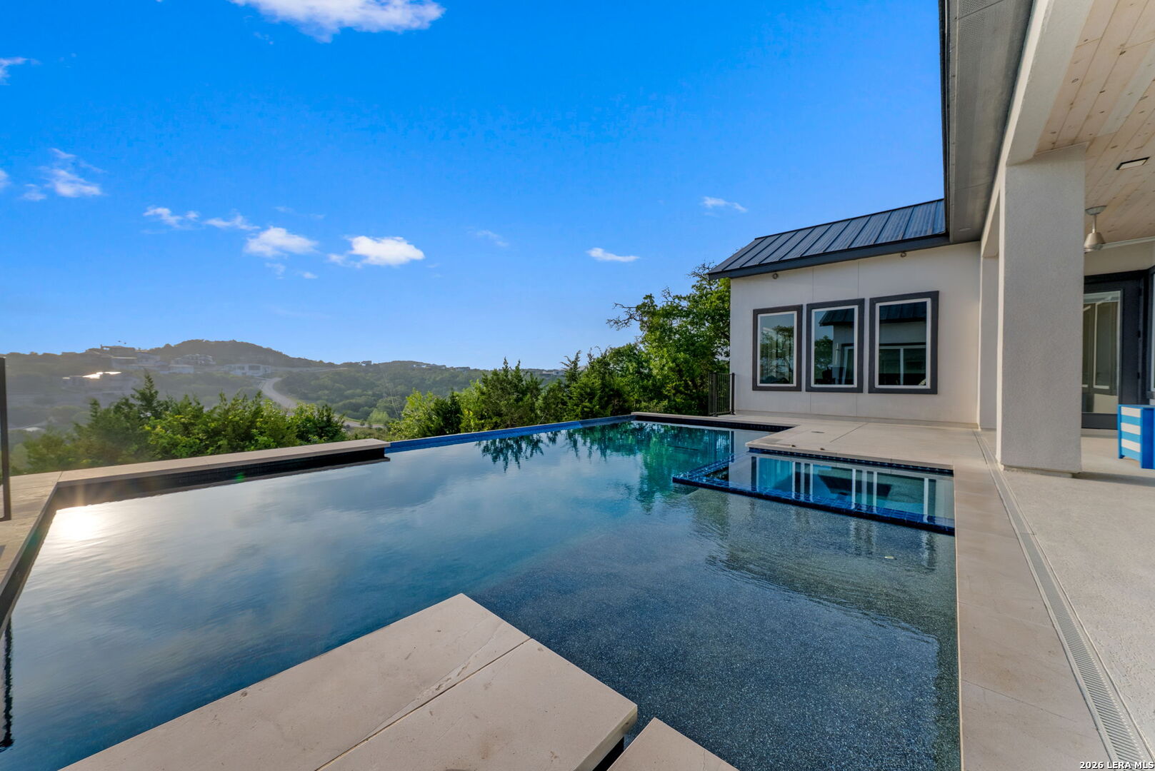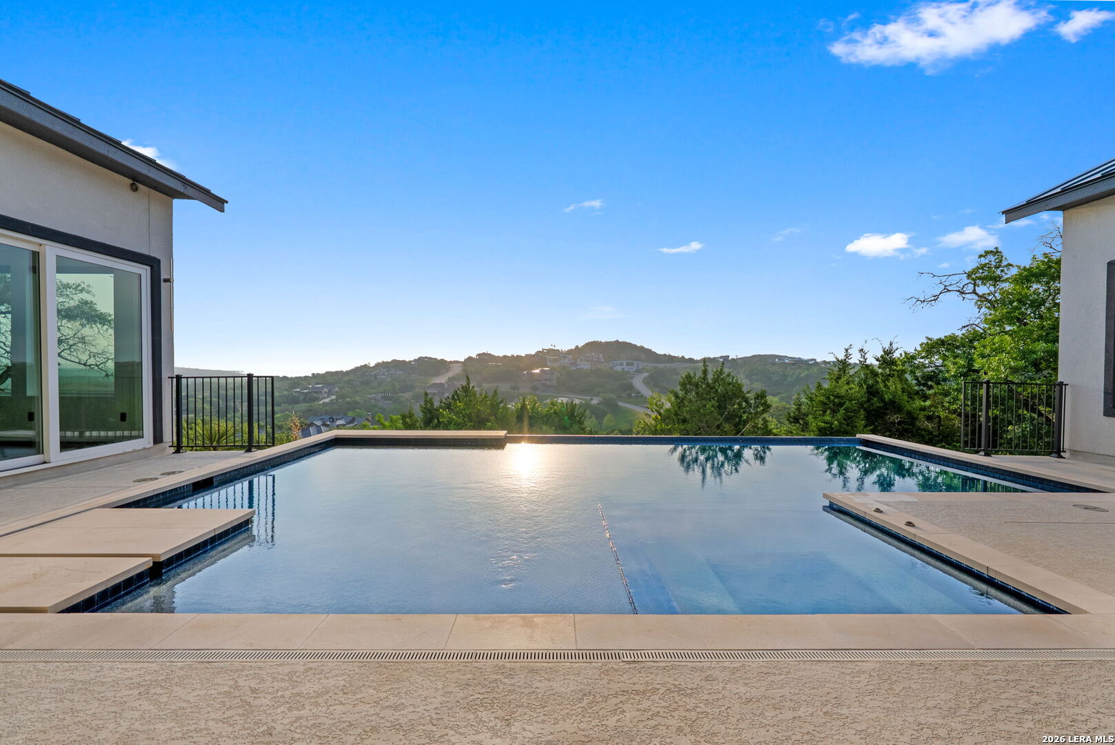 Luxury single-story smart home with panoramic Hill Country views, infinity-edge pool, and outdoor kitchen in the prestigious gated community of The Canyons at Scenic Loop. Perched on one of the highest ridges in the neighborhood, this exceptional San Antonio luxury home offers 4 bedrooms, 4 full baths, and a flexible second living area or study with sliding glass doors overlooking the pool that could easily serve as a 5th bedroom, media room, game room, or private home office. From the moment you enter, the home makes a striking impression with a dramatic great room showcasing exposed beams, designer lighting accents, expansive windows, and large sliders that open to the covered patio, outdoor kitchen, and breathtaking Hill Country views. Natural light pours in while the open-concept design creates seamless indoor-outdoor flow, ideal for both elevated entertaining and everyday living. Buyers searching for a home with views in San Antonio will appreciate the combination of architectural appeal, flexibility, and lifestyle this home offers. The gourmet kitchen is designed for both daily living and entertaining, featuring a large center island, quartz countertops, double ovens, abundant cabinetry, generous prep space, and effortless connection to the living and dining areas. Whether hosting a crowd or enjoying a quiet evening at home, the layout is functional, inviting, and refined. The privately situated primary suite is a true retreat with large windows framing expansive Hill Country views and a spa-like bath featuring a dramatic wet-room design, complete with a deep soaking tub, oversized walk-in shower with two body spray panels and shower heads and rain shower, and a towel warmer for an added touch of luxury. The flexible second living room or study also enjoys large windows and sweeping views, adding even more appeal for buyers seeking a home office, media room, lounge, or guest space with an exceptional setting. One secondary bedroom offers an ensuite bath, while two additional secondary bedrooms share a full bath. Step outside and experience true resort-style outdoor living. The backyard is the showpiece of the home, featuring a spectacular Keith Zars infinity-edge pool, swim-up bar, large covered patio, and outdoor kitchen with refrigerator, all perfectly positioned to capture sweeping Texas Hill Country views. The east-facing backyard welcomes beautiful morning light and cooler afternoon outdoor living, creating an ideal setting for entertaining, relaxing, and enjoying the surrounding landscape. Smart home technology includes a Control4 system, CAT-6 wiring, audio/TV connectivity, customized LED lighting, and mobile phone control for a seamless modern living experience. Additional highlights include striking architectural details, greenbelt access below, and a prime location in one of San Antonio's most sought-after luxury communities. The Canyons at Scenic Loop offers a gated setting with convenient access to La Cantera, The Rim, premier shopping, dining, entertainment, and major thoroughfares, while still feeling private, scenic, and tucked away in the hills. Rarely does a single-story luxury home in The Canyons at Scenic Loop offer this combination of Hill Country views, infinity-edge pool, outdoor kitchen, flexible living space, luxury finishes, and smart home technology. An exceptional opportunity to own a true Hill Country retreat in San Antonio.