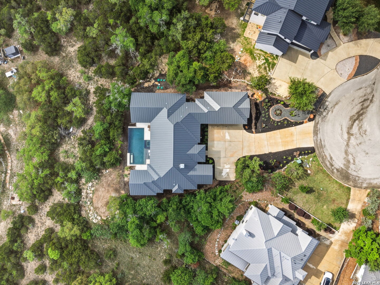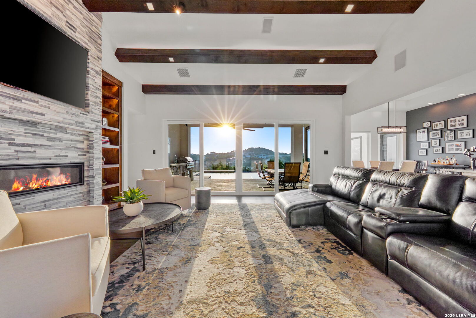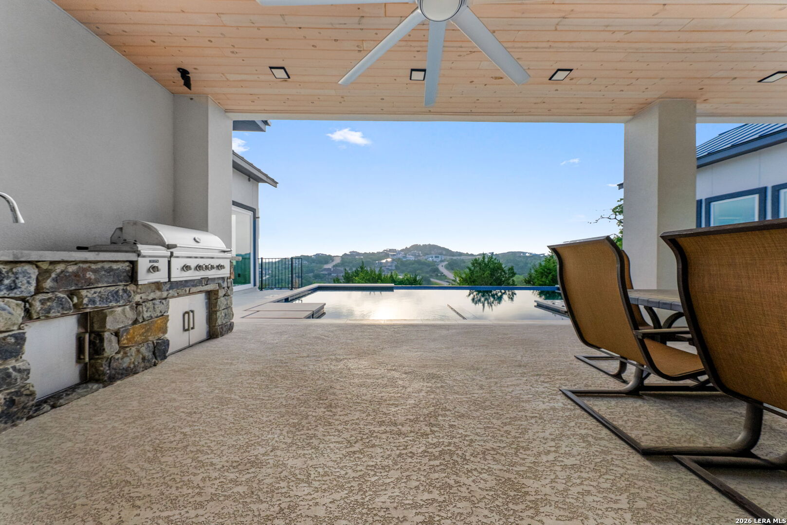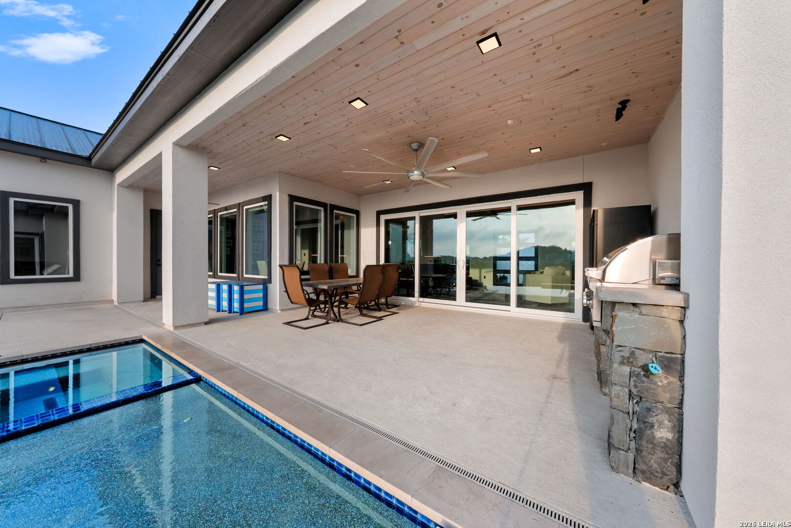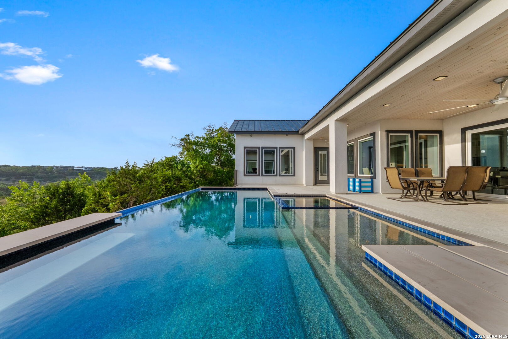 Luxury single-story smart home with panoramic Hill Country views, infinity-edge pool, and outdoor kitchen in the prestigious gated community of The Canyons at Scenic Loop. Perched on one of the highest ridges in the neighborhood, this exceptional San Antonio luxury home offers 4 bedrooms, 4 full baths, and a flexible second living area or study with sliding glass doors overlooking the pool that could easily serve as a 5th bedroom, media room, game room, or private home office. From the moment you enter, the home makes a striking impression with a dramatic great room showcasing exposed beams, designer lighting accents, expansive windows, and large sliders that open to the covered patio, outdoor kitchen, and breathtaking Hill Country views. Natural light pours in while the open-concept design creates seamless indoor-outdoor flow, ideal for both elevated entertaining and everyday living. Buyers searching for a home with views in San Antonio will appreciate the combination of architectural appeal, flexibility, and lifestyle this home offers. The gourmet kitchen is designed for both daily living and entertaining, featuring a large center island, quartz countertops, double ovens, abundant cabinetry, generous prep space, and effortless connection to the living and dining areas. Whether hosting a crowd or enjoying a quiet evening at home, the layout is functional, inviting, and refined. The privately situated primary suite is a true retreat with large windows framing expansive Hill Country views and a spa-like bath featuring a dramatic wet-room design, complete with a deep soaking tub, oversized walk-in shower with two body spray panels and shower heads and rain shower, and a towel warmer for an added touch of luxury. The flexible second living room or study also enjoys large windows and sweeping views, adding even more appeal for buyers seeking a home office, media room, lounge, or guest space with an exceptional setting. One secondary bedroom offers an ensuite bath, while two additional secondary bedrooms share a full bath. Step outside and experience true resort-style outdoor living. The backyard is the showpiece of the home, featuring a spectacular Keith Zars infinity-edge pool, swim-up bar, large covered patio, and outdoor kitchen with refrigerator, all perfectly positioned to capture sweeping Texas Hill Country views. The east-facing backyard welcomes beautiful morning light and cooler afternoon outdoor living, creating an ideal setting for entertaining, relaxing, and enjoying the surrounding landscape. Smart home technology includes a Control4 system, CAT-6 wiring, audio/TV connectivity, customized LED lighting, and mobile phone control for a seamless modern living experience. Additional highlights include striking architectural details, greenbelt access below, and a prime location in one of San Antonio's most sought-after luxury communities. The Canyons at Scenic Loop offers a gated setting with convenient access to La Cantera, The Rim, premier shopping, dining, entertainment, and major thoroughfares, while still feeling private, scenic, and tucked away in the hills. Rarely does a single-story luxury home in The Canyons at Scenic Loop offer this combination of Hill Country views, infinity-edge pool, outdoor kitchen, flexible living space, luxury finishes, and smart home technology. An exceptional opportunity to own a true Hill Country retreat in San Antonio.