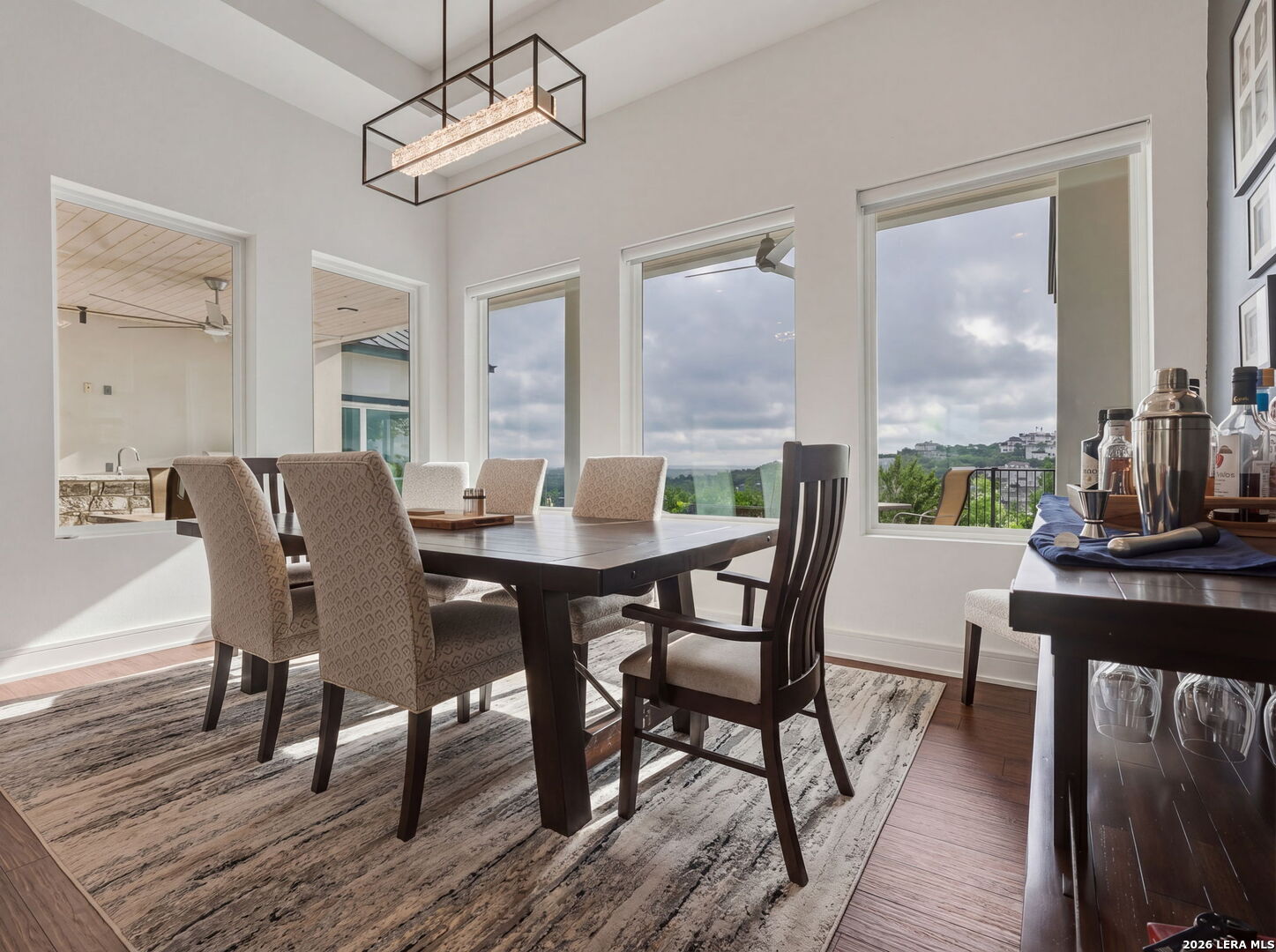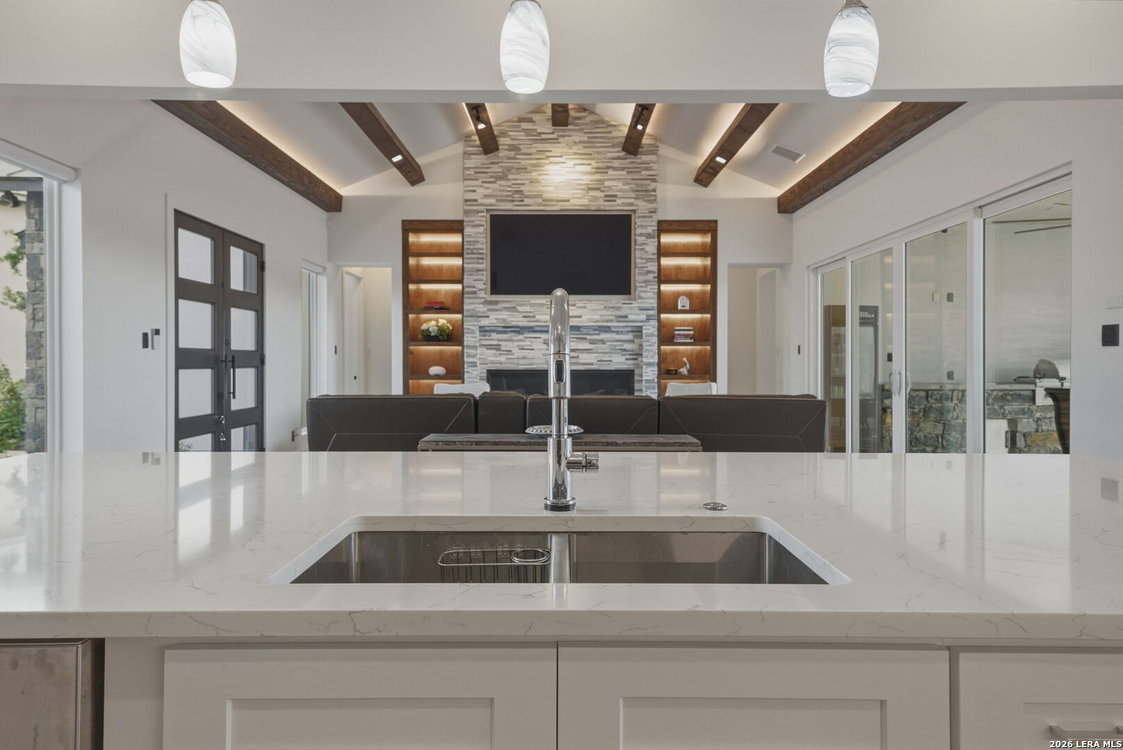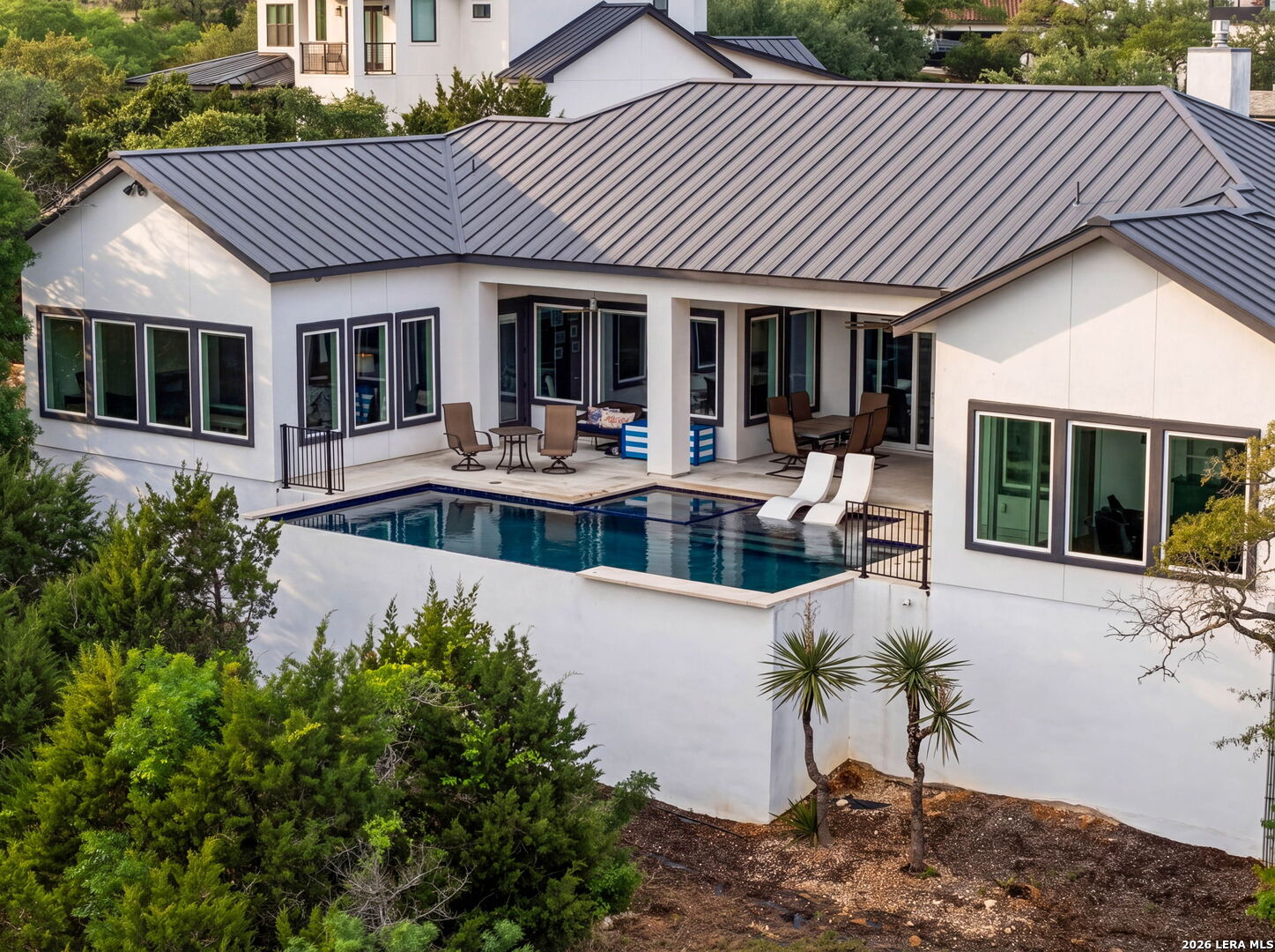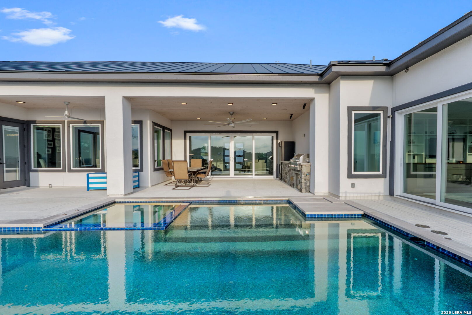 Luxury single-story smart home with panoramic Hill Country views, infinity-edge pool, and outdoor kitchen in the prestigious gated community of The Canyons at Scenic Loop. Perched on one of the highest ridges in the neighborhood, this exceptional San Antonio luxury home offers 4 bedrooms, 4 full baths, and a flexible second living area or study with sliding glass doors overlooking the pool that could easily serve as a 5th bedroom, media room, game room, or private home office. From the moment you enter, the home makes a striking impression with a dramatic great room showcasing exposed beams, designer lighting accents, expansive windows, and large sliders that open to the covered patio, outdoor kitchen, and breathtaking Hill Country views. Natural light pours in while the open-concept design creates seamless indoor-outdoor flow, ideal for both elevated entertaining and everyday living. Buyers searching for a home with views in San Antonio will appreciate the combination of architectural appeal, flexibility, and lifestyle this home offers. The gourmet kitchen is designed for both daily living and entertaining, featuring a large center island, quartz countertops, double ovens, abundant cabinetry, generous prep space, and effortless connection to the living and dining areas. Whether hosting a crowd or enjoying a quiet evening at home, the layout is functional, inviting, and refined. The privately situated primary suite is a true retreat with large windows framing expansive Hill Country views and a spa-like bath featuring a dramatic wet-room design, complete with a deep soaking tub, oversized walk-in shower with two body spray panels and shower heads and rain shower, and a towel warmer for an added touch of luxury. The flexible second living room or study also enjoys large windows and sweeping views, adding even more appeal for buyers seeking a home office, media room, lounge, or guest space with an exceptional setting. One secondary bedroom offers an ensuite bath, while two additional secondary bedrooms share a full bath. Step outside and experience true resort-style outdoor living. The backyard is the showpiece of the home, featuring a spectacular Keith Zars infinity-edge pool, swim-up bar, large covered patio, and outdoor kitchen with refrigerator, all perfectly positioned to capture sweeping Texas Hill Country views. The east-facing backyard welcomes beautiful morning light and cooler afternoon outdoor living, creating an ideal setting for entertaining, relaxing, and enjoying the surrounding landscape. Smart home technology includes a Control4 system, CAT-6 wiring, audio/TV connectivity, customized LED lighting, and mobile phone control for a seamless modern living experience. Additional highlights include striking architectural details, greenbelt access below, and a prime location in one of San Antonio's most sought-after luxury communities. The Canyons at Scenic Loop offers a gated setting with convenient access to La Cantera, The Rim, premier shopping, dining, entertainment, and major thoroughfares, while still feeling private, scenic, and tucked away in the hills. Rarely does a single-story luxury home in The Canyons at Scenic Loop offer this combination of Hill Country views, infinity-edge pool, outdoor kitchen, flexible living space, luxury finishes, and smart home technology. An exceptional opportunity to own a true Hill Country retreat in San Antonio.