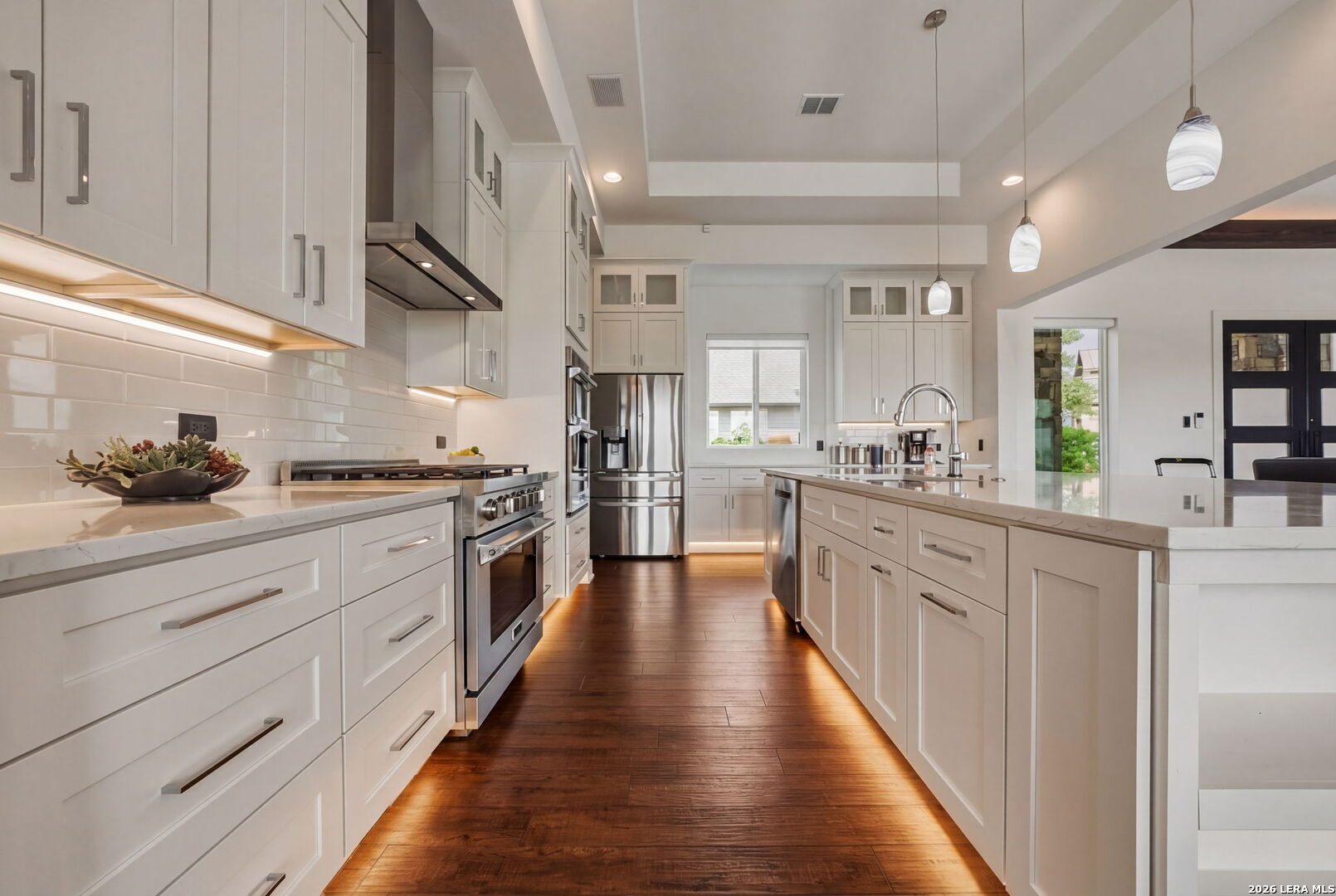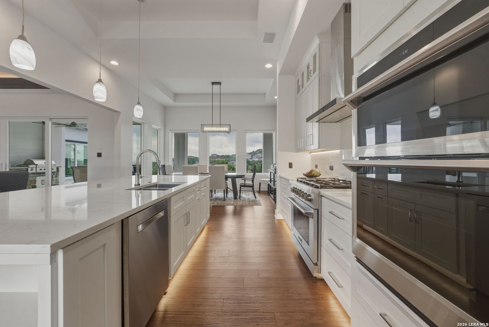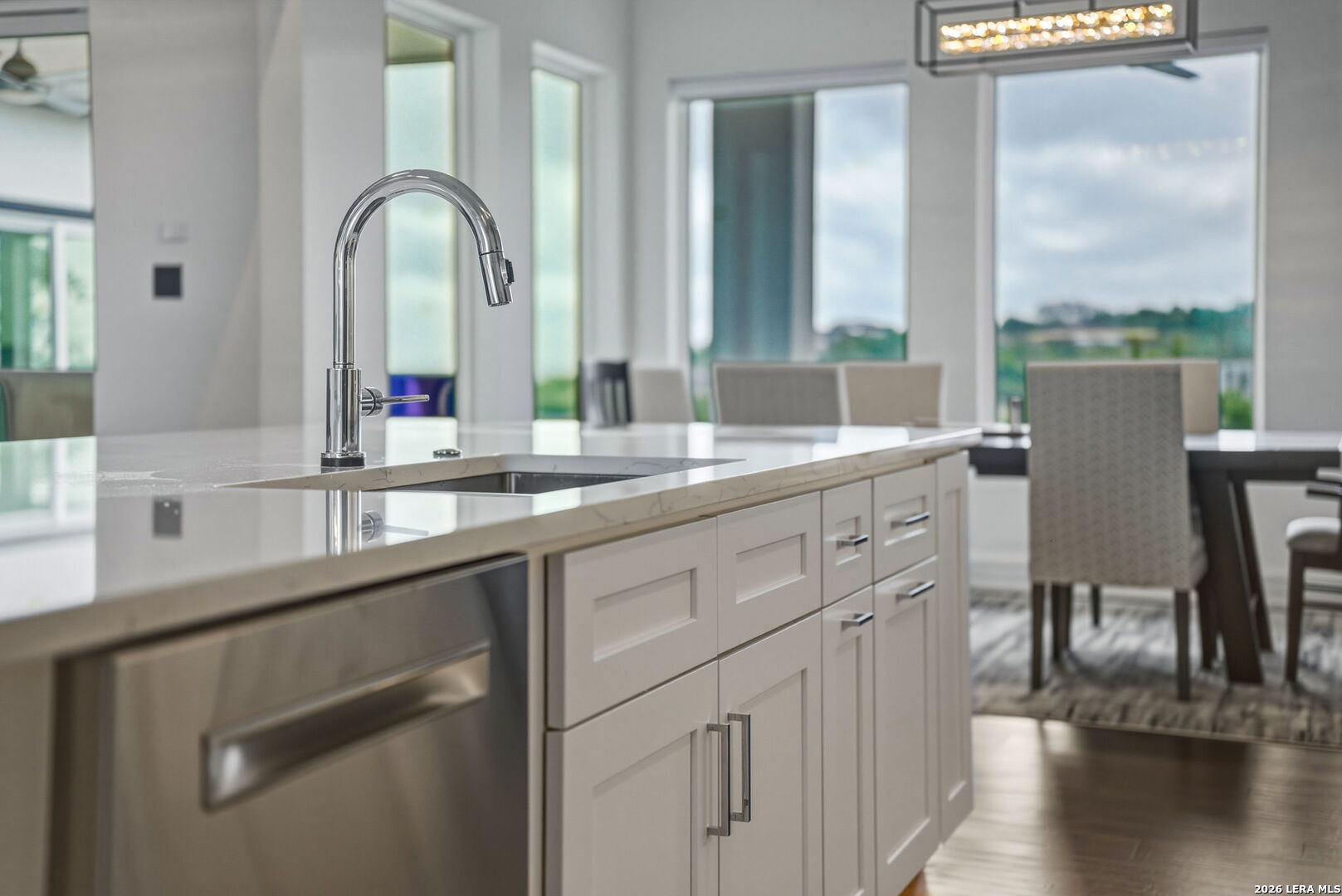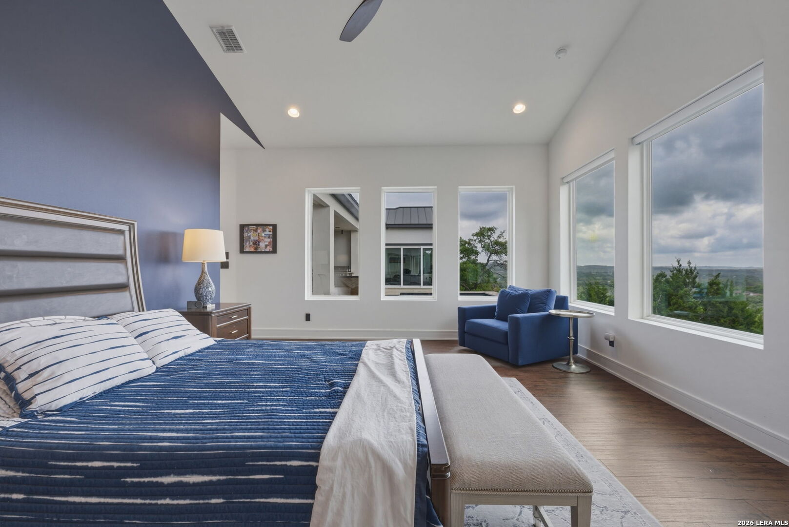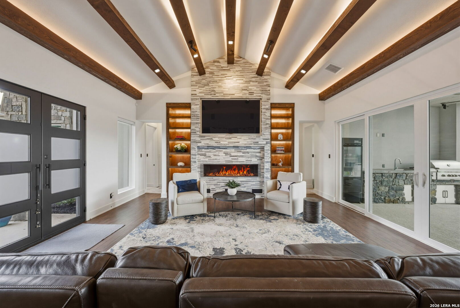 Luxury single-story smart home with panoramic Hill Country views, infinity-edge pool, and outdoor kitchen in the prestigious gated community of The Canyons at Scenic Loop. Perched on one of the highest ridges in the neighborhood, this exceptional San Antonio luxury home offers 4 bedrooms, 4 full baths, and a flexible second living area or study with sliding glass doors overlooking the pool that could easily serve as a 5th bedroom, media room, game room, or private home office. From the moment you enter, the home makes a striking impression with a dramatic great room showcasing exposed beams, designer lighting accents, expansive windows, and large sliders that open to the covered patio, outdoor kitchen, and breathtaking Hill Country views. Natural light pours in while the open-concept design creates seamless indoor-outdoor flow, ideal for both elevated entertaining and everyday living. Buyers searching for a home with views in San Antonio will appreciate the combination of architectural appeal, flexibility, and lifestyle this home offers. The gourmet kitchen is designed for both daily living and entertaining, featuring a large center island, quartz countertops, double ovens, abundant cabinetry, generous prep space, and effortless connection to the living and dining areas. Whether hosting a crowd or enjoying a quiet evening at home, the layout is functional, inviting, and refined. The privately situated primary suite is a true retreat with large windows framing expansive Hill Country views and a spa-like bath featuring a dramatic wet-room design, complete with a deep soaking tub, oversized walk-in shower with two body spray panels and shower heads and rain shower, and a towel warmer for an added touch of luxury. The flexible second living room or study also enjoys large windows and sweeping views, adding even more appeal for buyers seeking a home office, media room, lounge, or guest space with an exceptional setting. One secondary bedroom offers an ensuite bath, while two additional secondary bedrooms share a full bath. Step outside and experience true resort-style outdoor living. The backyard is the showpiece of the home, featuring a spectacular Keith Zars infinity-edge pool, swim-up bar, large covered patio, and outdoor kitchen with refrigerator, all perfectly positioned to capture sweeping Texas Hill Country views. The east-facing backyard welcomes beautiful morning light and cooler afternoon outdoor living, creating an ideal setting for entertaining, relaxing, and enjoying the surrounding landscape. Smart home technology includes a Control4 system, CAT-6 wiring, audio/TV connectivity, customized LED lighting, and mobile phone control for a seamless modern living experience. Additional highlights include striking architectural details, greenbelt access below, and a prime location in one of San Antonio's most sought-after luxury communities. The Canyons at Scenic Loop offers a gated setting with convenient access to La Cantera, The Rim, premier shopping, dining, entertainment, and major thoroughfares, while still feeling private, scenic, and tucked away in the hills. Rarely does a single-story luxury home in The Canyons at Scenic Loop offer this combination of Hill Country views, infinity-edge pool, outdoor kitchen, flexible living space, luxury finishes, and smart home technology. An exceptional opportunity to own a true Hill Country retreat in San Antonio.