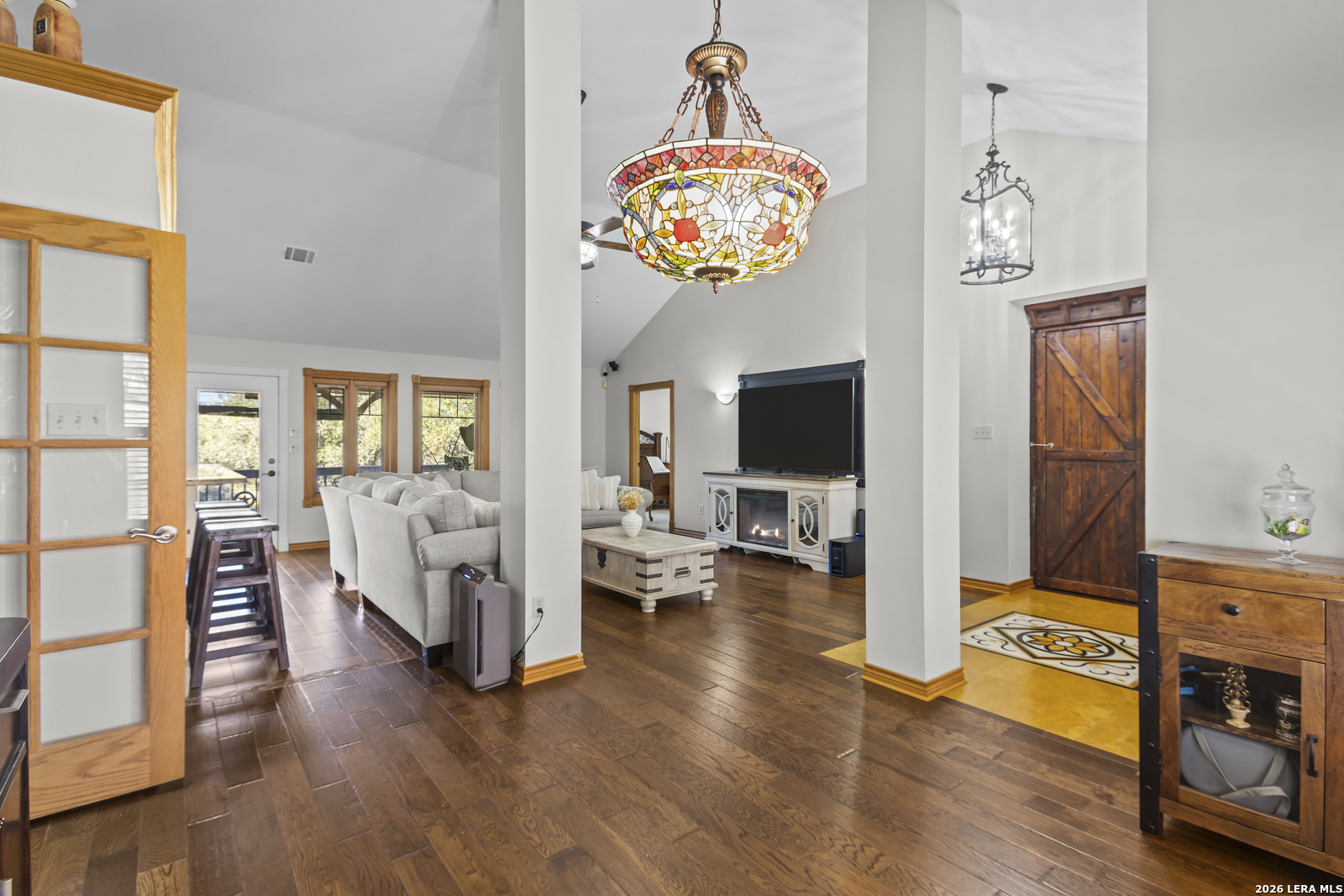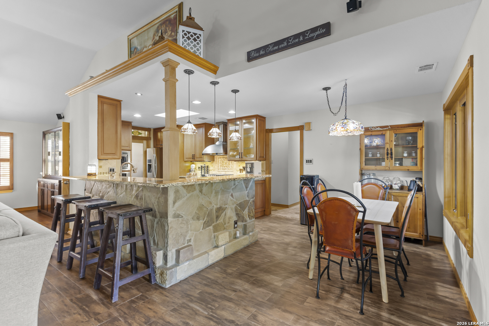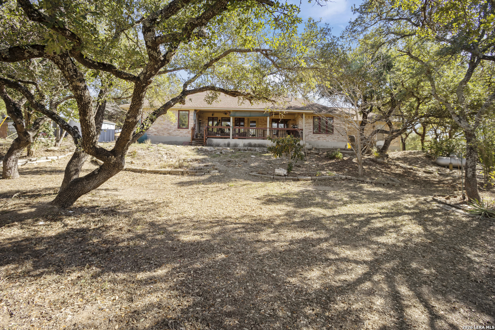 Welcome to your dream home! A stunning country-style Tilson residence that perfectly combines rustic charm with modern convenience. Nestled on 2.18 acres of picturesque land, this property offers a breathtaking country view and endless opportunities for relaxation and entertainment. The ceramic tile entryway invites you in, while the high ceilings and open space concept create an airy and welcoming atmosphere. Enjoy the blend of hickory wood, stone and ceramic flooring adding a touch of natural beauty to each room. The pantry and kitchen feature custom Cordell cabinets that provide ample storage space, beautiful granite countertops and sink, elegant Tiffany-Style chandeliers and skylights illuminate the space. Home includes Pella TRIPLE pane windows, complete with built-in screens and blinds. A beautiful retaining wall out front enhances the curb appeal, while a flagstone sidewalk guides you to the entrance. Enjoy the convenience of a 1-acre fully fenced-in area, complete with a heavy-duty custom front fence and two large entry gates for added security and privacy. For those with an RV, the electrical and waste hookup is a valuable addition, making travel preparations a breeze. The property also boasts a two-story garage/workshop. Located on a quiet cul-de-sac, this home is just a 25-minute drive from San Antonio, New Braunfels, or Canyon Lake, providing easy access to city amenities while maintaining a peaceful, country lifestyle. Enjoy the convenience of being minutes away from The District on 46, offering local shopping and dining options. This country retreat embodies the perfect blend of rustic charm and modern amenities.