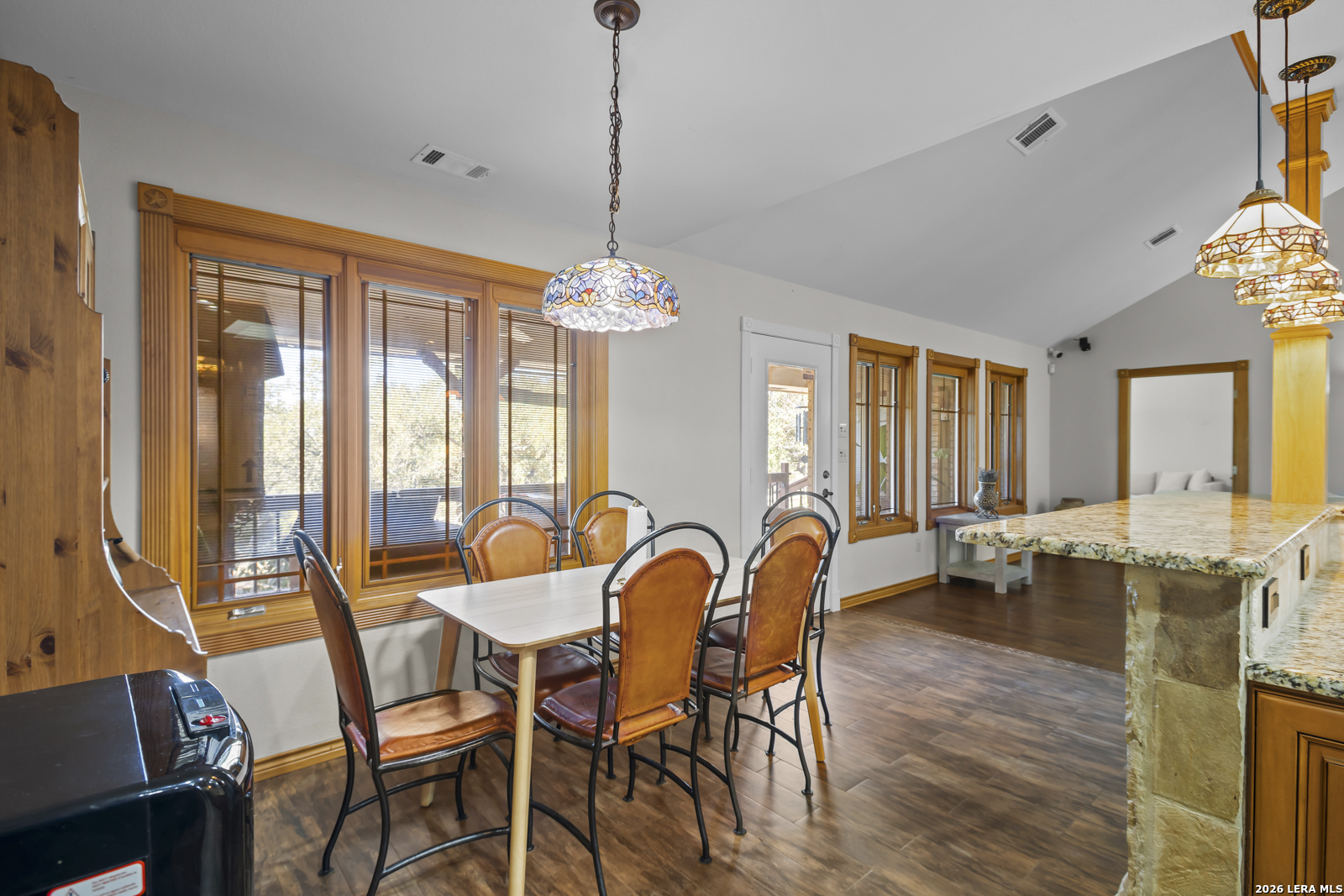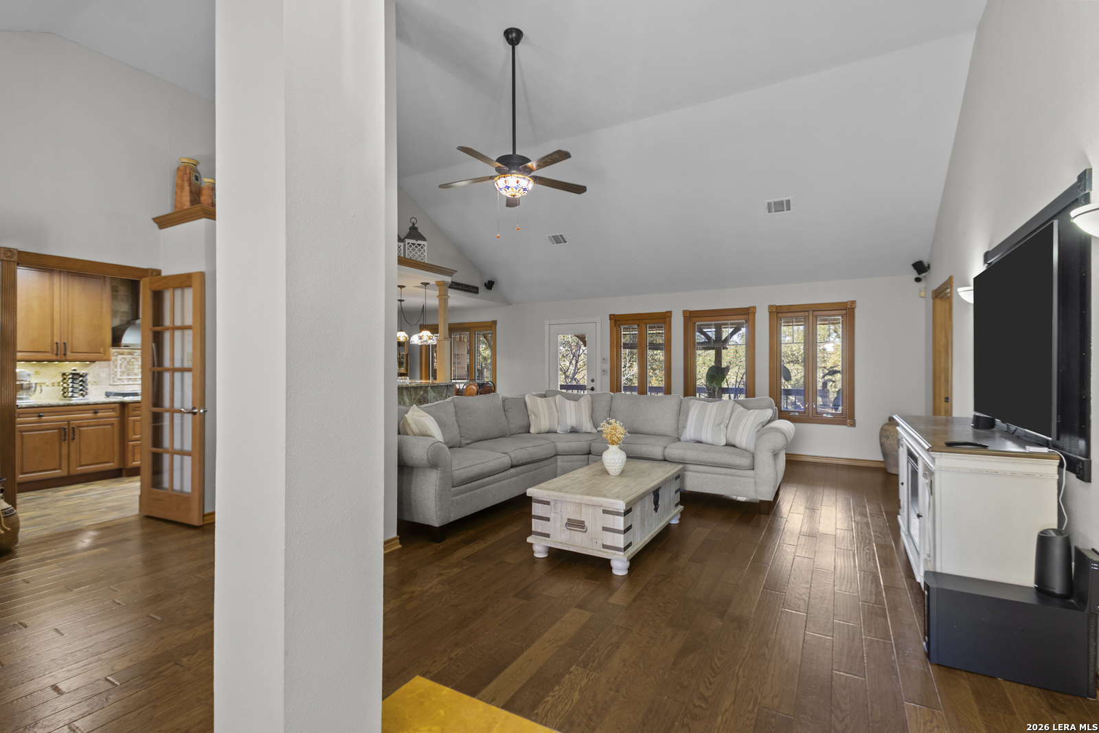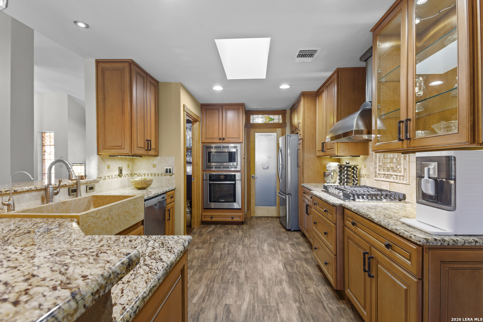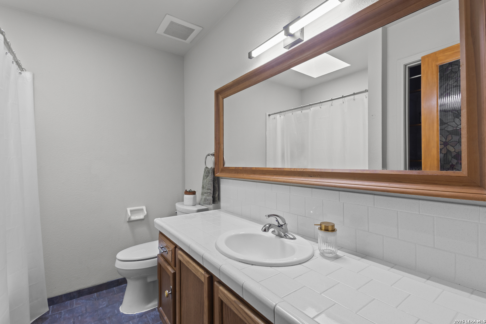 Welcome to your dream home! A stunning country-style Tilson residence that perfectly combines rustic charm with modern convenience. Nestled on 2.18 acres of picturesque land, this property offers a breathtaking country view and endless opportunities for relaxation and entertainment. The ceramic tile entryway invites you in, while the high ceilings and open space concept create an airy and welcoming atmosphere. Enjoy the blend of hickory wood, stone and ceramic flooring adding a touch of natural beauty to each room. The pantry and kitchen feature custom Cordell cabinets that provide ample storage space, beautiful granite countertops and sink, elegant Tiffany-Style chandeliers and skylights illuminate the space. Home includes Pella TRIPLE pane windows, complete with built-in screens and blinds. A beautiful retaining wall out front enhances the curb appeal, while a flagstone sidewalk guides you to the entrance. Enjoy the convenience of a 1-acre fully fenced-in area, complete with a heavy-duty custom front fence and two large entry gates for added security and privacy. For those with an RV, the electrical and waste hookup is a valuable addition, making travel preparations a breeze. The property also boasts a two-story garage/workshop. Located on a quiet cul-de-sac, this home is just a 25-minute drive from San Antonio, New Braunfels, or Canyon Lake, providing easy access to city amenities while maintaining a peaceful, country lifestyle. Enjoy the convenience of being minutes away from The District on 46, offering local shopping and dining options. This country retreat embodies the perfect blend of rustic charm and modern amenities.
