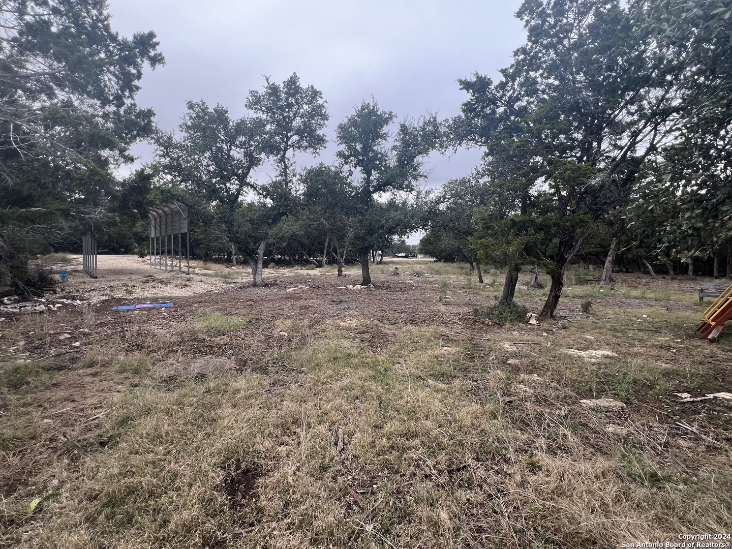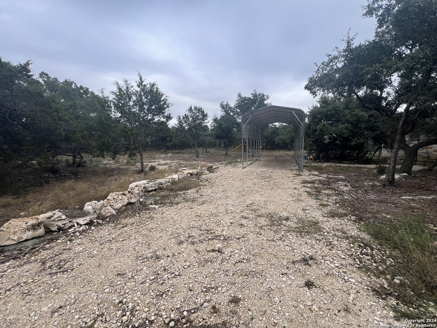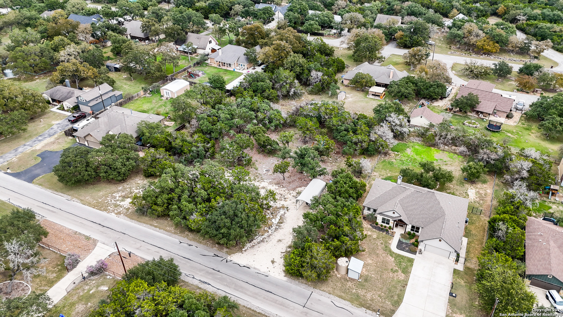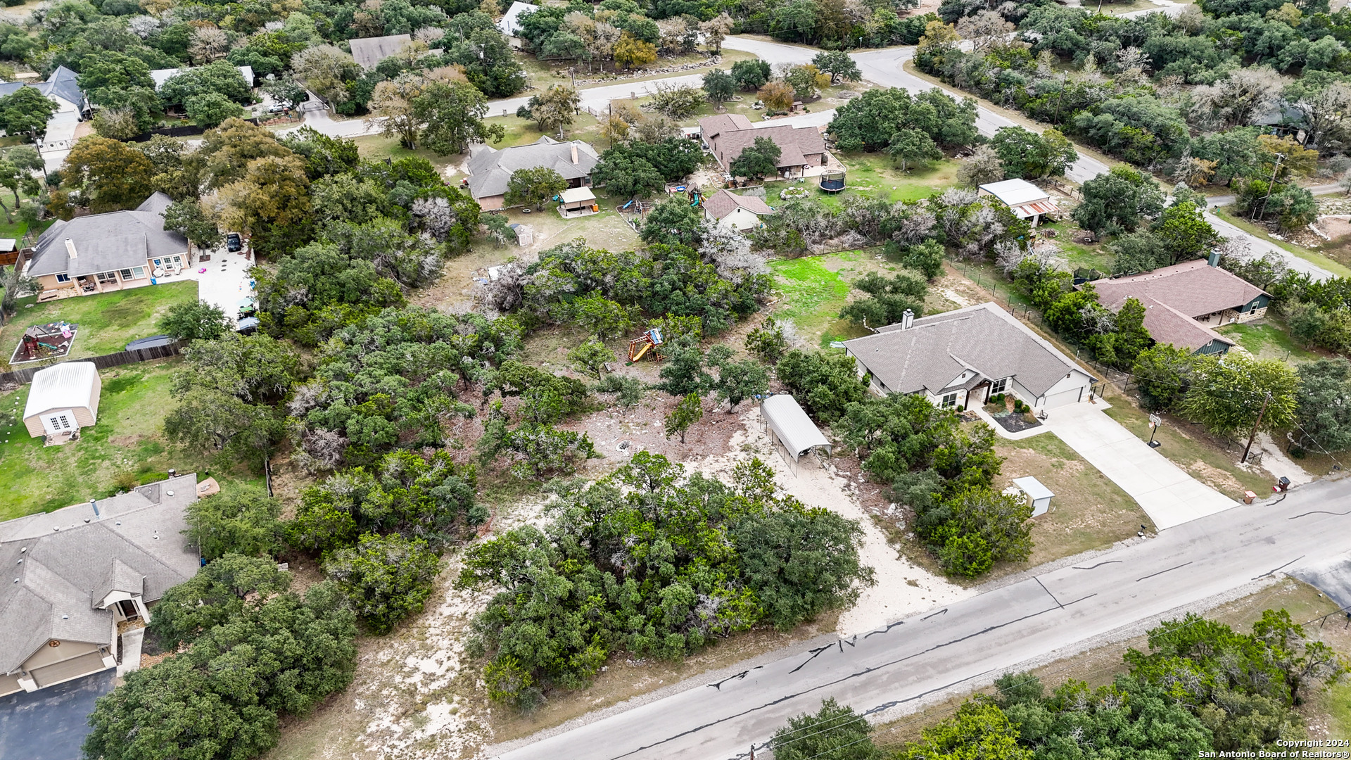 Gorgeous 1/2 acre lot with huge mature oak trees in the highly sought after Rivermont neighborhood. The lot is partially cleared and awaits your custom home!! Private access to Guadalupe River, pool park, pavilion, tennis/basketball court, restrooms and BBQ pits for property owners! Gravel parking pad already laid, minimal restrictions, no time frame to build. *Playset and metal parking cover are negotiable.