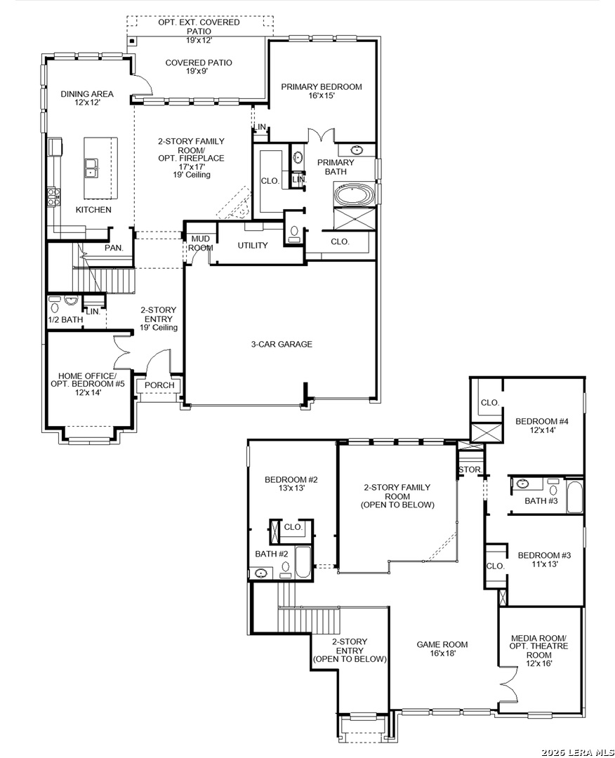 Two-story entry with 19-foot ceiling framed by home office with French doors. Two-story family room with a wall of windows and a wood mantel fireplace. Island kitchen with built-in seating space, a 5-burner gas cooktop, and a walk-in pantry extended to the dining area with two walls of windows. Primary suite just of the family room with a wall of windows. Primary bathroom features a double door entry, dual vanities, freestanding tub, separate glass enclosed shower and a walk-in closet. Second floor hosts a private guest suite with a full bathroom and walk-in closet, secondary bedrooms, a large game room and a media room with French door entry. Extended covered backyard patio. 6 zone sprinkler system. Mud room and utility room just off the three-car garage.