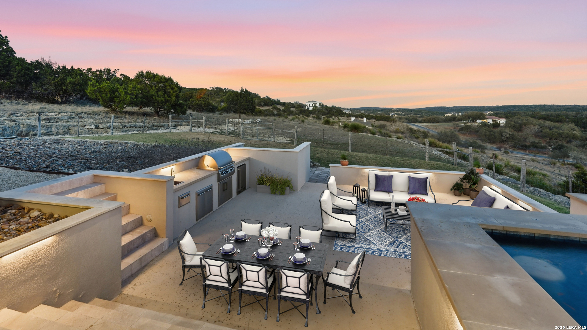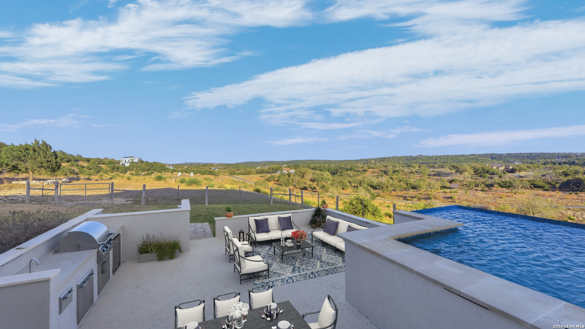Stunning French Country estate perched atop the rolling hills of Waggener Ranch, offering breathtaking sunrise views and a front-row seat to the exotic wildlife that roam this extraordinary Hill Country community. At the heart of the home is an impressive chef's kitchen thoughtfully designed for both everyday living and entertaining. Premium appliances include a Sub-Zero refrigerator with filtered water dispenser and a matching freezer with ice maker, a Wolf 48" range with double griddle, Wolf convection steam oven, Miele built-in coffee system, and two Electrolux dishwashers for effortless hosting. An oversized island with quartz countertops anchors the space and offers pull-out trash bins at each end for convenience. Custom cabinetry features lighted upper cabinets and an appliance garage for a clean and organized look. Completing the space is a beautiful handcrafted ceramic tile backsplash imported from Mexico. The private primary suite is a true retreat, positioned to capture incredible views and complete with a spa-inspired bath featuring dual vanities, a dedicated make-up vanity, a stand-alone soaking tub, and an oversized floor-to-ceiling tiled walk-in shower. The expansive custom closet offers built-in shelving, a marble-topped center island, tri-fold mirror, and a built-in fireproof safe. The home has an additional four bedrooms, three full bathrooms and a beautifully appointed powder room that adds a touch of elegance, showcasing an antique sink cabinet, granite countertop, hand-painted decorative walls, and honed marble flooring with mosaic inlay. Movie nights are elevated in the dedicated media room, fully equipped with surround sound, projector, subwoofer, velvet-bordered theater screen, raised platform seating for leather recliners with convenient floor outlets, dimmable lighting, and a separate leathered granite bar-top seating area. Hidden access to the media closet and extensive soundproofing complete this incredible entertainment space. Inside, the home showcases exceptional craftsmanship and thoughtful design with 10-foot ceilings throughout the first floor, solid core interior doors, and energy-efficient foam insulation that enhance both comfort and efficiency. Modern connectivity is enhanced with hardwired WiFi access points located throughout the home, ensuring strong and reliable coverage. A monitored security system provides peace of mind, while the home's smart lighting features allow you to easily adjust ambiance throughout the space. Thoughtful architectural details add warmth and charm, including limestone columns, classic balustrades, decorative quoins, and chiseled brushed travertine flooring at the front entry and private Juliette balcony. The home's striking steep matte black metal hip roof is accented by beautifully shaped dormer windows that give the facade a distinctive European estate presence, while dimmable smart lighting allows the ambiance to be tailored perfectly for any occasion. The exterior is equally impressive with custom wrought iron double front doors and a matching entry gate that create a grand and welcoming arrival. Modern convenience meets thoughtful planning with the home's lighting, security system, and entry gate all operable by remote, keypad, or smartphone app. Additional exterior features include soffit outlets for holiday lighting and an in-ground sprinkler system to maintain the landscaping. Whether enjoying a quiet sunrise from the balcony, hosting unforgettable gatherings, or simply taking in the beauty of the surrounding Hill Country landscape, this extraordinary estate offers a lifestyle that is both refined and peaceful. Located within the exclusive gated community of Waggener Ranch, where exotic wildlife such as blackbuck, axis, fallow deer and aoudad roam freely, this property provides a rare opportunity to experience luxury living immersed in nature, yet is just a short drive from the conveniences of Boerne, New Braunfels, and San Antonio.