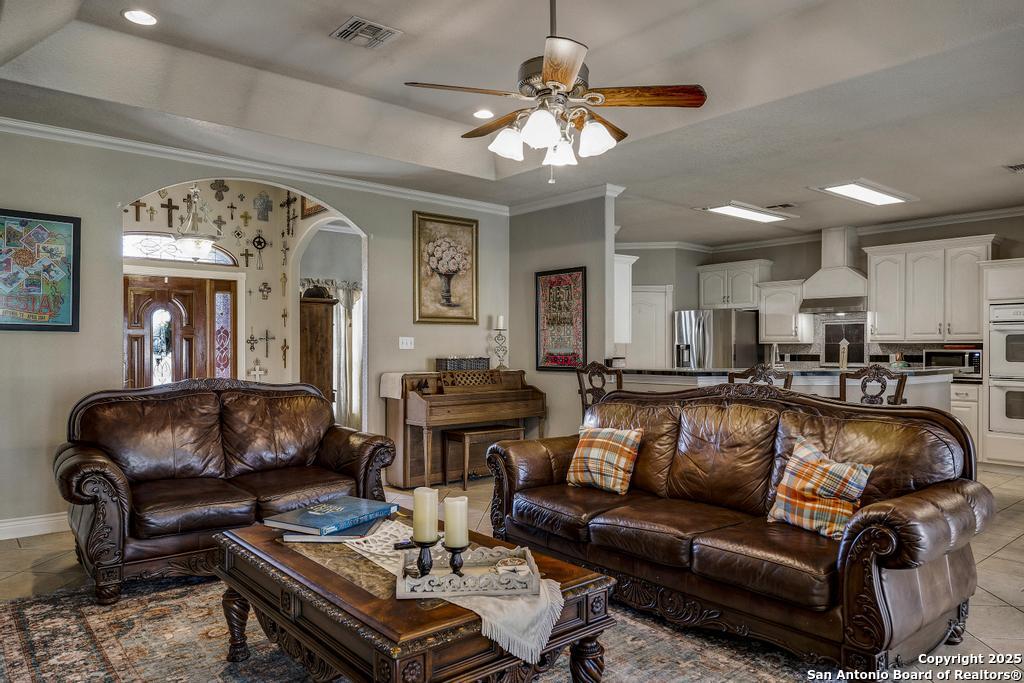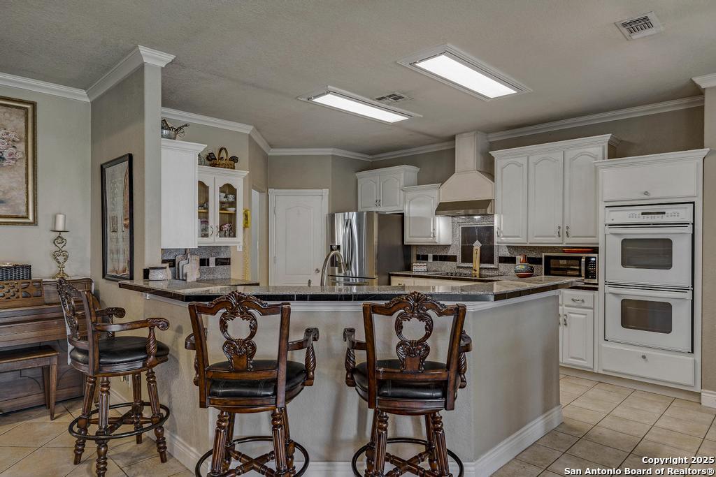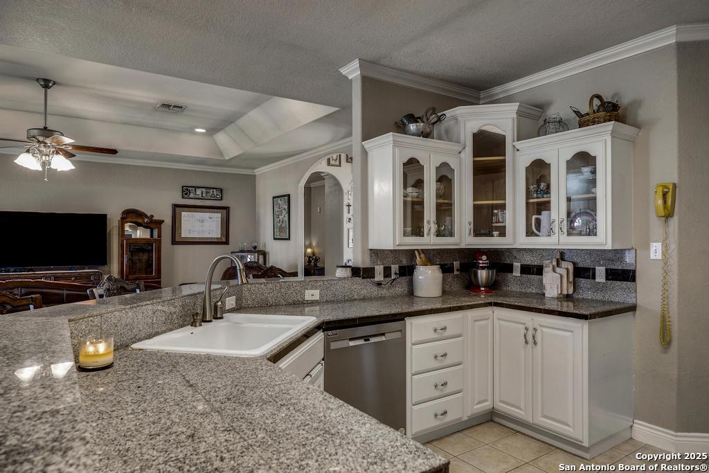 Exceptionally priced custom-built brick home on over 2.5 acres! Step inside a welcoming entry with high ceilings and a spacious family room featuring a wood-burning fireplace and French doors opening to a large back patio. This thoughtfully designed home includes a front dining room and a generous eat-in kitchen with double ovens, a newer 5-burner cooktop, and a new vent hood and dishwasher (installed 2025). The split primary suite offers dual vanities, a jetted tub, and two walk-in closets with built-ins. Additional features include an attached garage with extra storage and new opener, plus a large detached shop/garage with a half bath and a massive unfinished loft. Set on fully fenced acreage in La Vernia ISD.