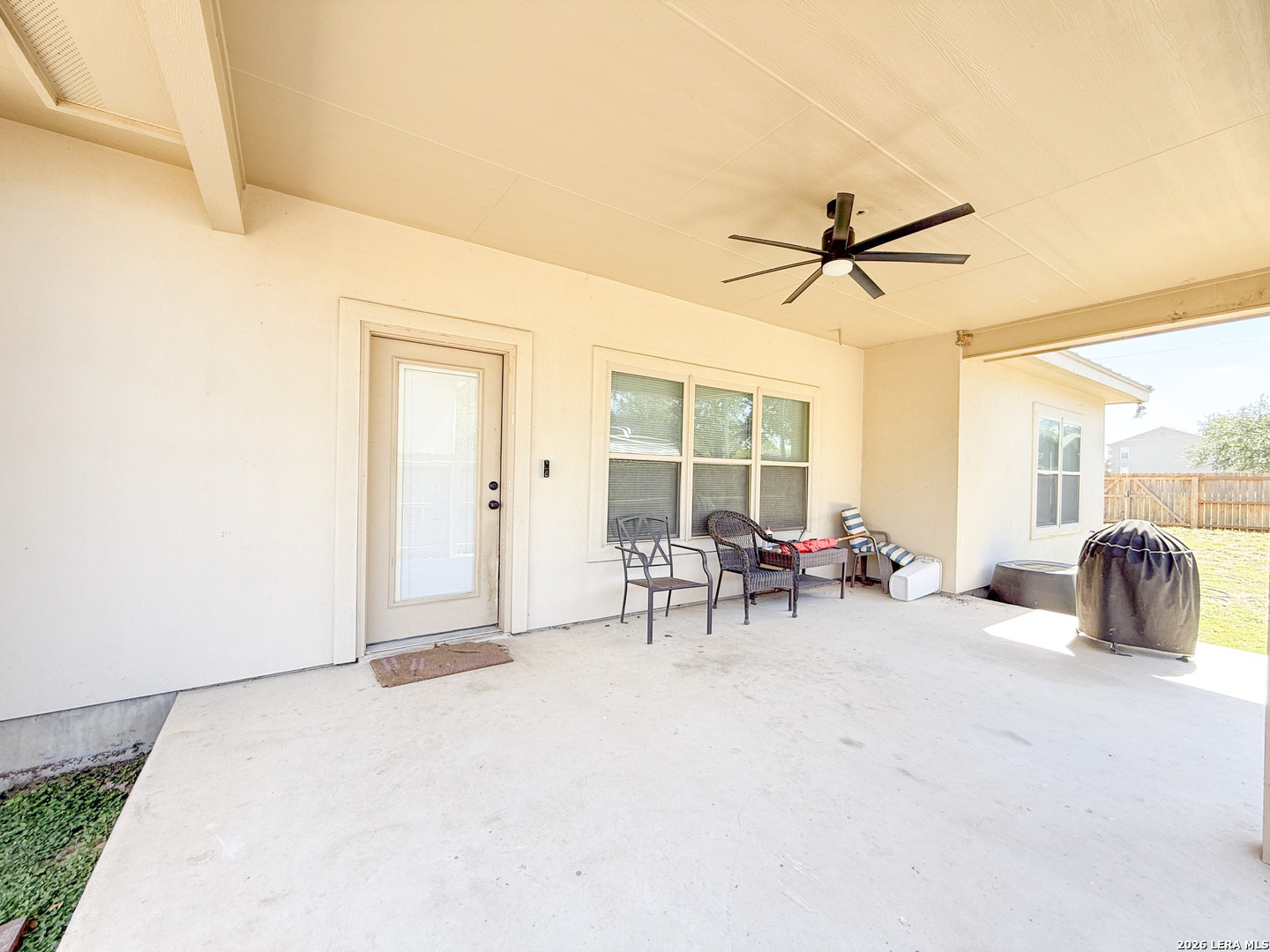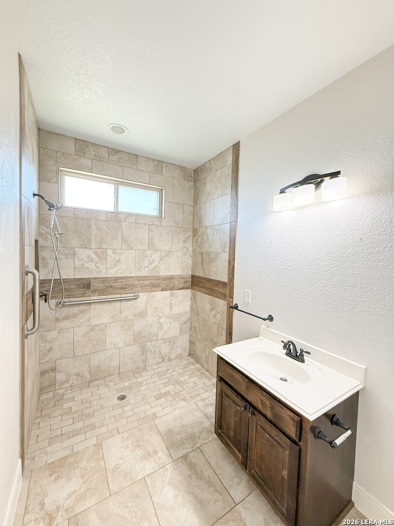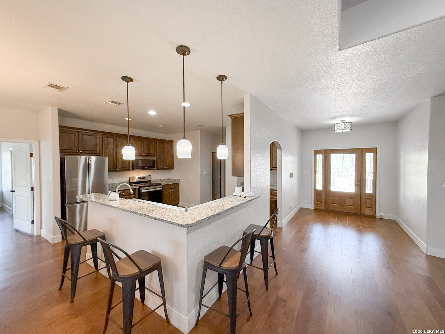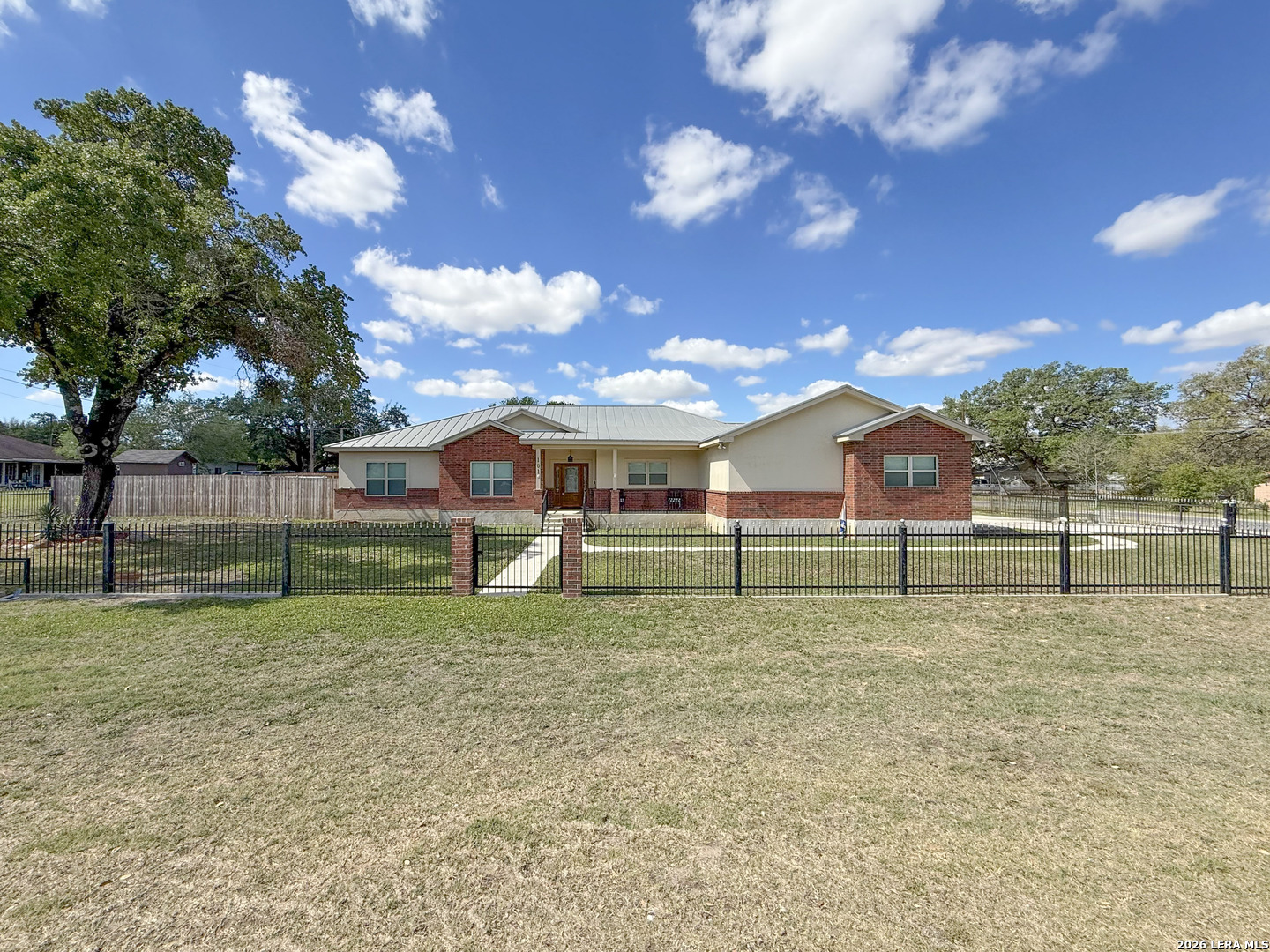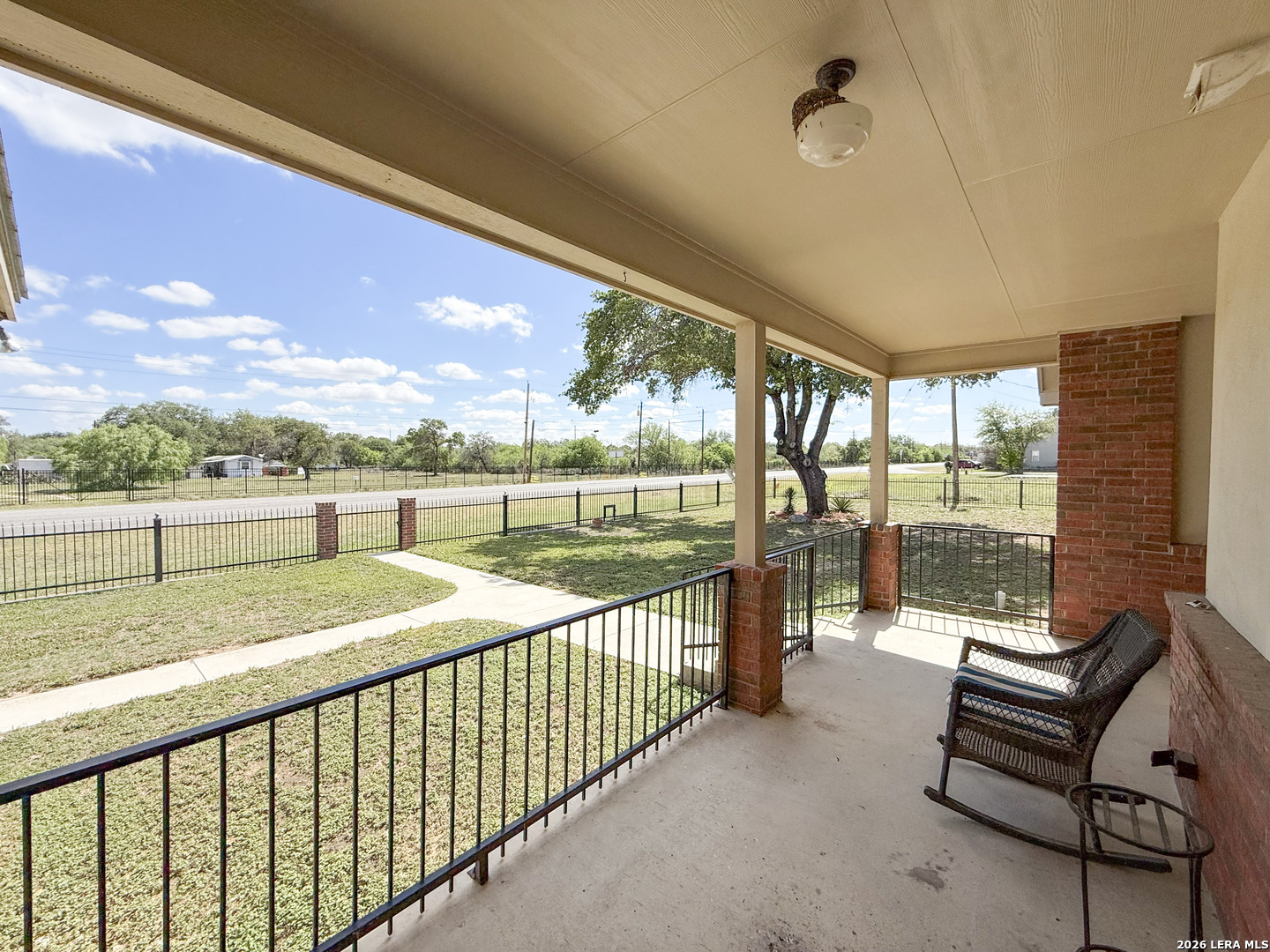 Welcome to your next dream home! Featuring a classic brick exterior and a spacious front porch, you get instant inviting curb appeal and a welcoming place to relax and unwind. Inside, you'll find a well-designed layout with a generously sized living room that flows seamlessly into the dining area and kitchen, making entertaining or hosting a breeze. The kitchen is equipped with sleek stainless steel appliances, ample cabinetry, and plenty of workspace to meet all your cooking needs. The primary bedroom serves as a private retreat, complete with a walk-in closet and an oversized ensuite bathroom designed for comfort. Two secondary bedrooms boast an ensuite, offering flexibility for guests or multi-generational living. Step outside to enjoy a covered back patio overlooking a sizable yard, perfect for outdoor gatherings, pets, or simply enjoying Texas weather. Conveniently located near city amenities, this home offers easy access to shopping, dining, and entertainment, while being just minutes from the highway for a quick commute to San Antonio. Schedule a showing and start envisioning life rooted in comfort and style.
