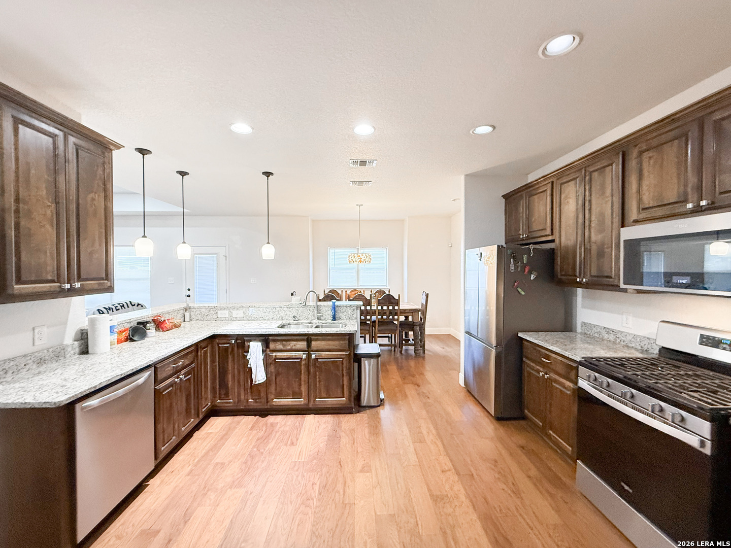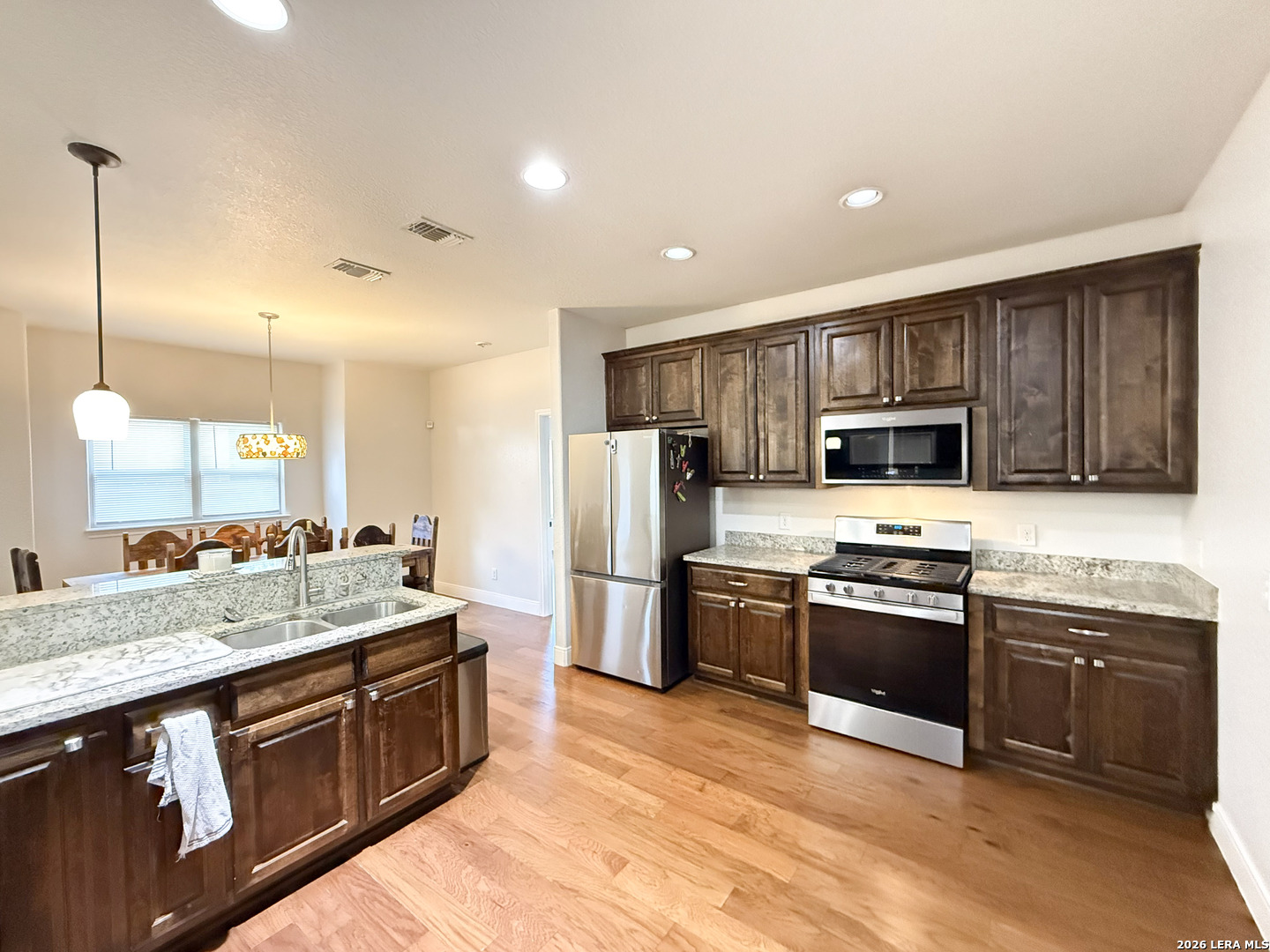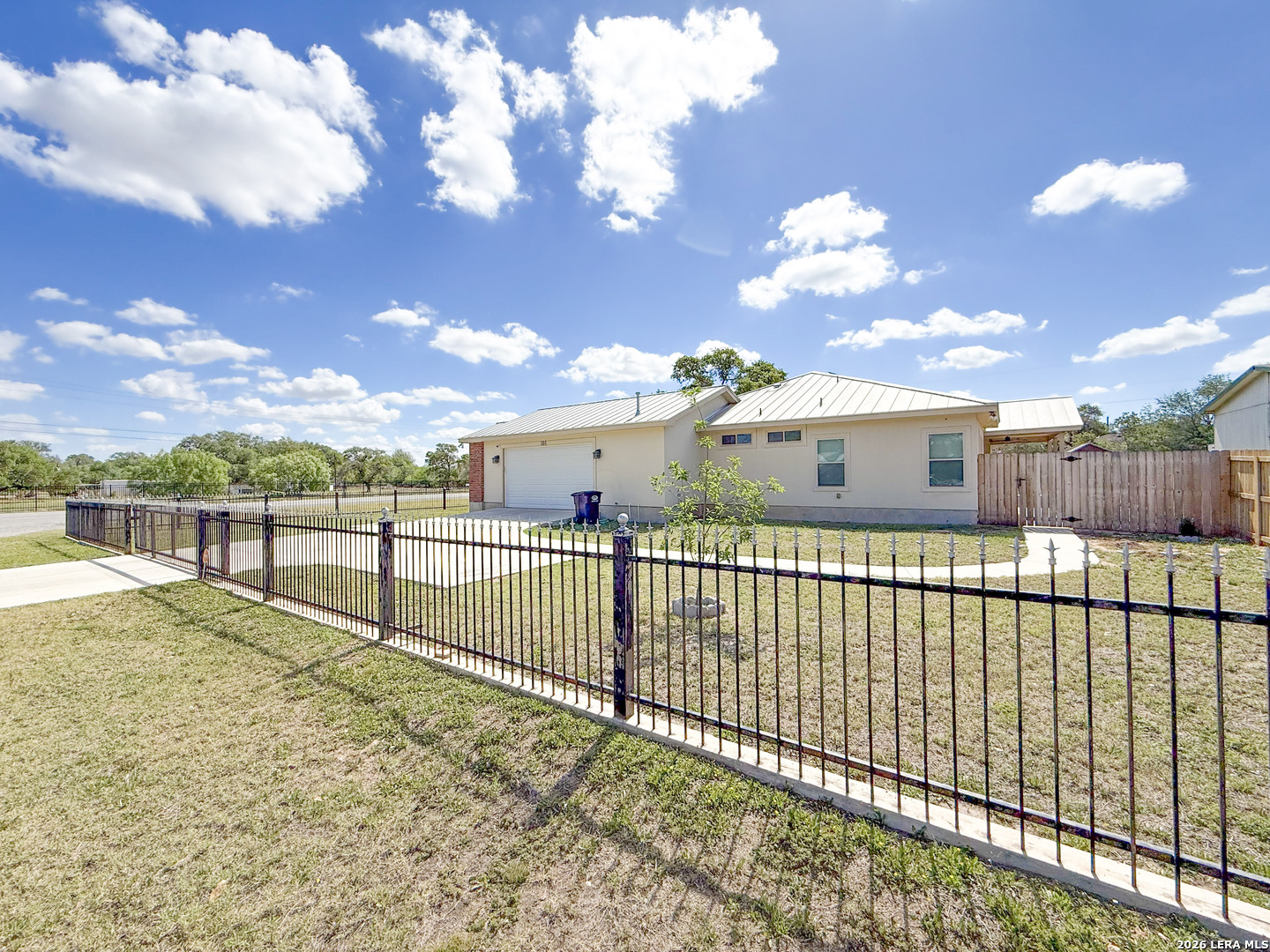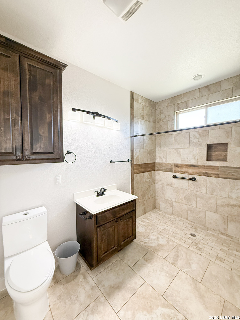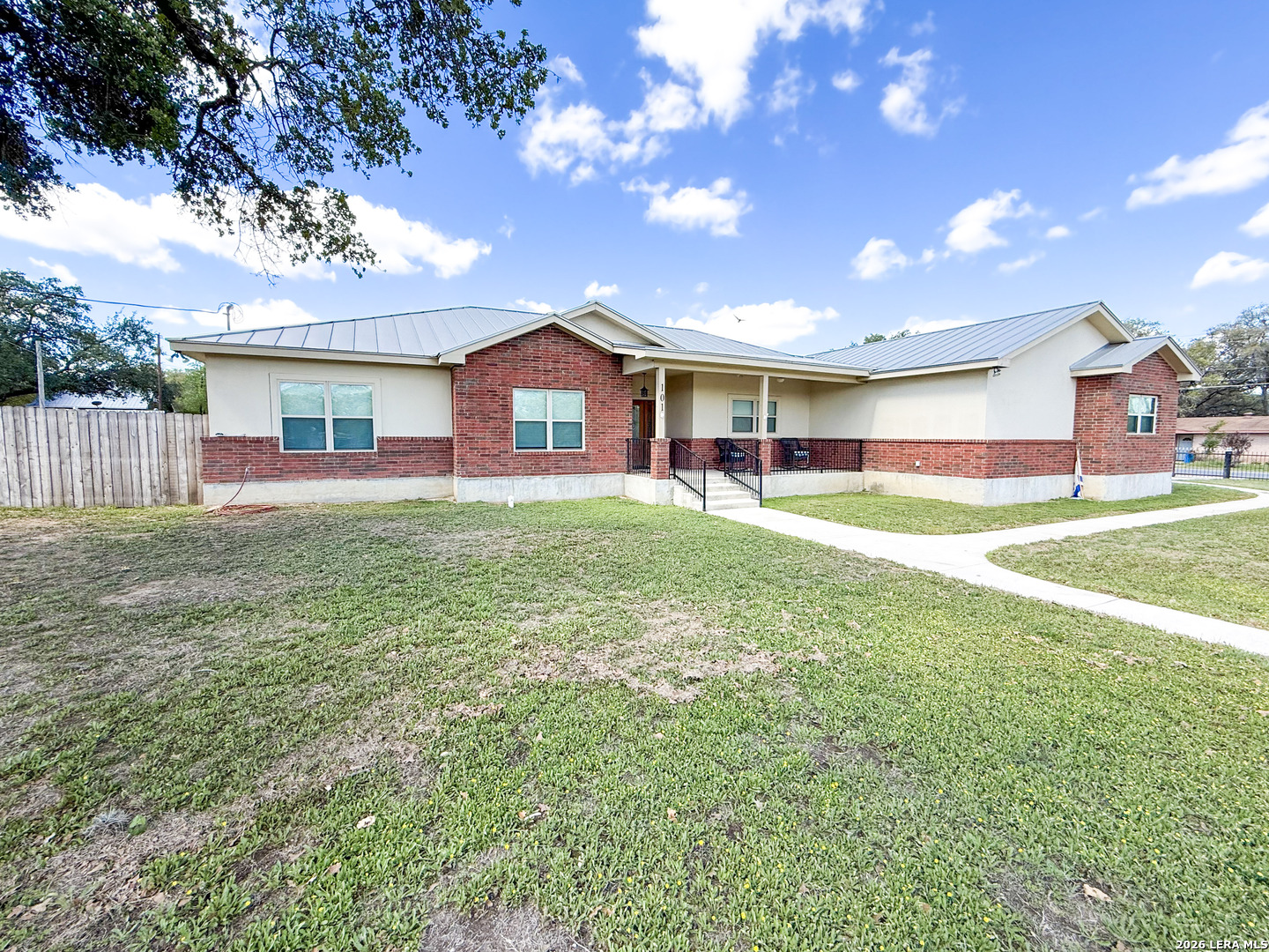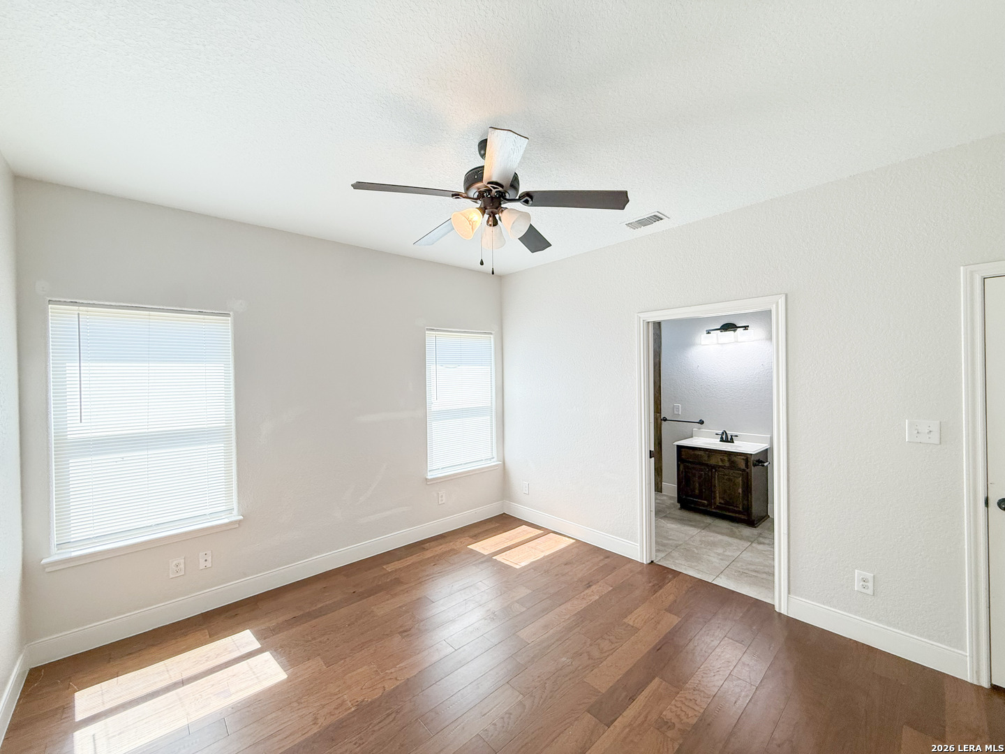 Welcome to your next dream home! Featuring a classic brick exterior and a spacious front porch, you get instant inviting curb appeal and a welcoming place to relax and unwind. Inside, you'll find a well-designed layout with a generously sized living room that flows seamlessly into the dining area and kitchen, making entertaining or hosting a breeze. The kitchen is equipped with sleek stainless steel appliances, ample cabinetry, and plenty of workspace to meet all your cooking needs. The primary bedroom serves as a private retreat, complete with a walk-in closet and an oversized ensuite bathroom designed for comfort. Two secondary bedrooms boast an ensuite, offering flexibility for guests or multi-generational living. Step outside to enjoy a covered back patio overlooking a sizable yard, perfect for outdoor gatherings, pets, or simply enjoying Texas weather. Conveniently located near city amenities, this home offers easy access to shopping, dining, and entertainment, while being just minutes from the highway for a quick commute to San Antonio. Schedule a showing and start envisioning life rooted in comfort and style.