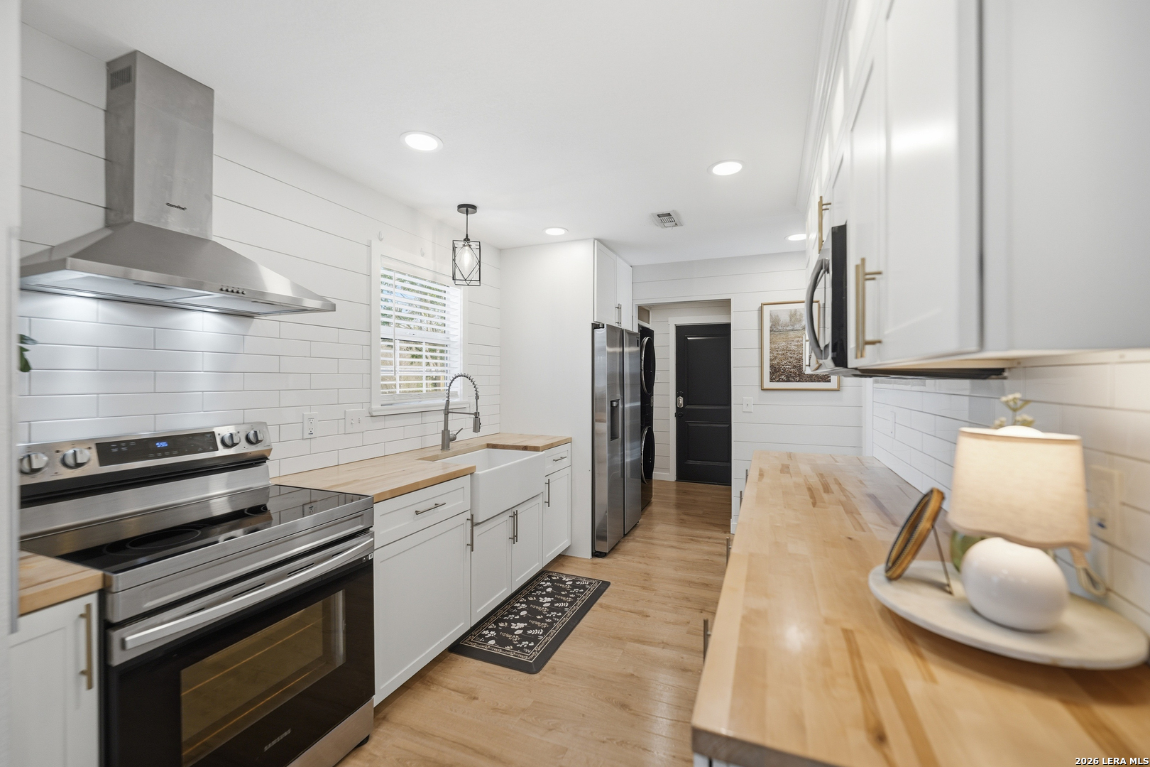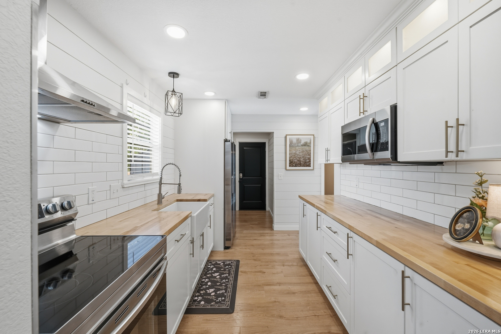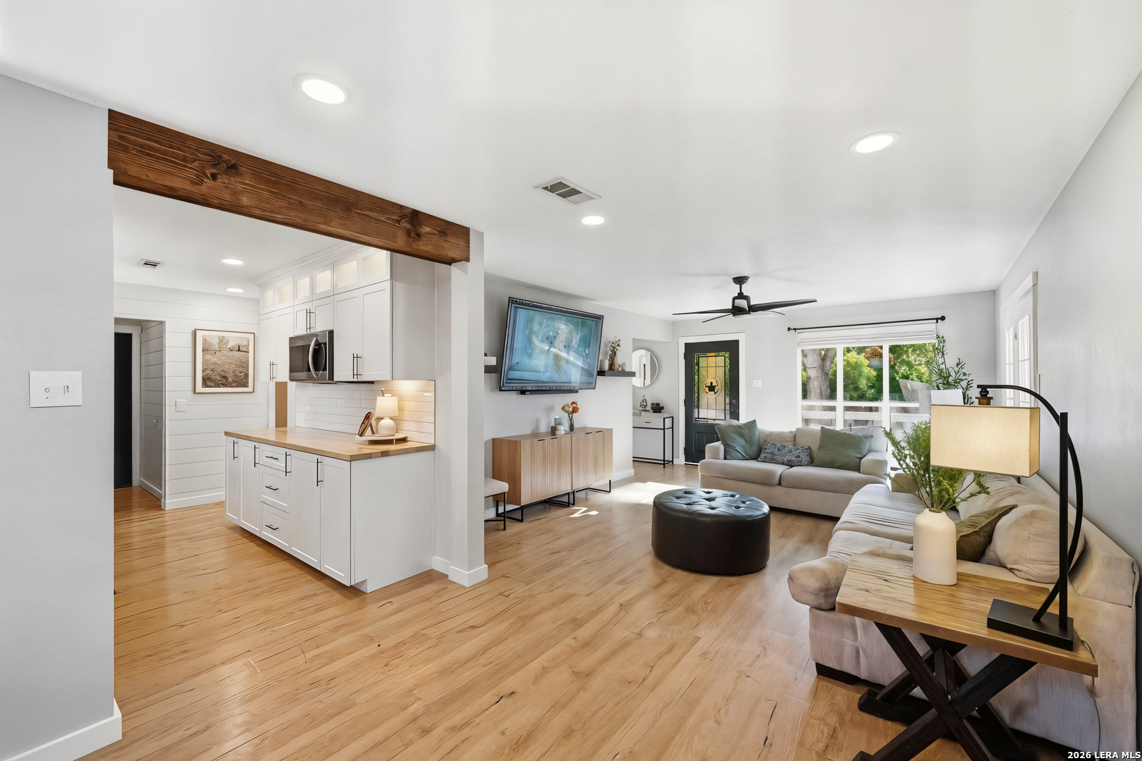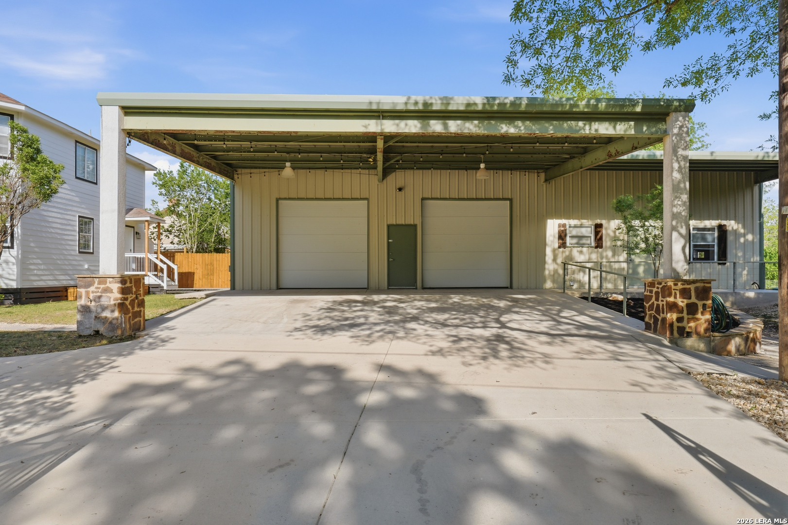 Oversized 42' x 22' workshop, 31' x 17' carport, detached ADA-compliant apartment, and 1.24 acres of usable land. This freshly renovated property delivers space, flexibility, and functionality with quick access to Hwy 90 and an easy commute to downtown San Antonio. The workshop-style garage with oversized doors is ideal for trades, storage, or working from home, while the additional carport adds even more covered space. The main home has three bedrooms, and two baths, while the detached apartment offers one additional bedroom, an additional bathroom and the large workshop also offers an additional garage. The main house has been recently updated with fresh interior paint, new flooring, updated cabinetry, countertops, and appliances, creating a clean and cohesive feel throughout. The kitchen features butcher block countertops, subway tile backsplash, an oversized stainless steel vent hood, and a farmhouse sink, all thoughtfully designed with a modern touch. The primary suite includes a recently renovated bathroom with dual vanities, updated cabinetry, a walk-in shower, and stylish white and gray tile finishes. A wraparound porch with cedar posts adds character and provides a great place to relax and enjoy the surrounding acreage. The detached ADA-compliant one-bedroom apartment includes a full kitchen, living area, and bathroom, ramp access, wide doors, hand rails, that is ideal for guests or additional living space. Situated on a corner lot with convenient highway access, this property offers a rare combination of land, improvements, and versatility. Buyer to verify all measurements, schools, and details.