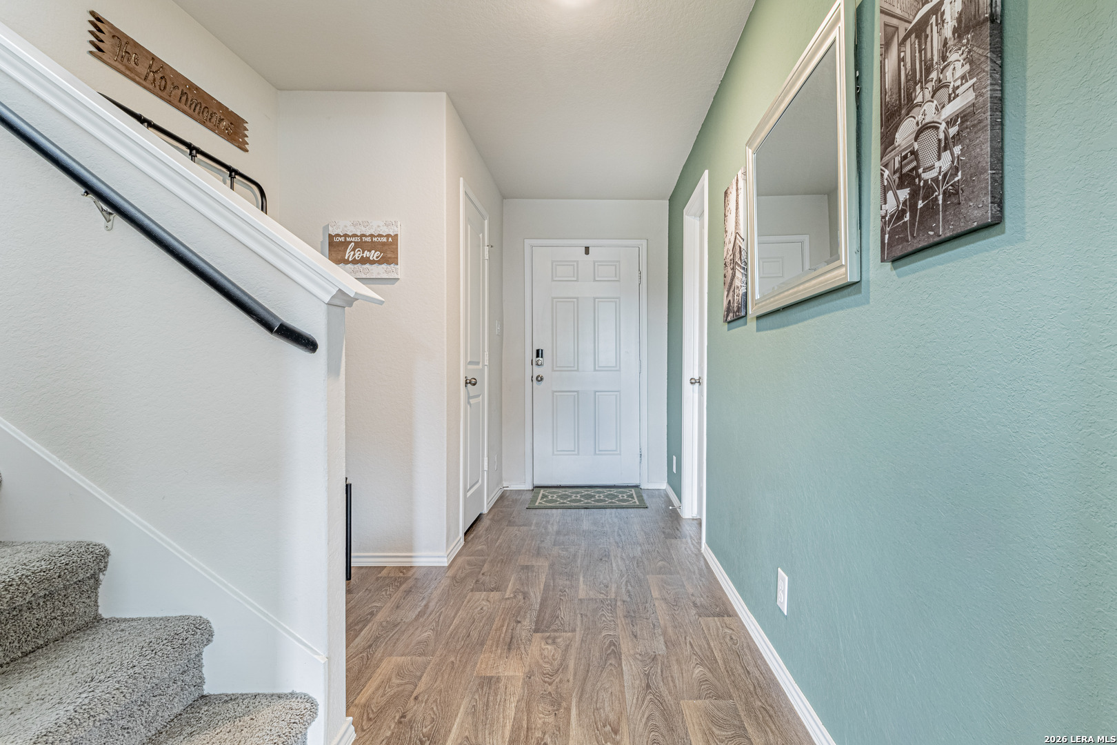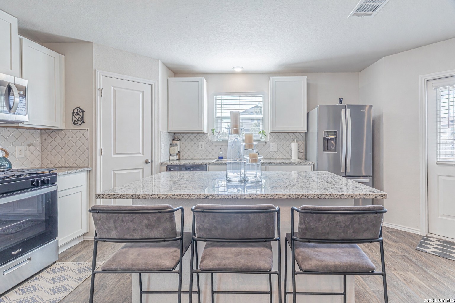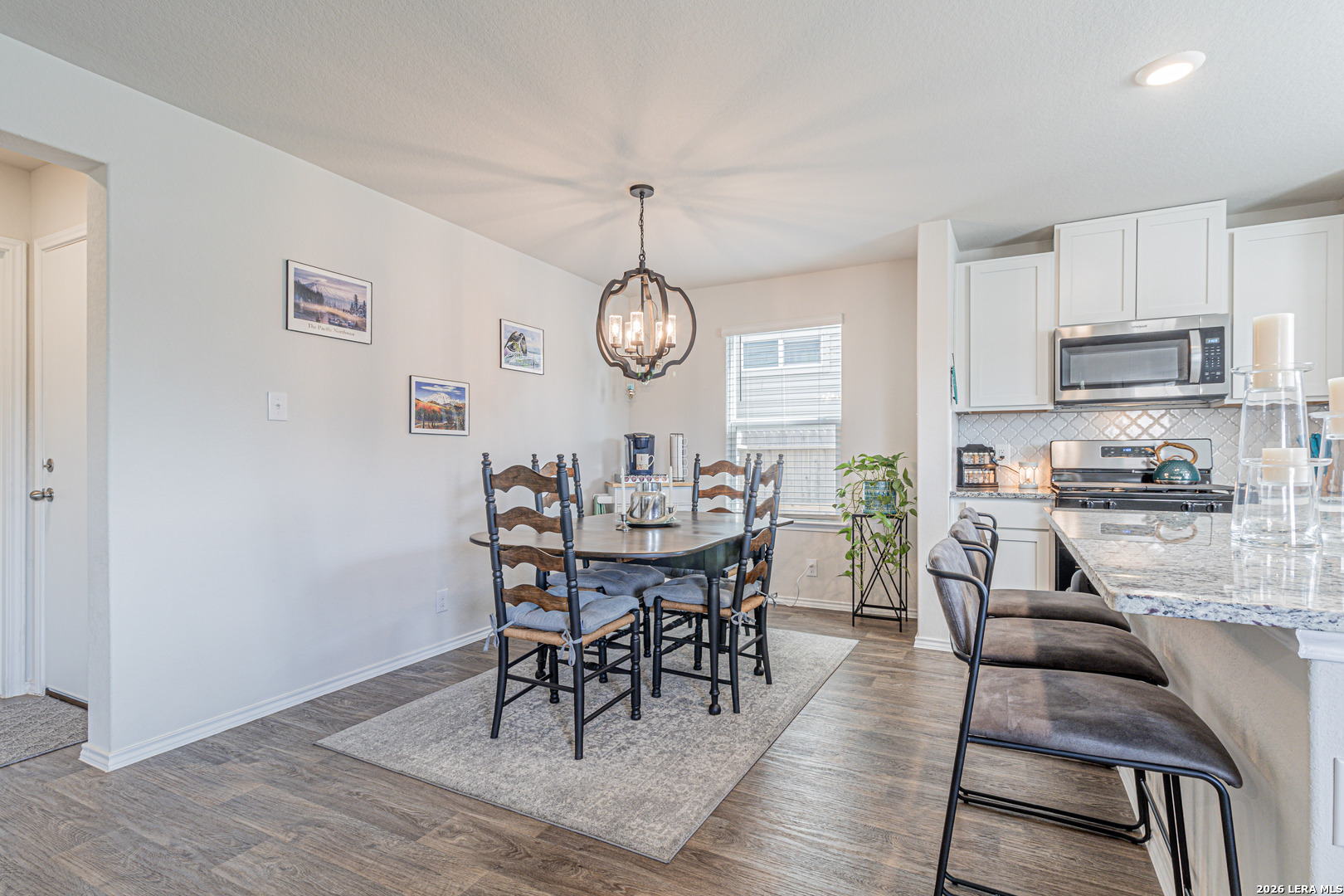 This two story home offers 1,625 square feet with 3 bedrooms and 2.5 bathrooms, designed for comfortable everyday living. A welcoming front porch leads into a foyer that opens to a spacious living area, which flows into the open kitchen and dining space. The large kitchen island creates a central gathering spot, and the kitchen provides access to the backyard and covered patio. Downstairs also includes a storage closet under the stairs and a utility room with direct access to the garage. Upstairs features a versatile loft or game room, along with the primary suite, two secondary bedrooms, and a full bathroom. The home includes smart technology that allows you to control lighting, temperature, and locks from your phone through a central hub. Additional features include sheet vinyl flooring in main living and wet areas, black appliances, granite countertops, and more.