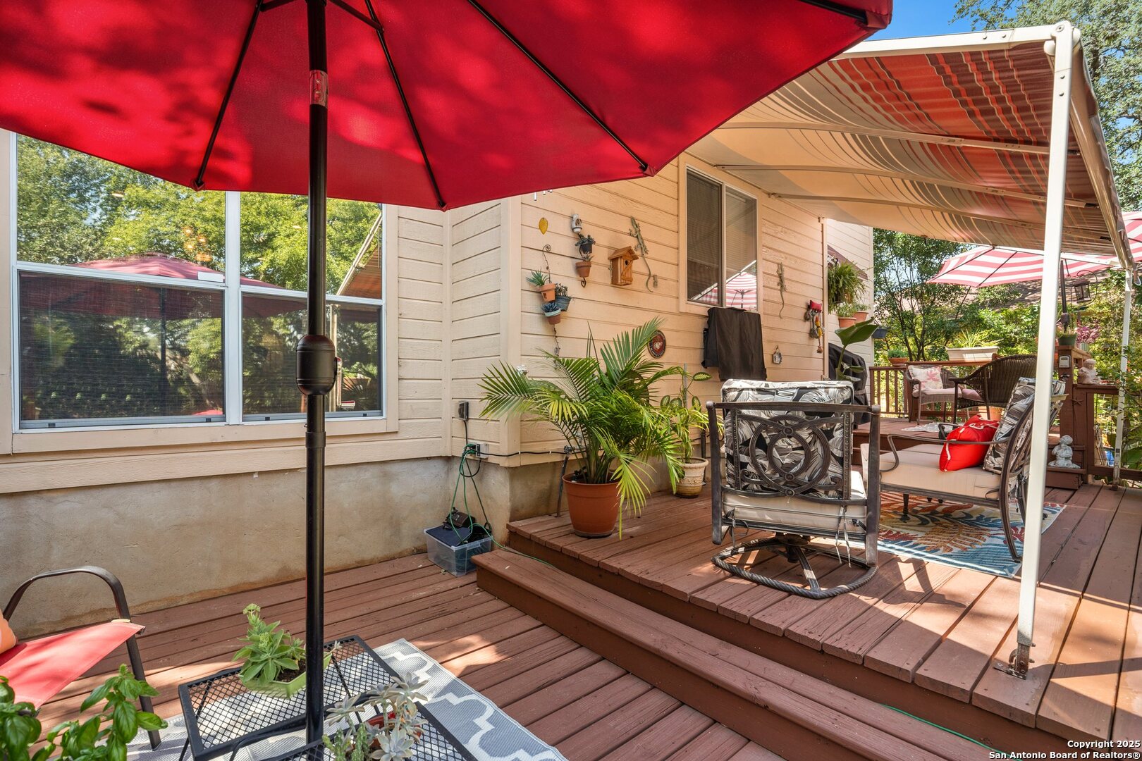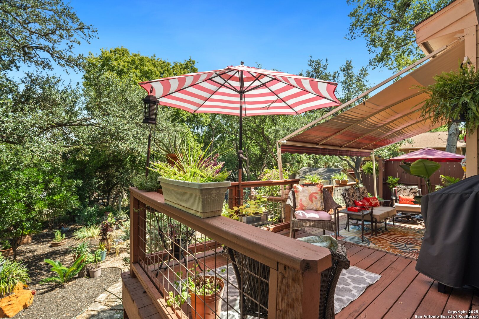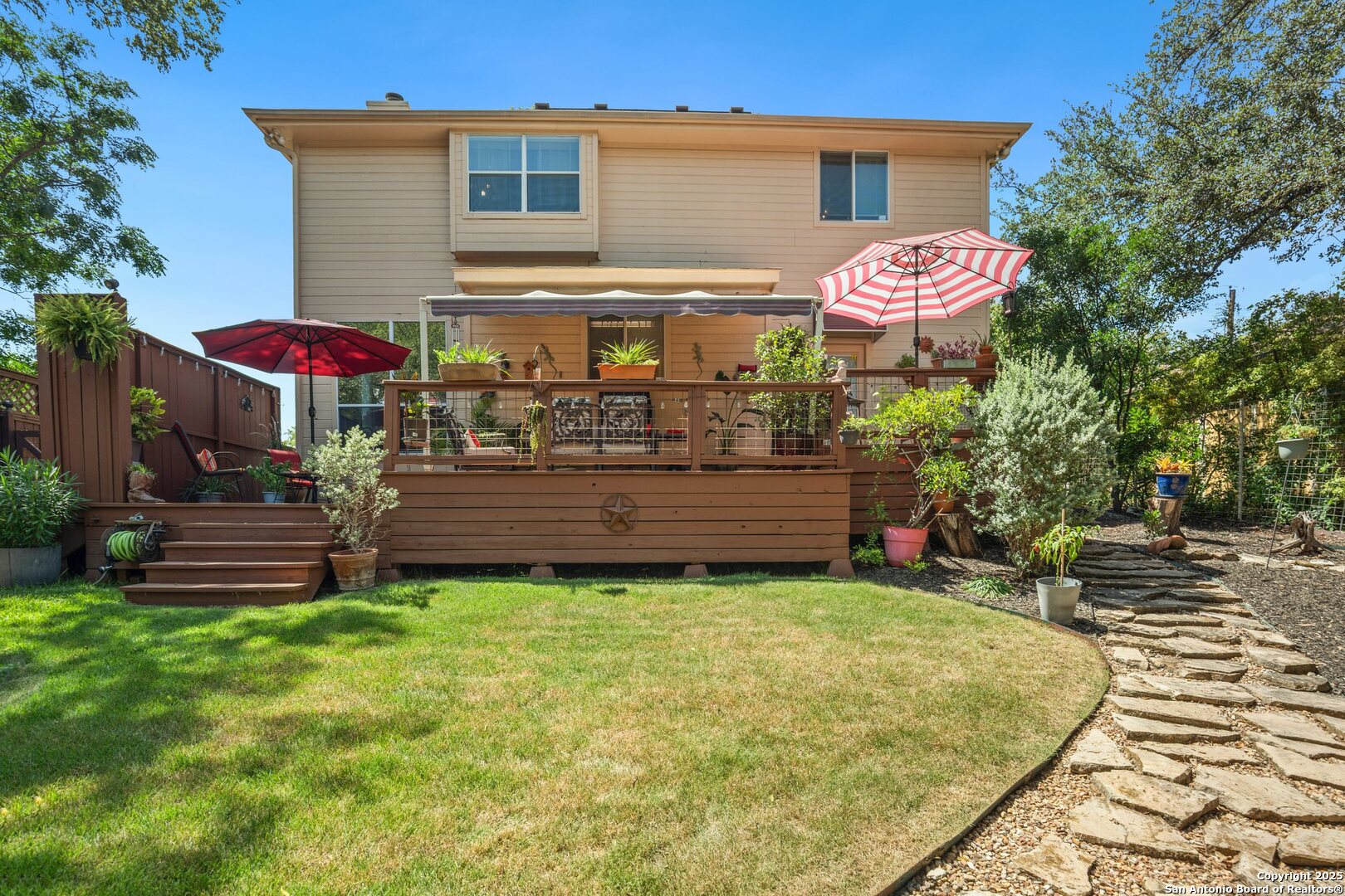 Welcome to this beautifully maintained custom home in San Marcos, just under a mile from Texas State University-perfect for catching a concert, play, or game any day of the week. Featuring 3 spacious bedrooms and 2.5 bathrooms, this home offers a blend of comfort and thoughtful upgrades throughout. Enjoy peace of mind thanks to proactive maintenance, recent updates, and smart improvements, including tinted windows, a quiet-grade garage door, and window dressings on every window. The downstairs living areas boast elegant tile flooring and crown molding, while the upstairs bedrooms feature plush carpeting for added comfort. Step into your private backyard oasis-professionally landscaped with vibrant plants and flowers, a serene park-like feel, and a three-tier deck covered by a retractable Sunsetter awning, ideal for relaxing or entertaining year-round. This move-in ready gem combines convenience, charm, and low-maintenance living in one of San Marcos' most desirable locations. Don't miss it!