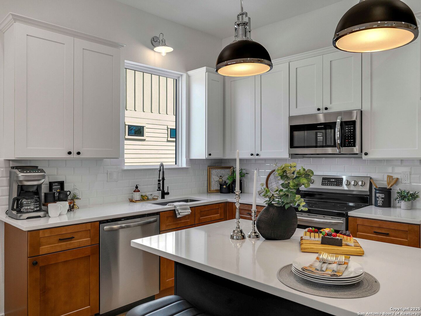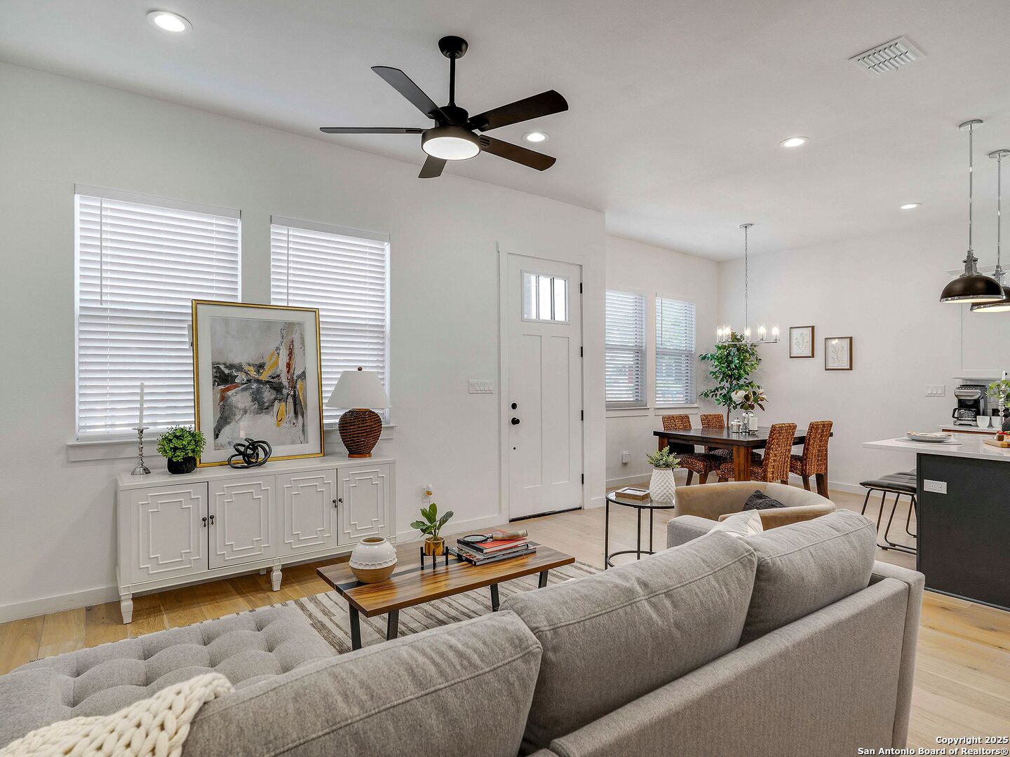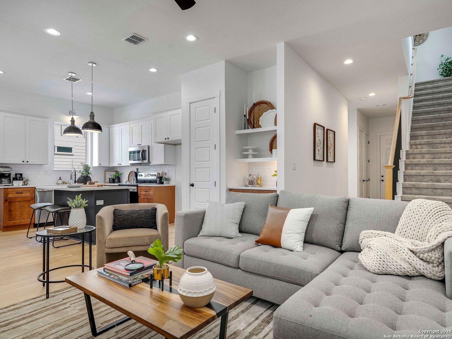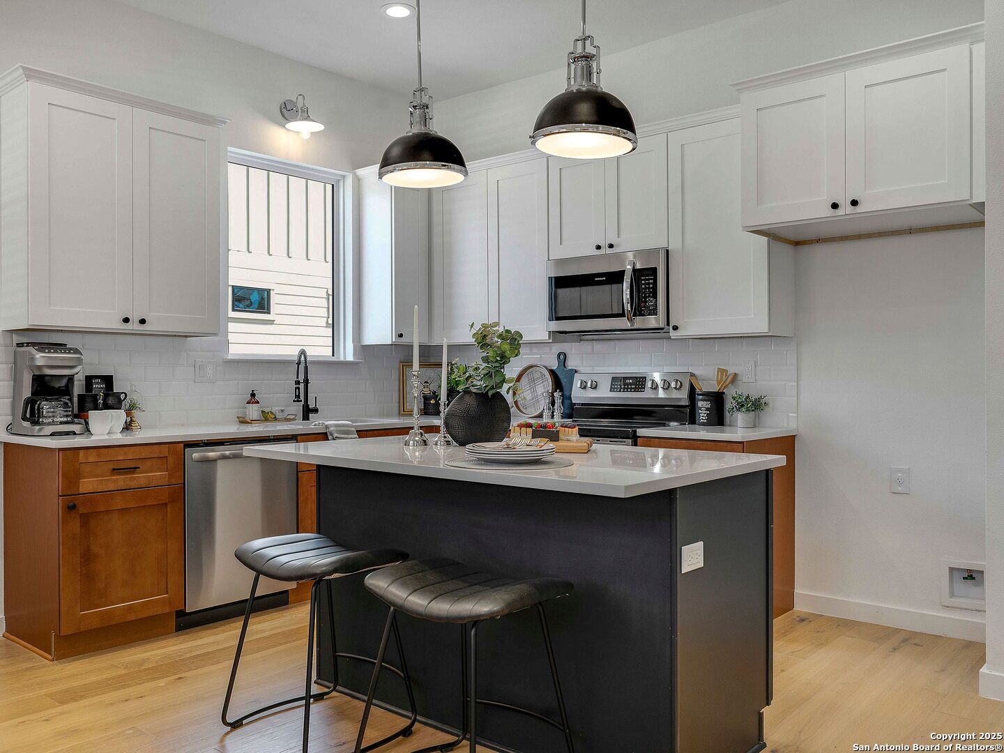 Perched atop a hill in the heart of vibrant Beacon Hill, this stunning new construction offers the perfect blend of modern farmhouse style and urban convenience. From the moment you step inside, you're greeted with an open-concept layout, soaring 10-foot ceilings, and rich wood flooring that creates a bright, airy ambiance throughout the main level. The gourmet kitchen is a chef's dream, featuring sleek quartz countertops, an island with a breakfast bar, stainless steel appliances, recessed lighting, and an adjacent dry bar perfect for entertaining. The spacious downstairs master suite is a true retreat, complete with a spa-inspired bath featuring double sinks, modern lighting, quartz counters, marble floor tile, a walk-in closet, and a tiled shower with seamless glass doors. Thoughtfully designed, the main level also includes a stylish powder bath, a functional mudroom caddy, and easy access to the private, fenced backyard with an oak tree. Upstairs, you'll find two generous bedrooms, a loft-style gathering room, a contemporary double-vanity bath, and a well-equipped laundry room with built-in cabinetry and countertop space. Enjoy the best of city living with walkable access to trendy restaurants, charming antique shops, local boutiques, and cozy wine bars. Just minutes from downtown, the San Antonio Zoo, and the Pearl, this is urban living at its finest, with all the comforts of home.