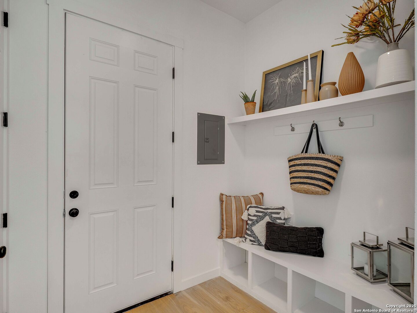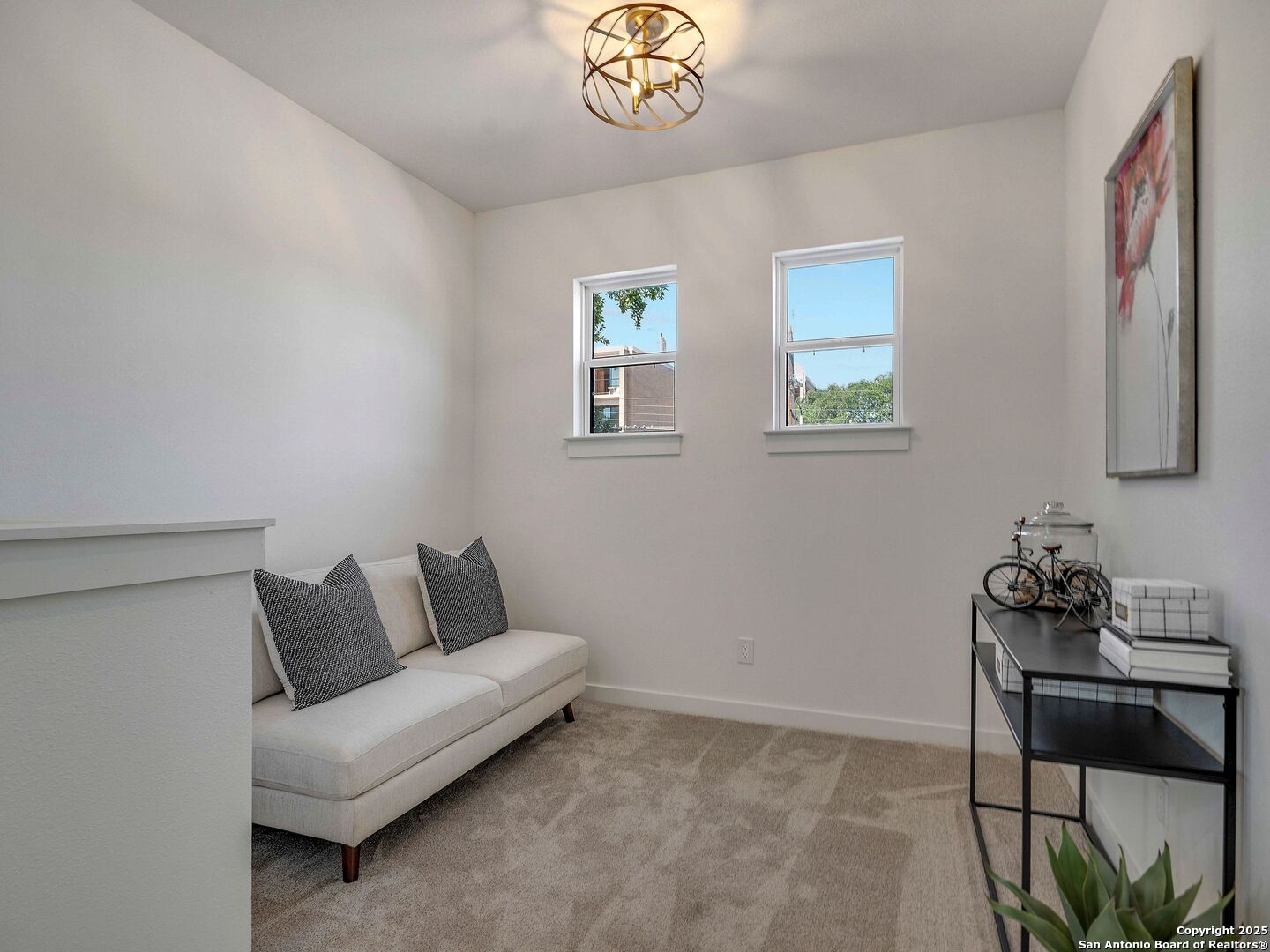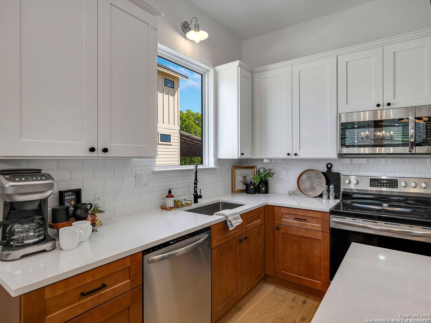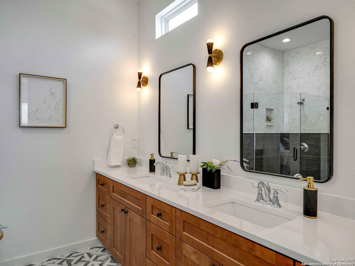 Perched atop a hill in the heart of vibrant Beacon Hill, this stunning new construction offers the perfect blend of modern farmhouse style and urban convenience. From the moment you step inside, you're greeted with an open-concept layout, soaring 10-foot ceilings, and rich wood flooring that creates a bright, airy ambiance throughout the main level. The gourmet kitchen is a chef's dream, featuring sleek quartz countertops, an island with a breakfast bar, stainless steel appliances, recessed lighting, and an adjacent dry bar perfect for entertaining. The spacious downstairs master suite is a true retreat, complete with a spa-inspired bath featuring double sinks, modern lighting, quartz counters, marble floor tile, a walk-in closet, and a tiled shower with seamless glass doors. Thoughtfully designed, the main level also includes a stylish powder bath, a functional mudroom caddy, and easy access to the private, fenced backyard with an oak tree. Upstairs, you'll find two generous bedrooms, a loft-style gathering room, a contemporary double-vanity bath, and a well-equipped laundry room with built-in cabinetry and countertop space. Enjoy the best of city living with walkable access to trendy restaurants, charming antique shops, local boutiques, and cozy wine bars. Just minutes from downtown, the San Antonio Zoo, and the Pearl, this is urban living at its finest, with all the comforts of home.