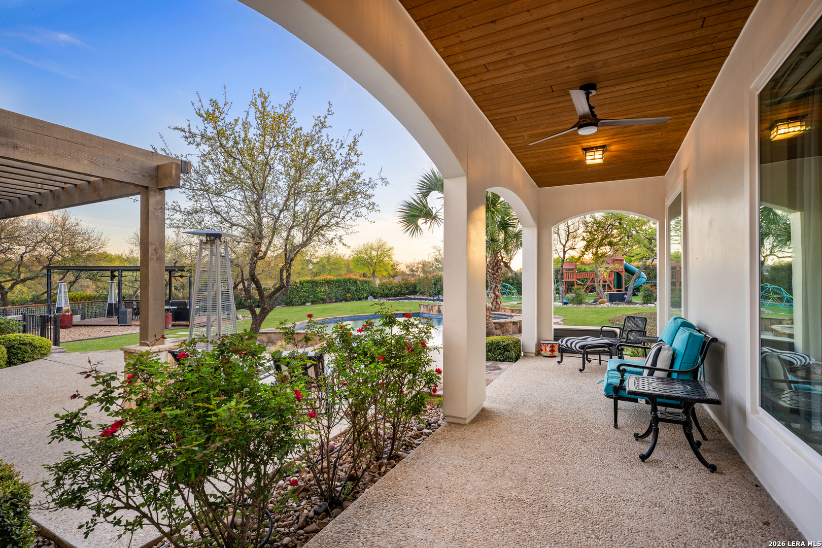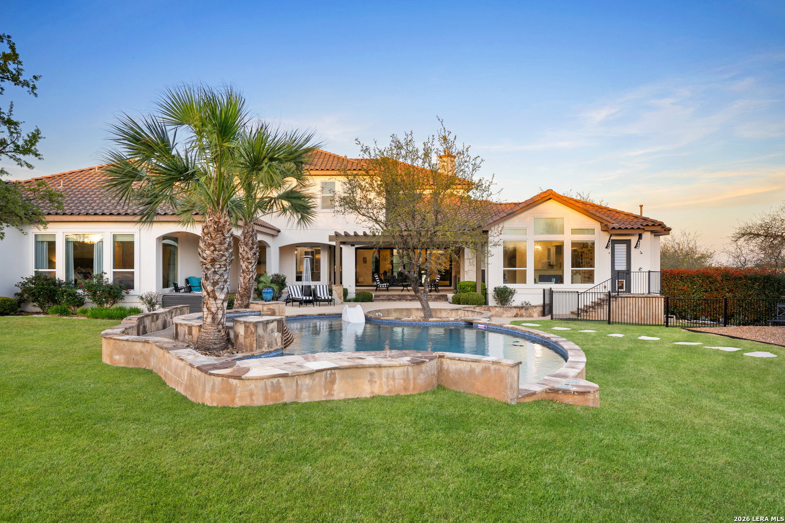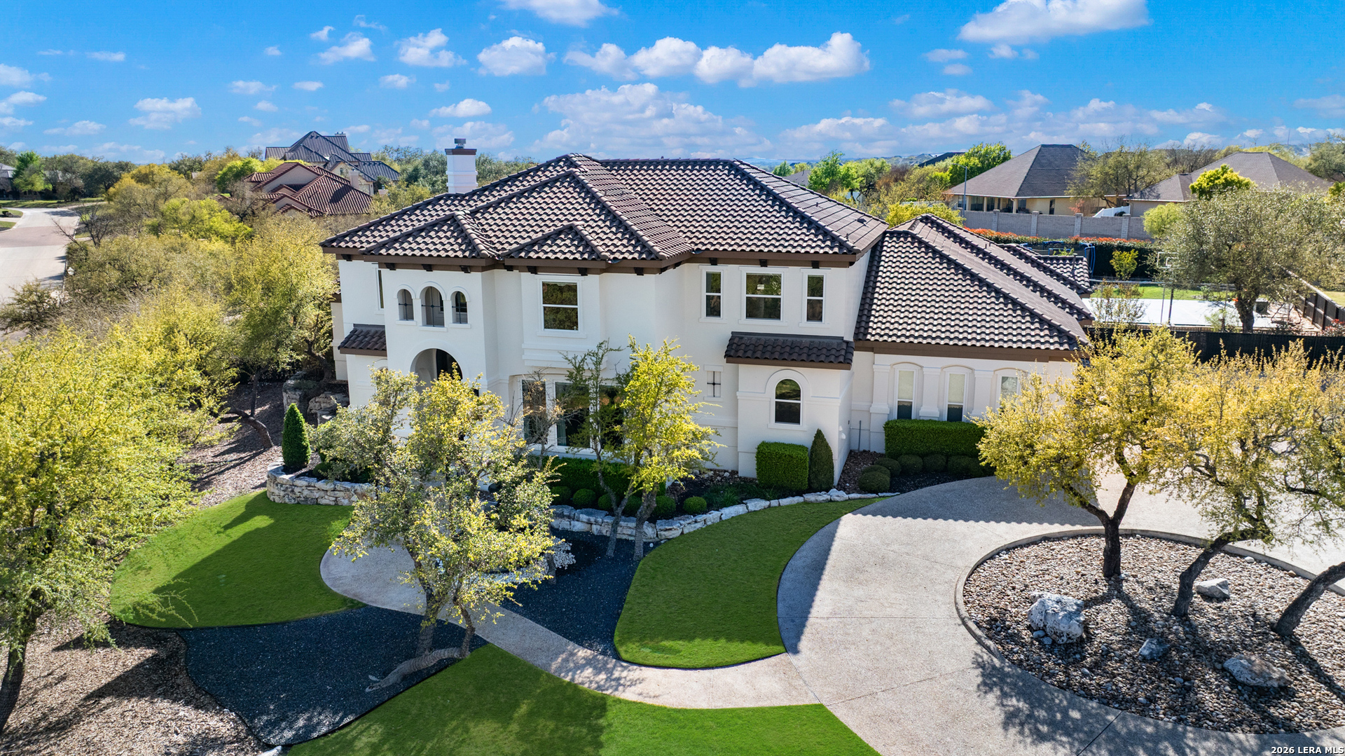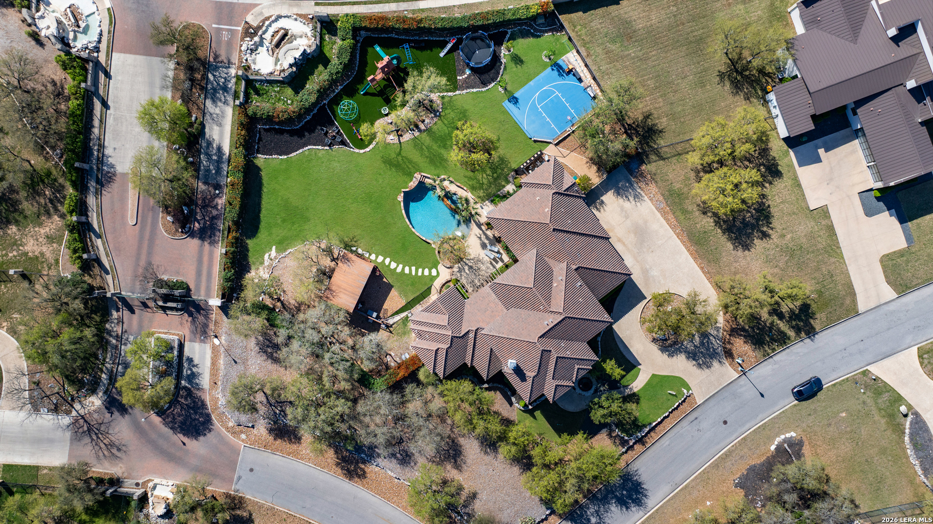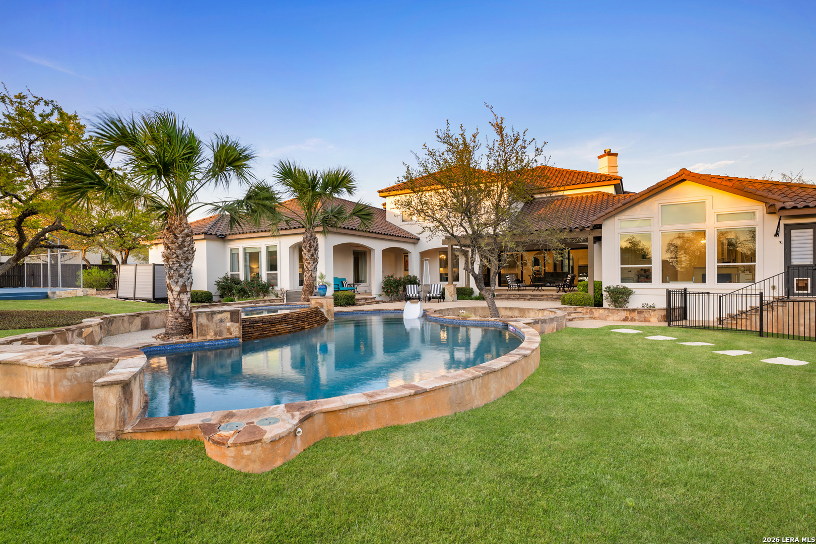 Timeless in design, this custom-built home in the gated Heights at Stone Oak Waterford has been extensively updated and upgraded. The perfected floorplan covers every base, and the indoor/outdoor flow allows for an elevated living experience. Fresh exterior paint, a circular driveway, a Cantera stone fountain, beautifully maintained grounds, and an oversized custom iron front door with Flemish glass create a strong architectural presence. Immediate views upon entry draw your eye to a park-like, resort-style backyard. Turn-key and move-in ready, this home has been meticulously maintained and needs nothing! MAIN LIVING AREAS | The main living area features a floor-to-ceiling stone fireplace and opens to wall-to-wall sliding doors, creating a seamless connection to the outdoor living space. The kitchen has been updated with added custom drawers, a new sink, updated hardware, natural stone countertops, double ovens, gas cooking, Bosch stainless steel appliances, and custom cabinetry. A wet bar and large wine cellar enhance the home's entertaining capabilities. DOWNSTAIRS LIVING | A downstairs guest suite with a full bath and walk-in shower offers privacy and flexibility for guests or multigenerational living. The primary suite includes a sitting area and a well-appointed bathroom with a garden tub, glass walk-in shower, dual vanities, and multiple walk-in closets, along with direct access to the backyard. The home also features a beautiful flex space with extra-large windows and access to the backyard, as well as a wet bar area that is perfect for a game room, theater room, indoor gym, or overall flex space. UPSTAIRS | Three generously sized bedrooms, two bathrooms, a loft/sitting room, and an additional office or flex space with exceptional views. OUTDOOR LIVING | The outdoor space is designed for both relaxation and recreation, with a pool (heated), waterfall, hot tub, gazebo, newly added turf, a designated large dog run, a designated play area, and a private basketball court. ADDITIONAL FEATURES | Additional features include a 3-car side-entry garage, two living areas, and a formal dining space. Double entry access from the garage, a large mudroom, and an oversized laundry room with a large walk-in pantry add to the home's functionality. HIGHLIGHTS | Resort-style backyard with pool, waterfall, hot tub, gazebo, and private basketball court | Over 3,000 sq ft of turf | Wall-to-wall sliding doors | Two tankless water heaters | Full bathroom remodel in bedroom 3 | Designated large dog run | Updated kitchen with Bosch stainless steel appliances, gas cooking, double ovens, natural stone countertops, new sink, hardware, and added custom drawers | Large wine cellar and wet bar | Floor-to-ceiling stone fireplace | Custom iron front door with Flemish glass | Fresh exterior/interior paint | 3-car side-entry garage | Double entry garage access | Large mudroom | Oversized laundry room with sink/countertop and room for two stackable washer/dryers sets and then some | large walk-in pantry | Spacious flex room with backyard access | Upstairs game room and additional office/flex space | Generously sized bedrooms. Floor plan available. Must show pre-approval or proof of funds for showings.