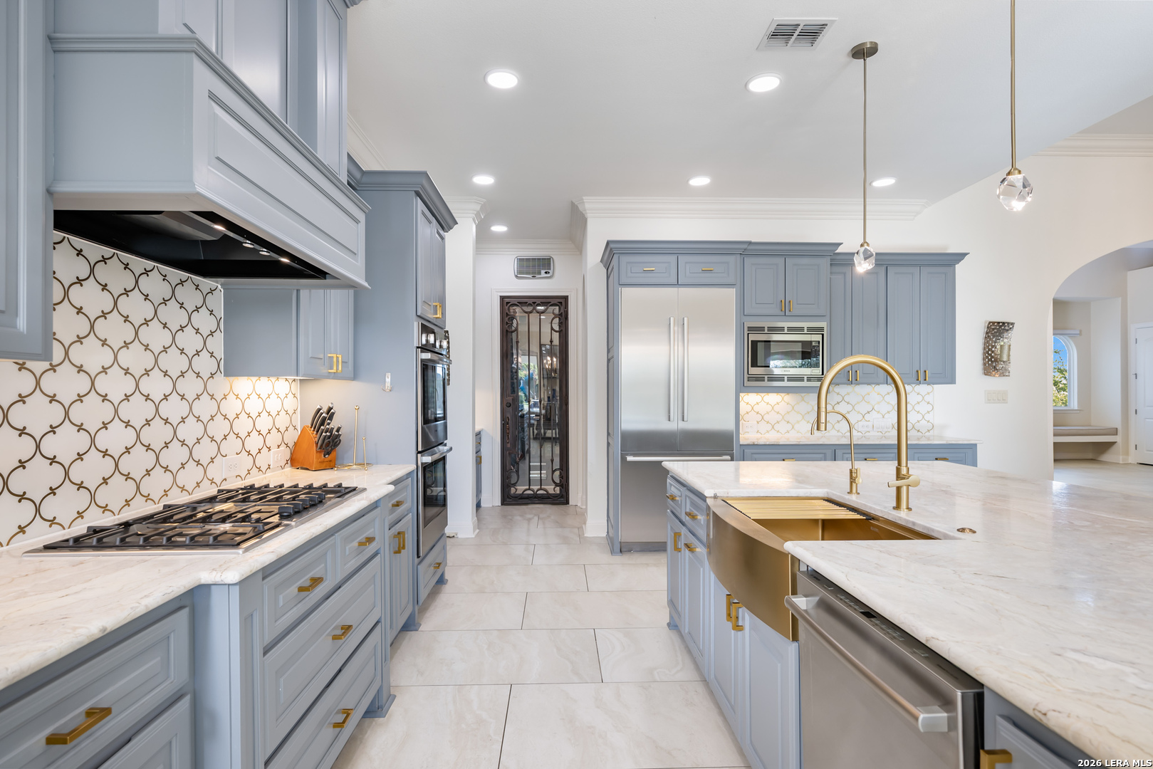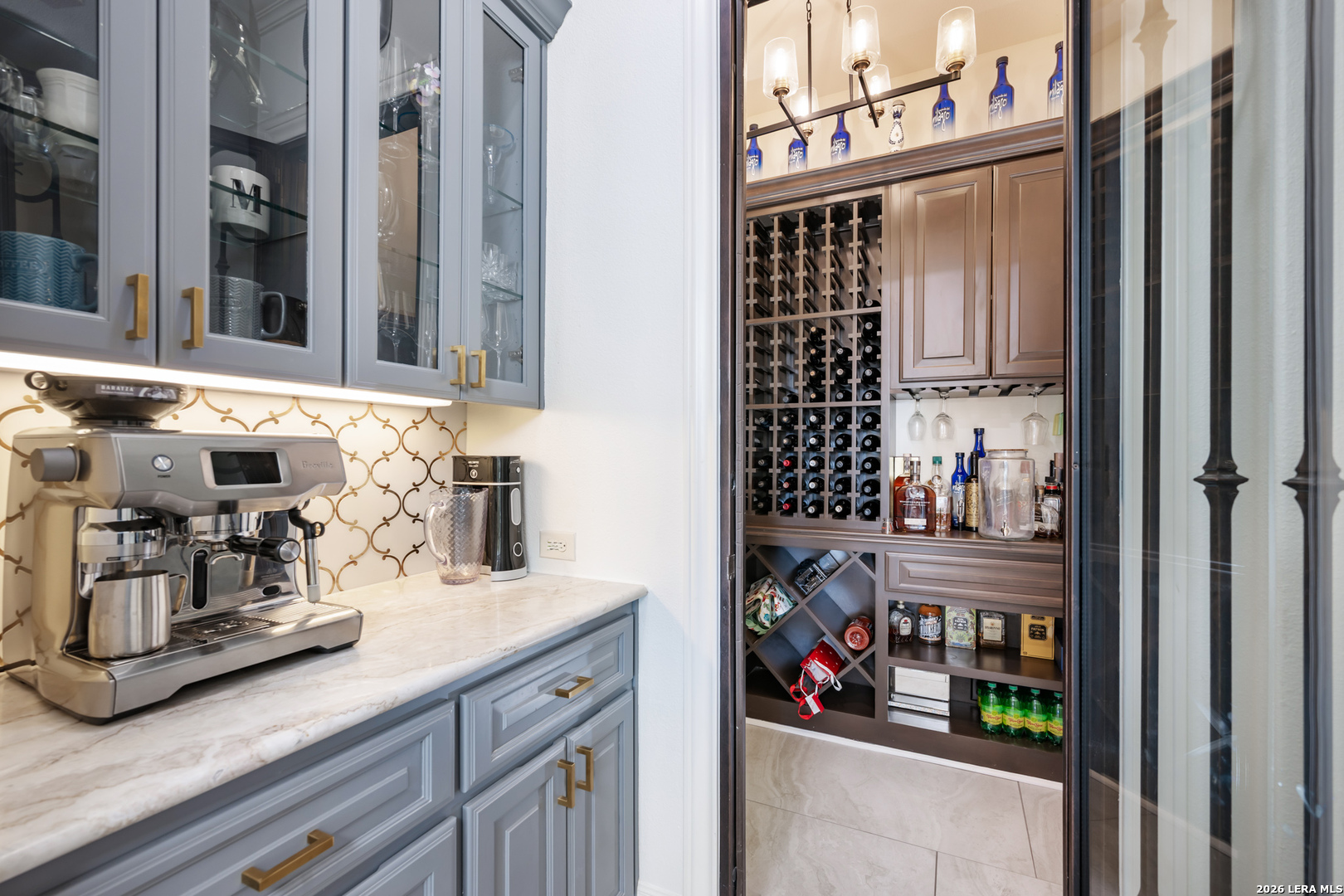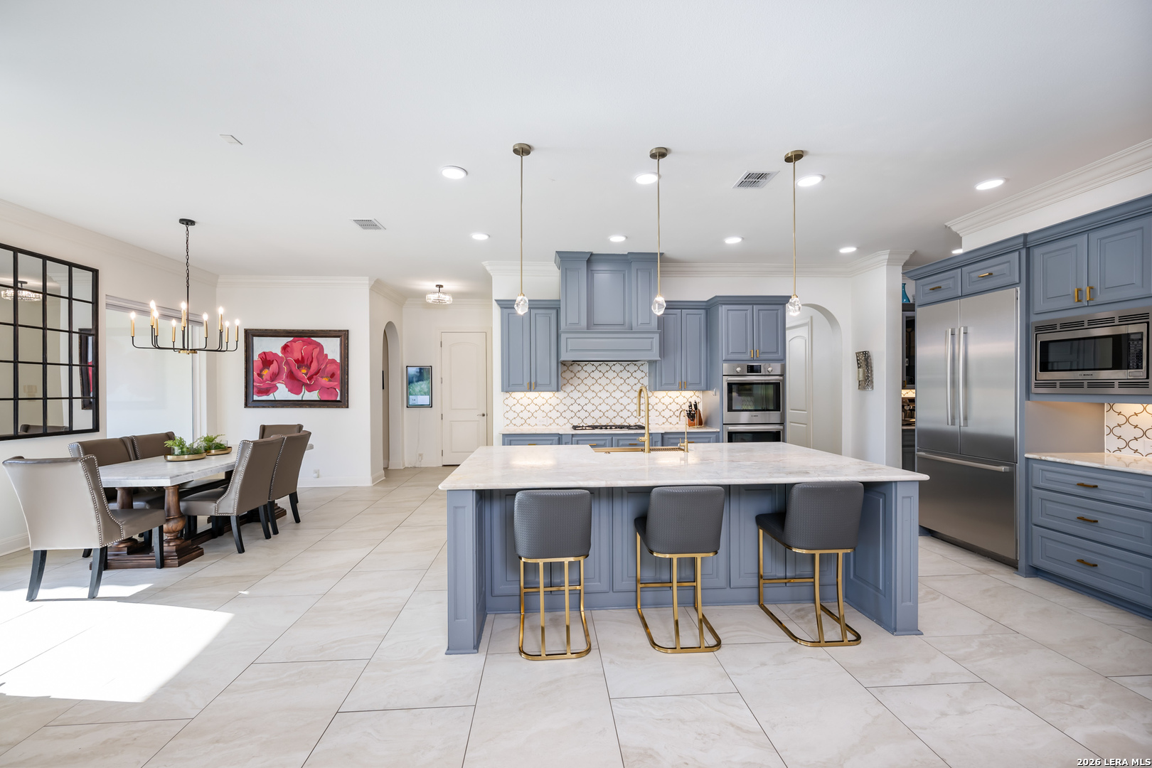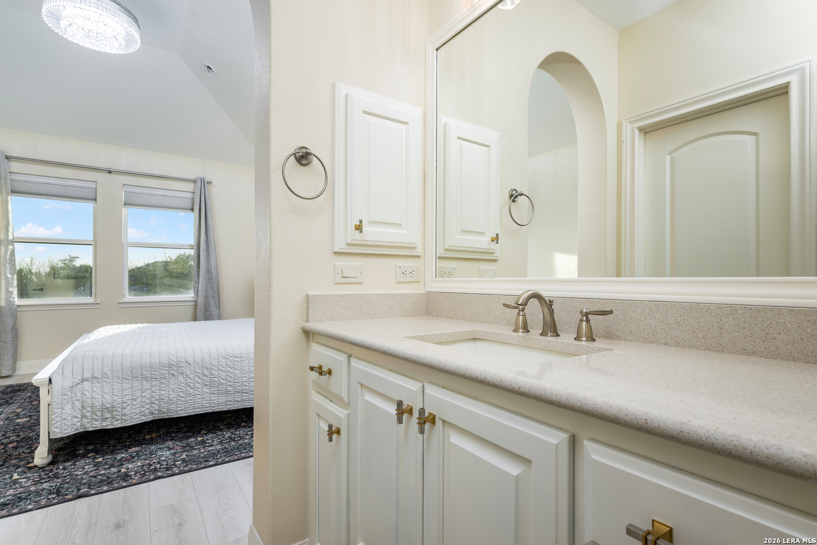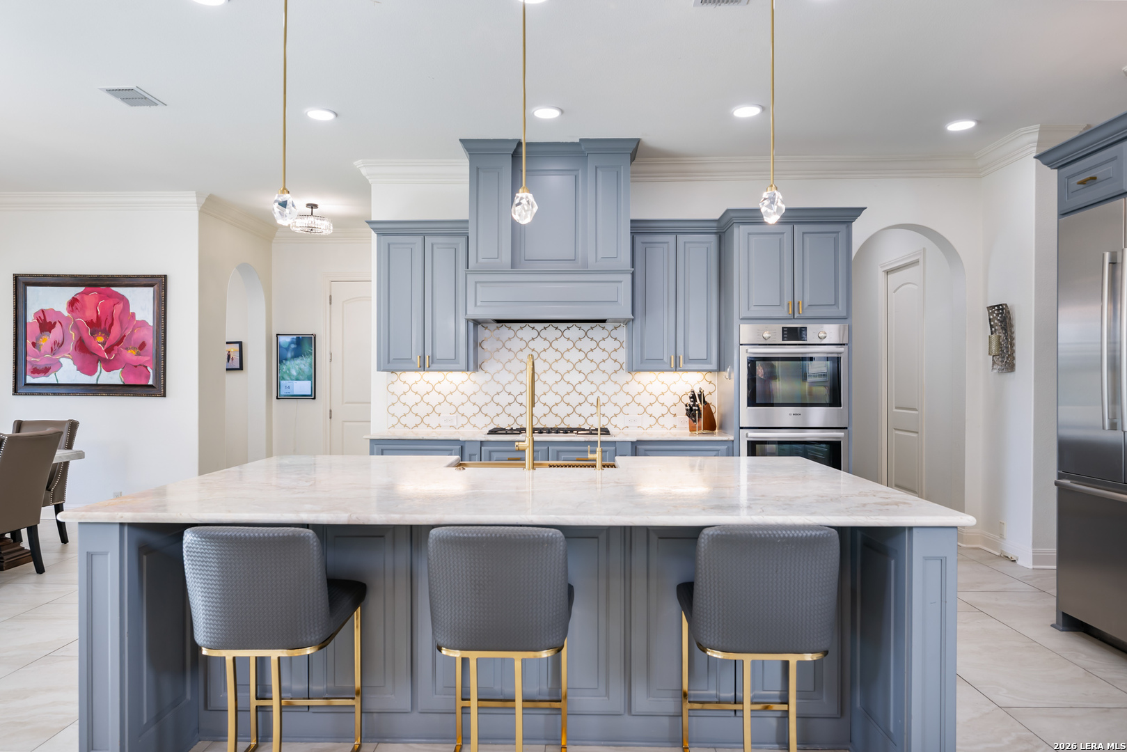 Timeless in design, this custom-built home in the gated Heights at Stone Oak Waterford has been extensively updated and upgraded. The perfected floorplan covers every base, and the indoor/outdoor flow allows for an elevated living experience. Fresh exterior paint, a circular driveway, a Cantera stone fountain, beautifully maintained grounds, and an oversized custom iron front door with Flemish glass create a strong architectural presence. Immediate views upon entry draw your eye to a park-like, resort-style backyard. Turn-key and move-in ready, this home has been meticulously maintained and needs nothing! MAIN LIVING AREAS | The main living area features a floor-to-ceiling stone fireplace and opens to wall-to-wall sliding doors, creating a seamless connection to the outdoor living space. The kitchen has been updated with added custom drawers, a new sink, updated hardware, natural stone countertops, double ovens, gas cooking, Bosch stainless steel appliances, and custom cabinetry. A wet bar and large wine cellar enhance the home's entertaining capabilities. DOWNSTAIRS LIVING | A downstairs guest suite with a full bath and walk-in shower offers privacy and flexibility for guests or multigenerational living. The primary suite includes a sitting area and a well-appointed bathroom with a garden tub, glass walk-in shower, dual vanities, and multiple walk-in closets, along with direct access to the backyard. The home also features a beautiful flex space with extra-large windows and access to the backyard, as well as a wet bar area that is perfect for a game room, theater room, indoor gym, or overall flex space. UPSTAIRS | Three generously sized bedrooms, two bathrooms, a loft/sitting room, and an additional office or flex space with exceptional views. OUTDOOR LIVING | The outdoor space is designed for both relaxation and recreation, with a pool (heated), waterfall, hot tub, gazebo, newly added turf, a designated large dog run, a designated play area, and a private basketball court. ADDITIONAL FEATURES | Additional features include a 3-car side-entry garage, two living areas, and a formal dining space. Double entry access from the garage, a large mudroom, and an oversized laundry room with a large walk-in pantry add to the home's functionality. HIGHLIGHTS | Resort-style backyard with pool, waterfall, hot tub, gazebo, and private basketball court | Over 3,000 sq ft of turf | Wall-to-wall sliding doors | Two tankless water heaters | Full bathroom remodel in bedroom 3 | Designated large dog run | Updated kitchen with Bosch stainless steel appliances, gas cooking, double ovens, natural stone countertops, new sink, hardware, and added custom drawers | Large wine cellar and wet bar | Floor-to-ceiling stone fireplace | Custom iron front door with Flemish glass | Fresh exterior/interior paint | 3-car side-entry garage | Double entry garage access | Large mudroom | Oversized laundry room with sink/countertop and room for two stackable washer/dryers sets and then some | large walk-in pantry | Spacious flex room with backyard access | Upstairs game room and additional office/flex space | Generously sized bedrooms. Floor plan available. Must show pre-approval or proof of funds for showings.