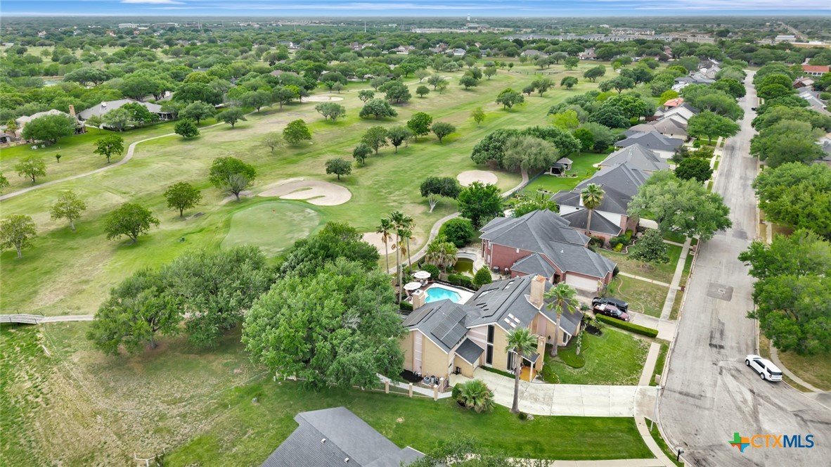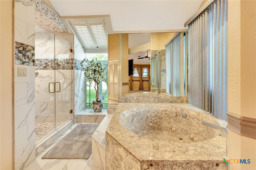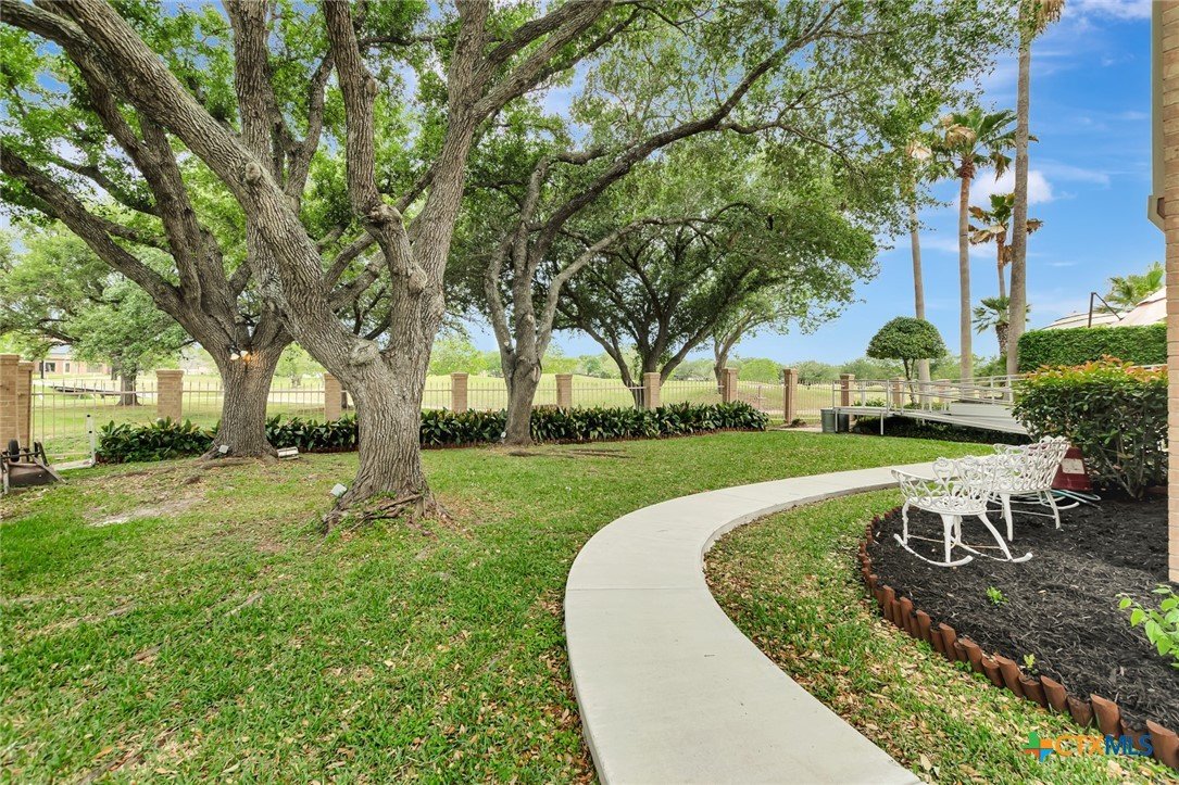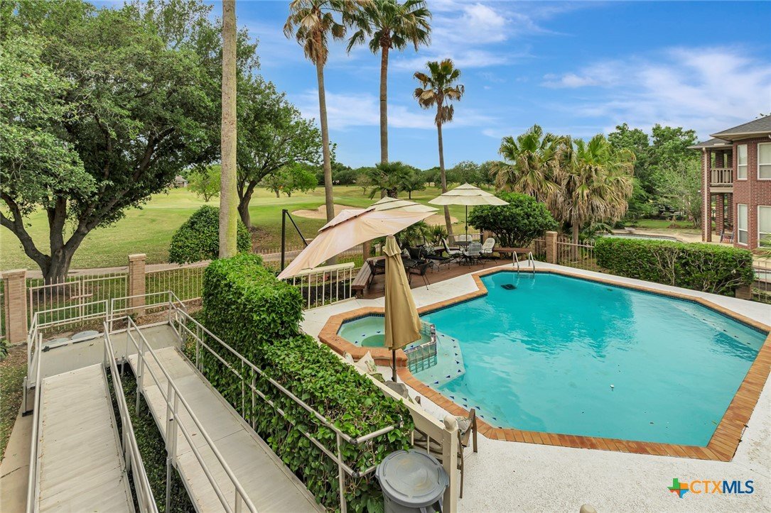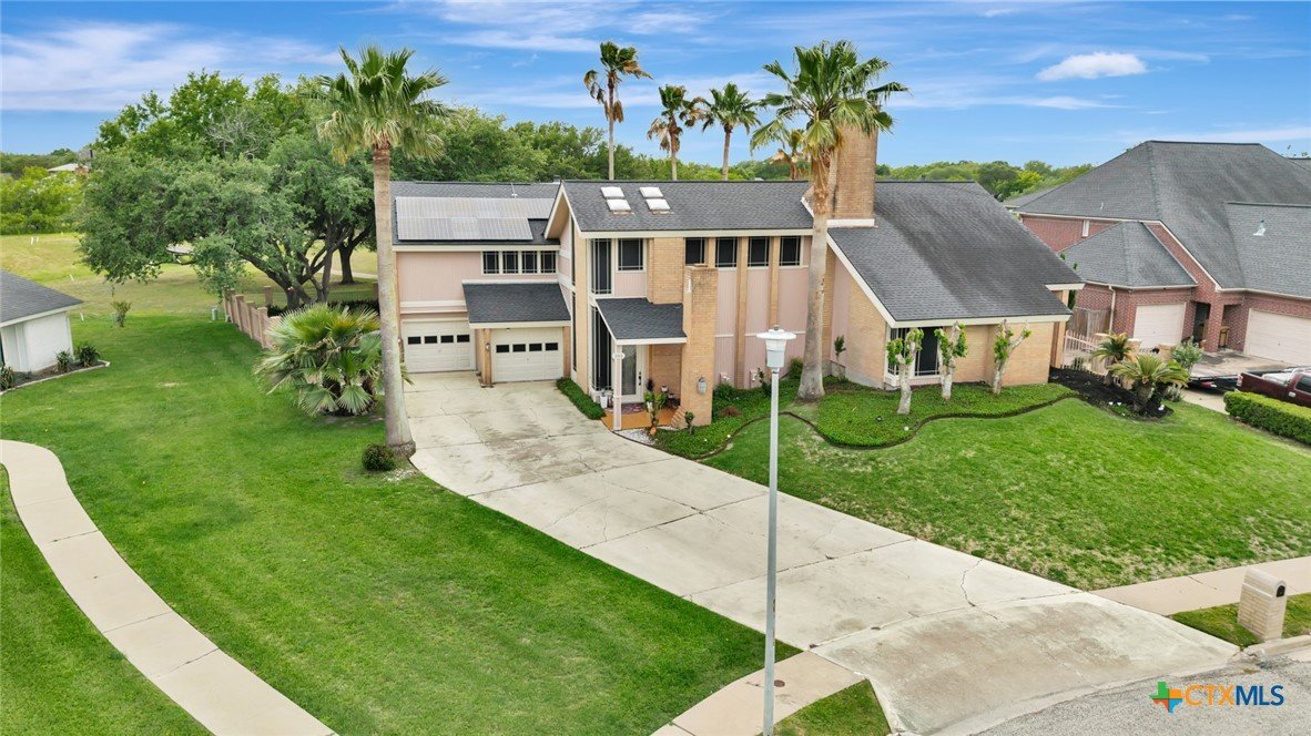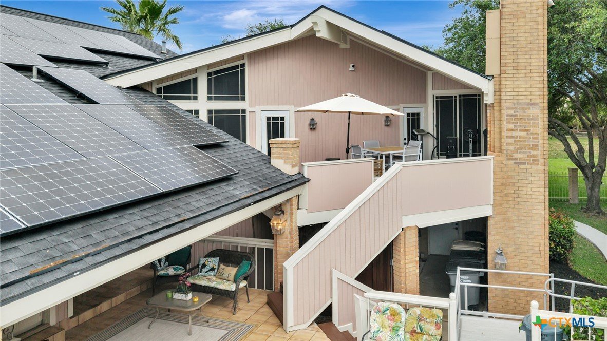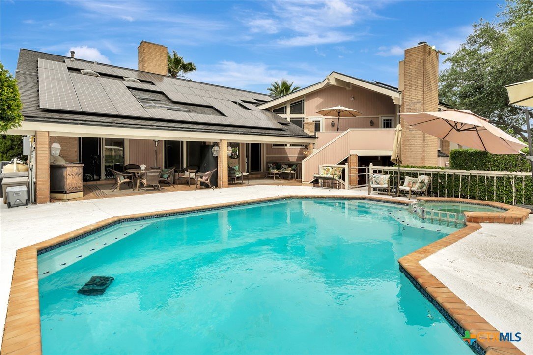 Live every day as if you’re on vacation in this architecturally designed, resort-style home overlooking the lush greens of the Victoria Country Club. Tucked away on a quiet cul-de-sac, this dramatic 4-bedroom, 3.5 bath residence offers indoor & outdoor entertaining spaces, two primary suites, and amenities rarely found in one property. The impressive entryway sets the mood for the grand living room with soaring wood-plank cathedral ceilings, abundant skylights, and a massive fireplace. A loft/study overlooks the living area; perfect for an in-home office. A formal dining room adjoins the kitchen with granite counters, a pantry & an island for extra seating. The split-bedroom design enhances privacy with 2 bedrooms off the living room, connected by a Jack-and-Jill bath and walk-in closets. The bath includes an accessible walk-in tub with a low threshold door, and built-in seat—combining safety and comfort for your soaking enjoyment. The primary suite offers an extra-large owner retreat complete with a walk-in closet, wet-bar access, jetted tub, and oversized pebble-floor shower. On the main level, the attached 2.5 car garage has been converted into a private mother-in-law suite with a full bath, roomy walk-in shower, vanity and dressing area, giving direct access to the sauna and pool area. Outdoor amenities include multi-level decks, an stainless kitchen with pass-through access from a wet bar, and a masonry fireplace for those cool evenings. A heated pool with block-glass hot tub overlooks the golf course, while still offering privacy with the lush landscaping and metal & brick column fencing. This spectacular lot offers convenient access to the golf course and the wheelchair ramp makes the pool and outside desks easily accessible. Additional features: two HVAC systems, solar panels for energy savings, Generac generator for stand-by-power, security and sprinkler systems. Recent interior updates including paint, doors, and hardware.