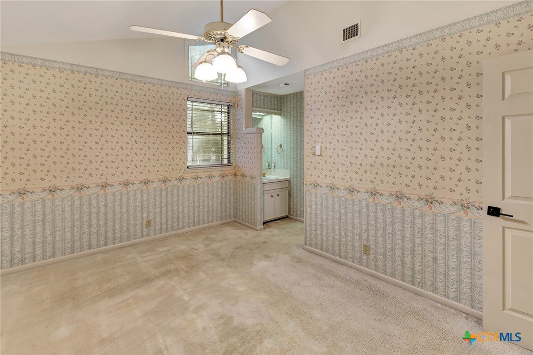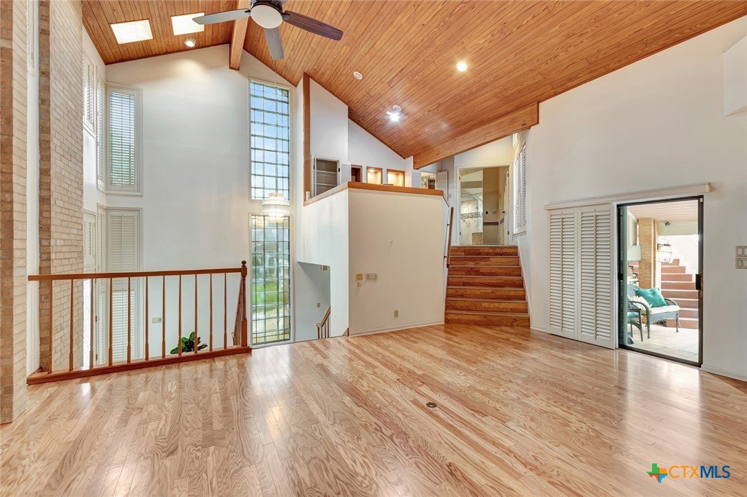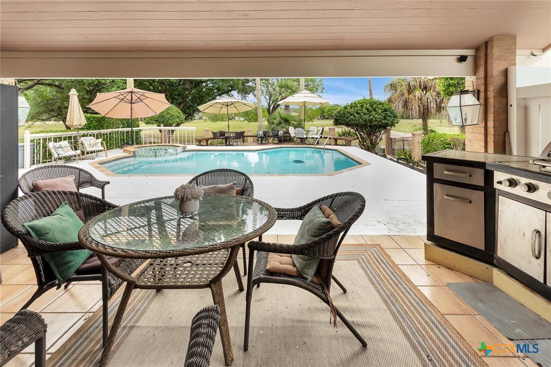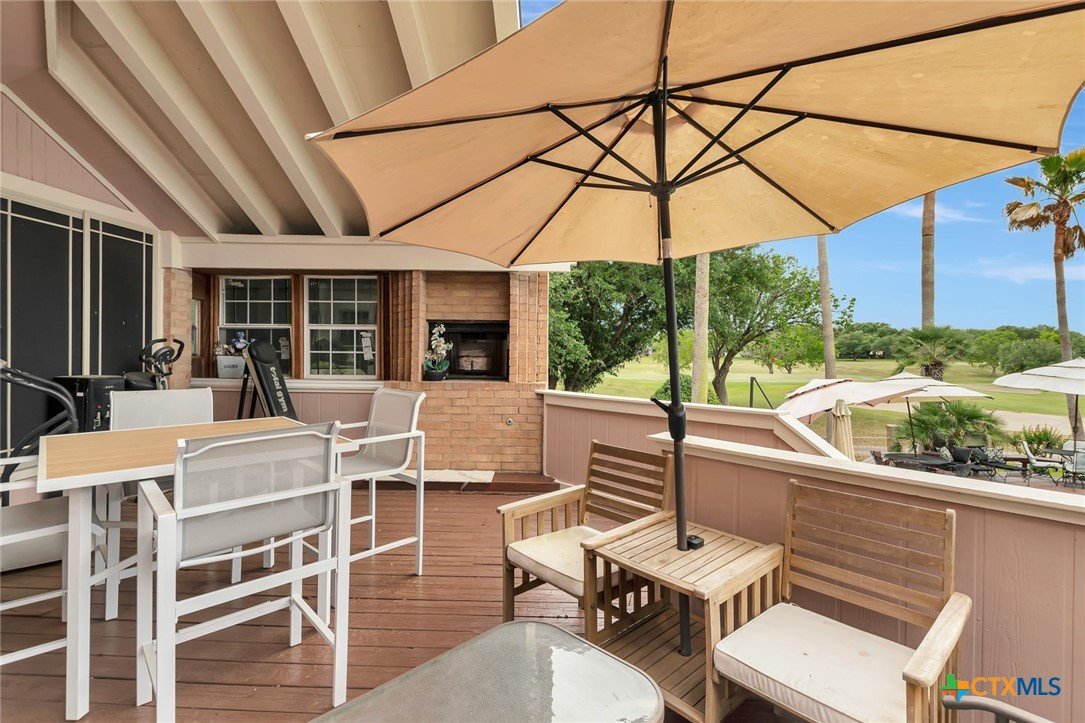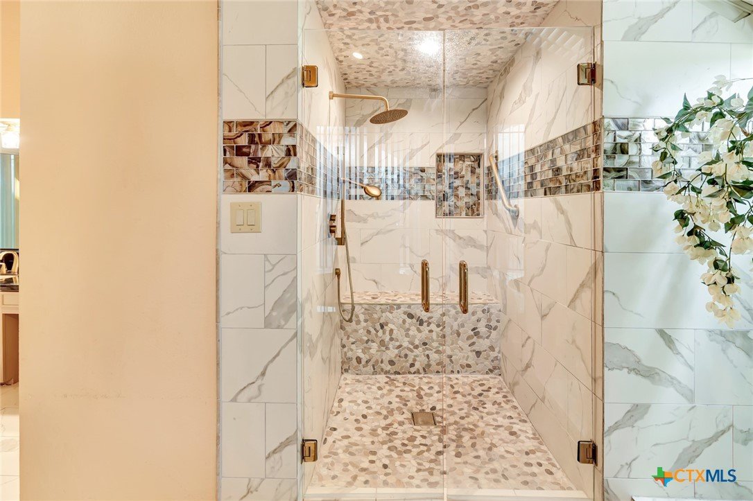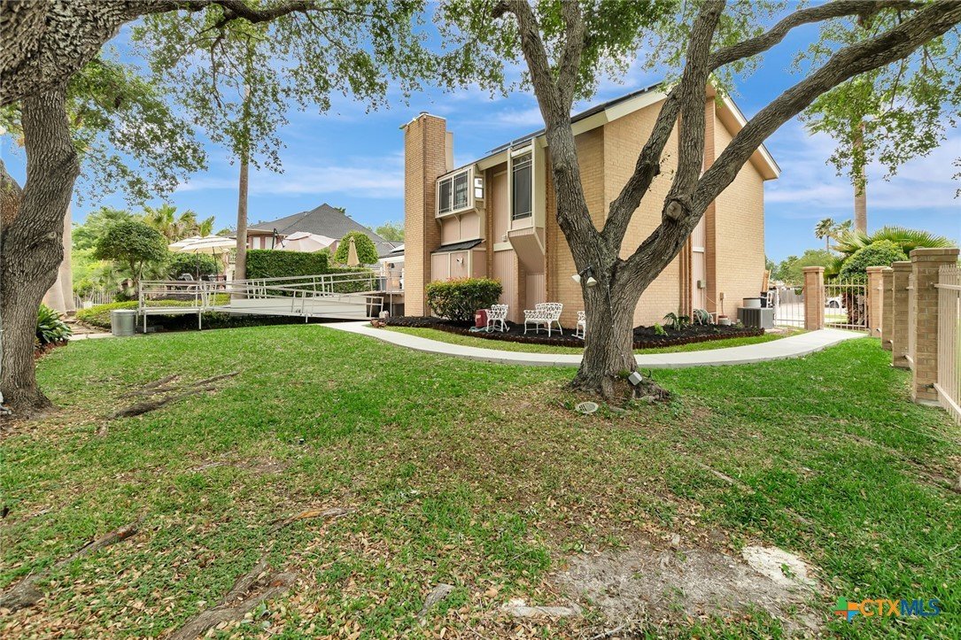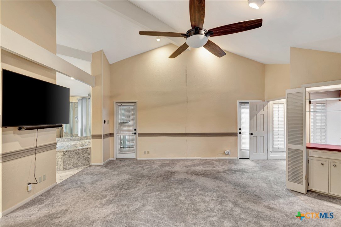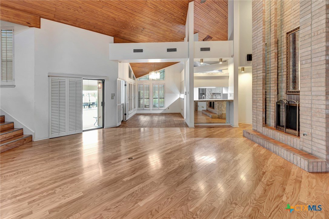 Live every day as if you’re on vacation in this architecturally designed, resort-style home overlooking the lush greens of the Victoria Country Club. Tucked away on a quiet cul-de-sac, this dramatic 4-bedroom, 3.5 bath residence offers indoor & outdoor entertaining spaces, two primary suites, and amenities rarely found in one property. The impressive entryway sets the mood for the grand living room with soaring wood-plank cathedral ceilings, abundant skylights, and a massive fireplace. A loft/study overlooks the living area; perfect for an in-home office. A formal dining room adjoins the kitchen with granite counters, a pantry & an island for extra seating. The split-bedroom design enhances privacy with 2 bedrooms off the living room, connected by a Jack-and-Jill bath and walk-in closets. The bath includes an accessible walk-in tub with a low threshold door, and built-in seat—combining safety and comfort for your soaking enjoyment. The primary suite offers an extra-large owner retreat complete with a walk-in closet, wet-bar access, jetted tub, and oversized pebble-floor shower. On the main level, the attached 2.5 car garage has been converted into a private mother-in-law suite with a full bath, roomy walk-in shower, vanity and dressing area, giving direct access to the sauna and pool area. Outdoor amenities include multi-level decks, an stainless kitchen with pass-through access from a wet bar, and a masonry fireplace for those cool evenings. A heated pool with block-glass hot tub overlooks the golf course, while still offering privacy with the lush landscaping and metal & brick column fencing. This spectacular lot offers convenient access to the golf course and the wheelchair ramp makes the pool and outside desks easily accessible. Additional features: two HVAC systems, solar panels for energy savings, Generac generator for stand-by-power, security and sprinkler systems. Recent interior updates including paint, doors, and hardware.