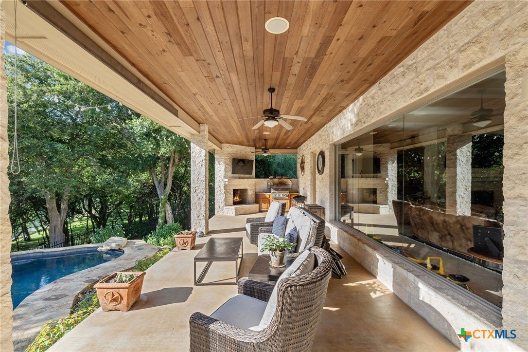 Guadalupe River views, a resort-style backyard, and a setting built for the Hill Country lifestyle. Conveniently located just minutes from Gruene and Downtown New Braunfels, offering easy access to dining, shopping, and entertainment. With 83’ of scenic river frontage, this property offers direct water access via a private stone walkway, surrounded by mature trees and well-designed landscaping that creates both privacy and a true waterfront atmosphere. The outdoor space is designed to be the centerpiece. A pool and spa with waterfall, covered patio with wood ceiling, full outdoor kitchen, and wood-burning fireplace create a comfortable, all-season gathering space. Whether hosting friends, enjoying a quiet evening, or spending the day by the water, the layout makes it easy to enjoy the river setting. Inside, the home features an open-concept design with large windows that bring in natural light and frame views of the pool and river. The living room is anchored by a floor-to-ceiling stone fireplace with custom built-ins, while the kitchen offers granite countertops, double ovens, gas cooktop, and a spacious island ready for everyday living or entertaining. The primary suite provides a private escape with river views and outdoor access, along with a spa-style bath featuring a soaking tub, walk-in shower, dual vanities, and a generous walk-in closet. Metal roof, irrigation from the river, dual HVAC systems, and an oversized garage add long-term durability and function. Waterfront access. Outdoor living. Hill Country comfort—all in one riverfront setting.