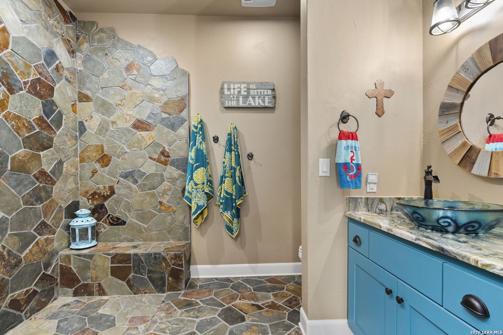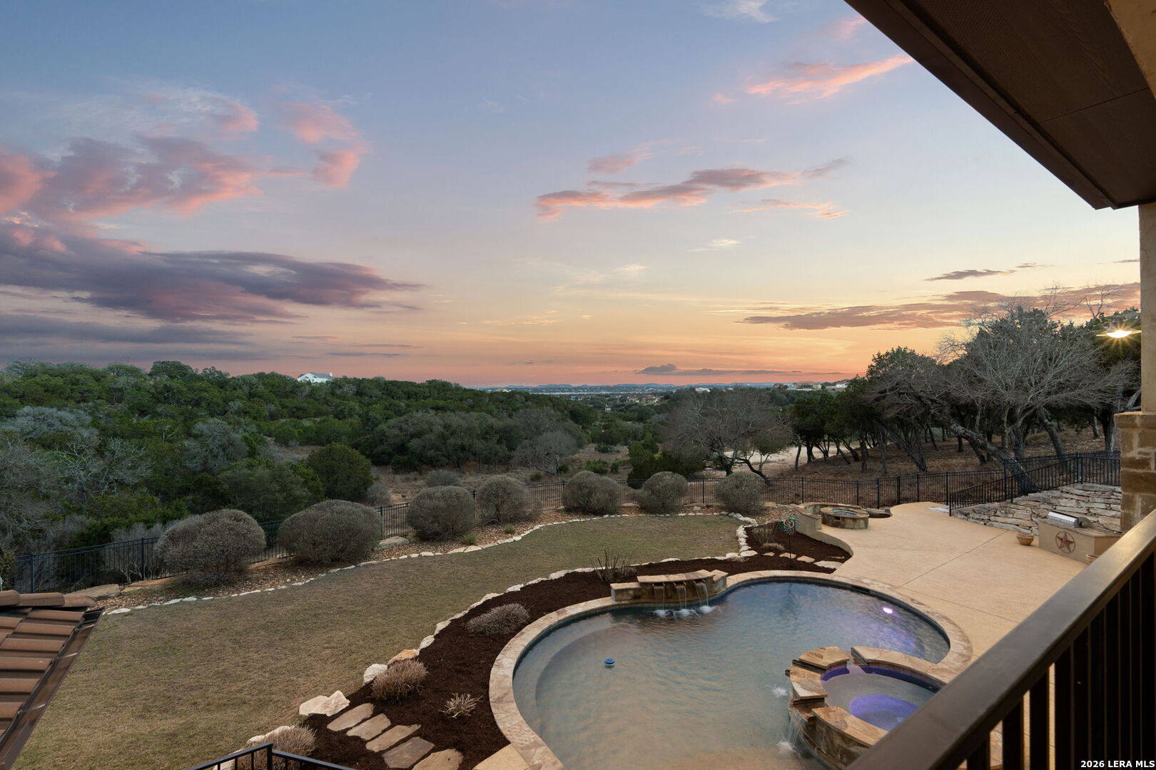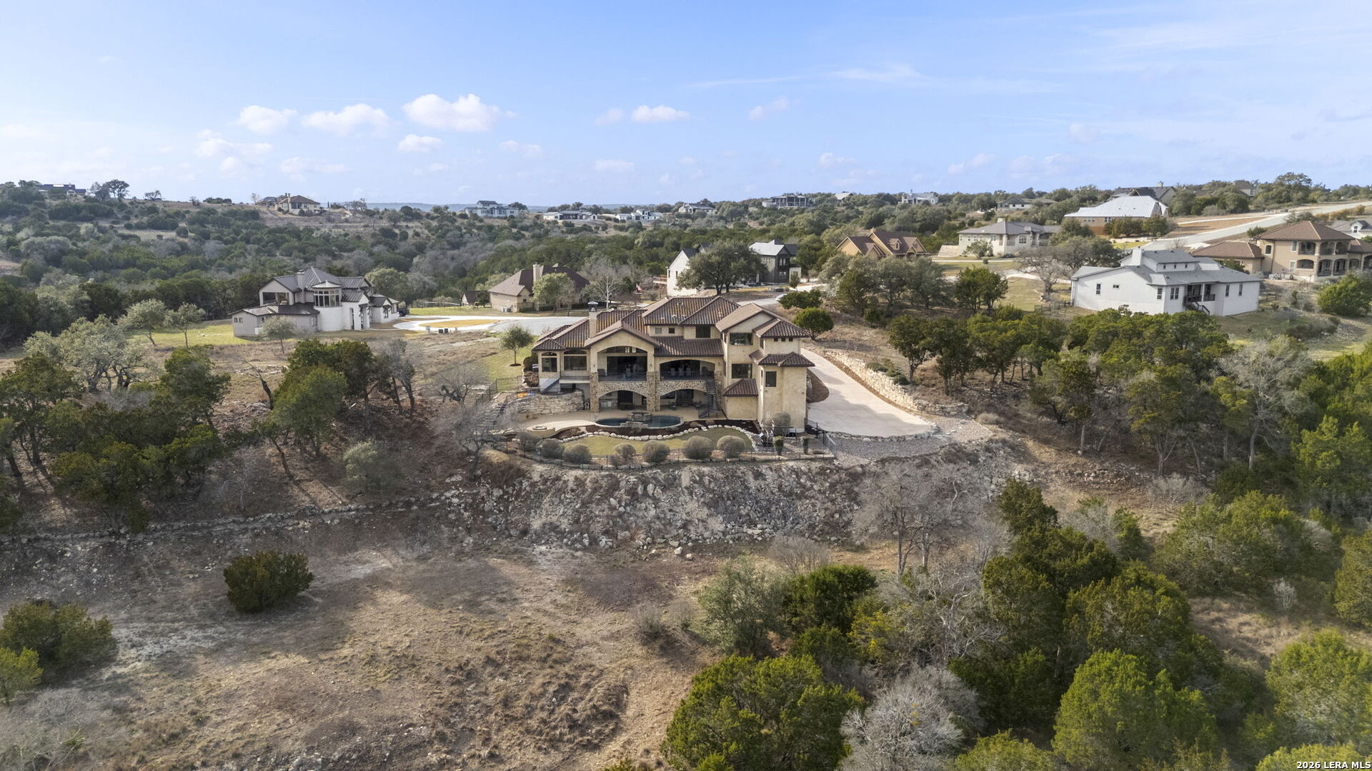 Set on 3.14 private acres within Mystic Shores, 1039 Bluewater Place offers an exceptional Hill Country living experience with sweeping canyon vistas, tranquil water views of Canyon Lake, and thoughtfully designed spaces across three levels and more than 8,000 square feet. This 5 bedroom, 6 bath residence blends architectural presence with everyday livability. The open concept living, dining, and kitchen areas are framed by soaring 10' ceilings, rich stonework, and expansive windows that capture long-range views. The chef's kitchen centers around an exceptional 14-foot granite island, custom cabinetry, artisan finishes, a warming drawer, a drawer microwave, instant hot and cold filtered water at the sink, and is complemented by a spacious walkthrough pantry with its own prep island-beautifully designed to anchor both entertaining and everyday living. Designed for flexibility, the home includes a library office, a third level studio workspace, a game room, exercise room, wine grotto, and a bunk room that comfortably sleeps eight. Each bedroom features its own private bathroom and walk-in closet, enhancing comfort and privacy for family and guests. Elevator access connects all three levels, complemented by two staircases for ease of movement throughout. The primary suite offers a peaceful retreat with a private sitting room, and a spa inspired bath featuring towel warmers and an expansive walk-in shower. A custom walk-in closet completes the suite, showcasing extensive built-ins and a large center island with deep drawers for elevated everyday living. Additional conveniences include a large laundry room with an upper-level chute, whole house audio, custom built-ins and granite throughout, and climate controlled third level storage, also known as a Texas Basement. Outdoor living spans two levels of covered porches overlooking the canyon and lake, along with a resort style pool and spa, expansive cool deck, firepit with seating, and outdoor kitchen. Additional features include a 4 bay garage, pool equipment room, four HVAC systems, a transferable preventative termite barrier system, two wall safes, and a remote monitored fire and security system. The property has recently been independently appraised at $3.5 million, reflecting the scale, design, and setting of this Hill Country estate. Located within Mystic Shores, residents enjoy access to Canyon Lake, community amenities, nature preserves, and trails while remaining within reach of San Antonio, New Braunfels, and Austin.