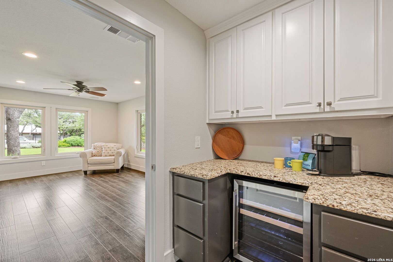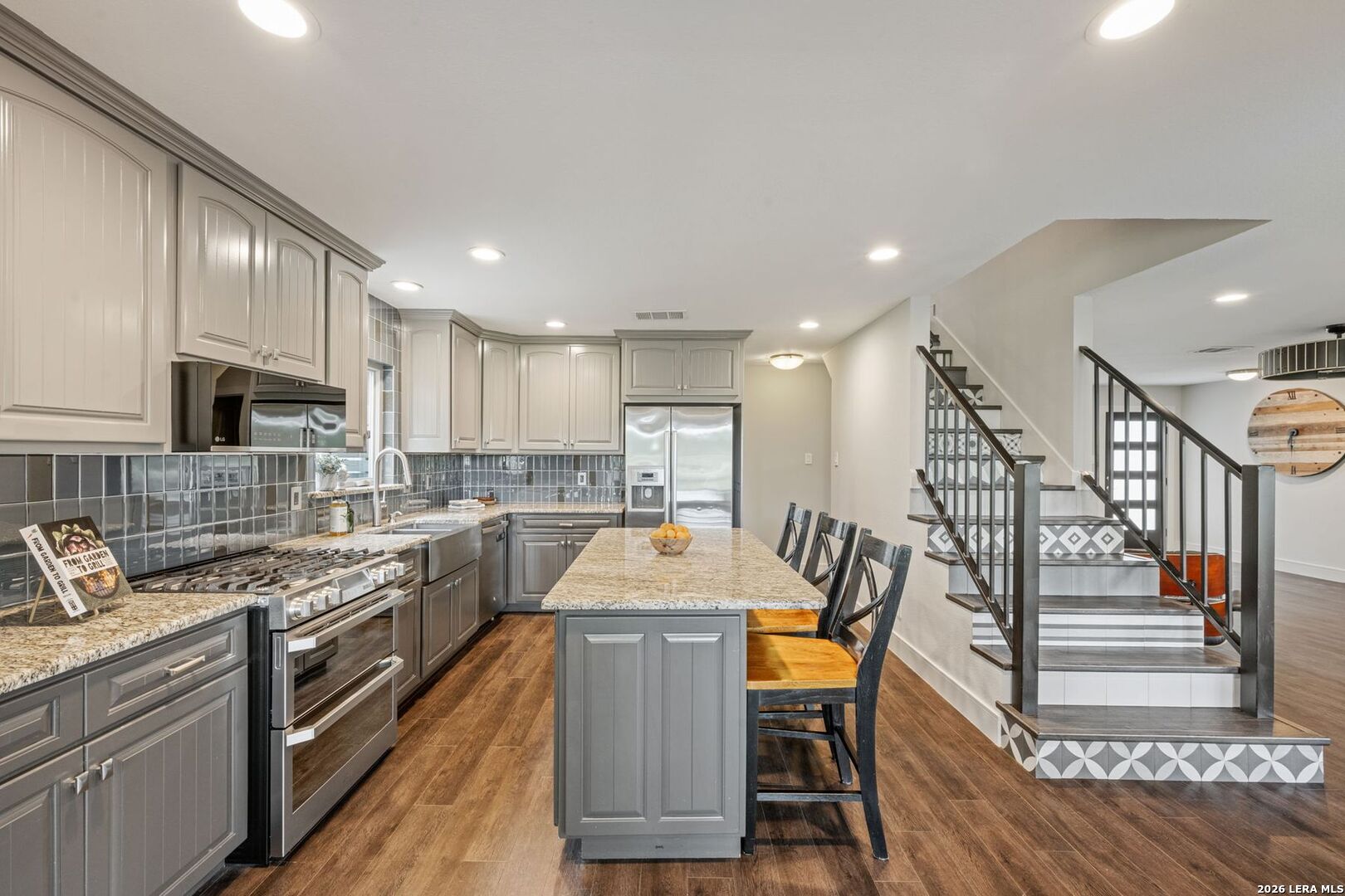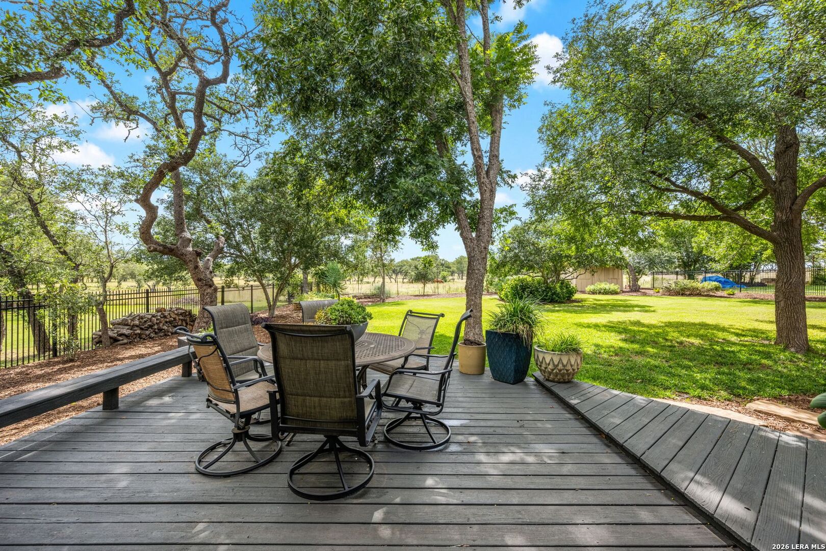 Welcome home to 104 Arrowhead Lane in popular Ranger Creek! Stylishly updated throughout this home has it all: on-trend finishes, kitchen with gas cooking, tankless water heater, replacement windows, propane tank, lush landscaping, and much more! On the main level you'll find an open living and dining room that flows into a chef-ready kitchen with kitchen island, and breakfast/dining area with built-in banquet benches with storage. The second living area is ideal for family movie nights and provides a built-in drop zone off the carport entry. The laundry room doubles as a prep space with granite counters, cabinetry and beverage cooler located conveniently off the kitchen and second living space. As you walk up the tile accented stairs to the second level, you find an expansive primary suite with sconces, LVP flooring, attached bath with double sinks, custom oak cabinetry and a walk-in closet with modular components for easy storage options! The hall bath is stylishly updated and serves the secondary bedrooms. The beautifully landscaped yard is a nature lovers paradise with native trees, mulched beds with native plantings, raised garden beds with drip irrigation. The 8x12 storage building has served as a chicken coop for 4-H projects, gardening tools/supplies, and more! The expansive deck gives you space to relax and entertain, and the large backyard gives you room to roam and play! Ranger Creek is a short drive from IH10 and Downtown Boerne and offers a community pool, tennis and clubhouse.