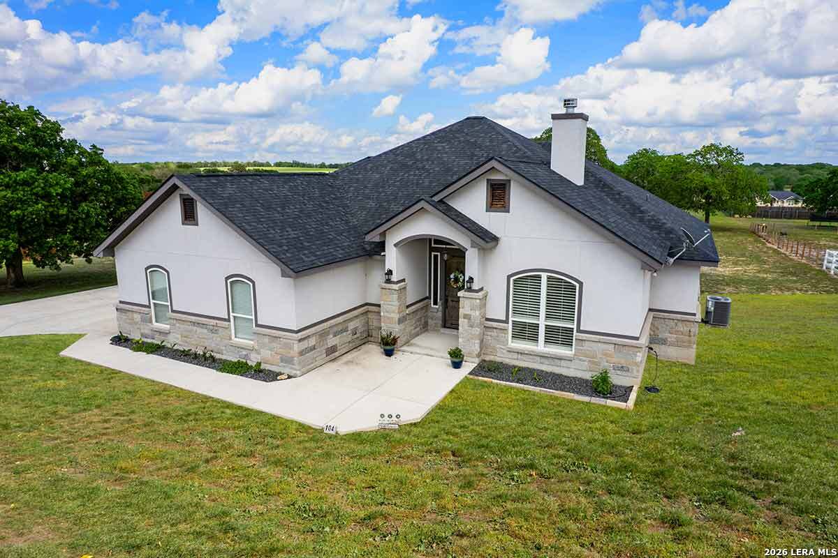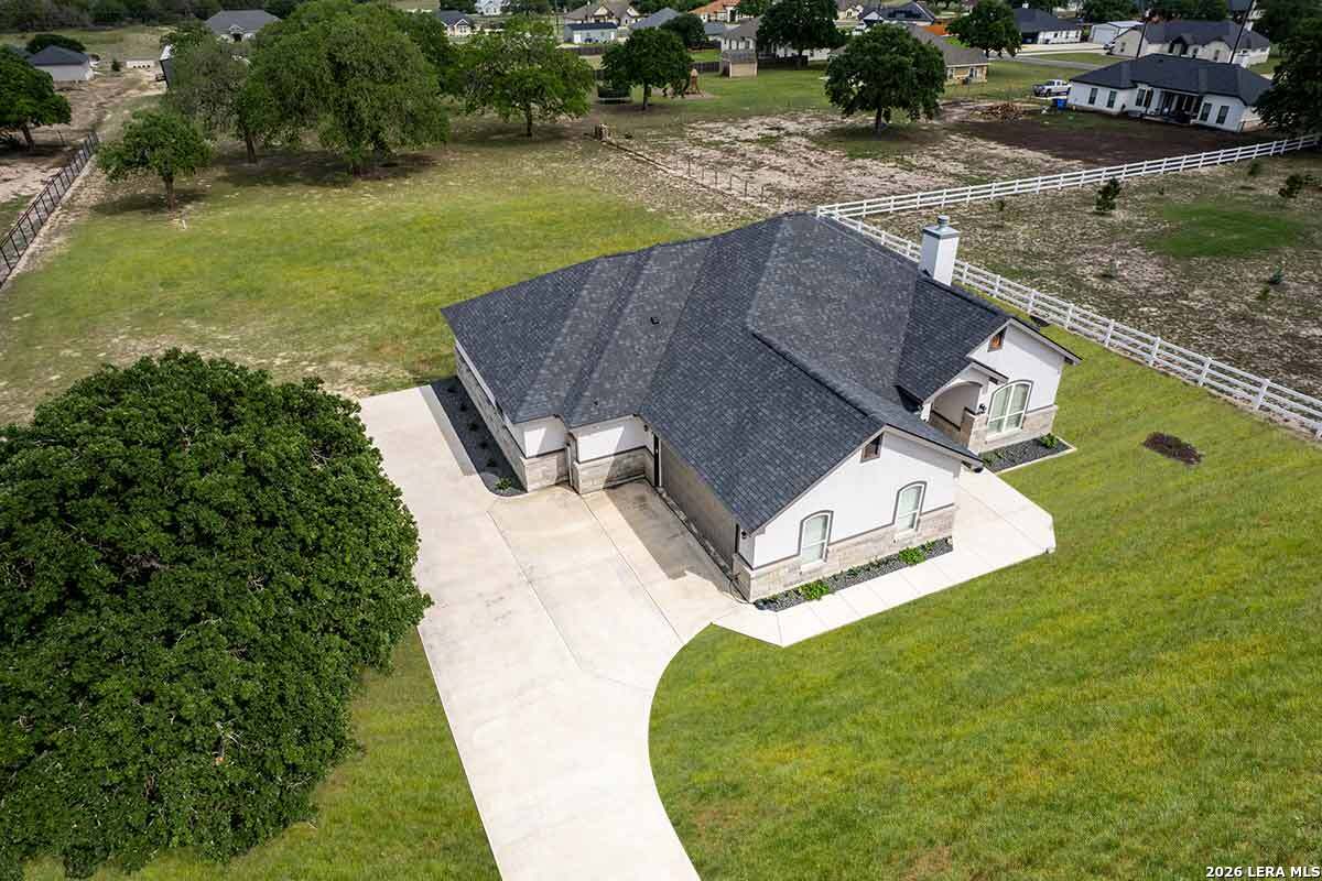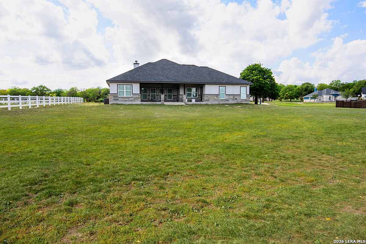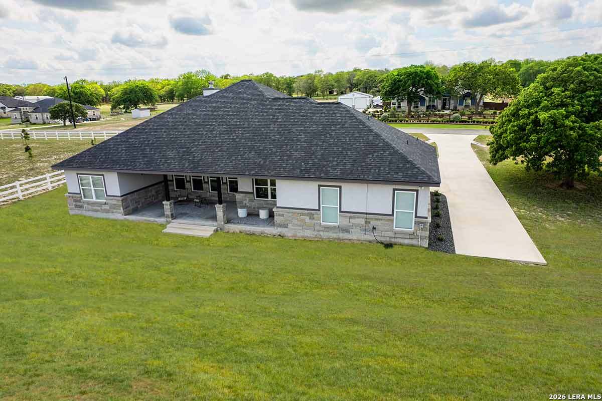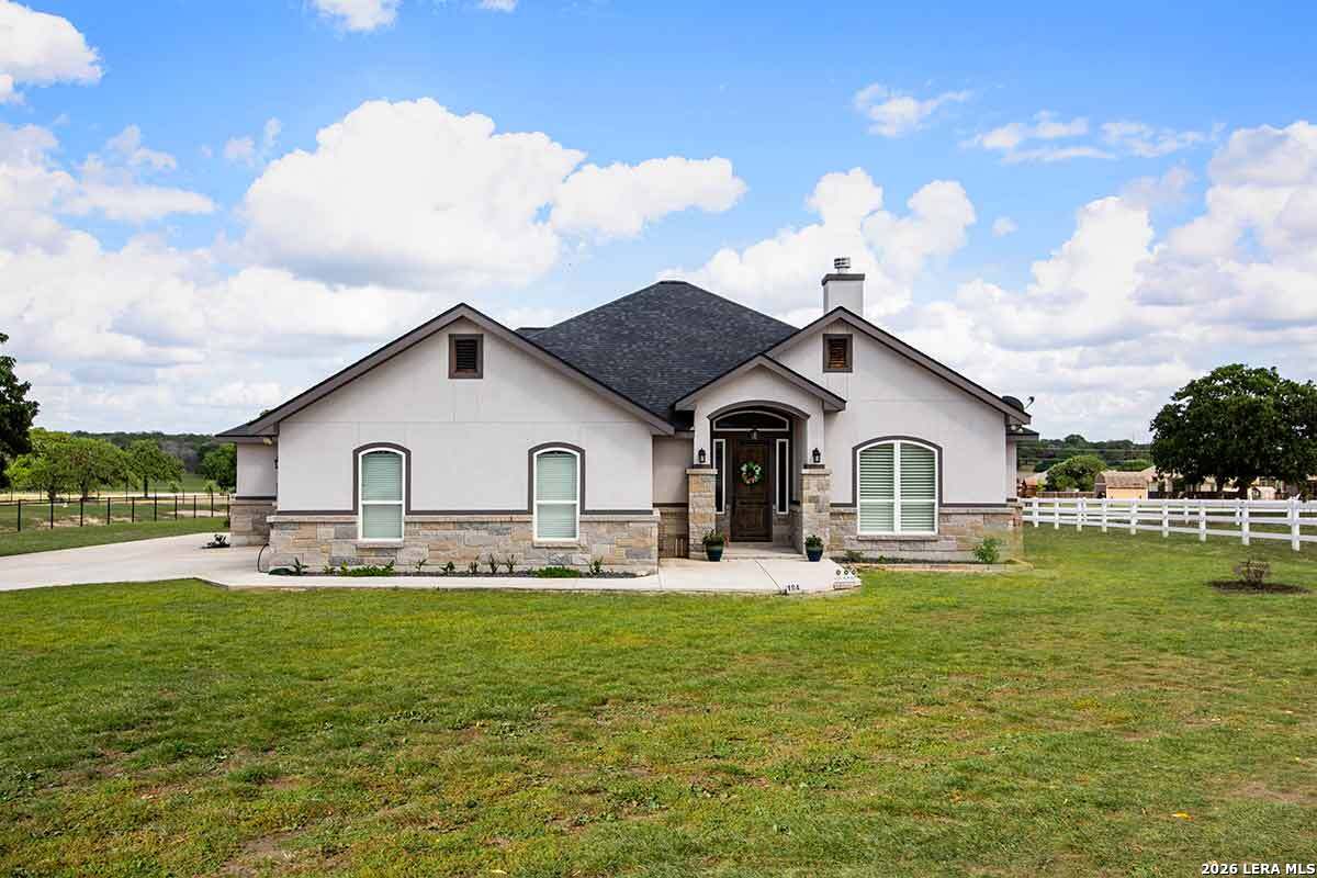 Discover this Lightly-Lived-In, 2021-built Stone & Stucco Home on 1.44 Acres of Texas Countryside in The Settlement neighborhood of La Vernia! The Generous concrete Driveway & Sidewalk allow for Ample Parking and welcome you to the Fashionable Residence. With 4 Bedrooms (one of which is an ideal study/office), 2.5 Baths, and an Open Layout with Beautiful Wood-Tile Floors throughout (easy care, no carpet!) ... this home offers flexibility & ease for your lifestyle. Double French Doors off the entry open to the Study/4th bedroom, with grand windows graced by plantation shutters - and Fiber Internet makes remote work a breeze! In the Living Room, the stone fireplace creates a focal point for gatherings, and abundant windows showcase country views. The Island Kitchen features chic dual-finish cabinetry topped by Gorgeous Granite Counters, with stainless steel GE appliances including a separate cooktop + built-in oven. Journey into the Spacious Master Retreat with Lavish Bath: Double Vanity w/Marble Counter, Soaking Tub set into a Marble Surround + Decorative Tile Accent, Walk-In Shower, and Huge Closet. The secondary bedrooms are likewise roomy, and don't miss the stylish tile around the tub! Chores are a Delight in the sizable Laundry Room with multiple cabinets, granite counter, and space for a 2nd refrigerator! You'll appreciate the efficiency of 2 water heaters. The half-bath opens directly to the back patio - ideal for outdoor activities! Enjoy the pleasant Back Patio as you overlook the private back yard with several Heritage Oaks providing shade & beauty. Schedule to see this exceptional property today!