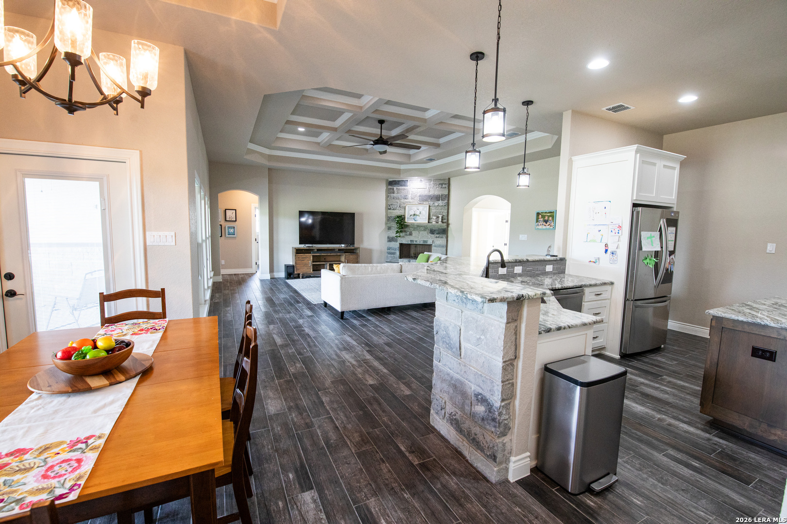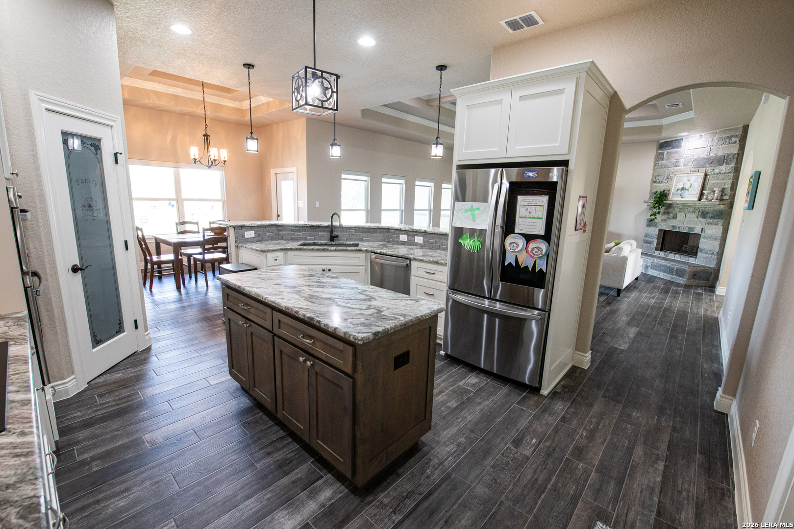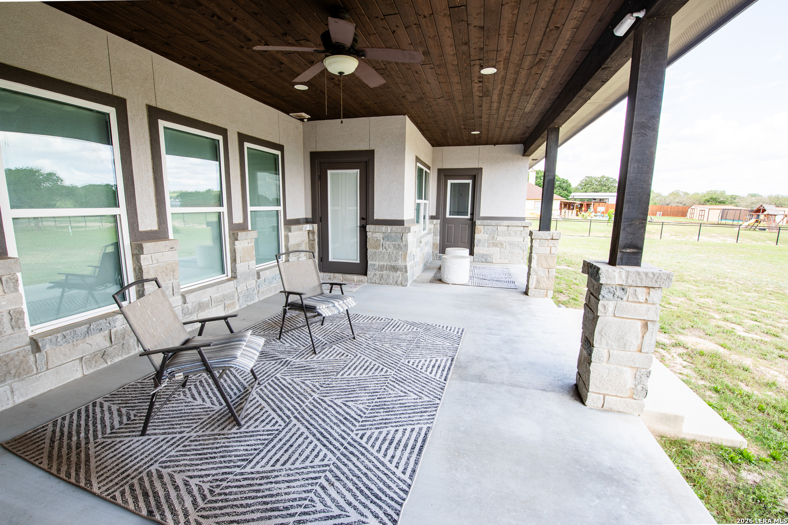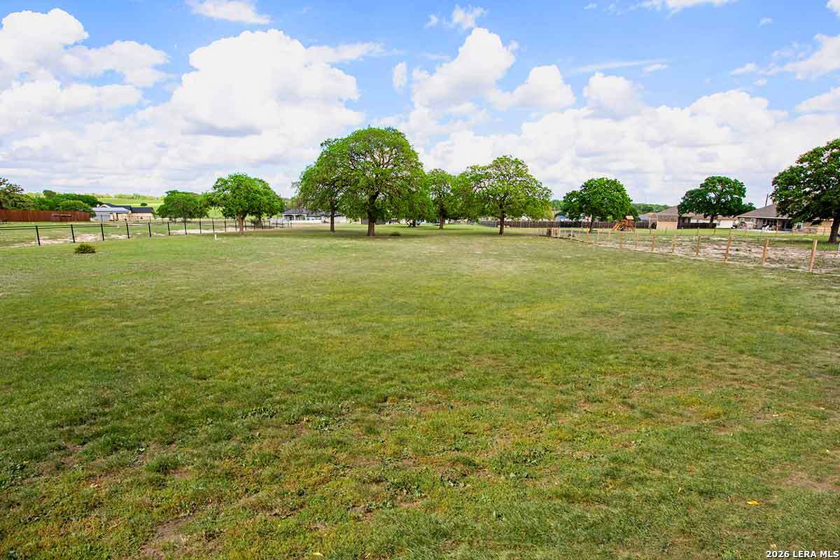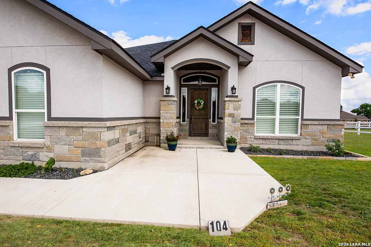 Discover this Lightly-Lived-In, 2021-built Stone & Stucco Home on 1.44 Acres of Texas Countryside in The Settlement neighborhood of La Vernia! The Generous concrete Driveway & Sidewalk allow for Ample Parking and welcome you to the Fashionable Residence. With 4 Bedrooms (one of which is an ideal study/office), 2.5 Baths, and an Open Layout with Beautiful Wood-Tile Floors throughout (easy care, no carpet!) ... this home offers flexibility & ease for your lifestyle. Double French Doors off the entry open to the Study/4th bedroom, with grand windows graced by plantation shutters - and Fiber Internet makes remote work a breeze! In the Living Room, the stone fireplace creates a focal point for gatherings, and abundant windows showcase country views. The Island Kitchen features chic dual-finish cabinetry topped by Gorgeous Granite Counters, with stainless steel GE appliances including a separate cooktop + built-in oven. Journey into the Spacious Master Retreat with Lavish Bath: Double Vanity w/Marble Counter, Soaking Tub set into a Marble Surround + Decorative Tile Accent, Walk-In Shower, and Huge Closet. The secondary bedrooms are likewise roomy, and don't miss the stylish tile around the tub! Chores are a Delight in the sizable Laundry Room with multiple cabinets, granite counter, and space for a 2nd refrigerator! You'll appreciate the efficiency of 2 water heaters. The half-bath opens directly to the back patio - ideal for outdoor activities! Enjoy the pleasant Back Patio as you overlook the private back yard with several Heritage Oaks providing shade & beauty. Schedule to see this exceptional property today!