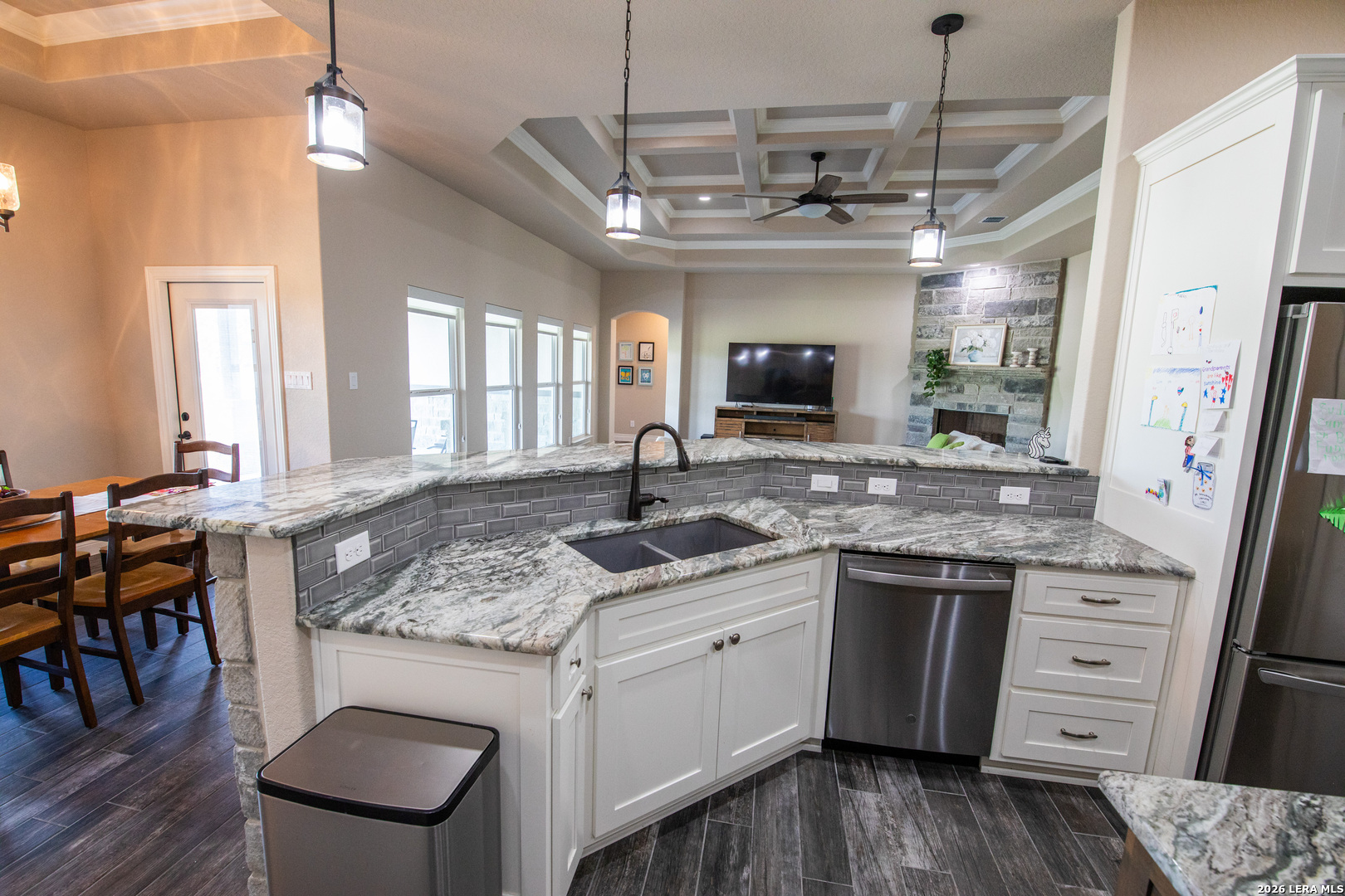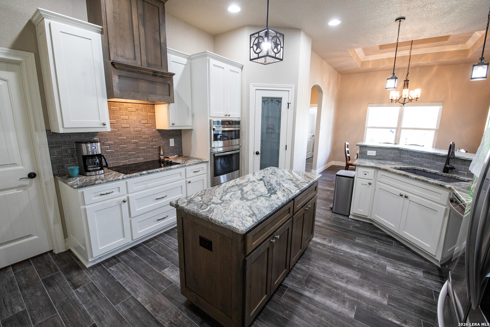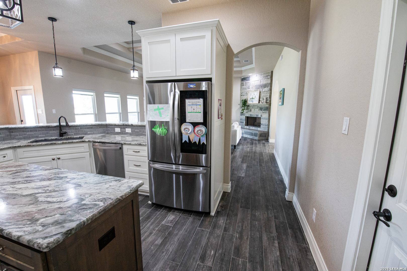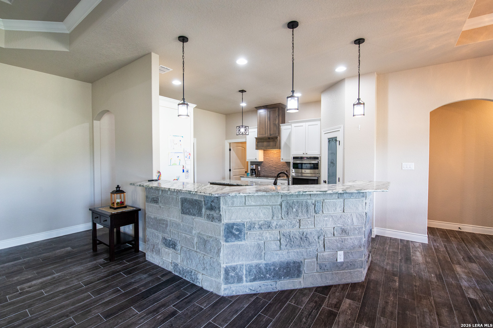 Discover this Lightly-Lived-In, 2021-built Stone & Stucco Home on 1.44 Acres of Texas Countryside in The Settlement neighborhood of La Vernia! The Generous concrete Driveway & Sidewalk allow for Ample Parking and welcome you to the Fashionable Residence. With 4 Bedrooms (one of which is an ideal study/office), 2.5 Baths, and an Open Layout with Beautiful Wood-Tile Floors throughout (easy care, no carpet!) ... this home offers flexibility & ease for your lifestyle. Double French Doors off the entry open to the Study/4th bedroom, with grand windows graced by plantation shutters - and Fiber Internet makes remote work a breeze! In the Living Room, the stone fireplace creates a focal point for gatherings, and abundant windows showcase country views. The Island Kitchen features chic dual-finish cabinetry topped by Gorgeous Granite Counters, with stainless steel GE appliances including a separate cooktop + built-in oven. Journey into the Spacious Master Retreat with Lavish Bath: Double Vanity w/Marble Counter, Soaking Tub set into a Marble Surround + Decorative Tile Accent, Walk-In Shower, and Huge Closet. The secondary bedrooms are likewise roomy, and don't miss the stylish tile around the tub! Chores are a Delight in the sizable Laundry Room with multiple cabinets, granite counter, and space for a 2nd refrigerator! You'll appreciate the efficiency of 2 water heaters. The half-bath opens directly to the back patio - ideal for outdoor activities! Enjoy the pleasant Back Patio as you overlook the private back yard with several Heritage Oaks providing shade & beauty. Schedule to see this exceptional property today!