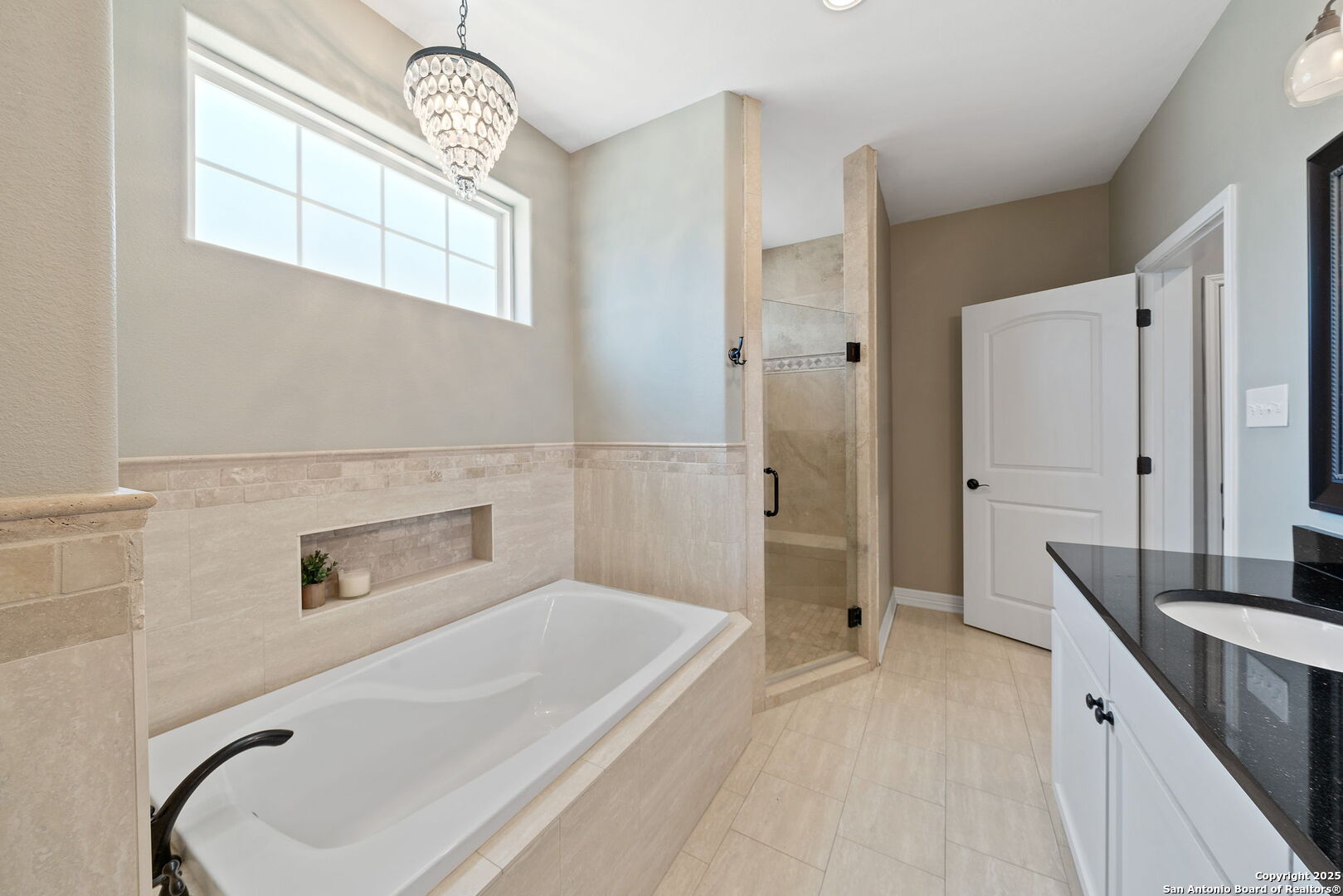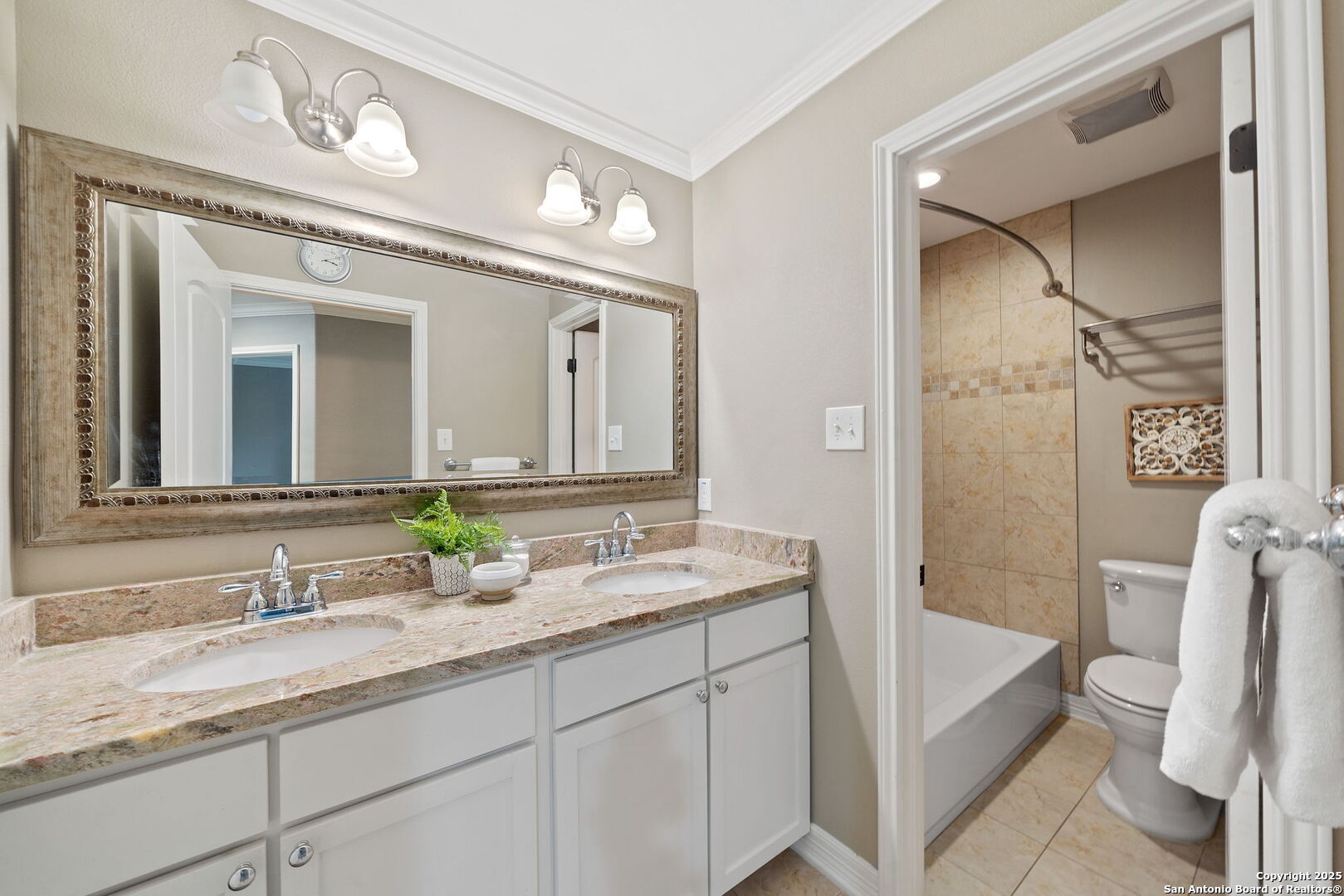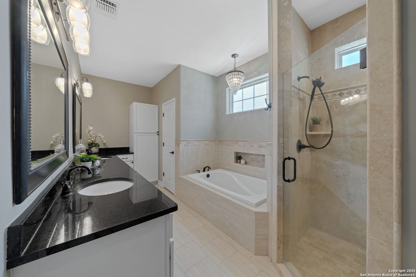 OPEN HOUSE Saturday 6/21 1-4pm!!! Nestled on a stunning, oversized lot with mature trees, this exceptional 4-bedroom, 3.5-bath home offers beauty, space, and functionality in a highly sought-after Northside ISD neighborhood. The open floor plan is perfect for entertaining, with a beautifully updated island kitchen featuring stainless steel appliances and gorgeous granite countertops. The downstairs primary suite is a true retreat, boasting a spa-like bath with a separate garden tub, standing shower, and an expansive double vanity with ample counter space. A second primary suite upstairs adds flexibility for multi-generational living. Secondary bedrooms are generously sized, and the secondary bath also features a double vanity for added convenience. Enjoy serene outdoor spaces, abundant natural light, and the perfect blend of comfort and elegance. Additional highlights include a durable metal roof and a whole-home generator for peace of mind, not to mention 9 places to park vehicles. This rare gem offers both style and practicality- Don't miss this rare opportunity-schedule your showing today!