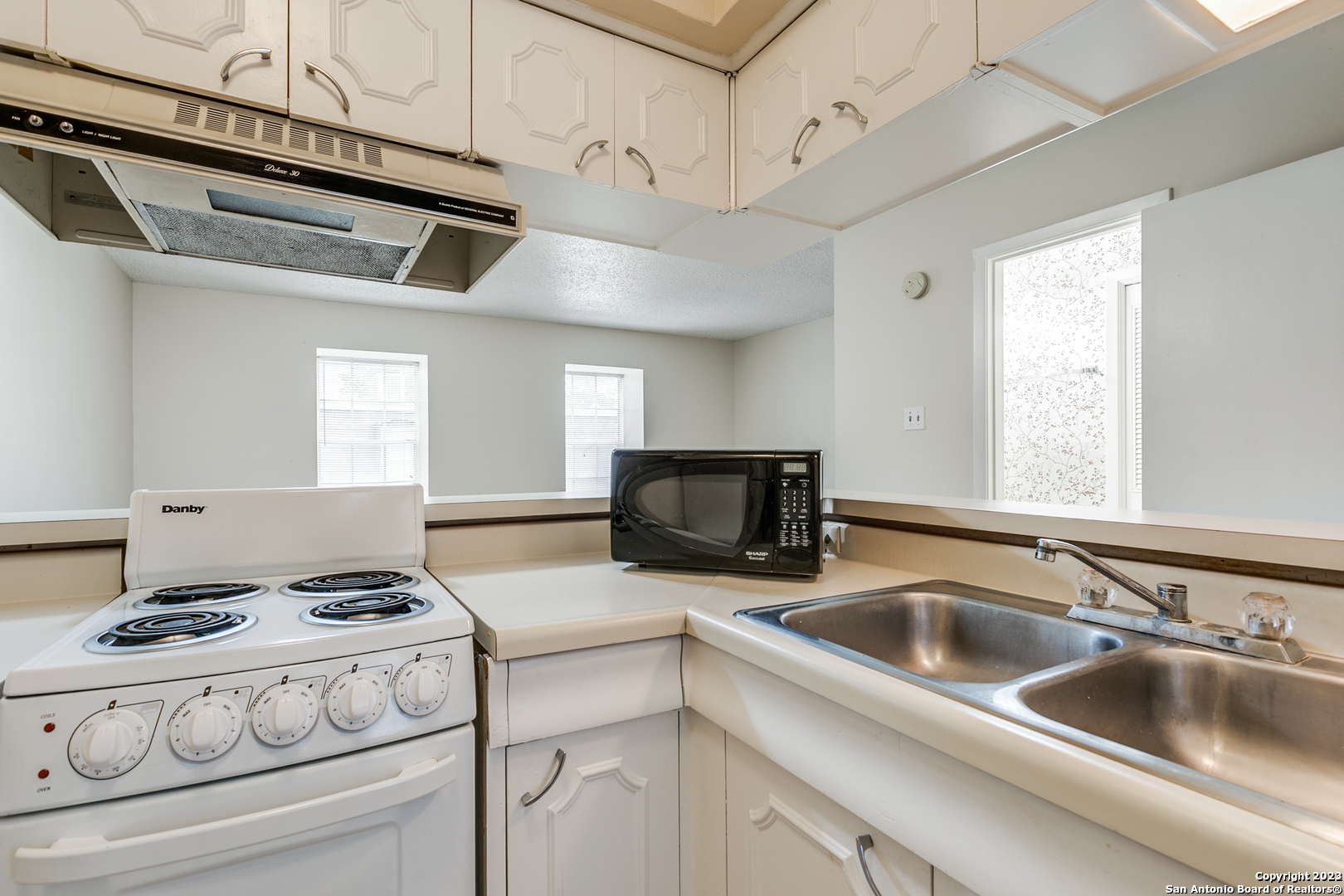 This bright studio condo in a prime location offers everything you need for comfortable city living. The well-equipped kitchen includes a range, refrigerator, microwave, and a breakfast bar that opens to the cozy living area, perfect for relaxed meals or entertaining. Large windows fill the space with natural light and provide serene views of the community pool. Residents enjoy access to the clubhouse, on-site laundry, and the convenience of a covered parking spot just below the unit. Ideally situated near local restaurants, Trinity University, a grocery store, and popular attractions like the San Antonio Zoo, Japanese Tea Garden, and Brackenridge Park, this condo makes it easy to experience the best of the city right outside your door.