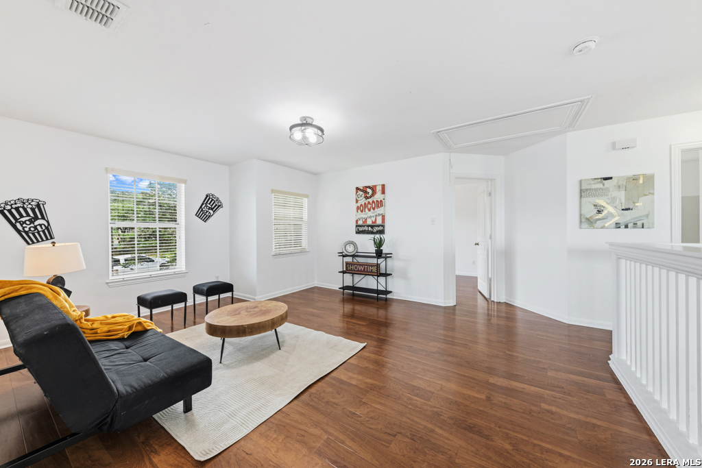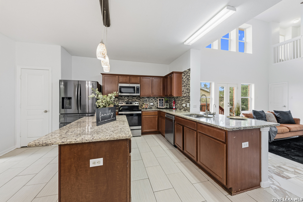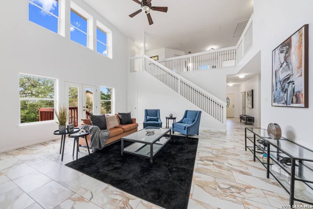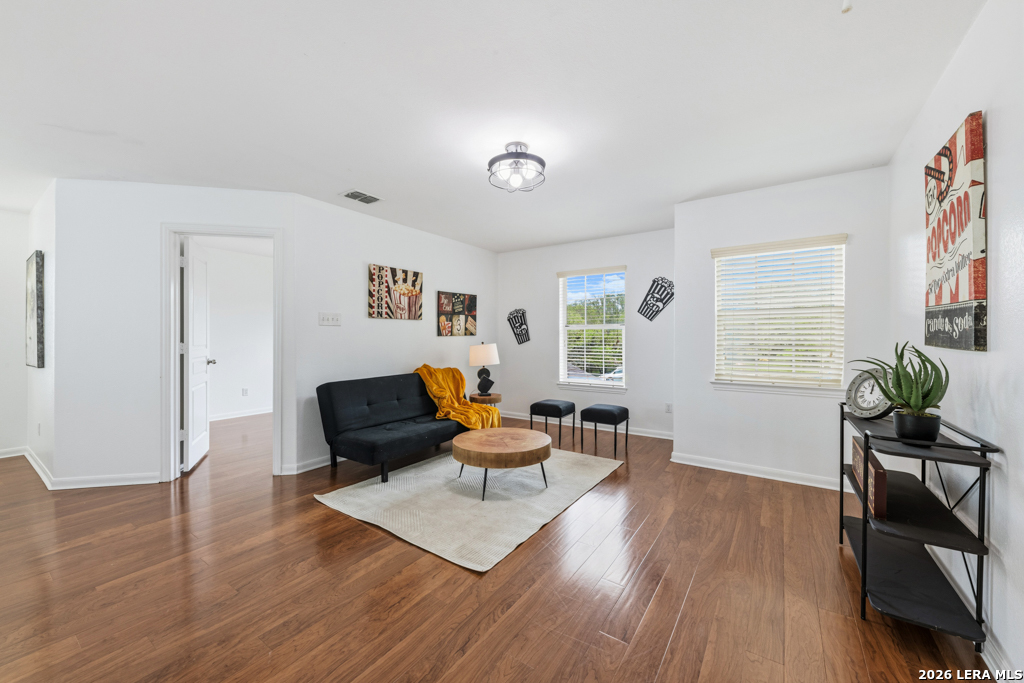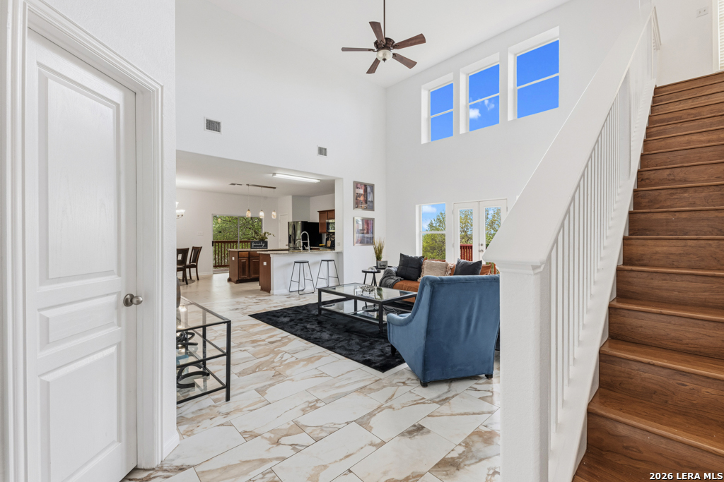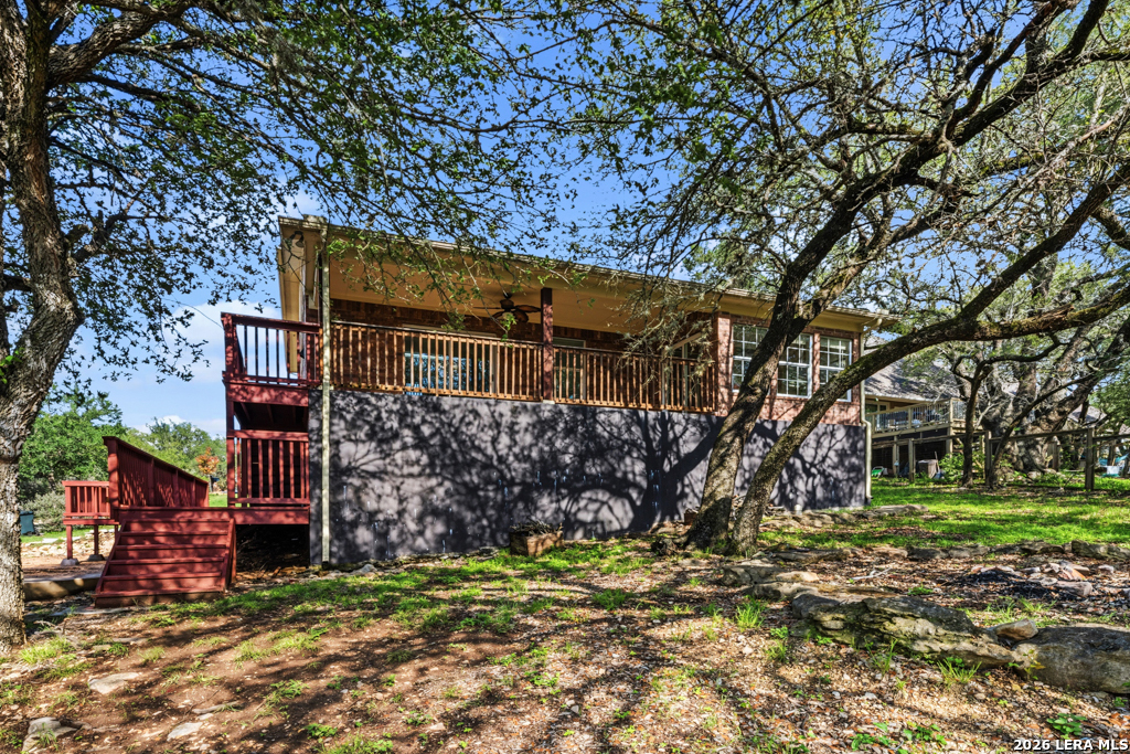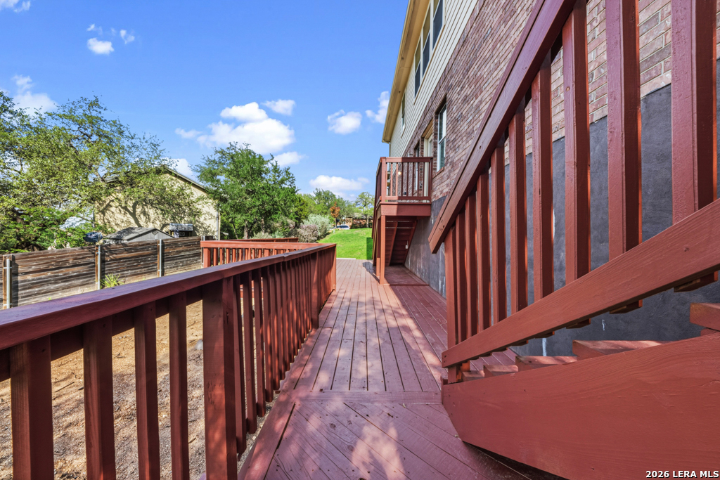 Welcome to this beautifully maintained two-story home nestled in a desirable community in San Marcos, TX. This spacious residence features an open-concept floor plan with soaring ceilings and abundant natural light, creating an inviting and airy atmosphere throughout. The main living area seamlessly flows into a well-appointed kitchen complete with granite countertops, ample cabinetry, and a large center island-perfect for entertaining and everyday living. A dedicated dining area overlooks the backyard, offering a peaceful setting for meals and gatherings. The primary suite provides a comfortable retreat with generous space, while additional bedrooms offer flexibility for guests, home office, or growing households. Enjoy the convenience of multiple living areas, including an upstairs loft overlooking the main floor. Step outside to a covered balcony and extended deck, ideal for relaxing or hosting while taking in the natural surroundings and mature trees. Located just minutes from shopping, dining, and entertainment, and with easy access to major highways including I-35, this home offers both comfort and convenience. Situated near Texas State University, making it an excellent option for a variety of lifestyles. Don't miss this opportunity to own a well-designed home in the heart of San Marcos!
