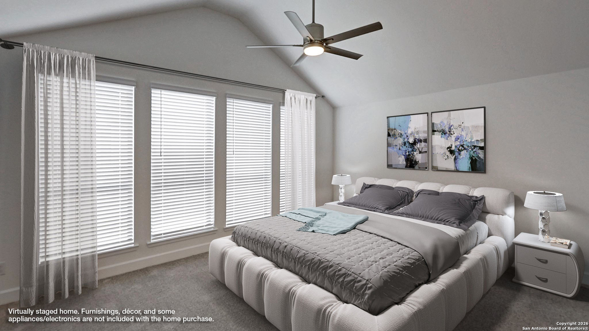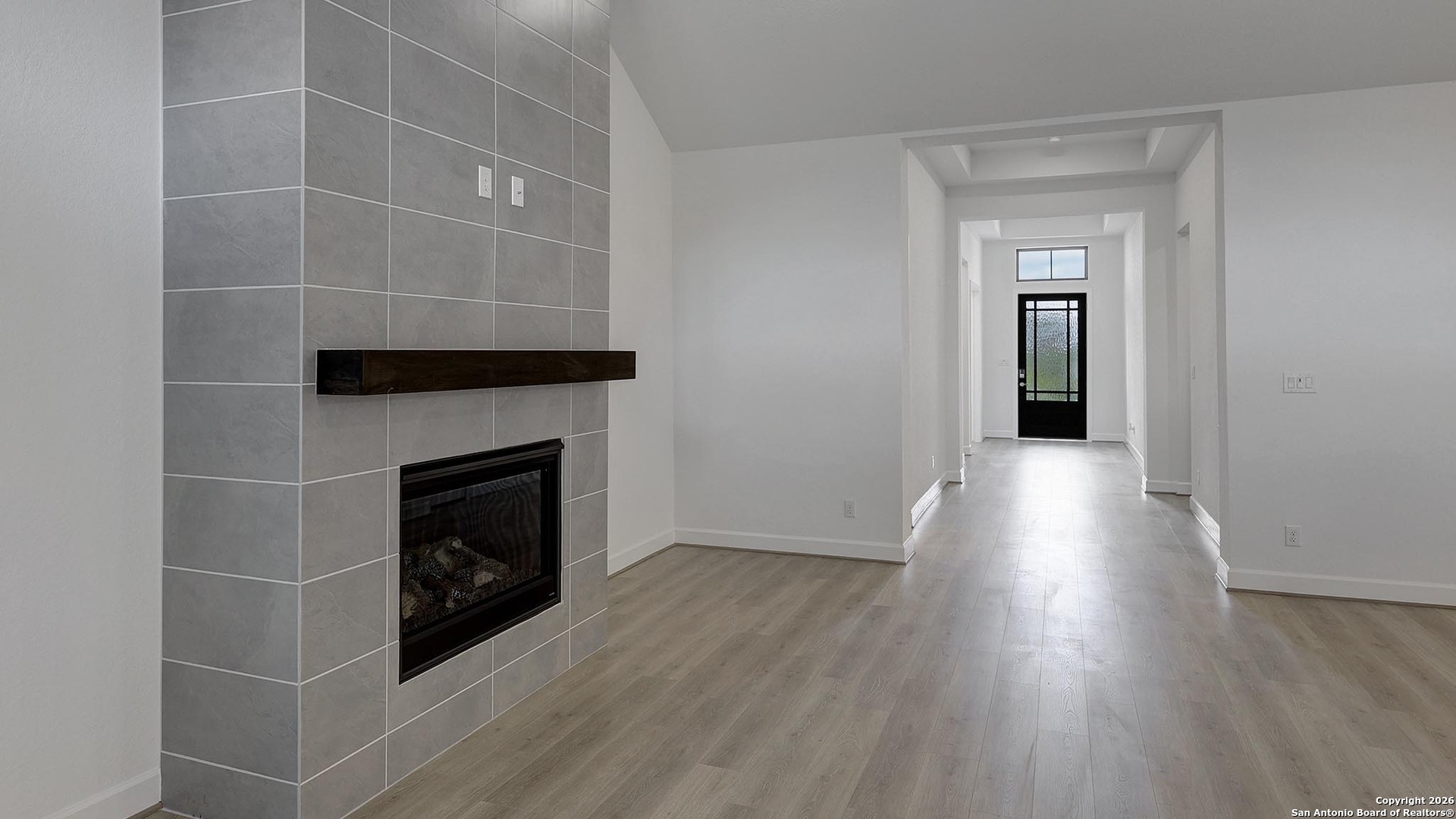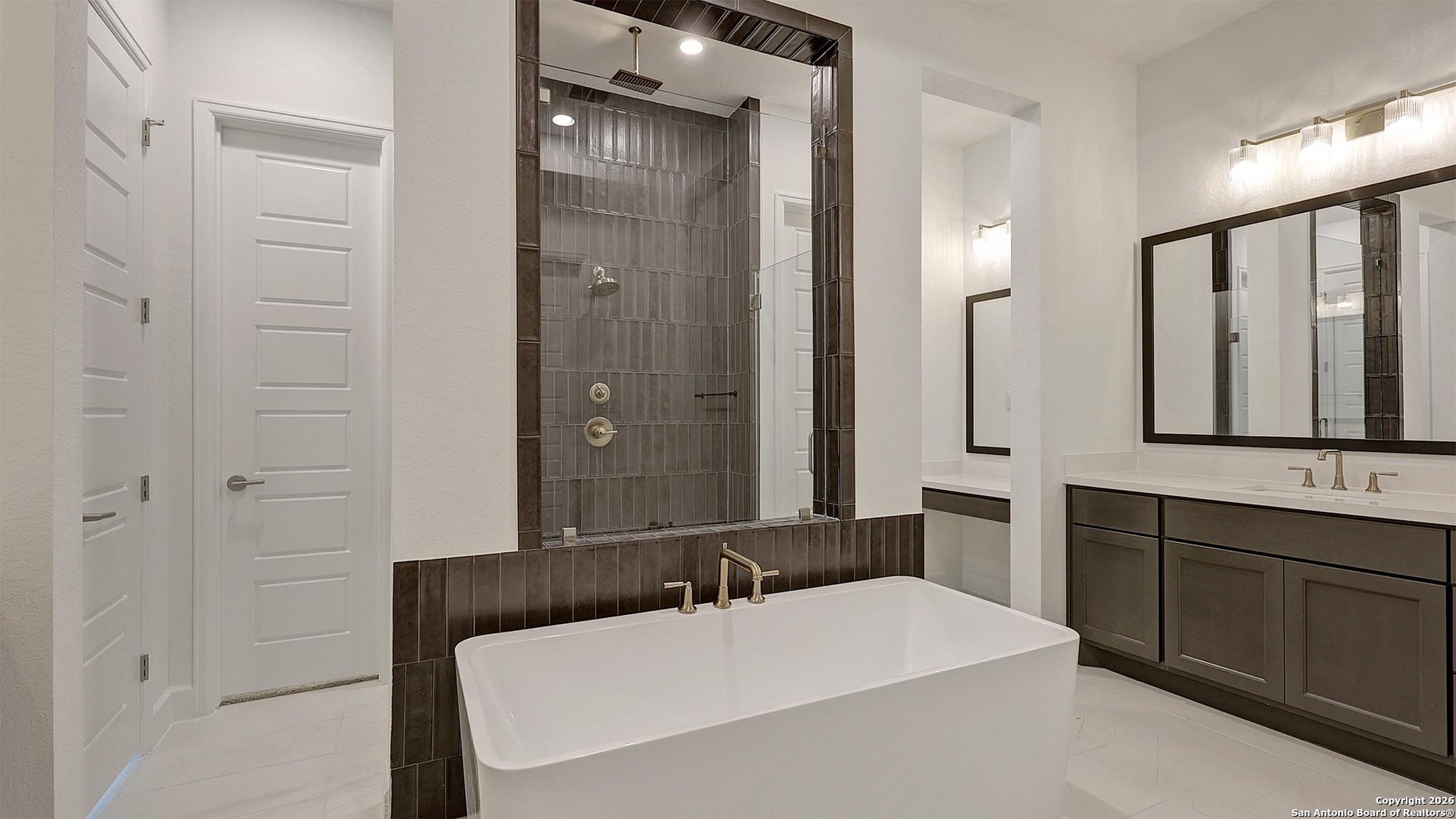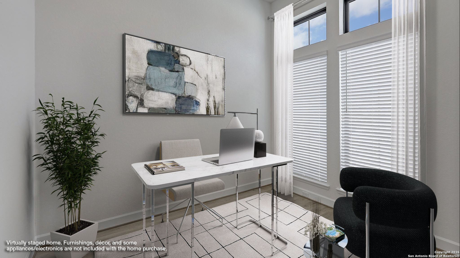 Home office with French doors set at entry with 12-foot ceiling. Extended entry leads to open family room, dining area and kitchen with 16-foot ceilings throughout. Family room features fireplace and wall of windows. Kitchen features walk-in pantry, generous counter space and oversized island with built-in seating space. Game room with wall of windows just off dining area. Primary suite includes bedroom with wall of windows. Primary bath features 11-foot ceiling, dual vanities, garden tub, separate glass-enclosed shower and two walk-in closets. A Hollywood bath adds to this spacious four-bedroom home. Covered backyard patio with 16-foot ceiling. Mud room off three car-garage.