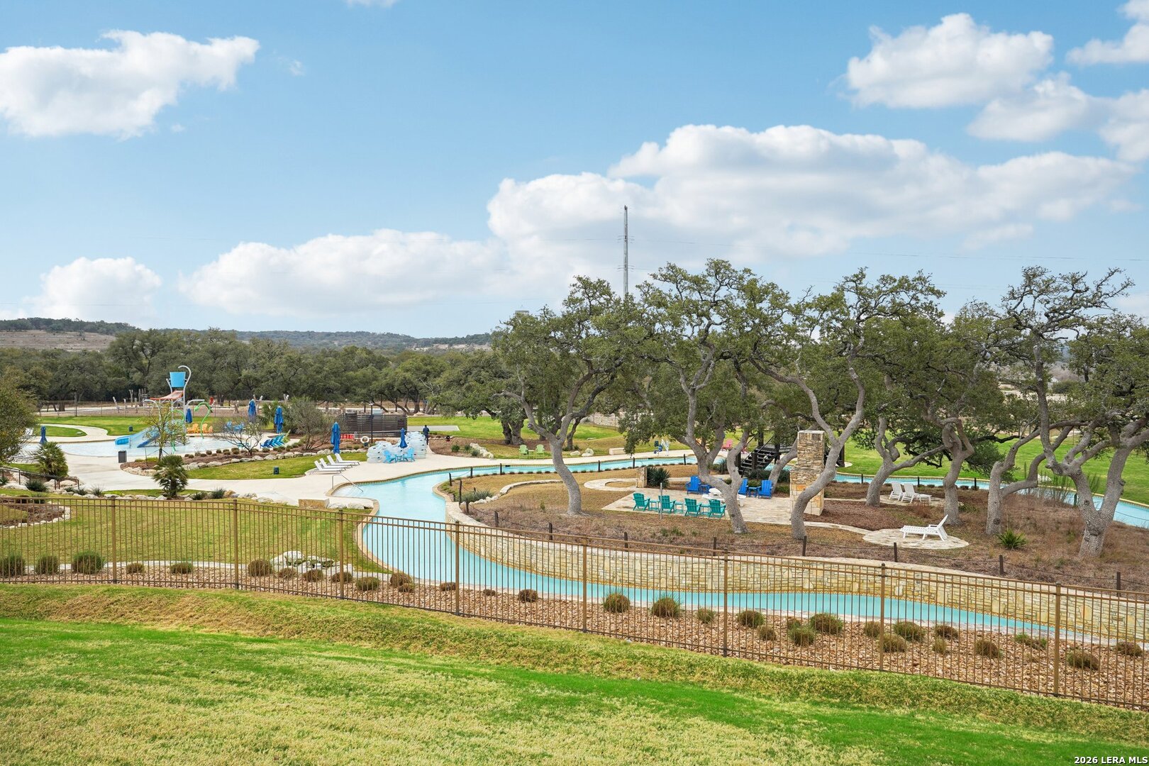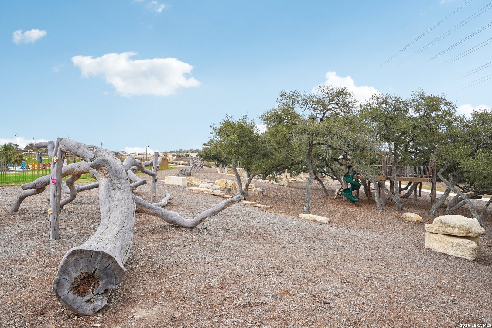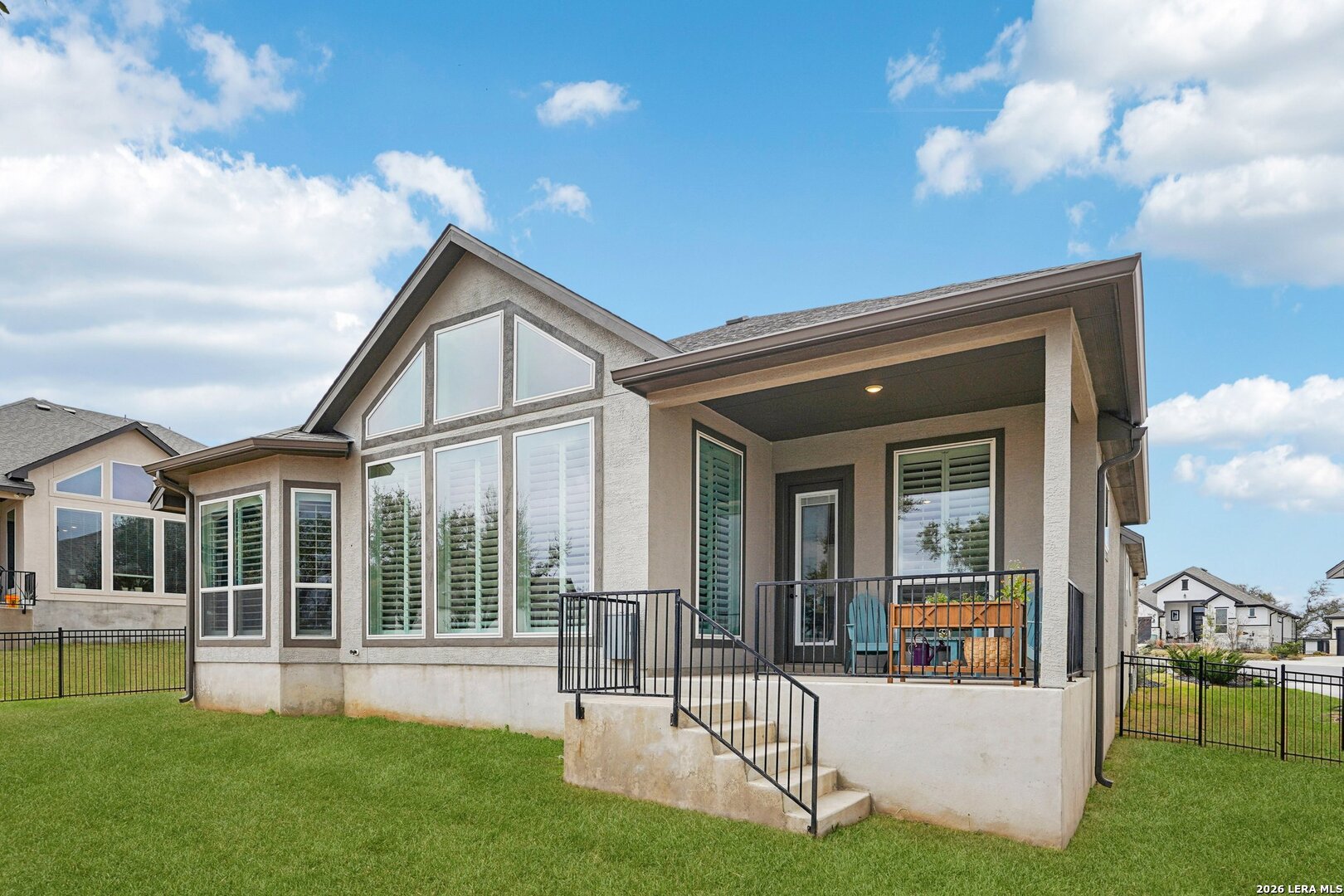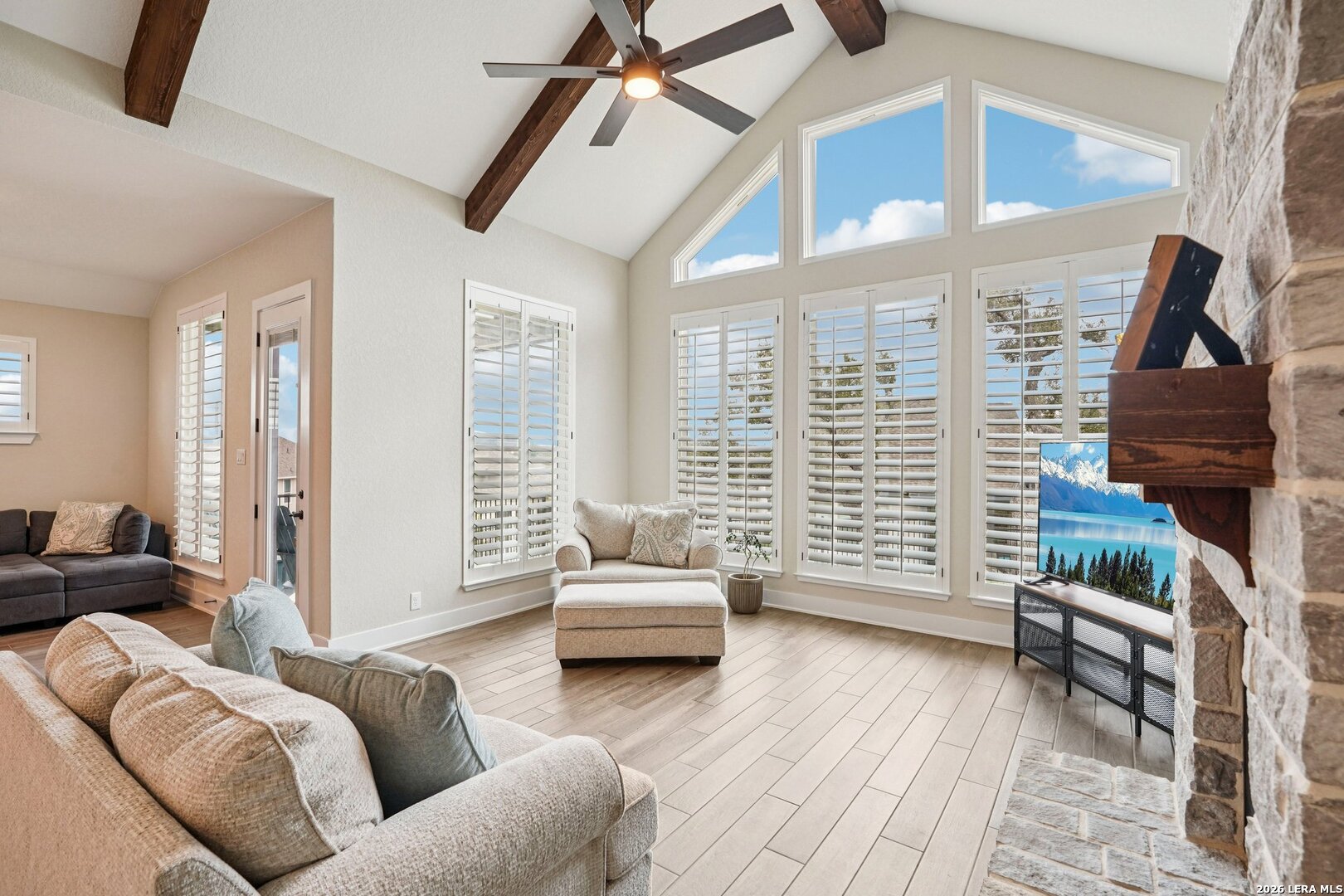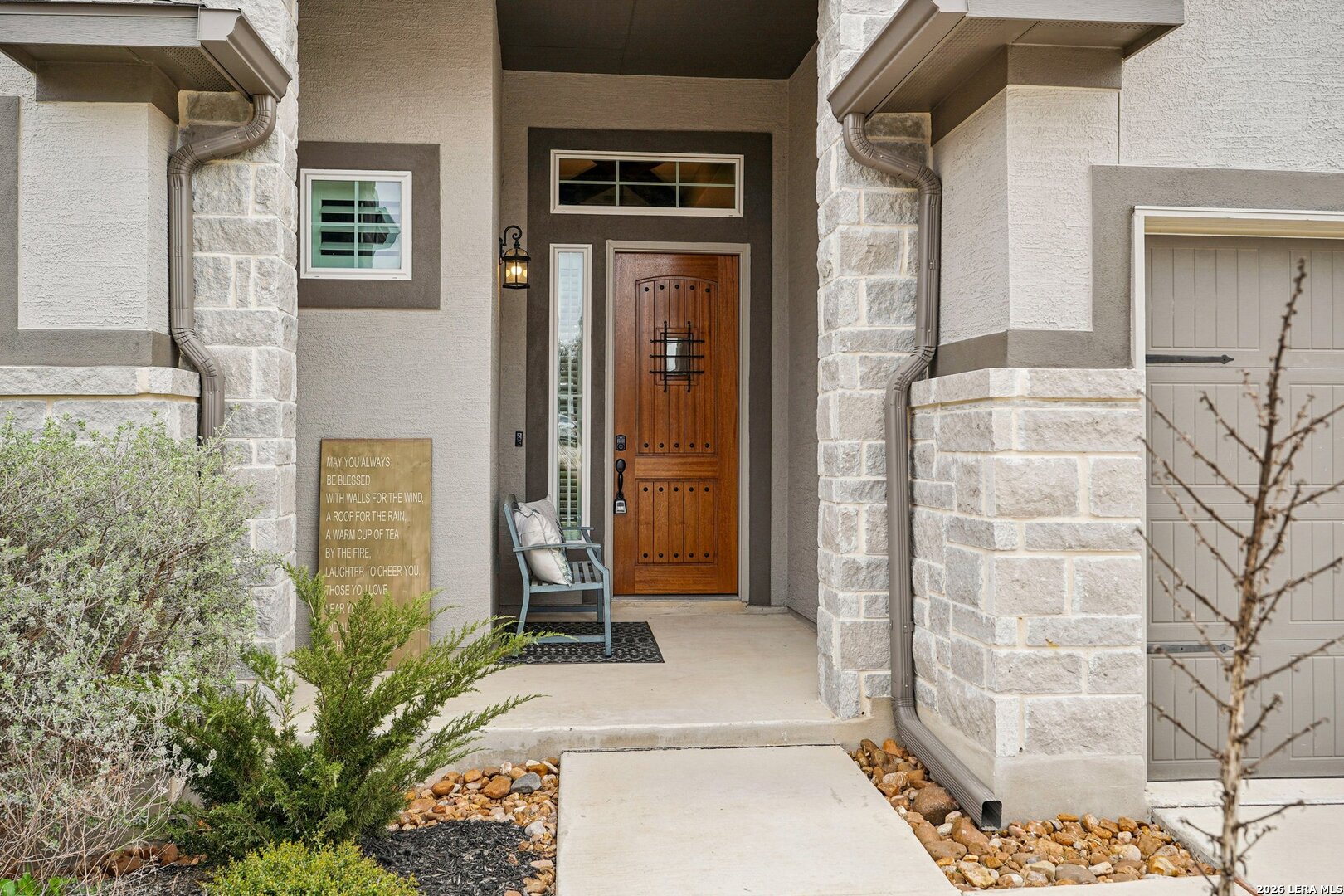 Located on an upgraded cul-de-sac lot in the desirable Esperanza community, this well-appointed one-story home offers 4 bedrooms, 2.5 bathrooms, and a spacious floor plan. The interior features ceramic wood-look flooring, custom wood beams in the foyer and living area, and a comfortable living room anchored by a stone fireplace. The island kitchen is designed with white cabinetry, stainless steel appliances, generous cabinet storage, and includes a built-in wine fridge. The primary suite has bay windows and a recessed ceiling. It includes a spacious closet and an en-suite bath with dual vanities and a large, tiled shower. Each bedroom is equipped with ceiling fans, and the laundry room includes additional cabinetry for extra storage. Step outside to a spacious backyard that's well suited for entertaining or relaxing, with pre-wiring already in place for a hot tub. Plantation shutters and other thoughtful upgrades add to the home's appeal. Residents enjoy access to Esperanza's resort-style amenities, including a pool with a lazy river, parks, and highly regarded Boerne ISD schools. The neighborhood offers a lively community atmosphere and convenient access to nearby state parks.