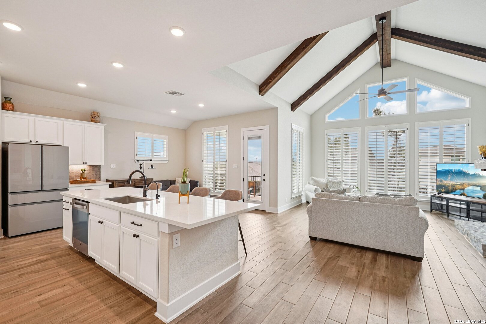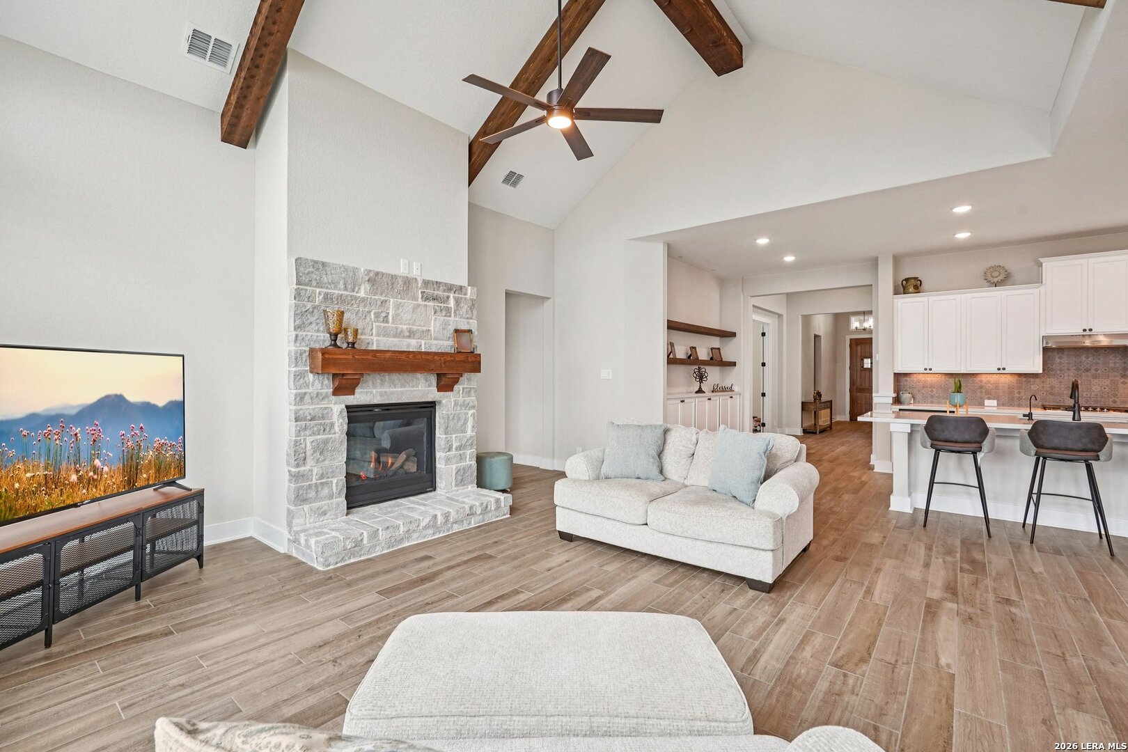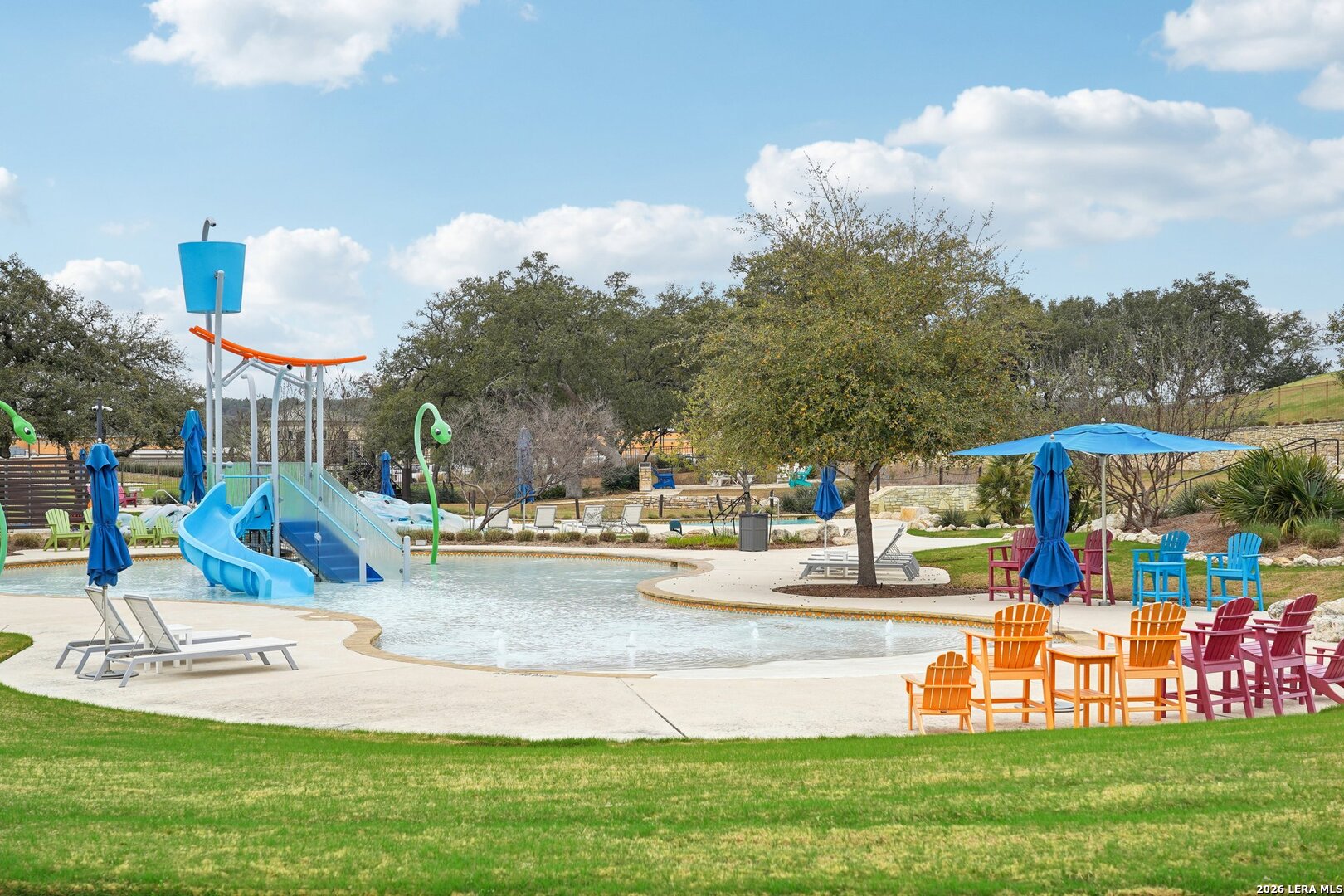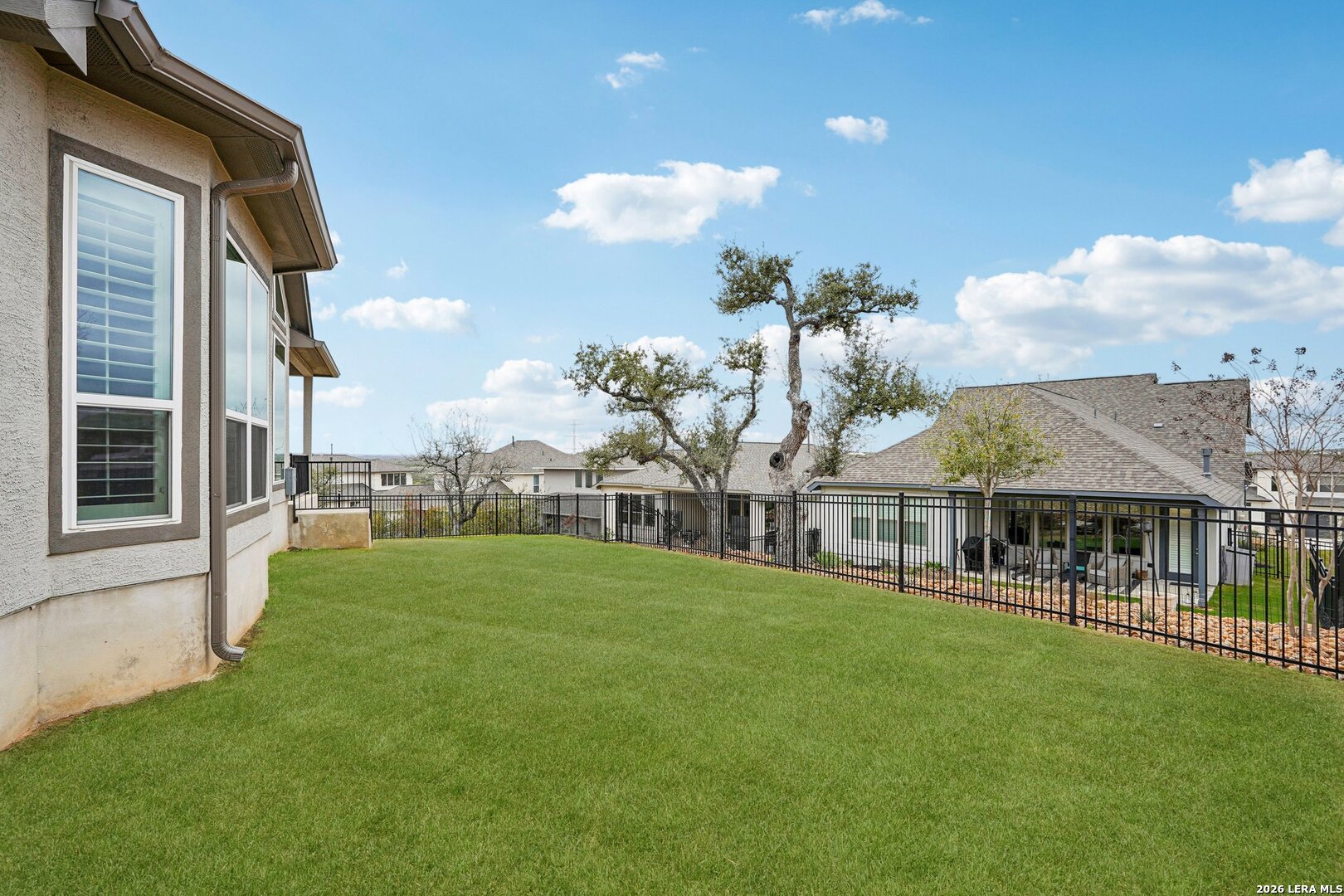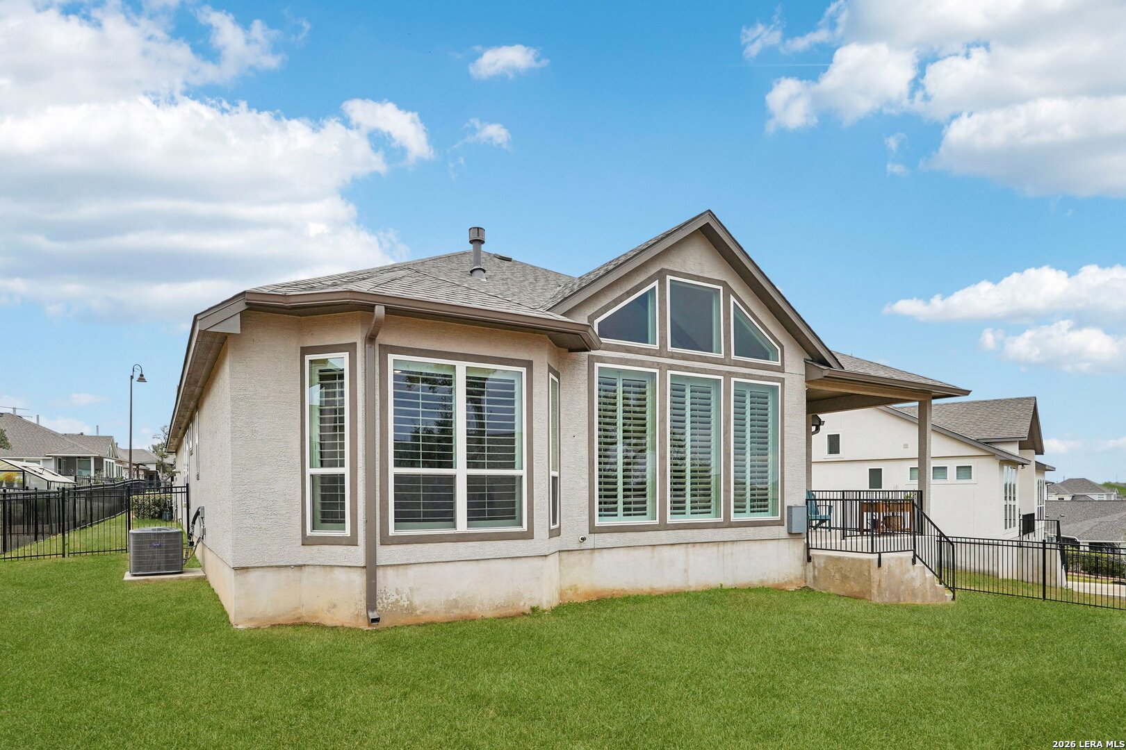 Located on an upgraded cul-de-sac lot in the desirable Esperanza community, this well-appointed one-story home offers 4 bedrooms, 2.5 bathrooms, and a spacious floor plan. The interior features ceramic wood-look flooring, custom wood beams in the foyer and living area, and a comfortable living room anchored by a stone fireplace. The island kitchen is designed with white cabinetry, stainless steel appliances, generous cabinet storage, and includes a built-in wine fridge. The primary suite has bay windows and a recessed ceiling. It includes a spacious closet and an en-suite bath with dual vanities and a large, tiled shower. Each bedroom is equipped with ceiling fans, and the laundry room includes additional cabinetry for extra storage. Step outside to a spacious backyard that's well suited for entertaining or relaxing, with pre-wiring already in place for a hot tub. Plantation shutters and other thoughtful upgrades add to the home's appeal. Residents enjoy access to Esperanza's resort-style amenities, including a pool with a lazy river, parks, and highly regarded Boerne ISD schools. The neighborhood offers a lively community atmosphere and convenient access to nearby state parks.