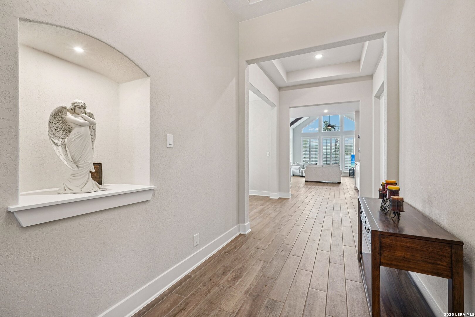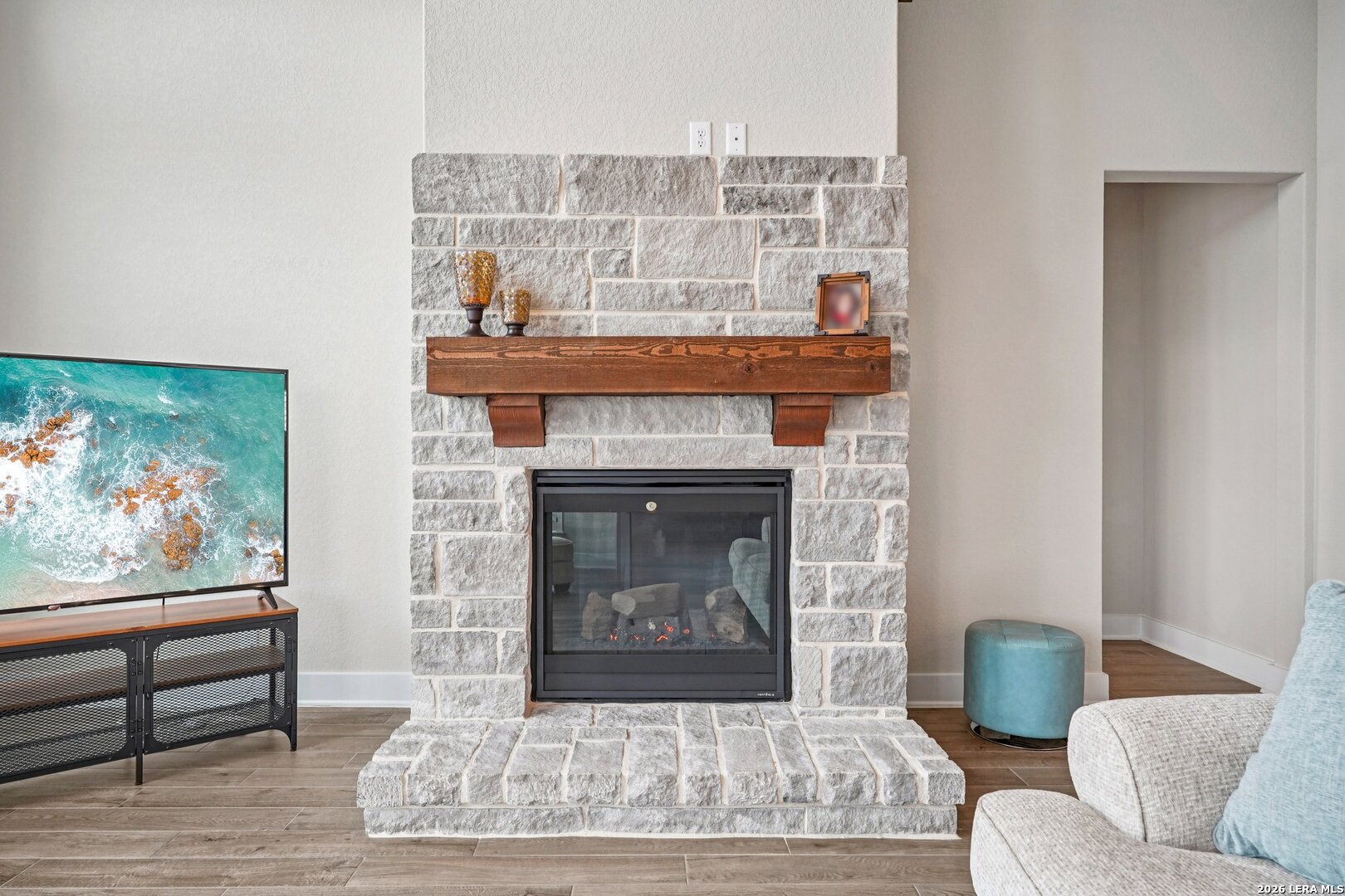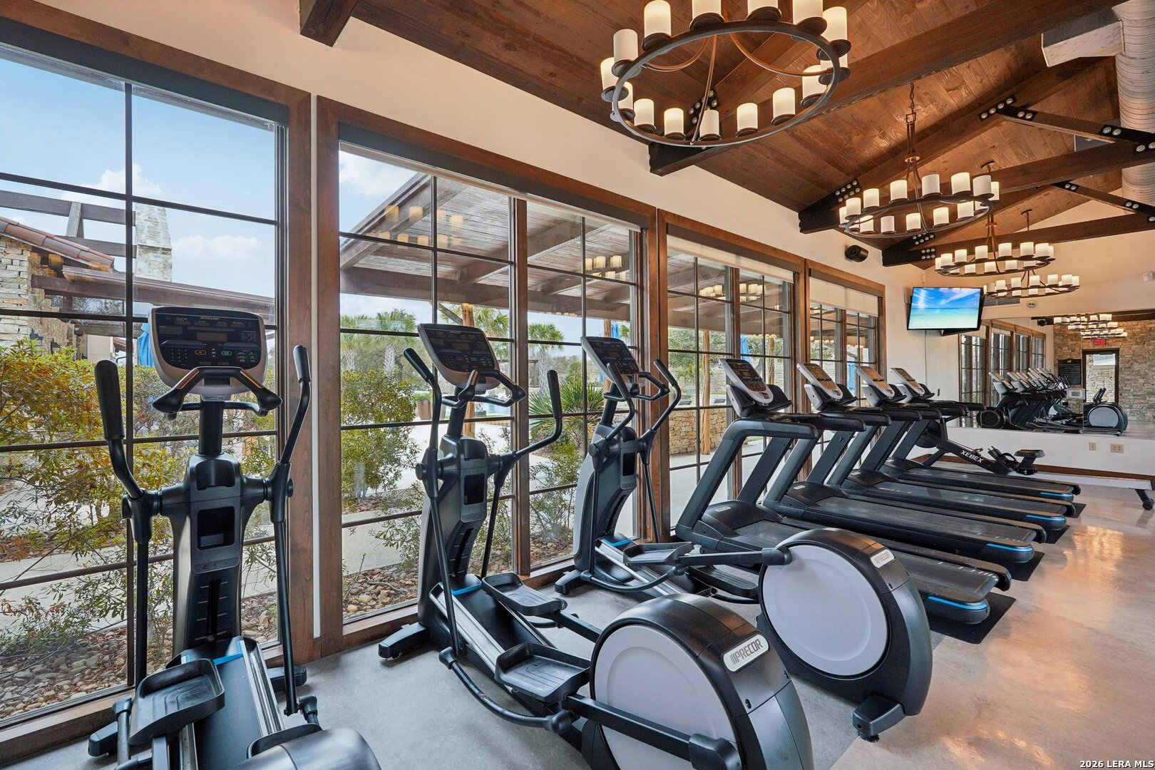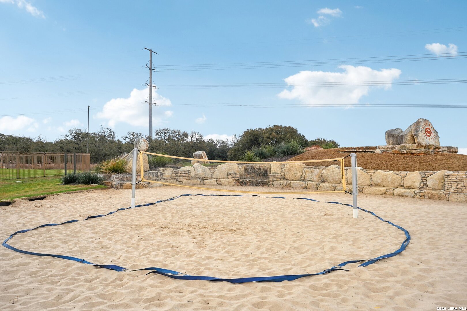 Located on an upgraded cul-de-sac lot in the desirable Esperanza community, this well-appointed one-story home offers 4 bedrooms, 2.5 bathrooms, and a spacious floor plan. The interior features ceramic wood-look flooring, custom wood beams in the foyer and living area, and a comfortable living room anchored by a stone fireplace. The island kitchen is designed with white cabinetry, stainless steel appliances, generous cabinet storage, and includes a built-in wine fridge. The primary suite has bay windows and a recessed ceiling. It includes a spacious closet and an en-suite bath with dual vanities and a large, tiled shower. Each bedroom is equipped with ceiling fans, and the laundry room includes additional cabinetry for extra storage. Step outside to a spacious backyard that's well suited for entertaining or relaxing, with pre-wiring already in place for a hot tub. Plantation shutters and other thoughtful upgrades add to the home's appeal. Residents enjoy access to Esperanza's resort-style amenities, including a pool with a lazy river, parks, and highly regarded Boerne ISD schools. The neighborhood offers a lively community atmosphere and convenient access to nearby state parks.