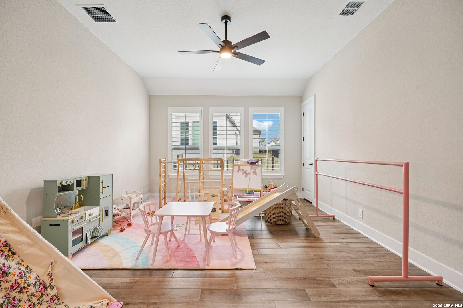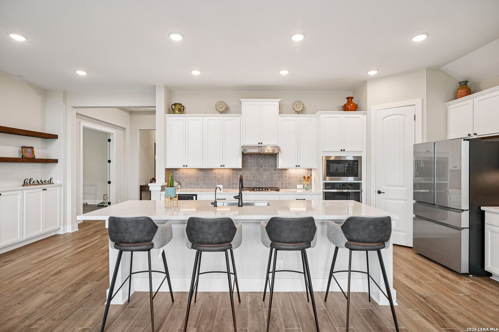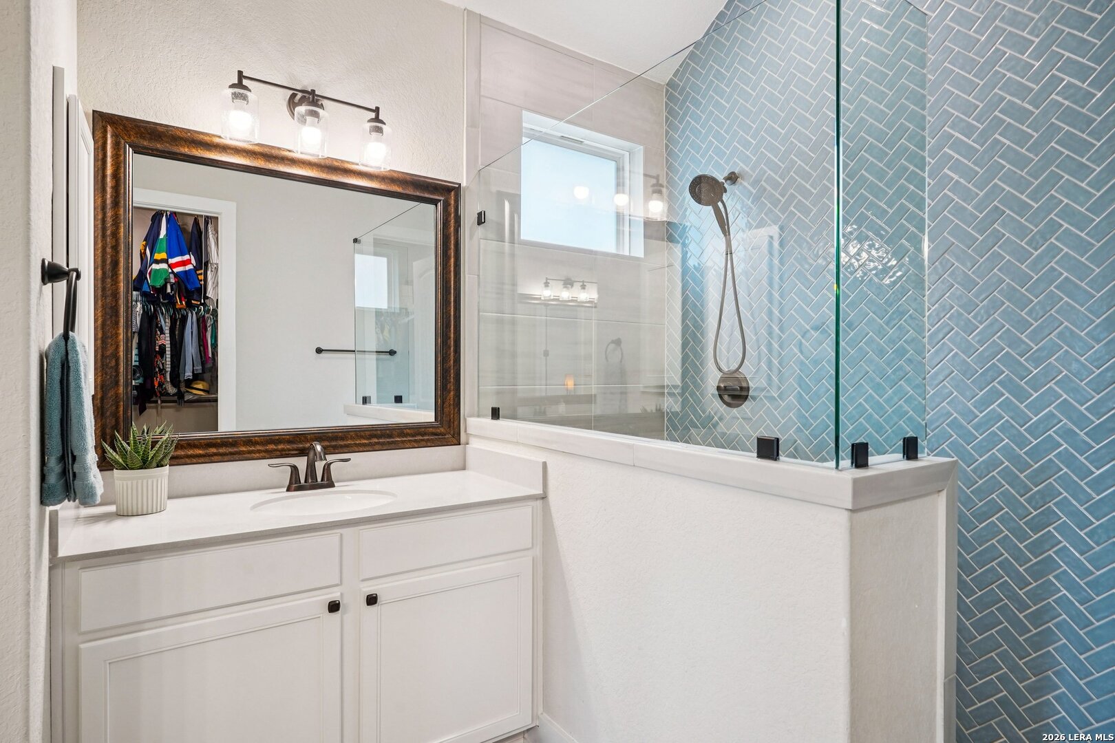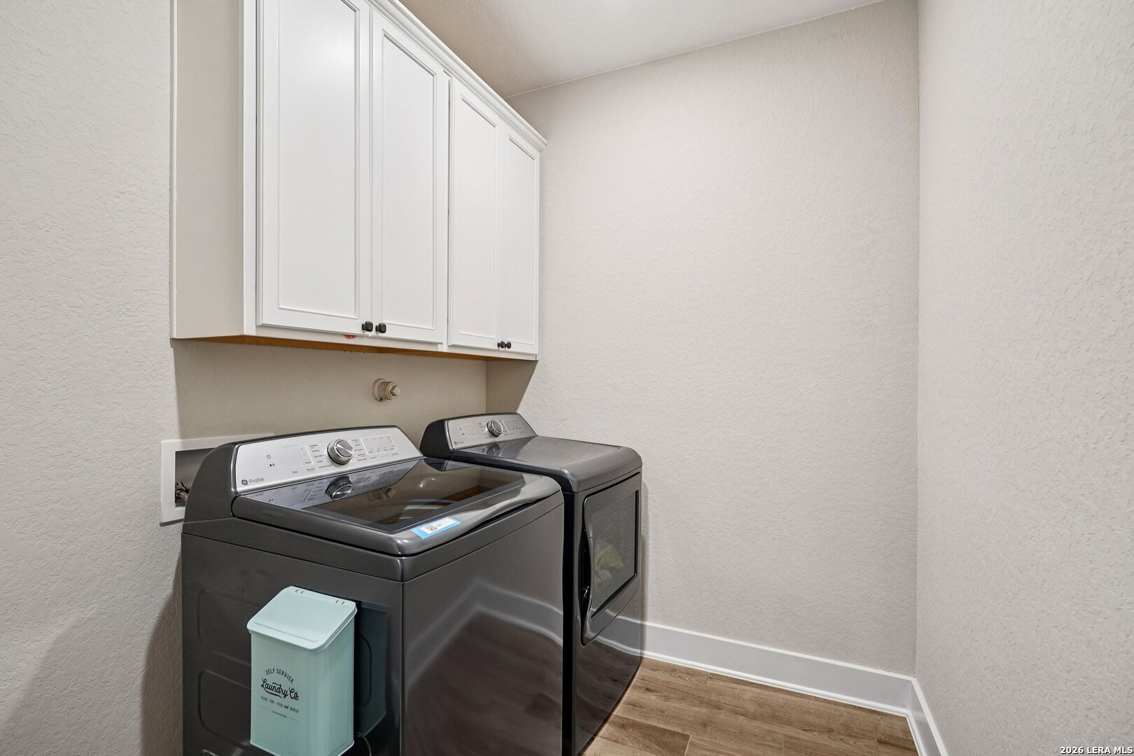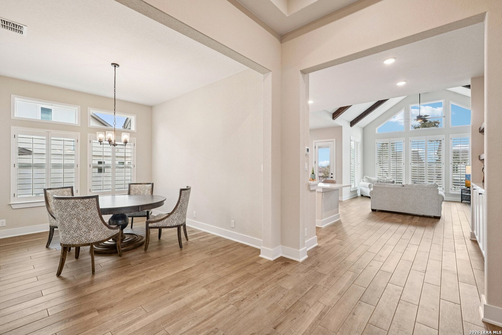 Located on an upgraded cul-de-sac lot in the desirable Esperanza community, this well-appointed one-story home offers 4 bedrooms, 2.5 bathrooms, and a spacious floor plan. The interior features ceramic wood-look flooring, custom wood beams in the foyer and living area, and a comfortable living room anchored by a stone fireplace. The island kitchen is designed with white cabinetry, stainless steel appliances, generous cabinet storage, and includes a built-in wine fridge. The primary suite has bay windows and a recessed ceiling. It includes a spacious closet and an en-suite bath with dual vanities and a large, tiled shower. Each bedroom is equipped with ceiling fans, and the laundry room includes additional cabinetry for extra storage. Step outside to a spacious backyard that's well suited for entertaining or relaxing, with pre-wiring already in place for a hot tub. Plantation shutters and other thoughtful upgrades add to the home's appeal. Residents enjoy access to Esperanza's resort-style amenities, including a pool with a lazy river, parks, and highly regarded Boerne ISD schools. The neighborhood offers a lively community atmosphere and convenient access to nearby state parks.