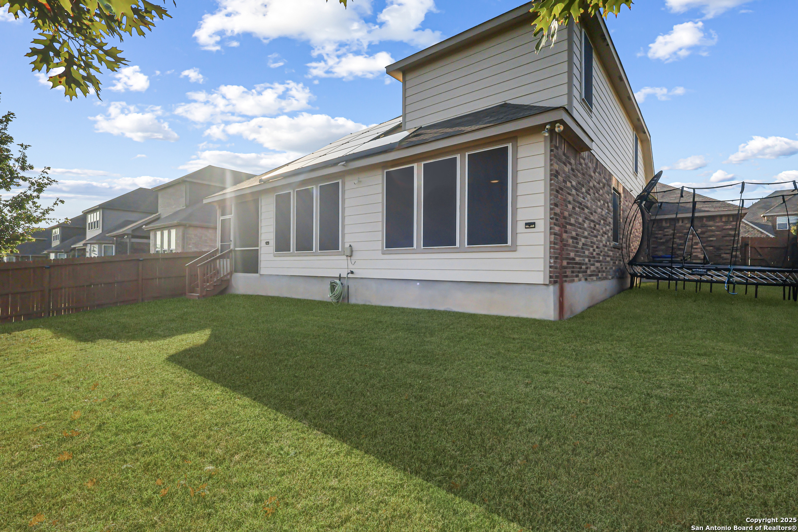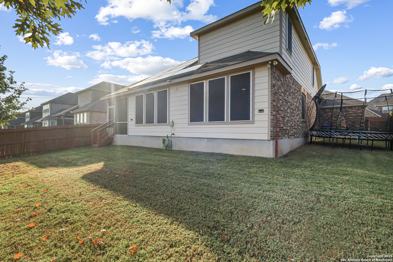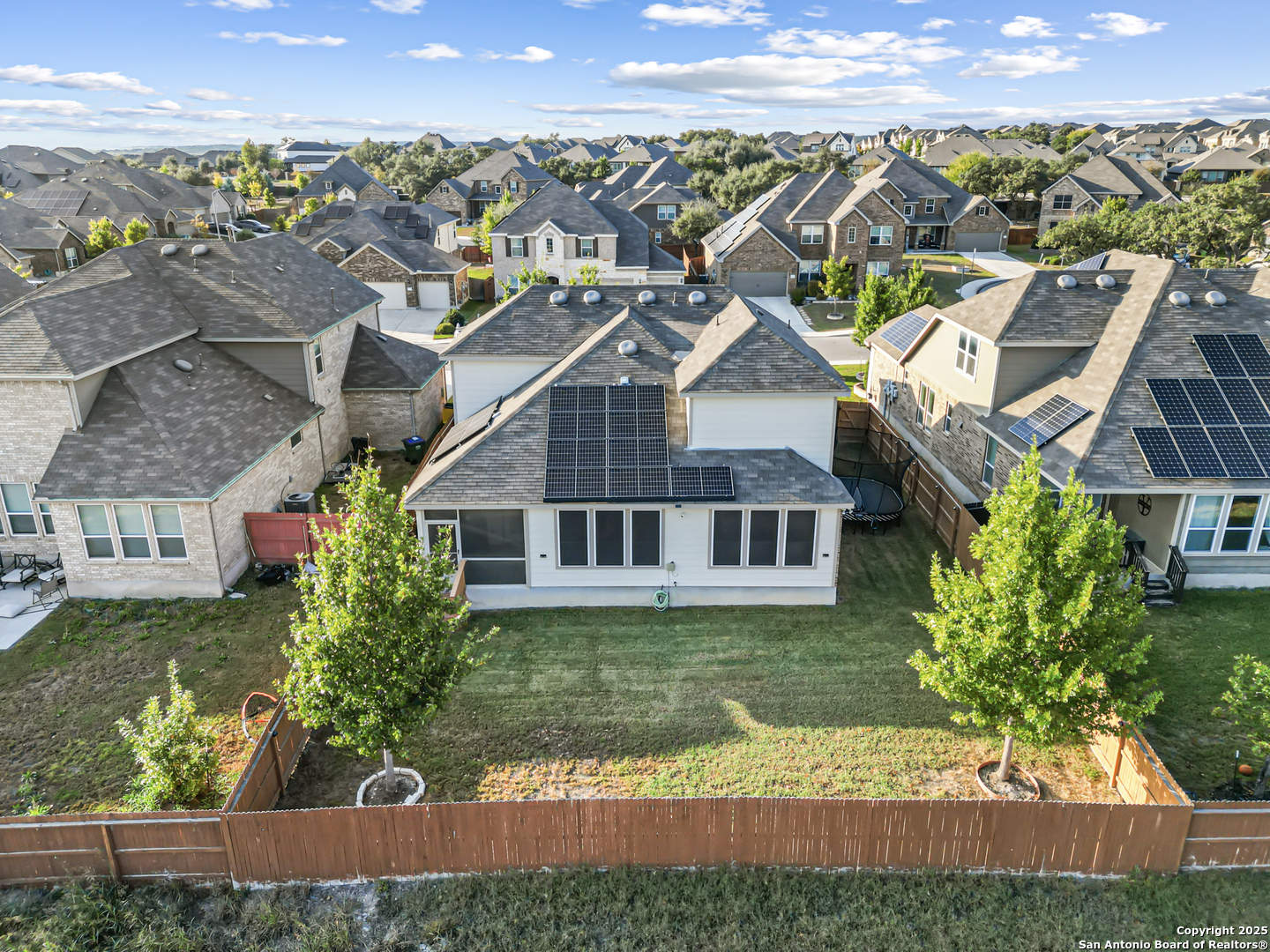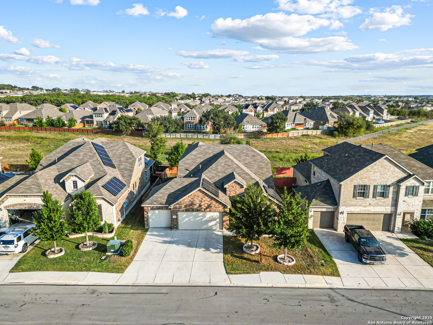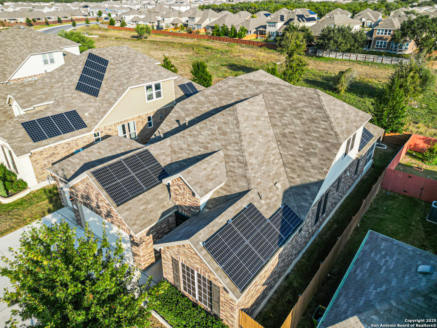This exceptional four-bedroom, three-bathroom home offers just over 2,900 square feet of thoughtfully designed living space in one of Bexar Counties most desirable neighborhoods. Situated in a community that perfectly balances suburban tranquility with convenient access to the city's premier attractions, this residence presents an outstanding opportunity for discerning buyers seeking both comfort and investment value. The heart of this home features a spacious kitchen anchored by a large island that serves as both a culinary workspace and natural gathering point for meals and entertaining. The open layout flows seamlessly throughout the main living areas, creating an inviting atmosphere that accommodates both daily life and special occasions. Natural light fills the interior spaces, enhanced by solar screens installed on all windows that provide energy efficiency while maintaining the home's bright, welcoming ambiance. One of the most compelling aspects of this property is its commitment to sustainable living and modern technology. The home includes owned solar panels paired with a Tesla battery wall system, offering significant energy savings and environmental benefits. Additionally, an owned water softener and filtration system ensures clean, quality water throughout the residence. These features not only reduce monthly utility costs but also represent a forward-thinking approach to homeownership that many buyers increasingly value. The primary bedroom provides a private retreat with ample space and storage, while three additional bedrooms offer flexibility with one secondary room on main level in addition to the separate dining area and office/study with French doors. Perhaps the most remarkable feature of this property is its exceptional outdoor space and natural setting. The backyard directly borders a greenbelt, creating an unusual level of privacy and tranquility rarely found in suburban settings. This natural buffer provides a sense of seclusion while offering potential wildlife viewing opportunities right from your back windows. The property also features a covered patio area, perfect for outdoor dining and relaxation, along with an enclosed front entrance that adds both curb appeal and practical protection from the elements. The neighborhood itself is conveniently located near government canyon state park. This proximity to protected natural areas ensures that the peaceful, park-like atmosphere surrounding the home will be preserved for years to come. Residents enjoy easy access to hiking trails, nature programs, and outdoor recreation opportunities that make this area particularly attractive to families and outdoor enthusiasts. For entertainment and recreation, this location truly excels. World-class attractions including SeaWorld, Six Flags, La Cantera shopping and dining district, and downtown San Antonio are all easily accessible, offering endless options for family fun, cultural experiences, and urban amenities.