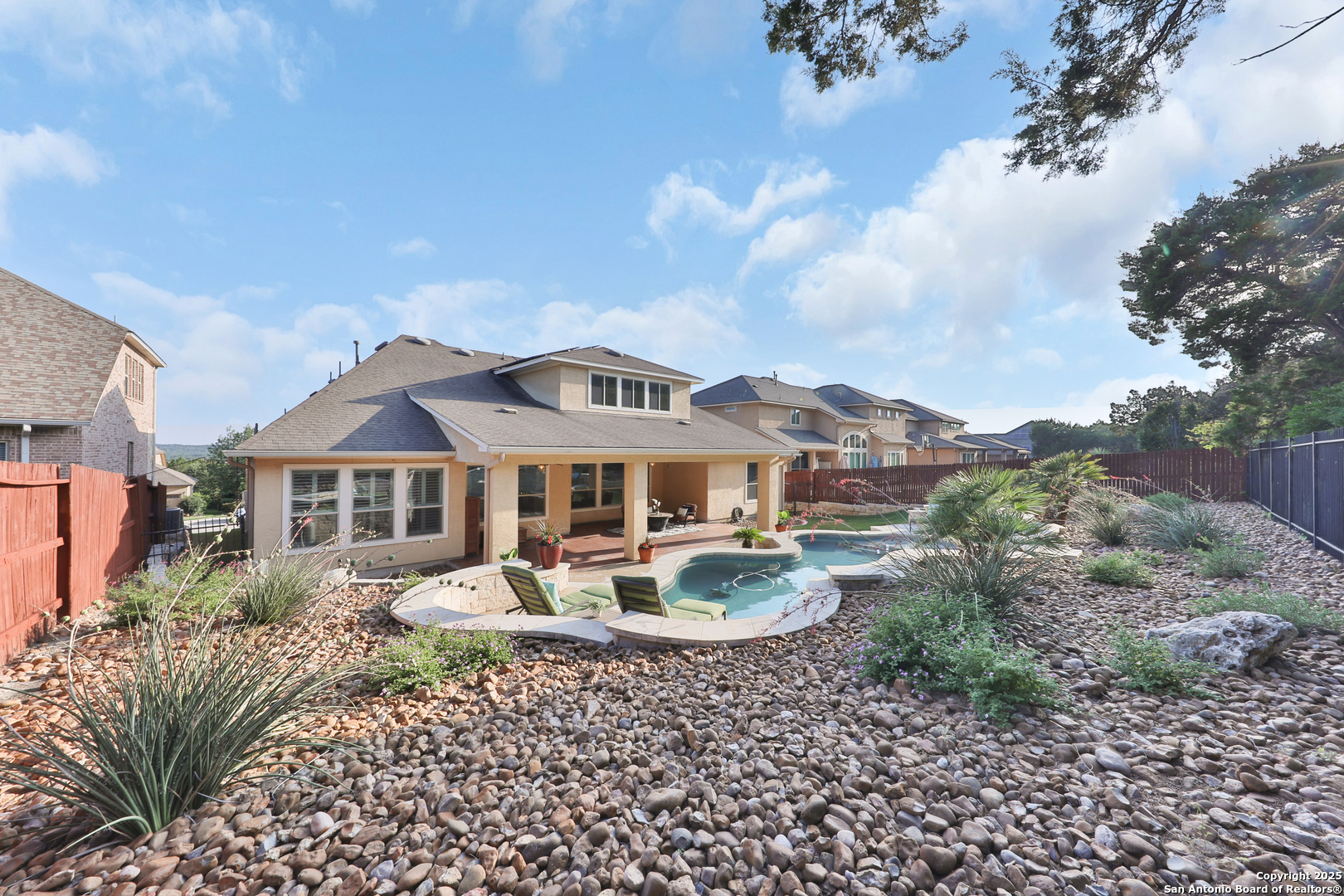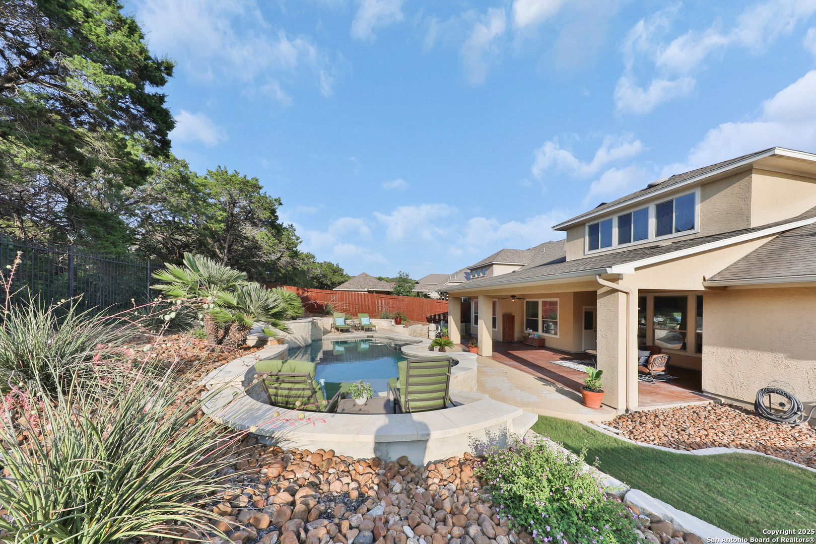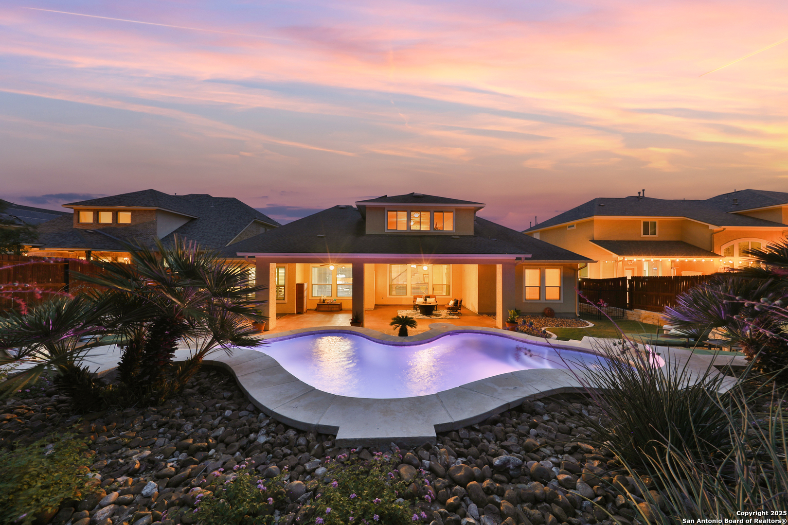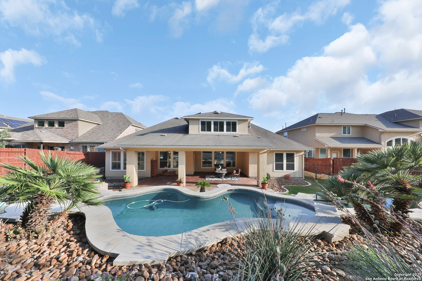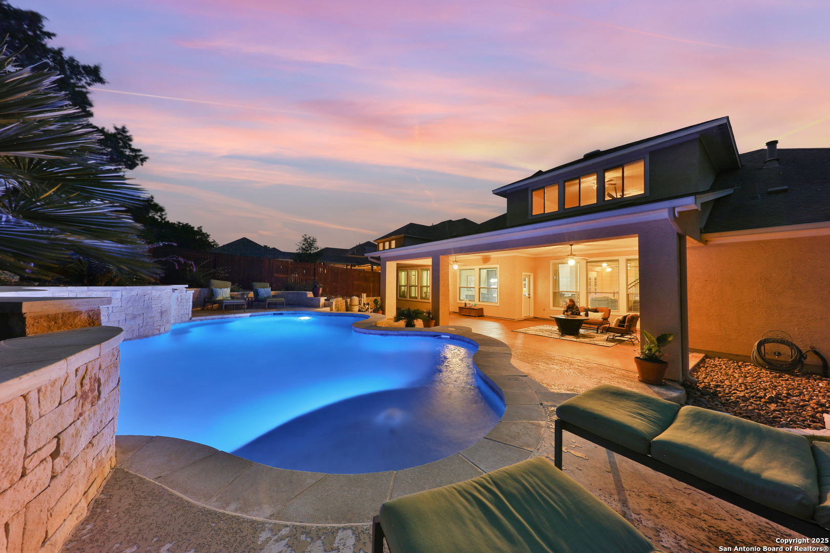 SELLER CONCESSIONS TOWARD CLOSING COSTS: $10,000! Welcome to this stunning David Weekley custom pool home in the prestigious, gated community of Triana! This beautifully designed 1 1/2 story home offers over 3,800 sq ft of luxury living, combining style, comfort, and functionality on an expansive 0.28-acre premium lot backing to a tranquil greenbelt. Boasting 4 spacious bedrooms, 3 1/2 bathrooms all on the main floor, this home provides the perfect layout for individuals and families of all sizes. The private office with a custom built-in bookshelf makes working from home both productive and inspiring. A versatile flex room is ideal for a secondary office, playroom, or home gym. Step outside to your backyard oasis-a 13,500 gallon, custom Cody pool featuring resort-style outdoor living on a permanent greenbelt. The sparkling pool includes a sun shelf, elegant waterfall, custom lighting, and cool deck surround. Unwind under the expansive 32' x 20' covered patio, featuring stylish stained concrete, offering serene views and total privacy, enhanced by a freshly stained fence (May 2025). This outdoor space sets the scene for outdoor dining, entertaining, or peaceful evenings under the stars. Inside, you'll find fresh paint, abundant natural light throughout and gorgeous custom shutters. The chef's kitchen is the heart of the home, complete with an oversized stone-clad island, granite countertops, stainless steel appliances, 42" cabinetry with under-cabinet lighting, ideal for entertaining and culinary creations. The living room is spacious with crown molding, recessed lighting, huge windows overlooking the pool and a stunning floor-to-ceiling stone fireplace. Retreat to the luxurious primary suite, offering a spacious sitting area, spa-like bath with dual vanities, jetted garden tub, separate shower, and a massive custom closet. Upstairs, enjoy an impressive 600 sq ft game room and half bath-a perfect space for movie nights, game days, or a teen hangout. Solar panels are fully paid off - request the utility bills and enjoy energy savings from day one. Located in the highly sought-after gated community of Triana, this home offers security, charm, and access to top-rated NISD schools. Don't miss your chance to own this one-of-a-kind dream home in Helotes! Schedule a private showing today before this gem is gone!