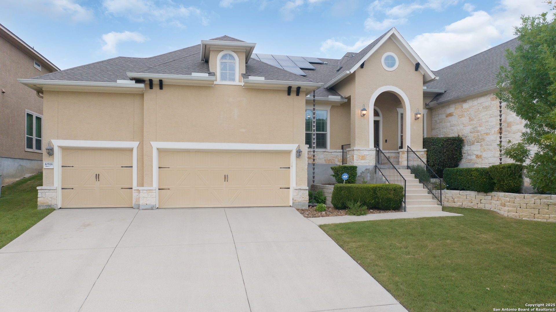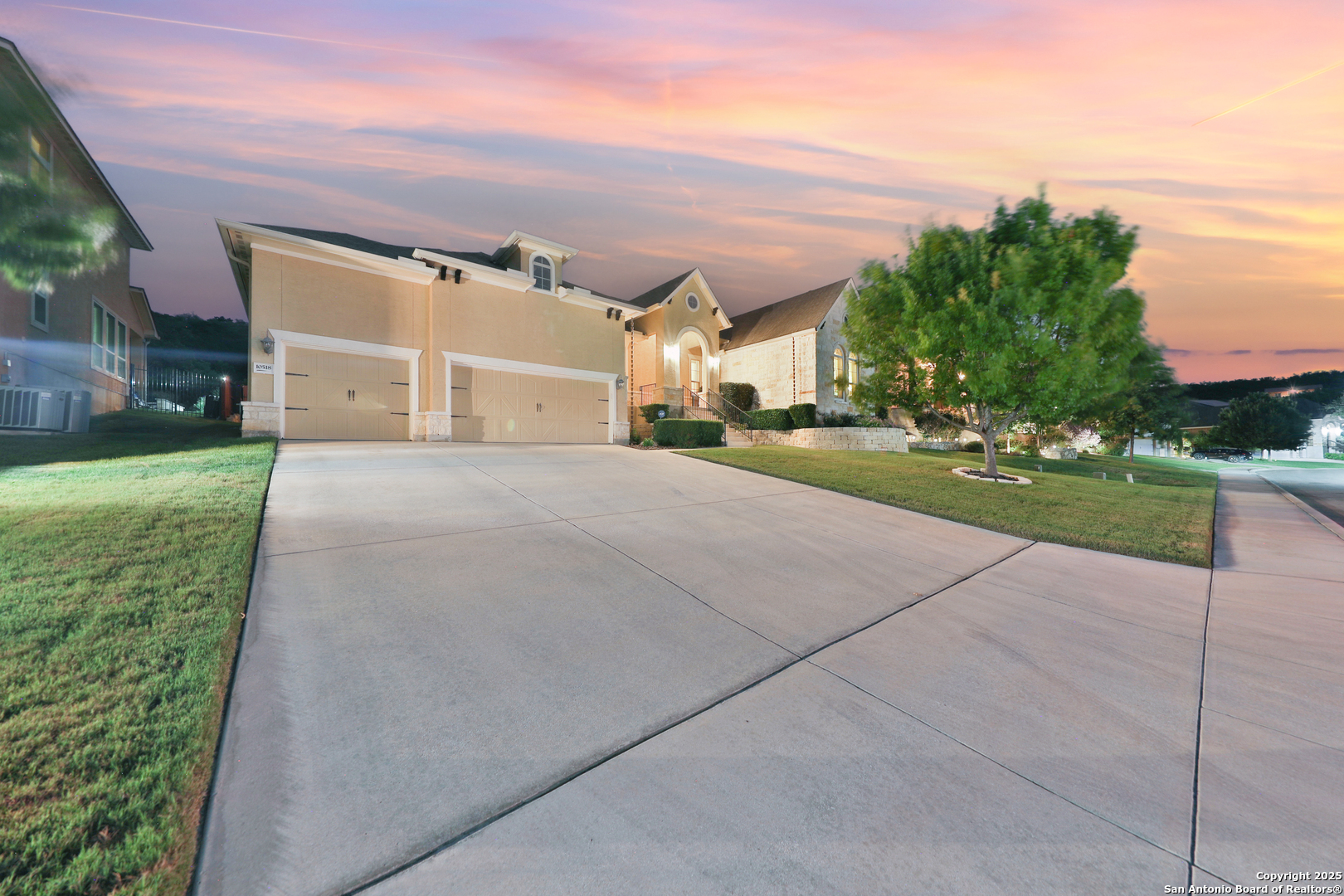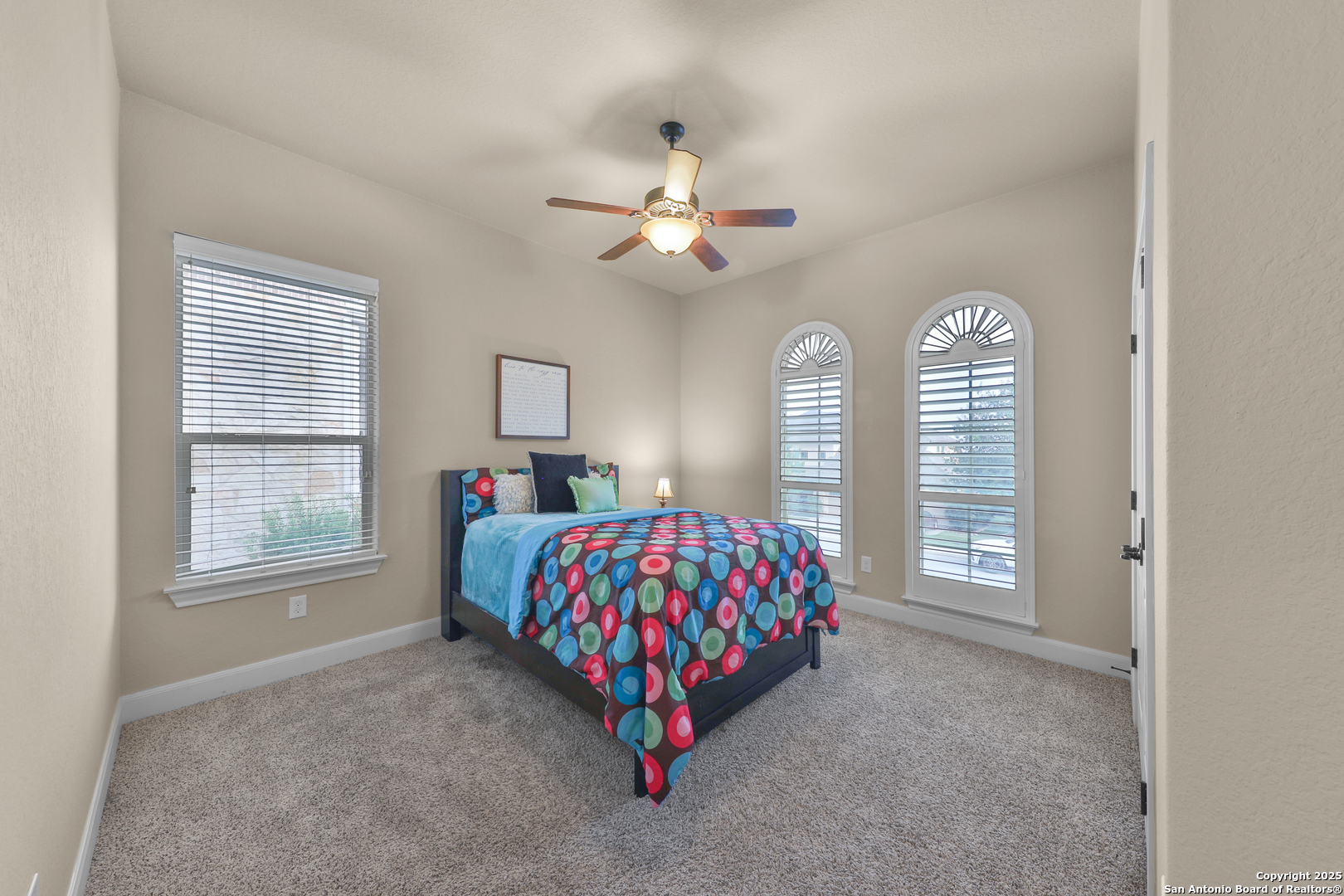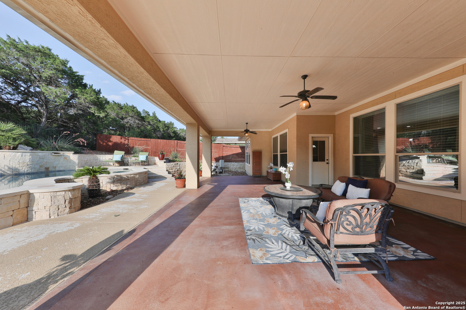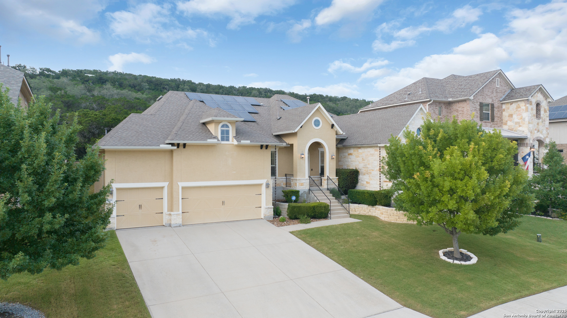 SELLER CONCESSIONS TOWARD CLOSING COSTS: $10,000! Welcome to this stunning David Weekley custom pool home in the prestigious, gated community of Triana! This beautifully designed 1 1/2 story home offers over 3,800 sq ft of luxury living, combining style, comfort, and functionality on an expansive 0.28-acre premium lot backing to a tranquil greenbelt. Boasting 4 spacious bedrooms, 3 1/2 bathrooms all on the main floor, this home provides the perfect layout for individuals and families of all sizes. The private office with a custom built-in bookshelf makes working from home both productive and inspiring. A versatile flex room is ideal for a secondary office, playroom, or home gym. Step outside to your backyard oasis-a 13,500 gallon, custom Cody pool featuring resort-style outdoor living on a permanent greenbelt. The sparkling pool includes a sun shelf, elegant waterfall, custom lighting, and cool deck surround. Unwind under the expansive 32' x 20' covered patio, featuring stylish stained concrete, offering serene views and total privacy, enhanced by a freshly stained fence (May 2025). This outdoor space sets the scene for outdoor dining, entertaining, or peaceful evenings under the stars. Inside, you'll find fresh paint, abundant natural light throughout and gorgeous custom shutters. The chef's kitchen is the heart of the home, complete with an oversized stone-clad island, granite countertops, stainless steel appliances, 42" cabinetry with under-cabinet lighting, ideal for entertaining and culinary creations. The living room is spacious with crown molding, recessed lighting, huge windows overlooking the pool and a stunning floor-to-ceiling stone fireplace. Retreat to the luxurious primary suite, offering a spacious sitting area, spa-like bath with dual vanities, jetted garden tub, separate shower, and a massive custom closet. Upstairs, enjoy an impressive 600 sq ft game room and half bath-a perfect space for movie nights, game days, or a teen hangout. Solar panels are fully paid off - request the utility bills and enjoy energy savings from day one. Located in the highly sought-after gated community of Triana, this home offers security, charm, and access to top-rated NISD schools. Don't miss your chance to own this one-of-a-kind dream home in Helotes! Schedule a private showing today before this gem is gone!
