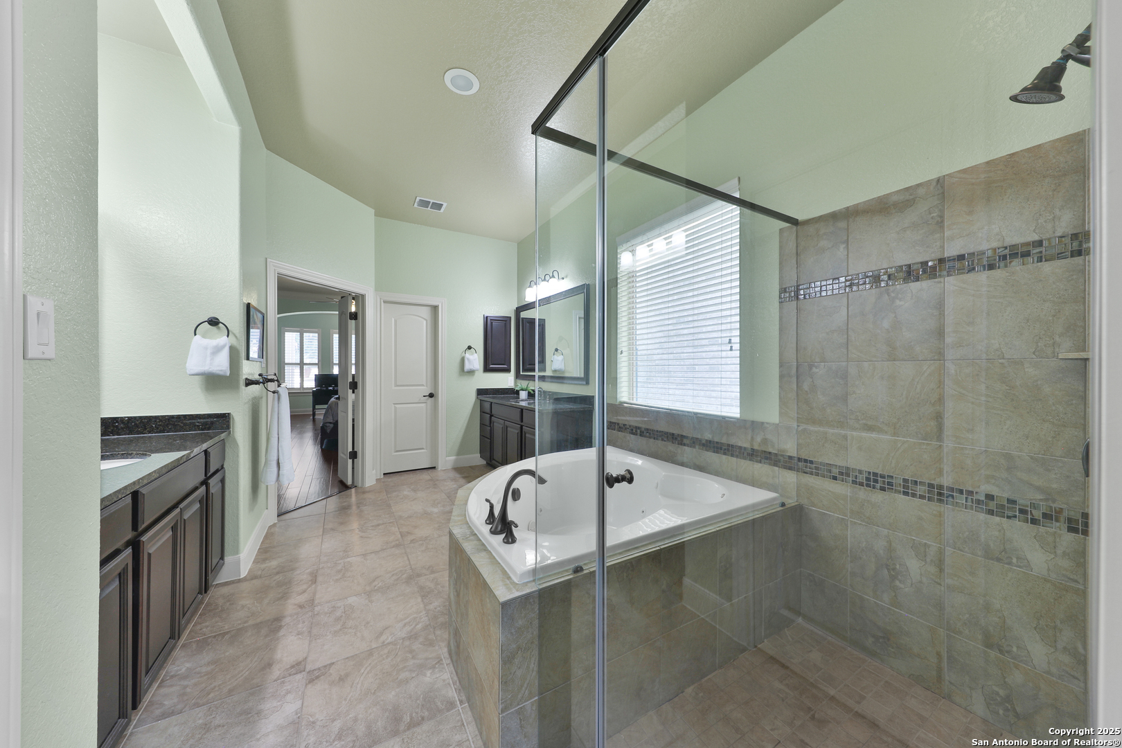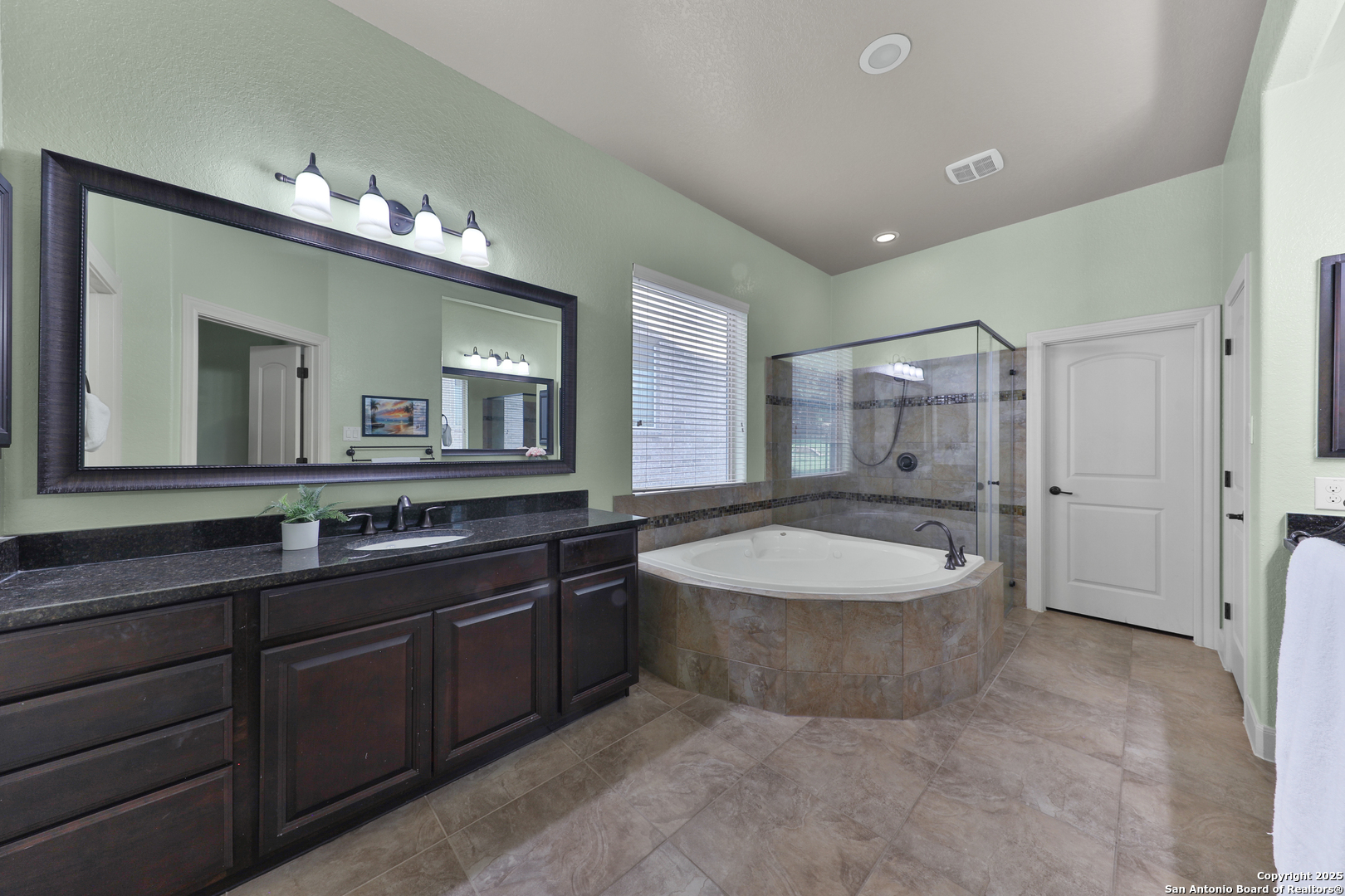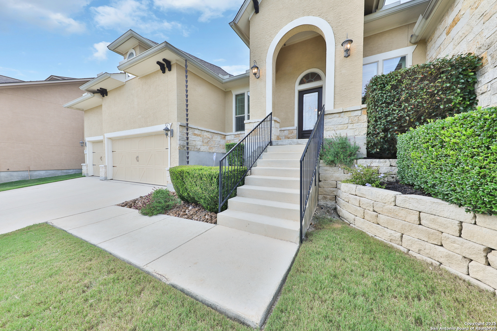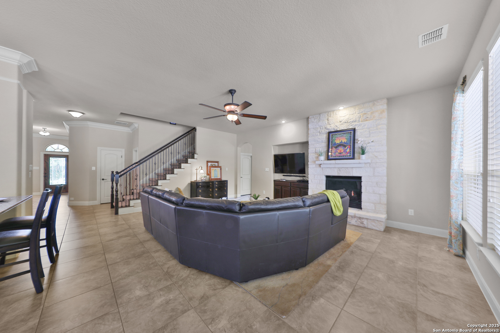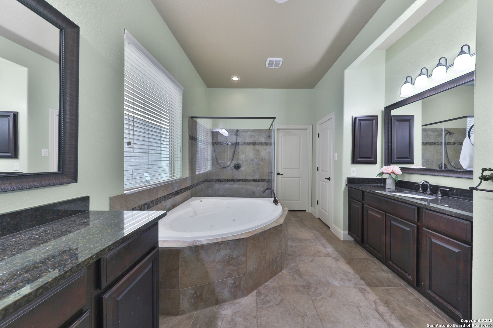 SELLER CONCESSIONS TOWARD CLOSING COSTS: $10,000! Welcome to this stunning David Weekley custom pool home in the prestigious, gated community of Triana! This beautifully designed 1 1/2 story home offers over 3,800 sq ft of luxury living, combining style, comfort, and functionality on an expansive 0.28-acre premium lot backing to a tranquil greenbelt. Boasting 4 spacious bedrooms, 3 1/2 bathrooms all on the main floor, this home provides the perfect layout for individuals and families of all sizes. The private office with a custom built-in bookshelf makes working from home both productive and inspiring. A versatile flex room is ideal for a secondary office, playroom, or home gym. Step outside to your backyard oasis-a 13,500 gallon, custom Cody pool featuring resort-style outdoor living on a permanent greenbelt. The sparkling pool includes a sun shelf, elegant waterfall, custom lighting, and cool deck surround. Unwind under the expansive 32' x 20' covered patio, featuring stylish stained concrete, offering serene views and total privacy, enhanced by a freshly stained fence (May 2025). This outdoor space sets the scene for outdoor dining, entertaining, or peaceful evenings under the stars. Inside, you'll find fresh paint, abundant natural light throughout and gorgeous custom shutters. The chef's kitchen is the heart of the home, complete with an oversized stone-clad island, granite countertops, stainless steel appliances, 42" cabinetry with under-cabinet lighting, ideal for entertaining and culinary creations. The living room is spacious with crown molding, recessed lighting, huge windows overlooking the pool and a stunning floor-to-ceiling stone fireplace. Retreat to the luxurious primary suite, offering a spacious sitting area, spa-like bath with dual vanities, jetted garden tub, separate shower, and a massive custom closet. Upstairs, enjoy an impressive 600 sq ft game room and half bath-a perfect space for movie nights, game days, or a teen hangout. Solar panels are fully paid off - request the utility bills and enjoy energy savings from day one. Located in the highly sought-after gated community of Triana, this home offers security, charm, and access to top-rated NISD schools. Don't miss your chance to own this one-of-a-kind dream home in Helotes! Schedule a private showing today before this gem is gone!