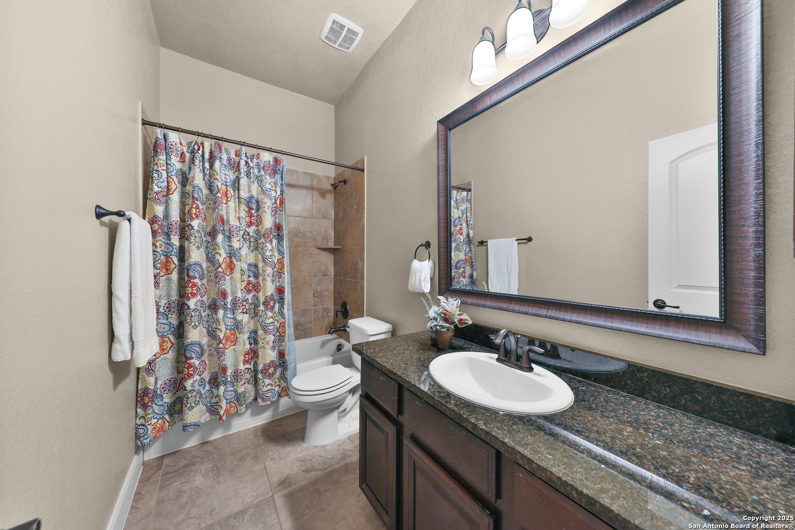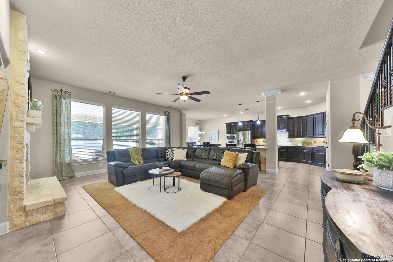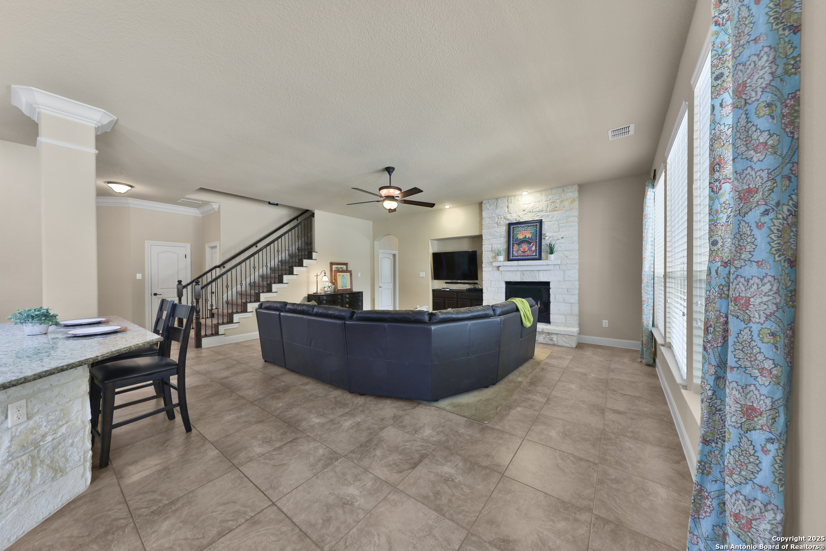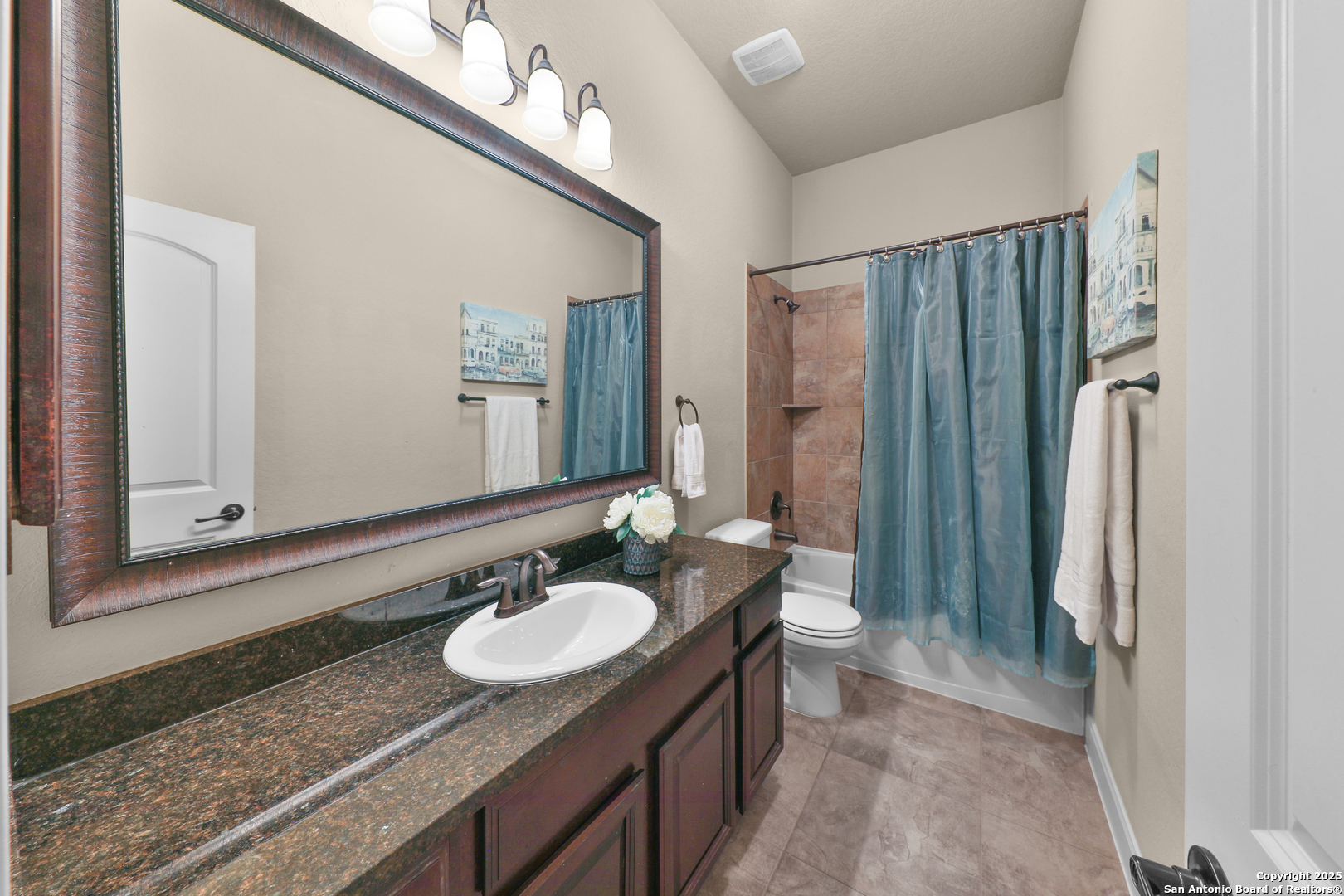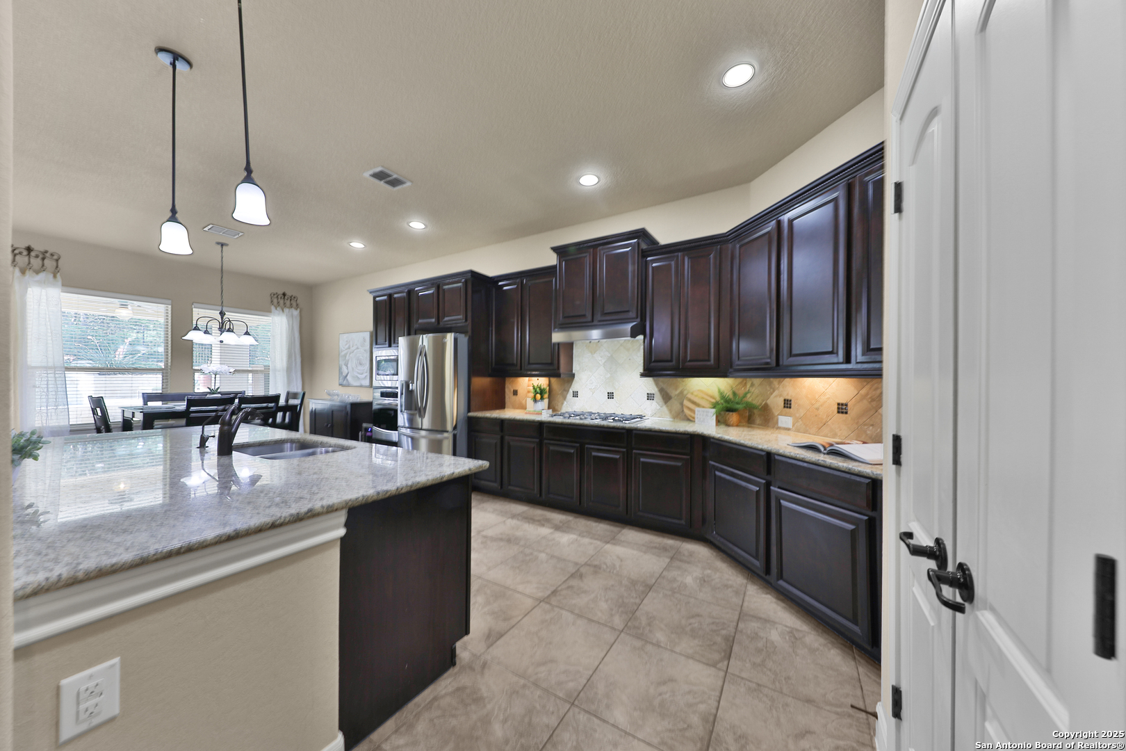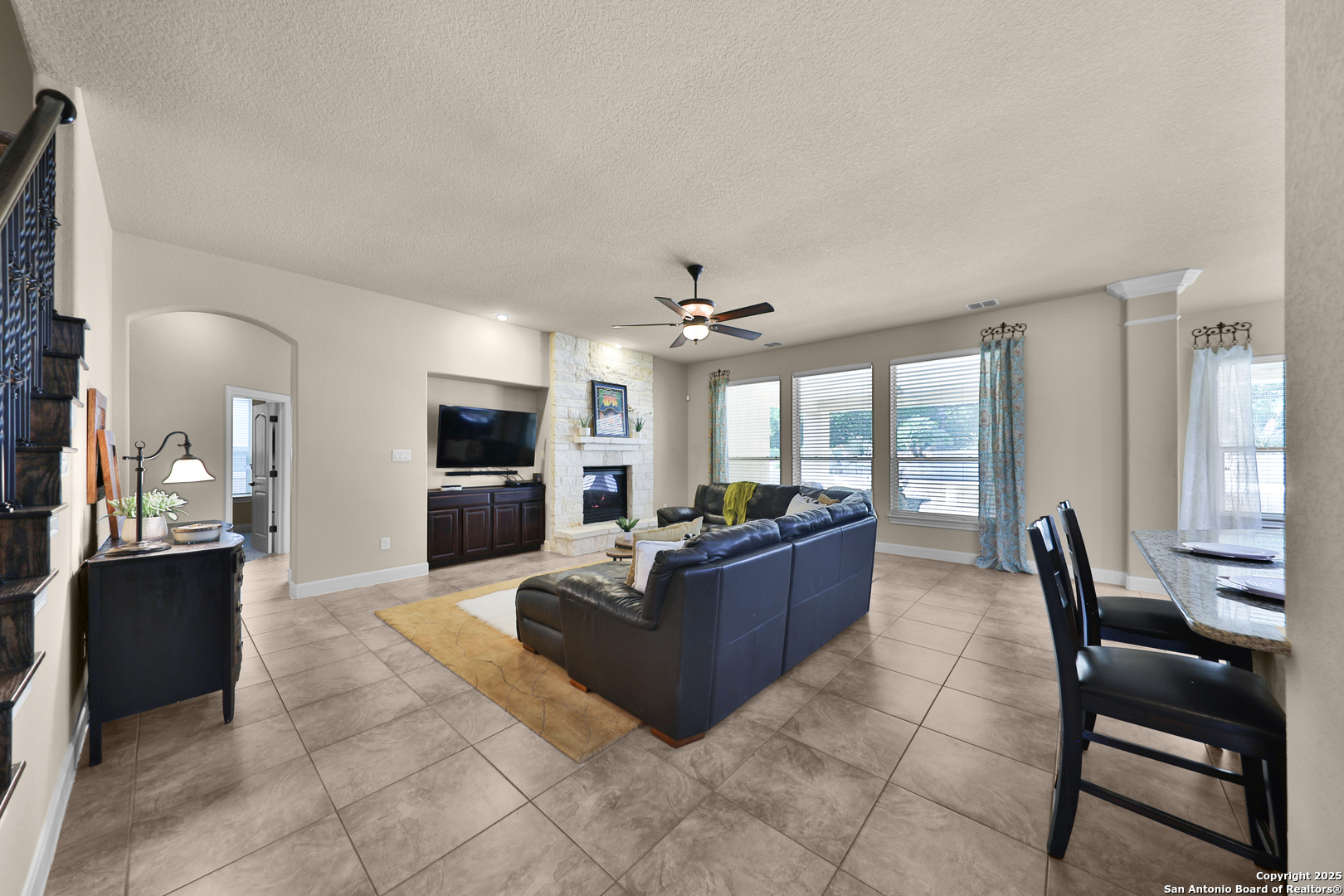 SELLER CONCESSIONS TOWARD CLOSING COSTS: $10,000! Welcome to this stunning David Weekley custom pool home in the prestigious, gated community of Triana! This beautifully designed 1 1/2 story home offers over 3,800 sq ft of luxury living, combining style, comfort, and functionality on an expansive 0.28-acre premium lot backing to a tranquil greenbelt. Boasting 4 spacious bedrooms, 3 1/2 bathrooms all on the main floor, this home provides the perfect layout for individuals and families of all sizes. The private office with a custom built-in bookshelf makes working from home both productive and inspiring. A versatile flex room is ideal for a secondary office, playroom, or home gym. Step outside to your backyard oasis-a 13,500 gallon, custom Cody pool featuring resort-style outdoor living on a permanent greenbelt. The sparkling pool includes a sun shelf, elegant waterfall, custom lighting, and cool deck surround. Unwind under the expansive 32' x 20' covered patio, featuring stylish stained concrete, offering serene views and total privacy, enhanced by a freshly stained fence (May 2025). This outdoor space sets the scene for outdoor dining, entertaining, or peaceful evenings under the stars. Inside, you'll find fresh paint, abundant natural light throughout and gorgeous custom shutters. The chef's kitchen is the heart of the home, complete with an oversized stone-clad island, granite countertops, stainless steel appliances, 42" cabinetry with under-cabinet lighting, ideal for entertaining and culinary creations. The living room is spacious with crown molding, recessed lighting, huge windows overlooking the pool and a stunning floor-to-ceiling stone fireplace. Retreat to the luxurious primary suite, offering a spacious sitting area, spa-like bath with dual vanities, jetted garden tub, separate shower, and a massive custom closet. Upstairs, enjoy an impressive 600 sq ft game room and half bath-a perfect space for movie nights, game days, or a teen hangout. Solar panels are fully paid off - request the utility bills and enjoy energy savings from day one. Located in the highly sought-after gated community of Triana, this home offers security, charm, and access to top-rated NISD schools. Don't miss your chance to own this one-of-a-kind dream home in Helotes! Schedule a private showing today before this gem is gone!