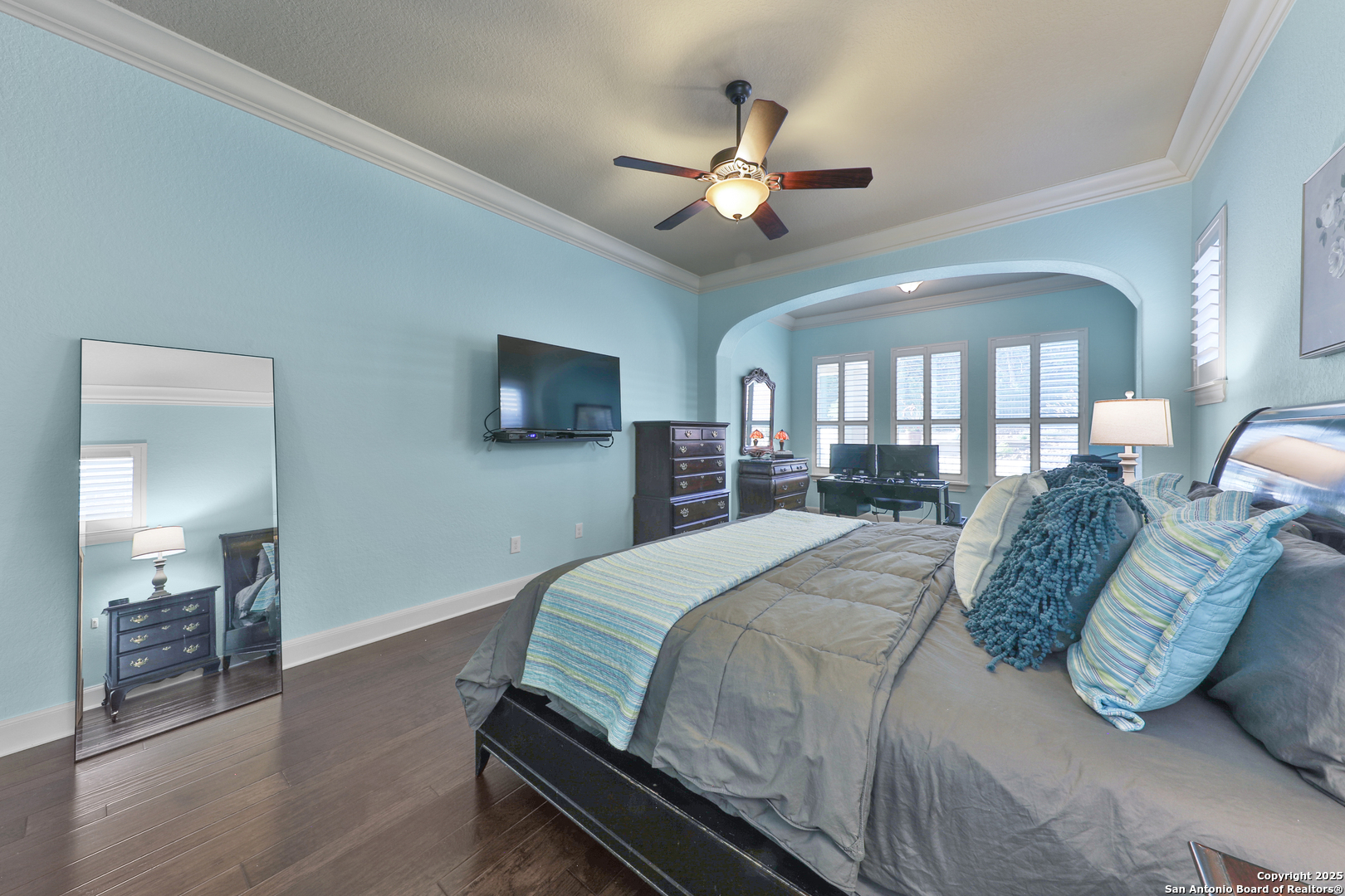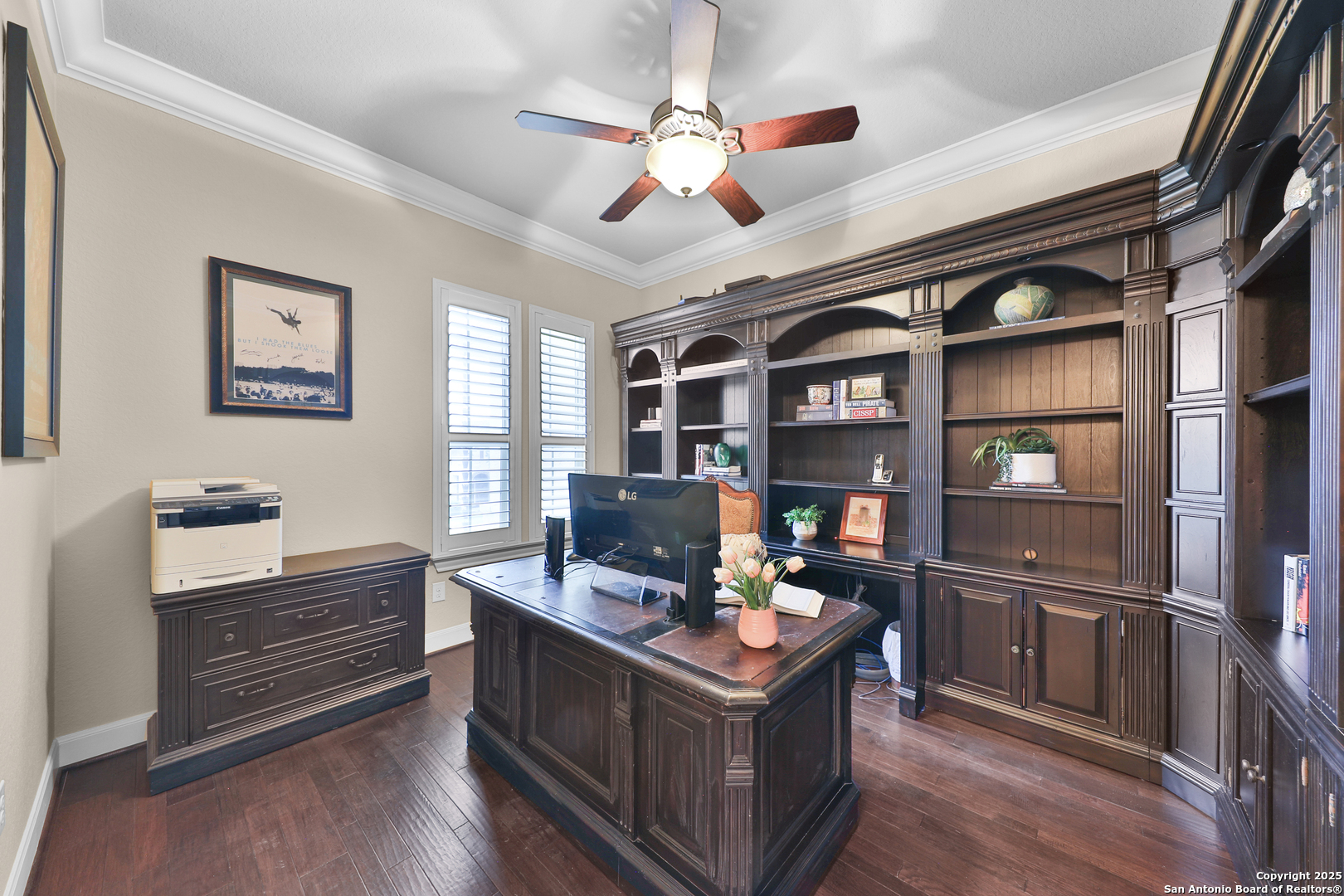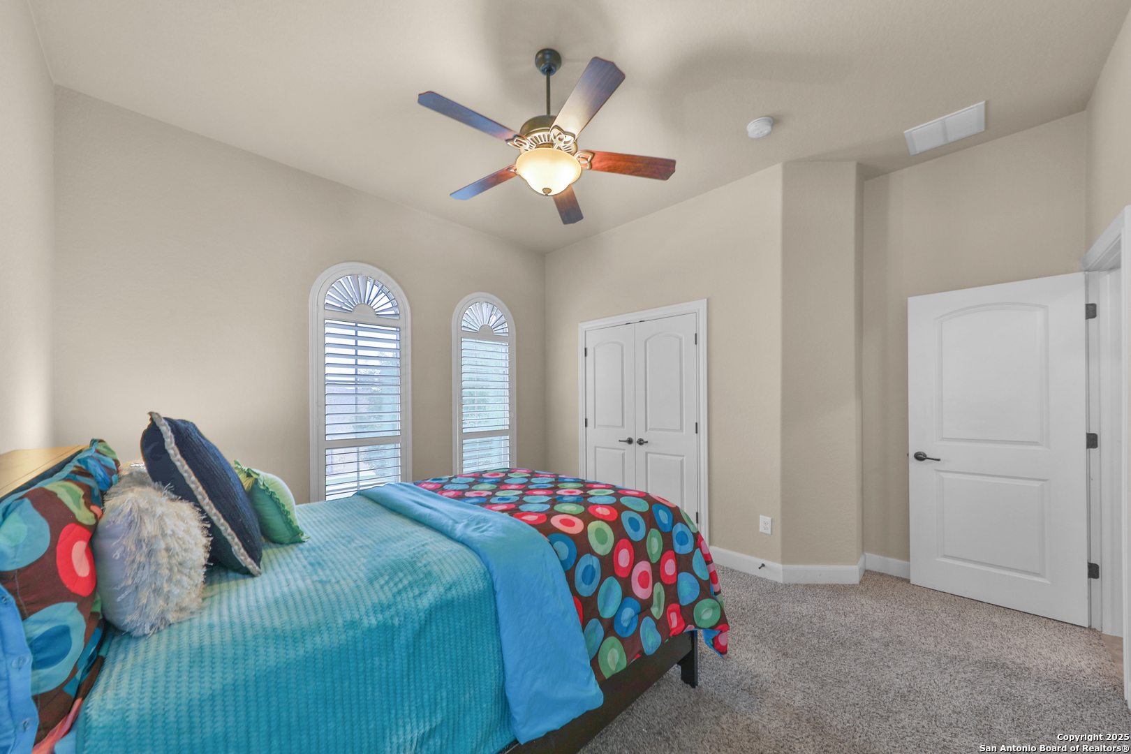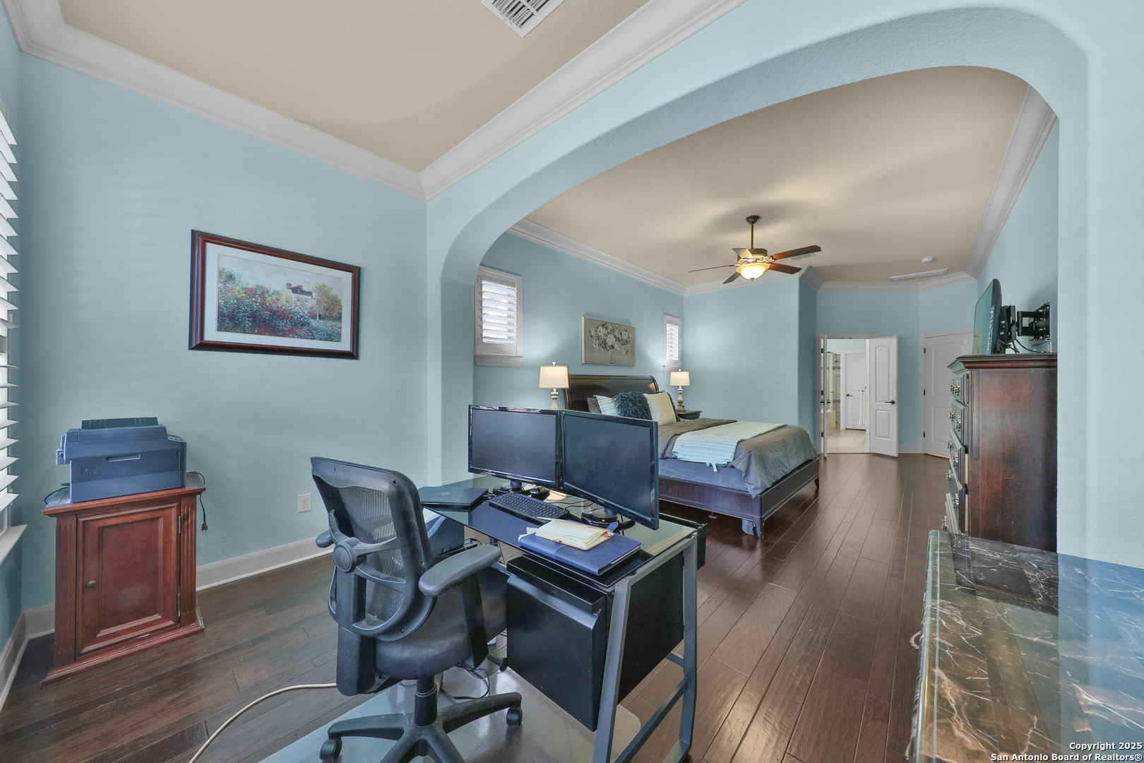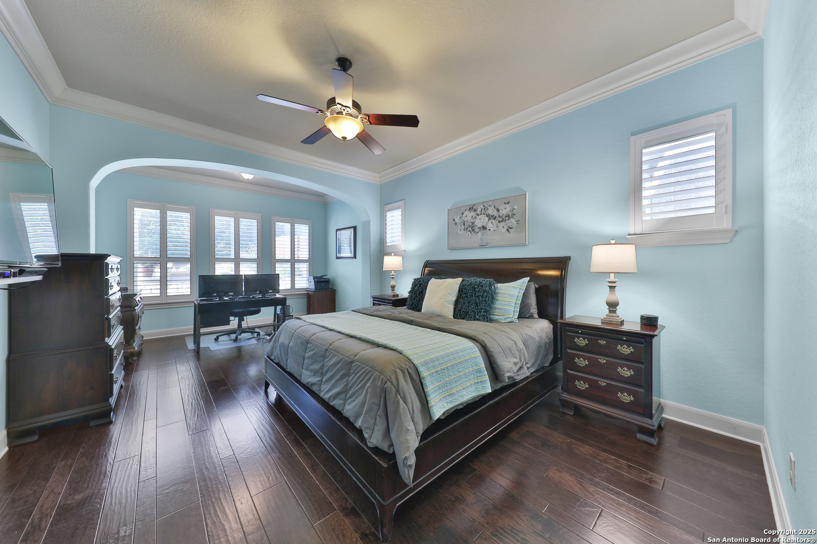 SELLER CONCESSIONS TOWARD CLOSING COSTS: $10,000! Welcome to this stunning David Weekley custom pool home in the prestigious, gated community of Triana! This beautifully designed 1 1/2 story home offers over 3,800 sq ft of luxury living, combining style, comfort, and functionality on an expansive 0.28-acre premium lot backing to a tranquil greenbelt. Boasting 4 spacious bedrooms, 3 1/2 bathrooms all on the main floor, this home provides the perfect layout for individuals and families of all sizes. The private office with a custom built-in bookshelf makes working from home both productive and inspiring. A versatile flex room is ideal for a secondary office, playroom, or home gym. Step outside to your backyard oasis-a 13,500 gallon, custom Cody pool featuring resort-style outdoor living on a permanent greenbelt. The sparkling pool includes a sun shelf, elegant waterfall, custom lighting, and cool deck surround. Unwind under the expansive 32' x 20' covered patio, featuring stylish stained concrete, offering serene views and total privacy, enhanced by a freshly stained fence (May 2025). This outdoor space sets the scene for outdoor dining, entertaining, or peaceful evenings under the stars. Inside, you'll find fresh paint, abundant natural light throughout and gorgeous custom shutters. The chef's kitchen is the heart of the home, complete with an oversized stone-clad island, granite countertops, stainless steel appliances, 42" cabinetry with under-cabinet lighting, ideal for entertaining and culinary creations. The living room is spacious with crown molding, recessed lighting, huge windows overlooking the pool and a stunning floor-to-ceiling stone fireplace. Retreat to the luxurious primary suite, offering a spacious sitting area, spa-like bath with dual vanities, jetted garden tub, separate shower, and a massive custom closet. Upstairs, enjoy an impressive 600 sq ft game room and half bath-a perfect space for movie nights, game days, or a teen hangout. Solar panels are fully paid off - request the utility bills and enjoy energy savings from day one. Located in the highly sought-after gated community of Triana, this home offers security, charm, and access to top-rated NISD schools. Don't miss your chance to own this one-of-a-kind dream home in Helotes! Schedule a private showing today before this gem is gone!