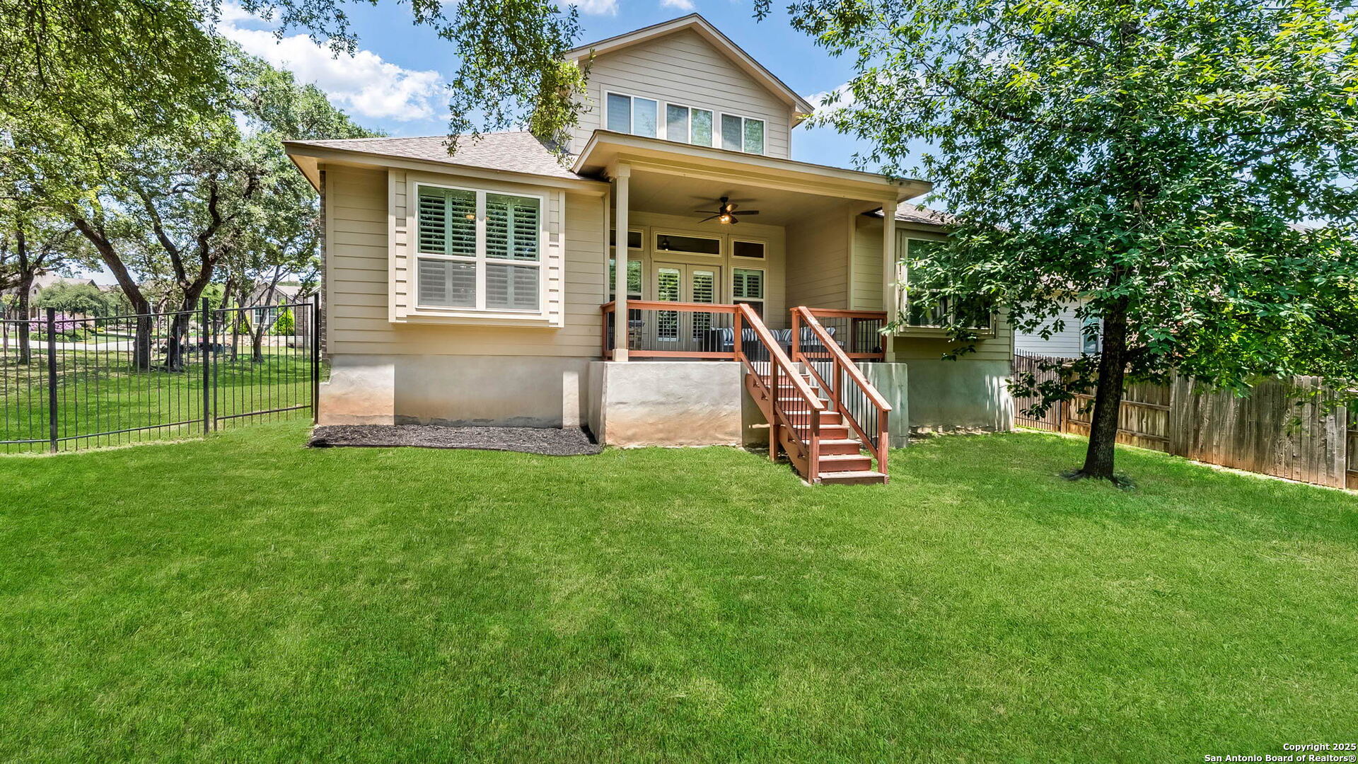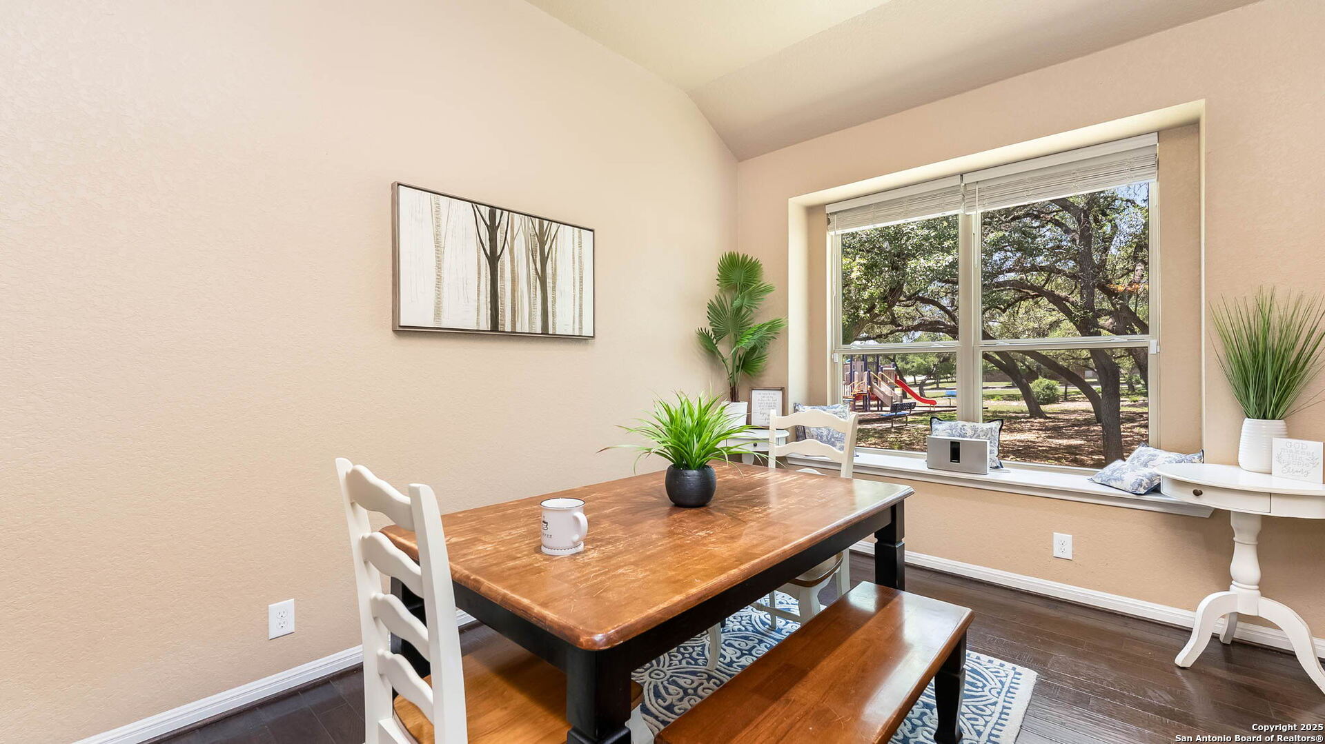 Step into comfort and style with this beautiful 4-bedroom, 3-bath home featuring all bedrooms conveniently located on the main floor! Soaring 10' ceilings and rich dark wood floors flow throughout the main living spaces, complemented by elegant ceramic tile and a cozy gas fireplace in the family room. The chef's kitchen is the heart of the home-featuring an oversized island with bar seating, upgraded custom cabinetry, stainless steel appliances, a gas cooktop, built-in oven, microwave, and dishwasher. Perfect for hosting or everyday living! The spacious primary suite boasts a tray ceiling and a luxurious bath with a dual vanity, garden tub, and separate walk-in shower. Upstairs, you'll find a generous game room that overlooks the community playground and pool-located just steps from your backyard! Additional features include a separate dining area, tankless water heater, and a covered patio ideal for relaxing evenings outdoors. This home offers both functionality and charm in a location that puts neighborhood amenities right at your doorstep!