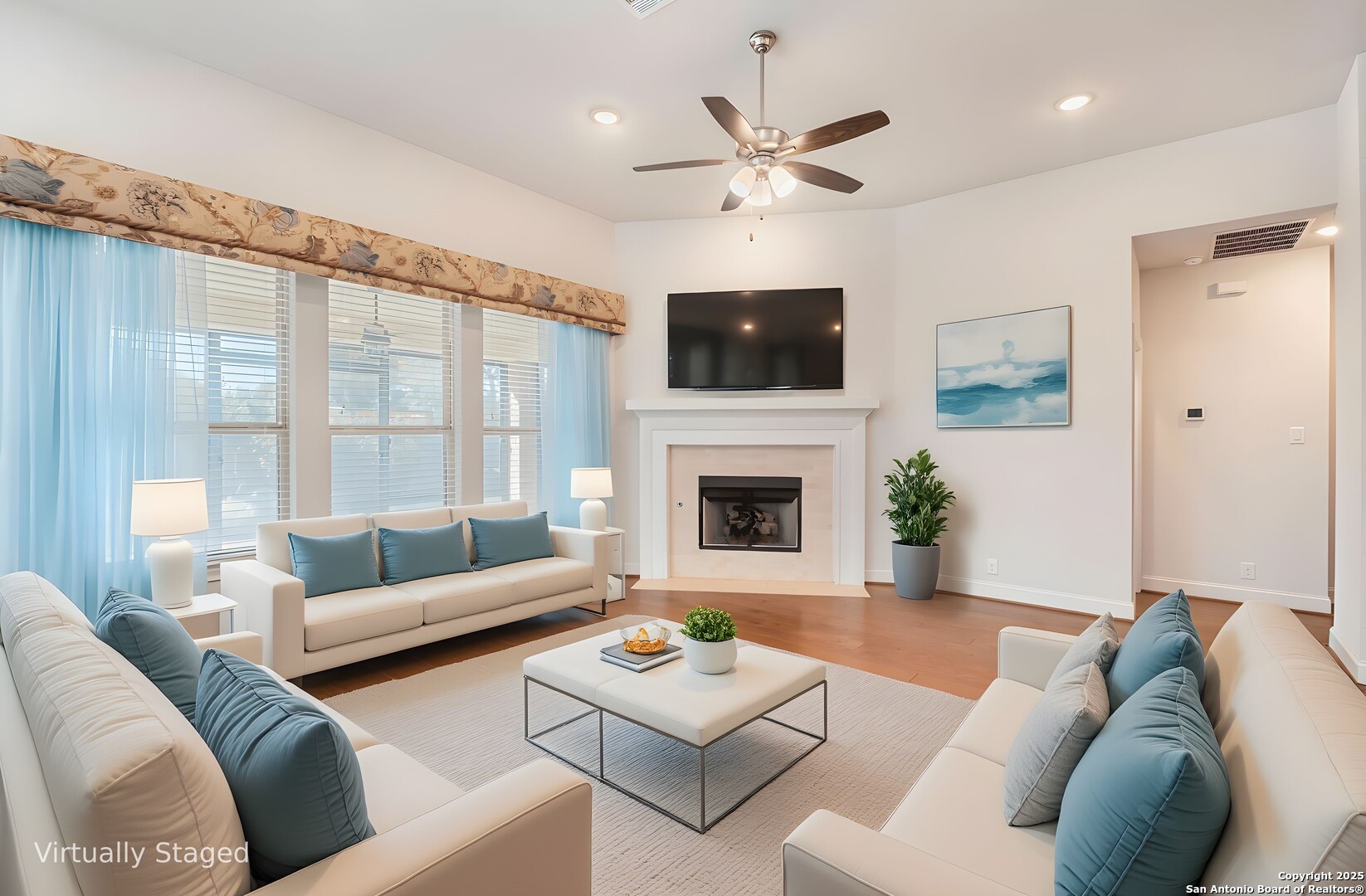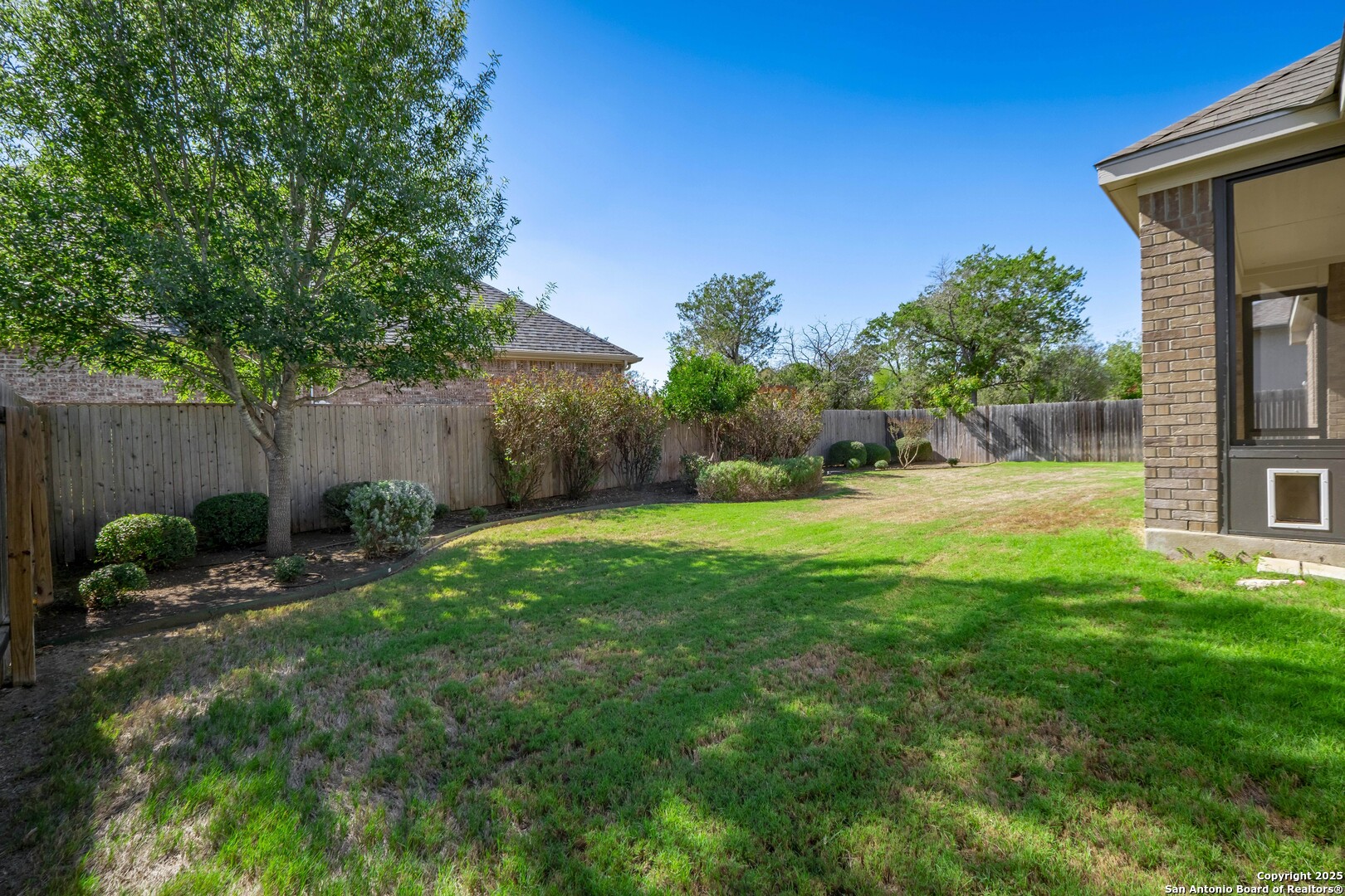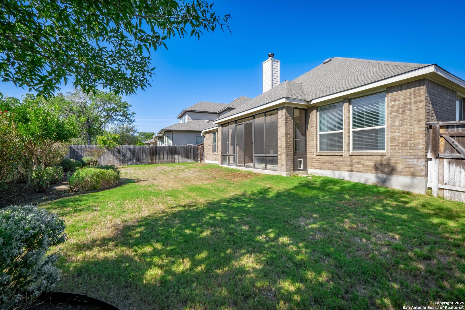 Set in a desirable New Braunfels neighborhood, this inviting 1-story home offers 3 bedrooms plus an office, 2 full baths, and an oversized 2-car garage. The well-designed layout features open-concept living with distinct bedroom spaces for comfort and functionality. The spacious living room centers around a cozy fireplace and flows seamlessly into the kitchen and dining areas, ideal for everyday living and entertaining. The kitchen includes an island with a breakfast bar, ample cabinetry, and a convenient pantry for storage. The primary suite features a high ceiling, an ensuite bath with separate vanities, a walk-in shower, and a spacious walk-in closet. Two secondary bedrooms share a full bath, while the office near the entry provides flexible space for work or hobbies. An enclosed patio extends the living space outdoors, overlooking a wooden-fenced backyard perfect for relaxation or gatherings. Combining comfort, practicality, and a smart layout, this home offers easy living in a great New Braunfels location.