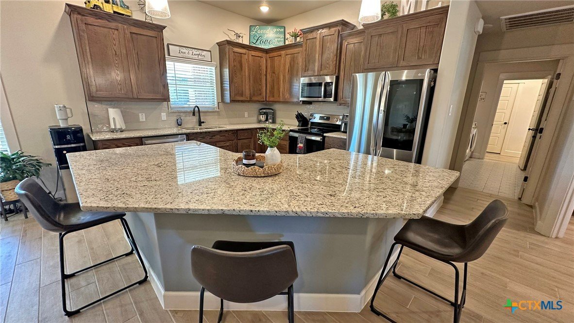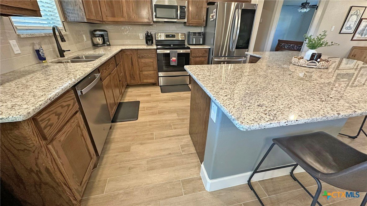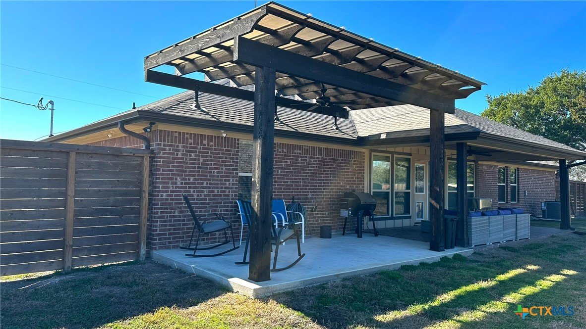 Welcome to this cozy 3-bedroom, 2-bath home offering 2,014 sq ft of thoughtfully designed living space in a quiet, commuter-friendly neighborhood. Featuring an open and split floor plan, this home delivers both functionality and privacy. The spacious main living area is highlighted by tile flooring, recessed lighting, and a stunning custom gas fireplace with built-in cabinets and shelving, creating a warm and inviting focal point. Two separate dining areas and a breakfast bar provide plenty of space for everyday living and entertaining. The kitchen is set up for easy convenience for the family chef with lots of counter space and storage. The oversized primary suite is a true retreat, complete with a large walk-in closet and a spa-like ensuite featuring a separate shower and soaking tub. Secondary bedrooms offer comfortable space and ample-sized closets. Secondary bedrooms have carpeted flooring. Additional conveniences include a laundry room with a sink and cabinetry for extra storage and functionality. The thermostat can be managed through an app. Step outside to enjoy the extended back patio with a pergola, a large fenced-in yard perfect for relaxing or hosting guests, and a good-sized shed for extra storage. Combining comfort, upgrades, and a desirable location, this home is ideal for commuters and anyone seeking a peaceful neighborhood with easy access to daily necessities.